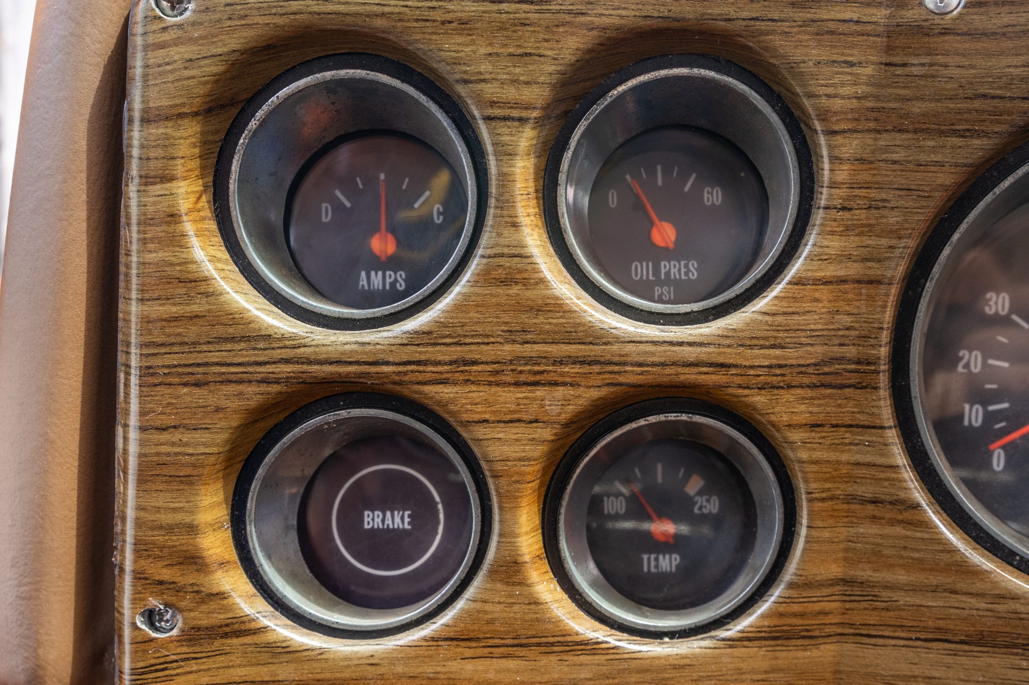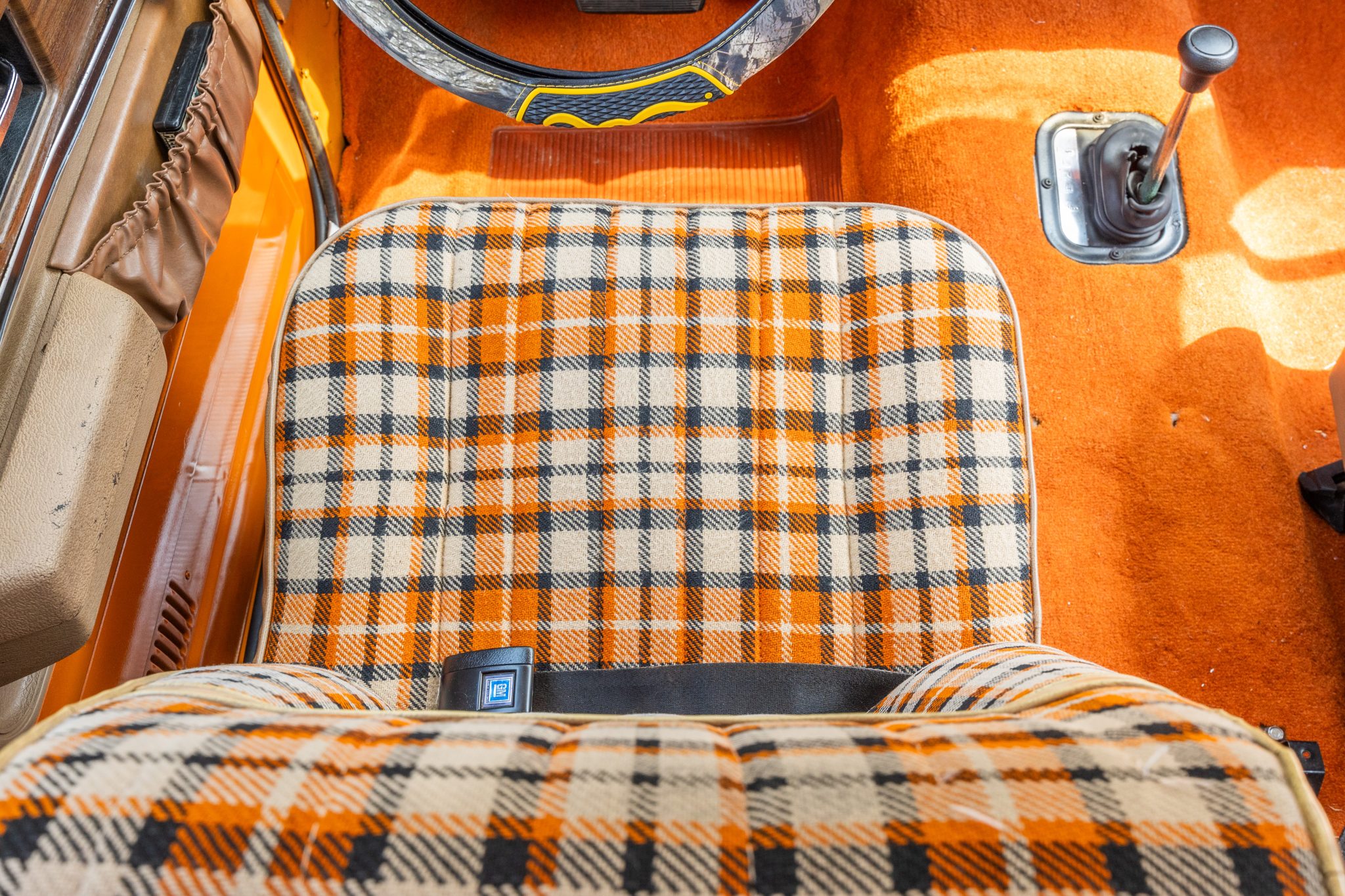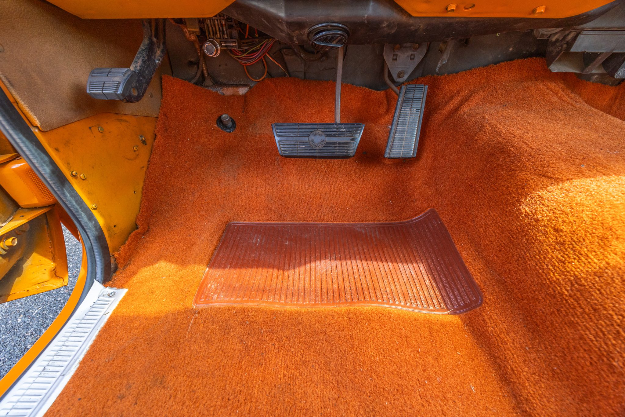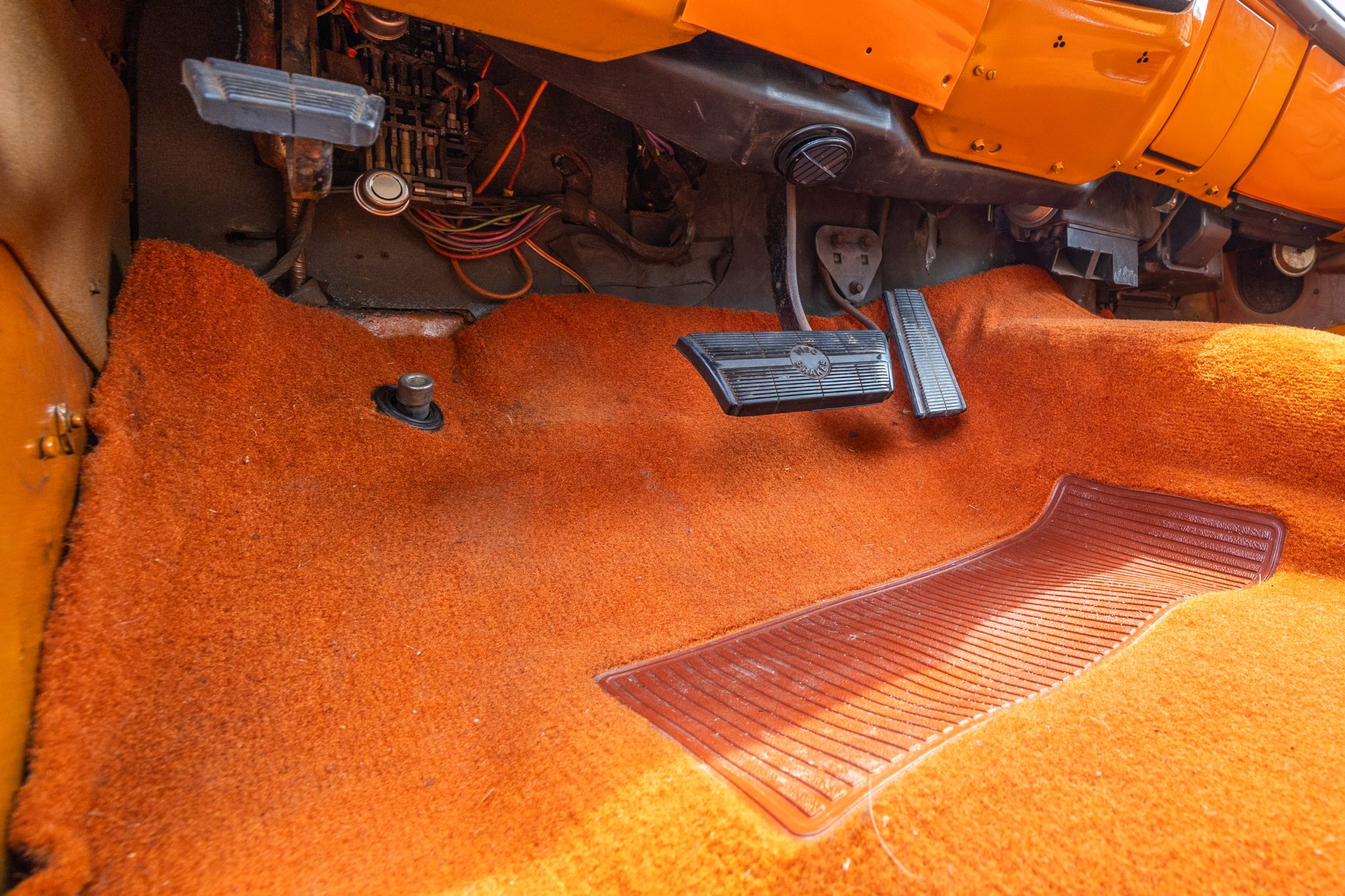 Power is provided by a small block Chevrolet V8 linked with a four-speed automatic transmission and a dual-range transfer case. It is finished in two-tone Burnt Orange and Frost White over plaid white and orange cloth upholstery and equipment includes 15″ Rally wheels, power steering, power front disc brakes, a removable hardtop, Edelbrock intake manifold, a dual exhaust system, front bucket seats, a rear bench, and air conditioning.