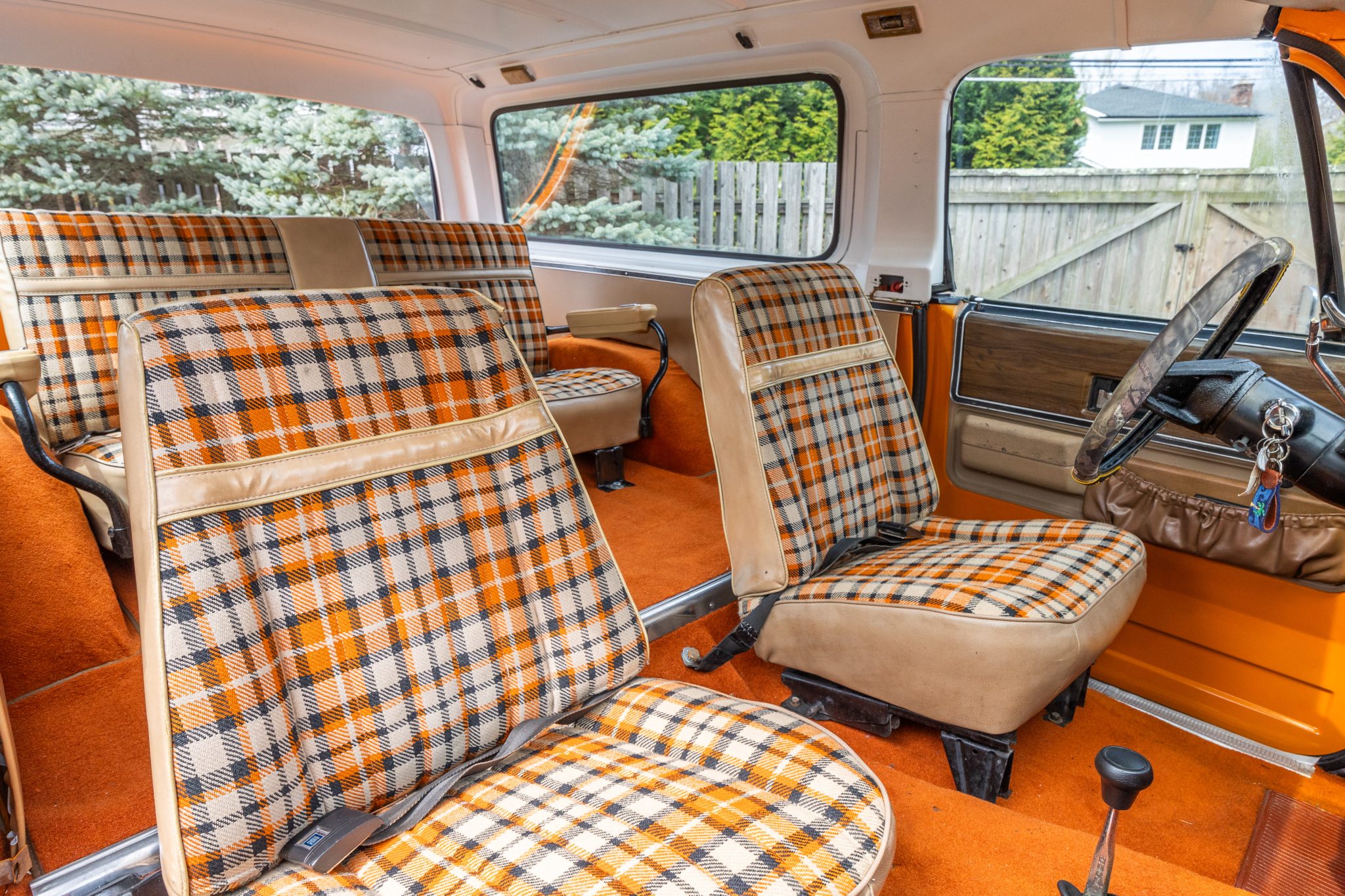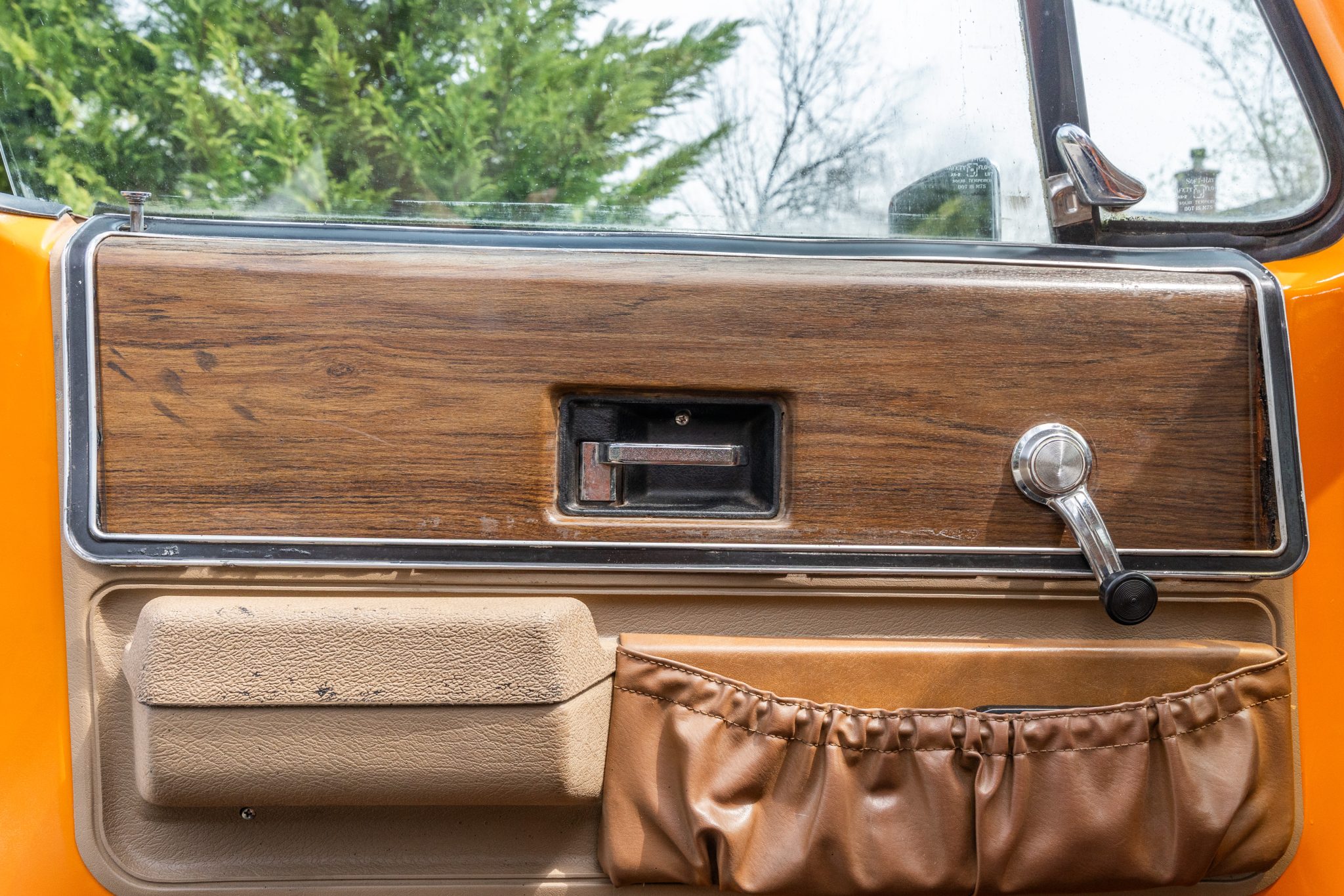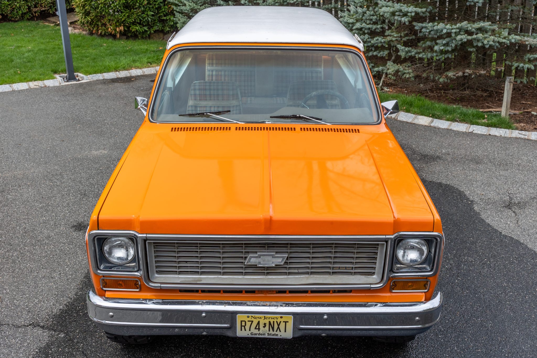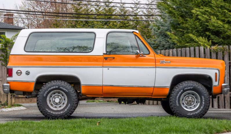 Power is provided by a small block Chevrolet V8 linked with a four-speed automatic transmission and a dual-range transfer case. It is finished in two-tone Burnt Orange and Frost White over plaid white and orange cloth upholstery and equipment includes 15″ Rally wheels, power steering, power front disc brakes, a removable hardtop, Edelbrock intake manifold, a dual exhaust system, front bucket seats, a rear bench, and air conditioning.