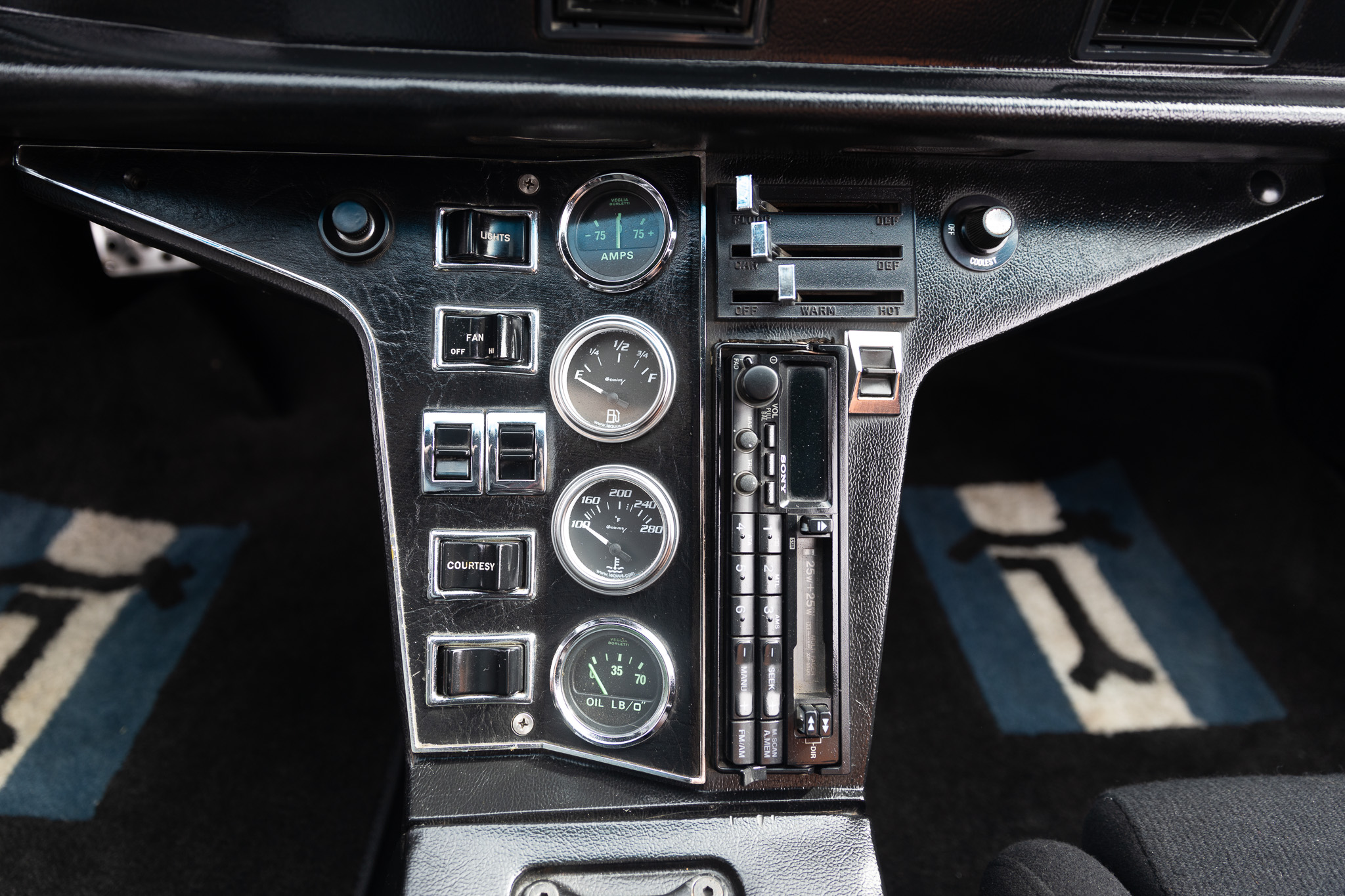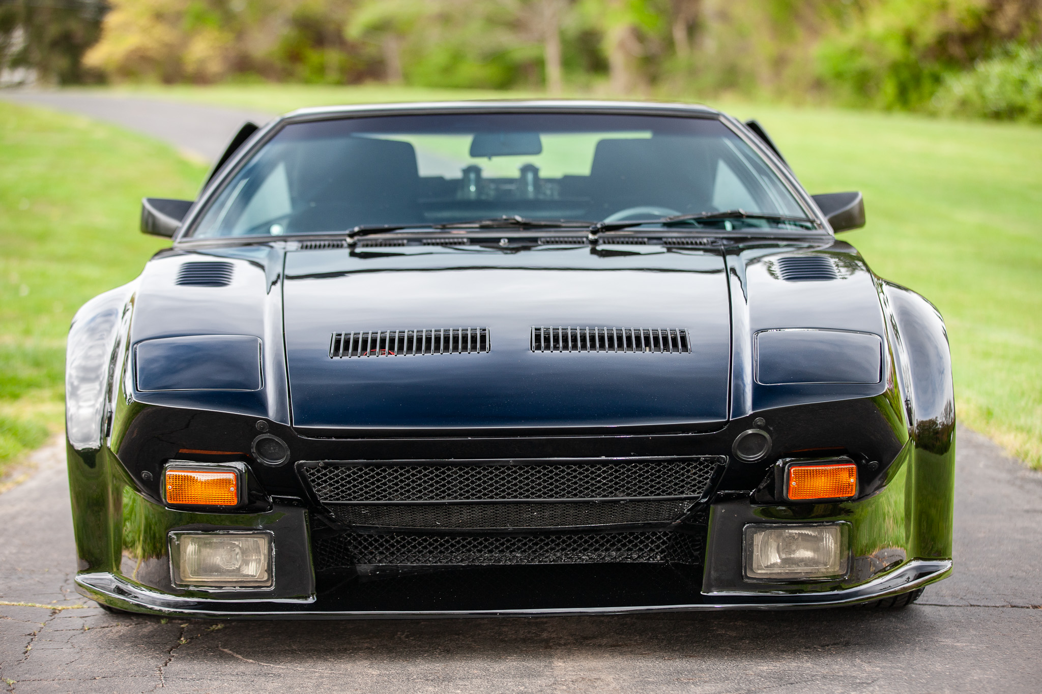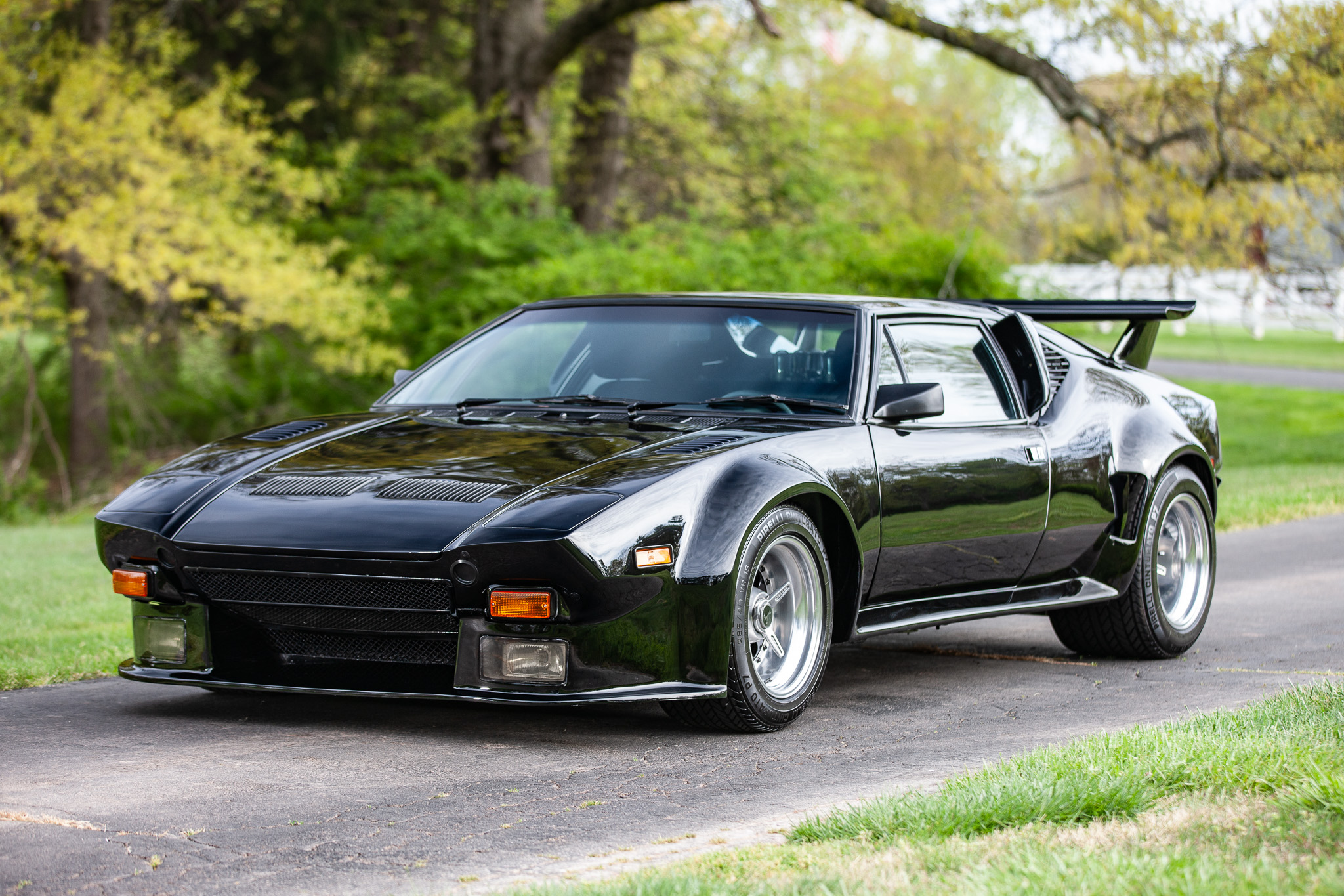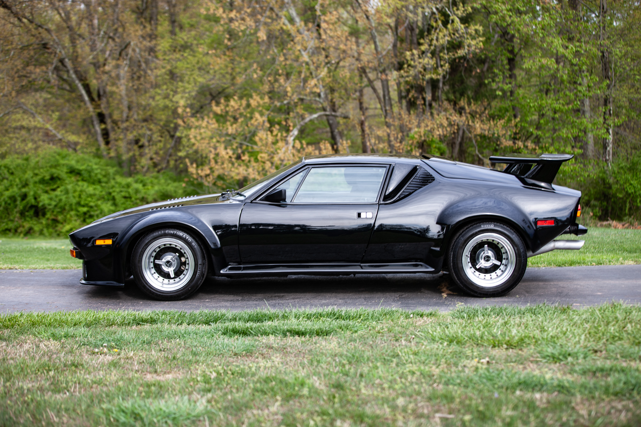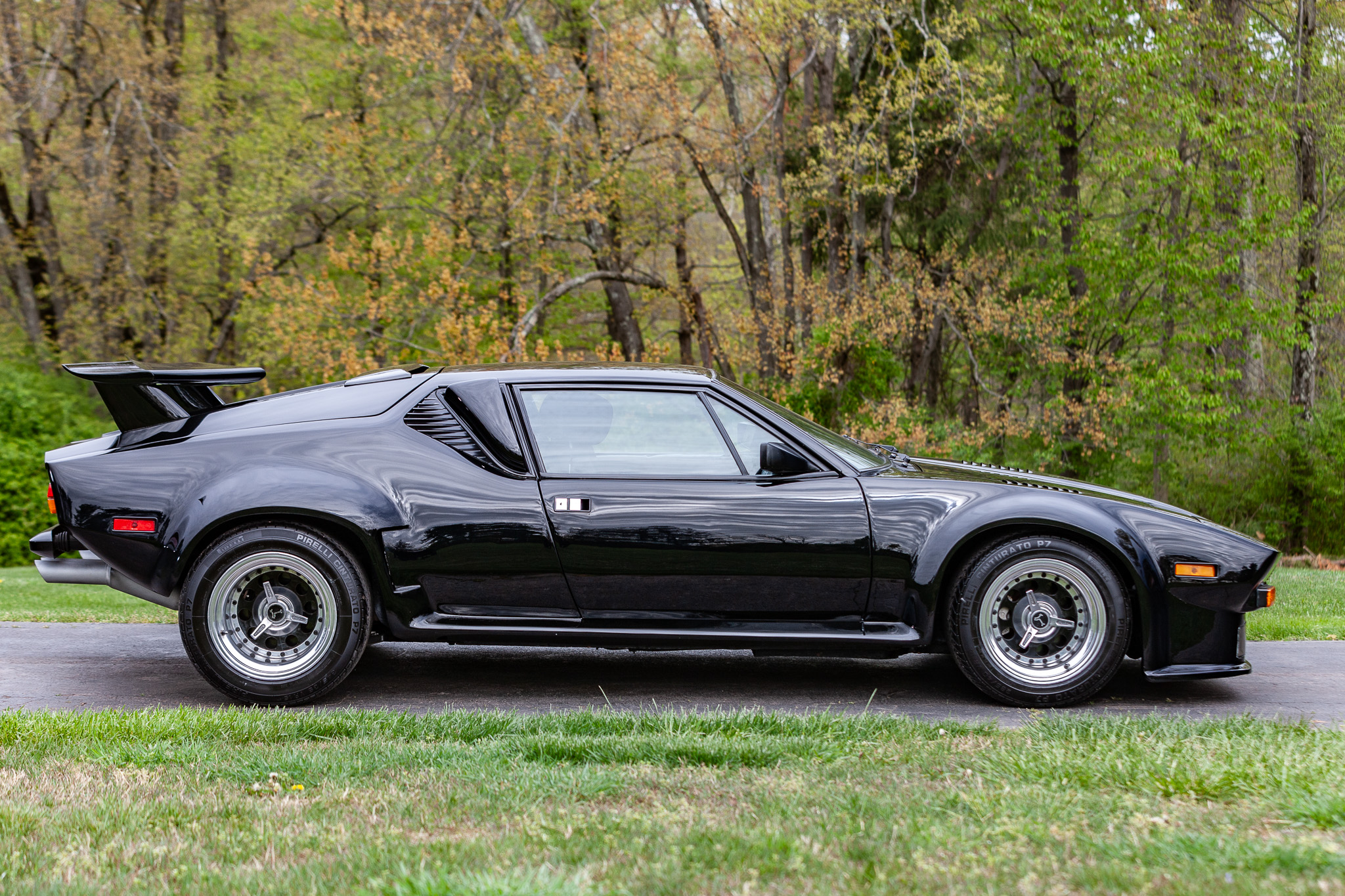 Finished in black over a black interior, the car features GT5-style bodywork that includes flared fenders, rocker panel extensions, and a rear wing. Power is provided by a 351ci Cleveland V8 and is fitted with quadruple Weber carburetors atop an Inglese manifold. Shifting is via a five-speed manual transmission, and further equipment includes 15″ wheels, Recaro bucket seats, power windows, and a Sony cassette stereo.