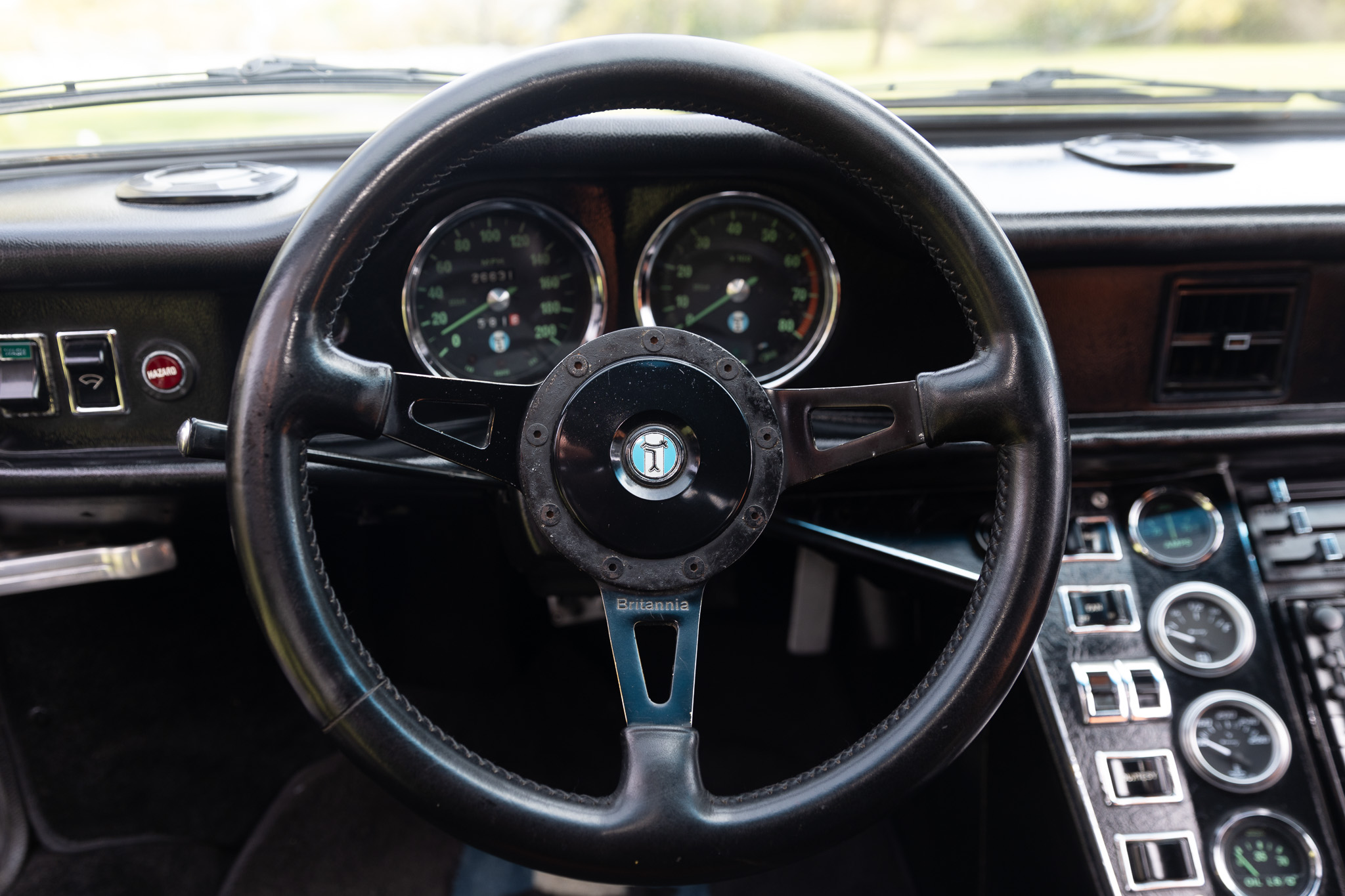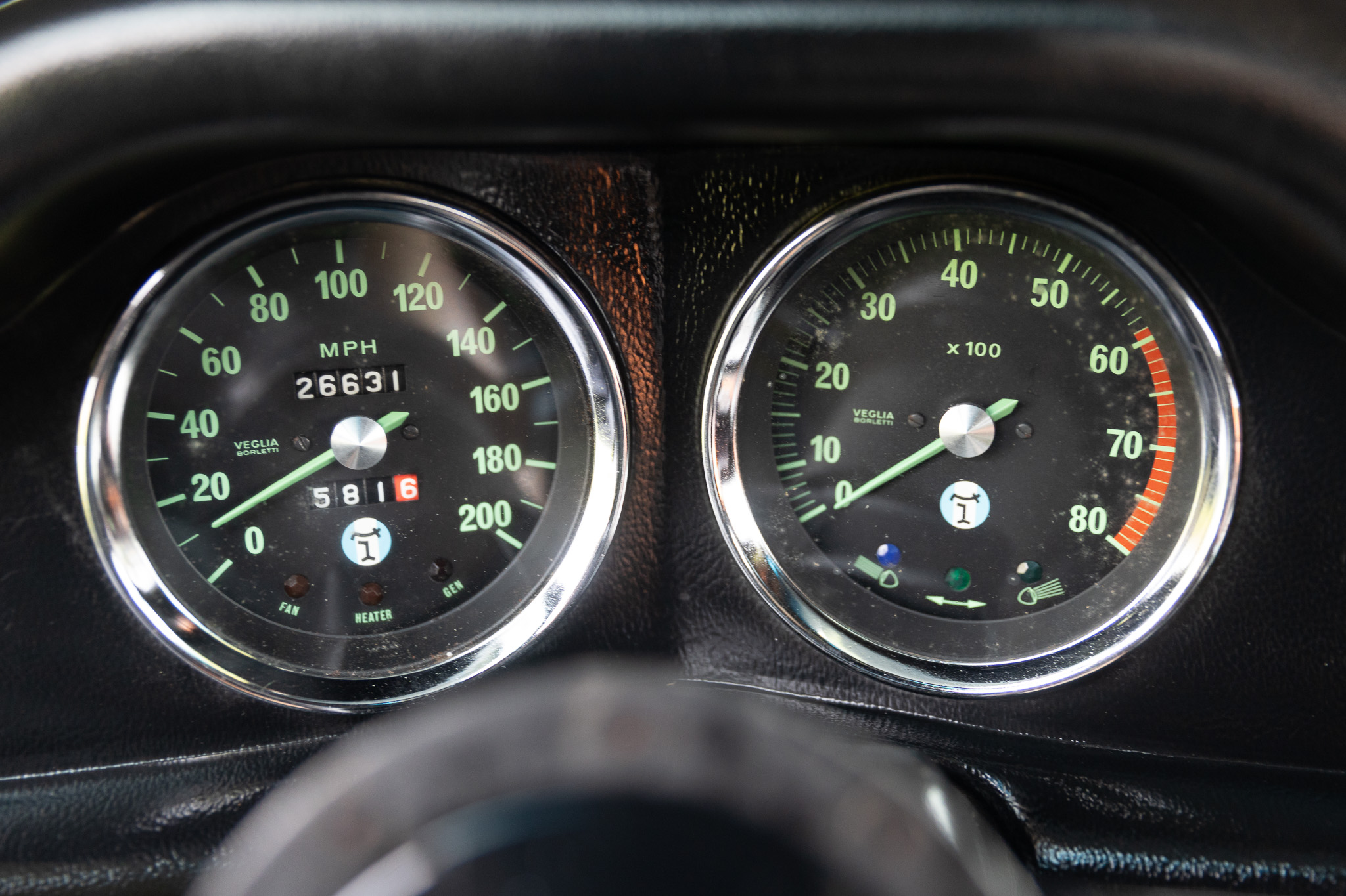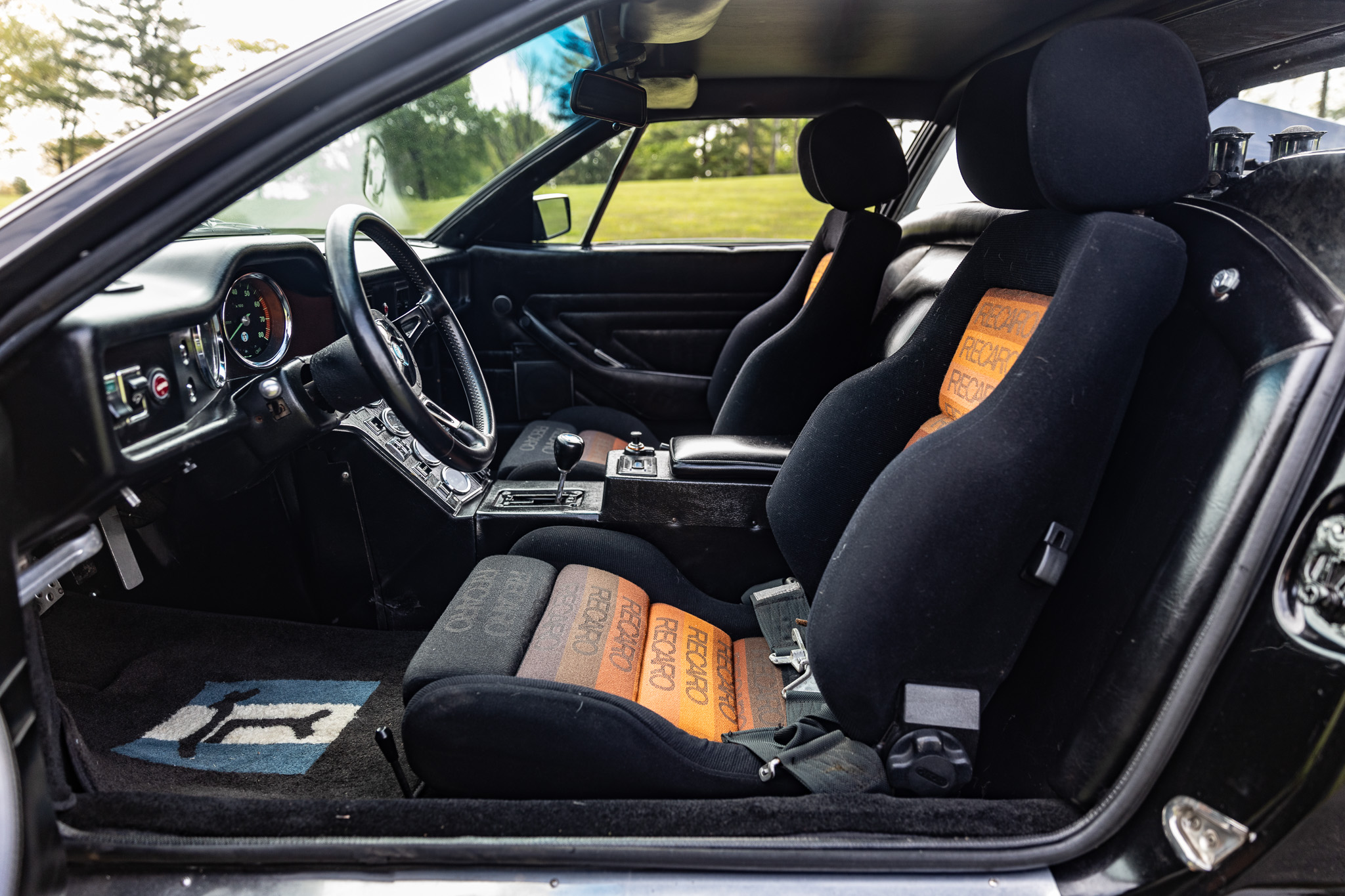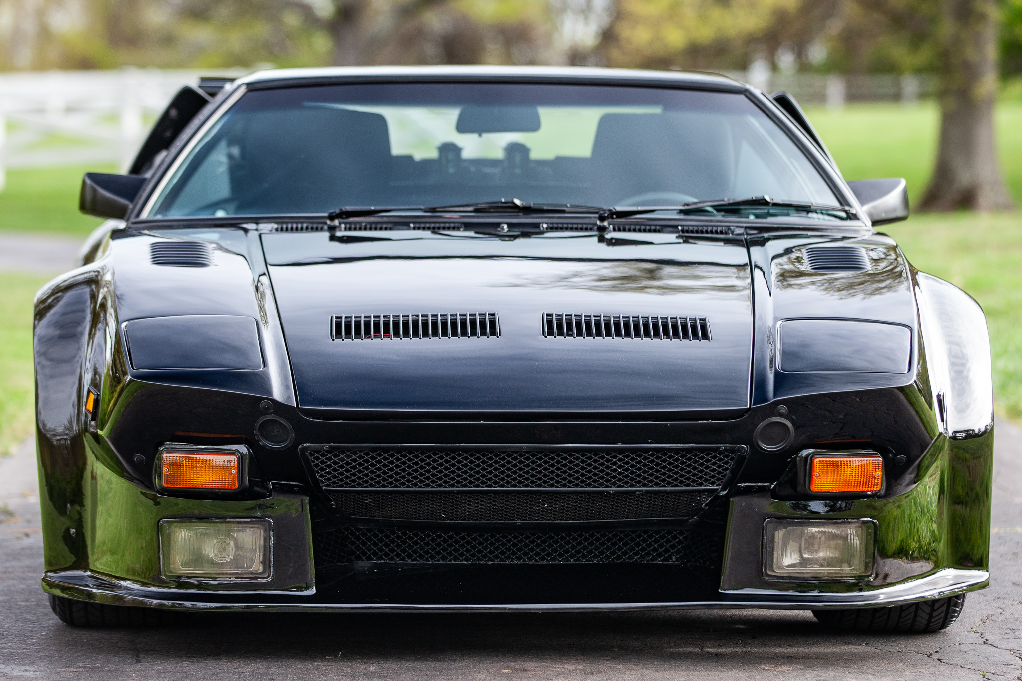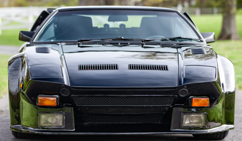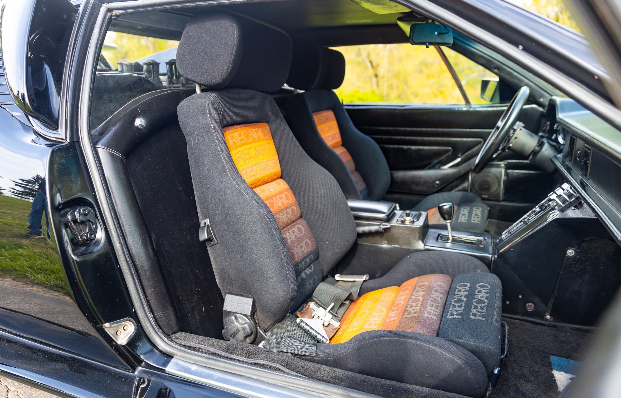 Finished in black over a black interior, the car features GT5-style bodywork that includes flared fenders, rocker panel extensions, and a rear wing. Power is provided by a 351ci Cleveland V8 and is fitted with quadruple Weber carburetors atop an Inglese manifold. Shifting is via a five-speed manual transmission, and further equipment includes 15″ wheels, Recaro bucket seats, power windows, and a Sony cassette stereo.