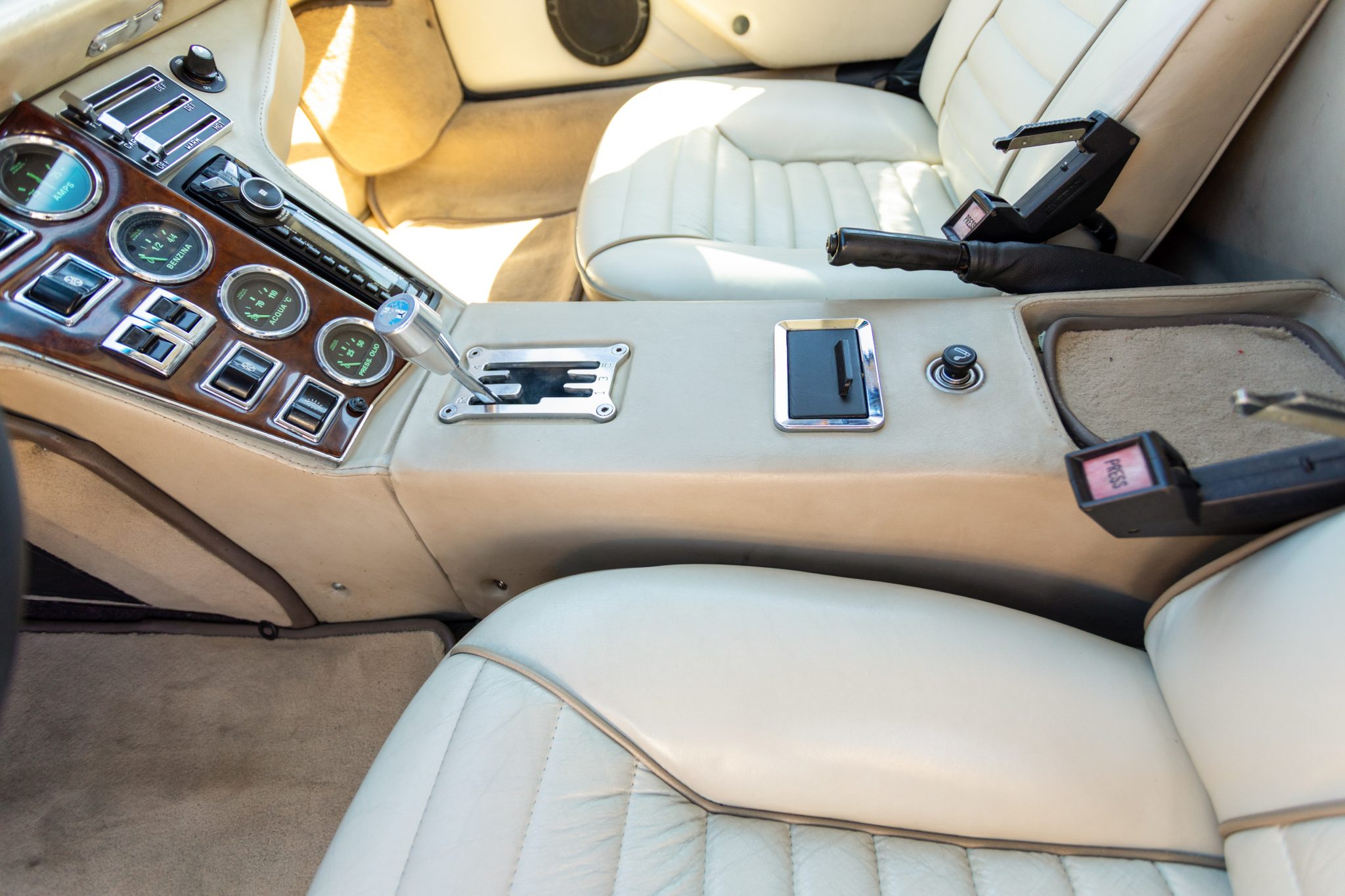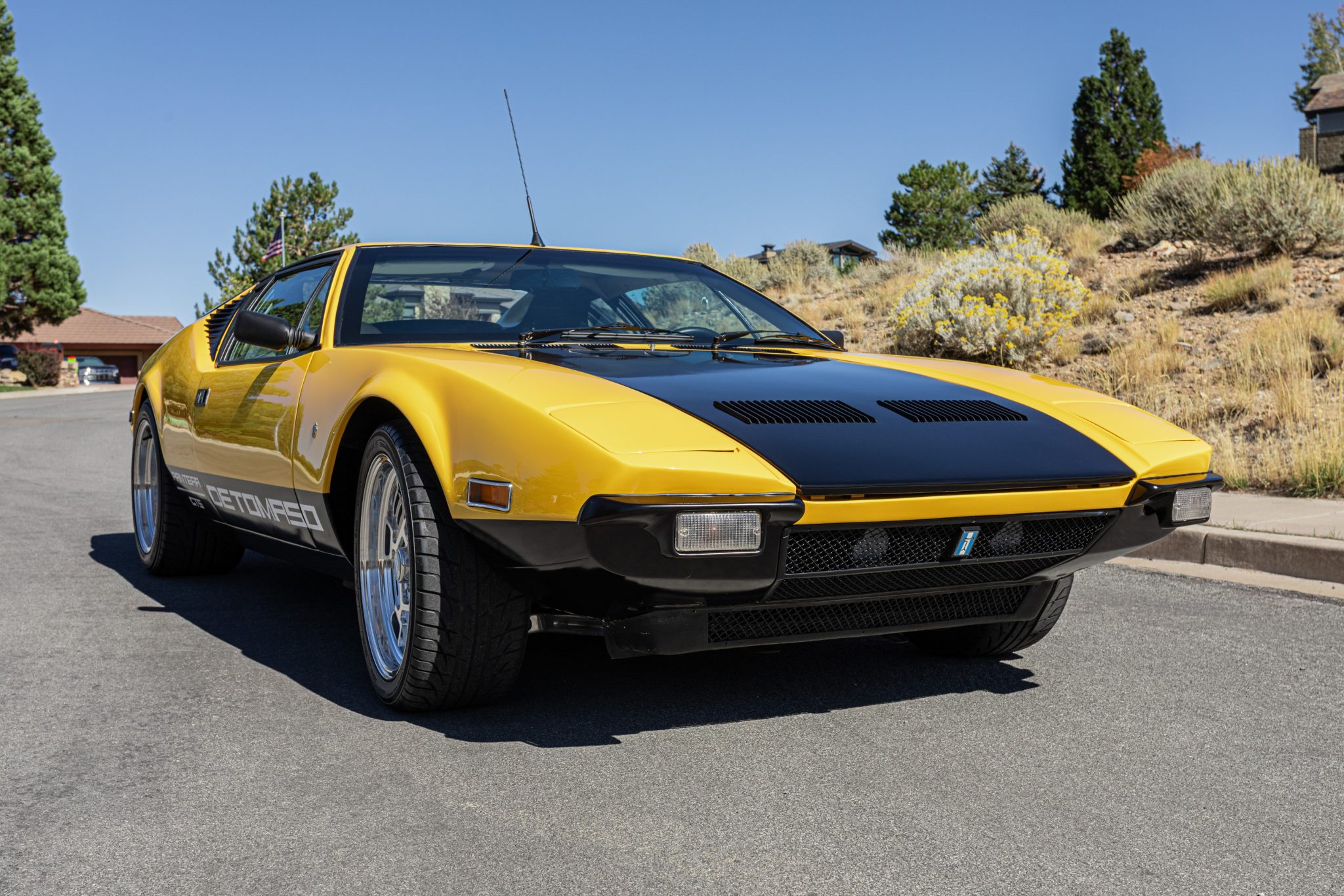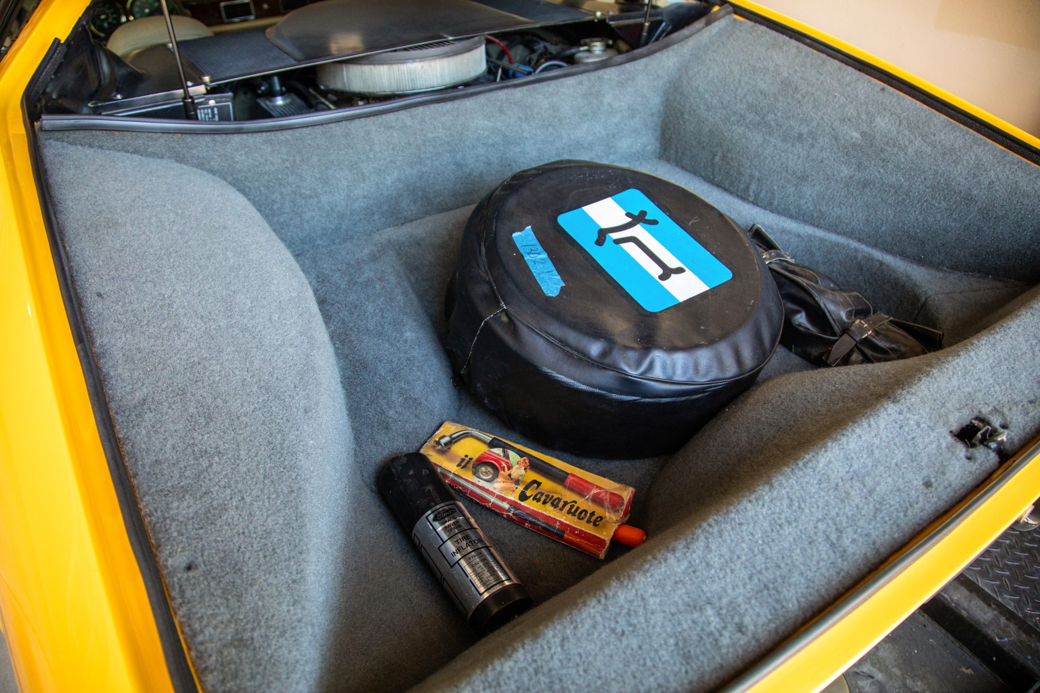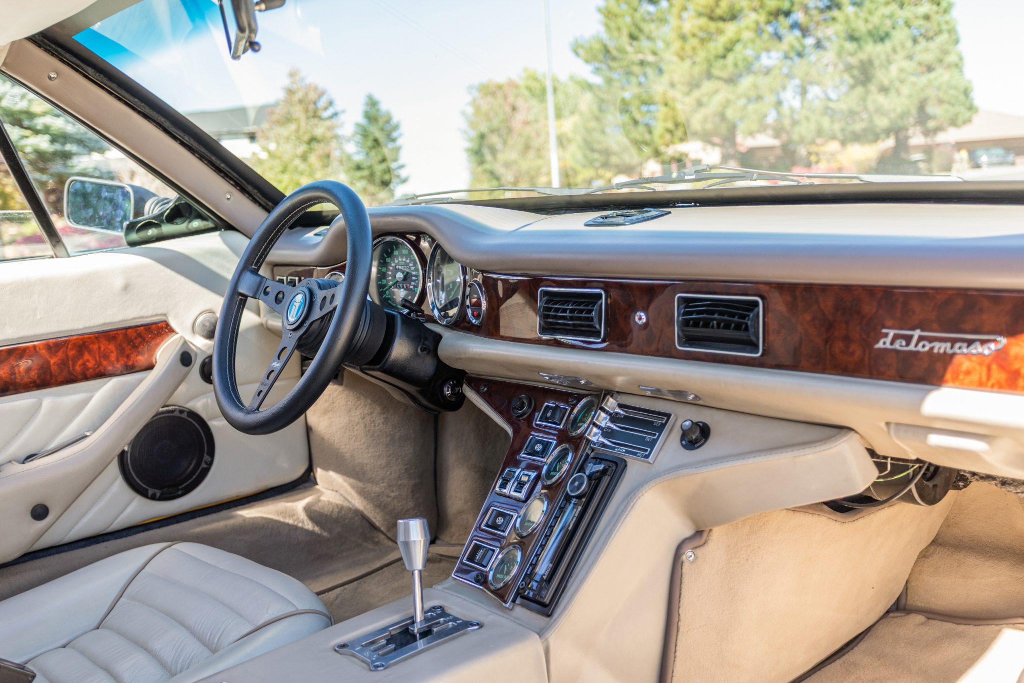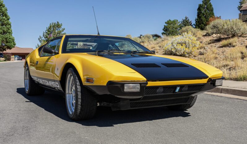 Work involved an interior retrim and a rebuild of the 351ci Ford Cleveland V8 with roller rockers, ARP hardware, a Holley Demon carburetor, and a Brüllen exhaust system. The suspension was updated with aluminum control arms, Carrera shocks, and polyurethane sway bar bushings, and 17” Campagnolo-style wheels were also mounted. Inside, the cabin was re-trimmed in two-tone leather upholstery complemented by a MOMO steering wheel, Veglia Borletti gauges, and Wilton wool carpets along with air conditioning and a Bluetooth-capable Sony CD head unit.