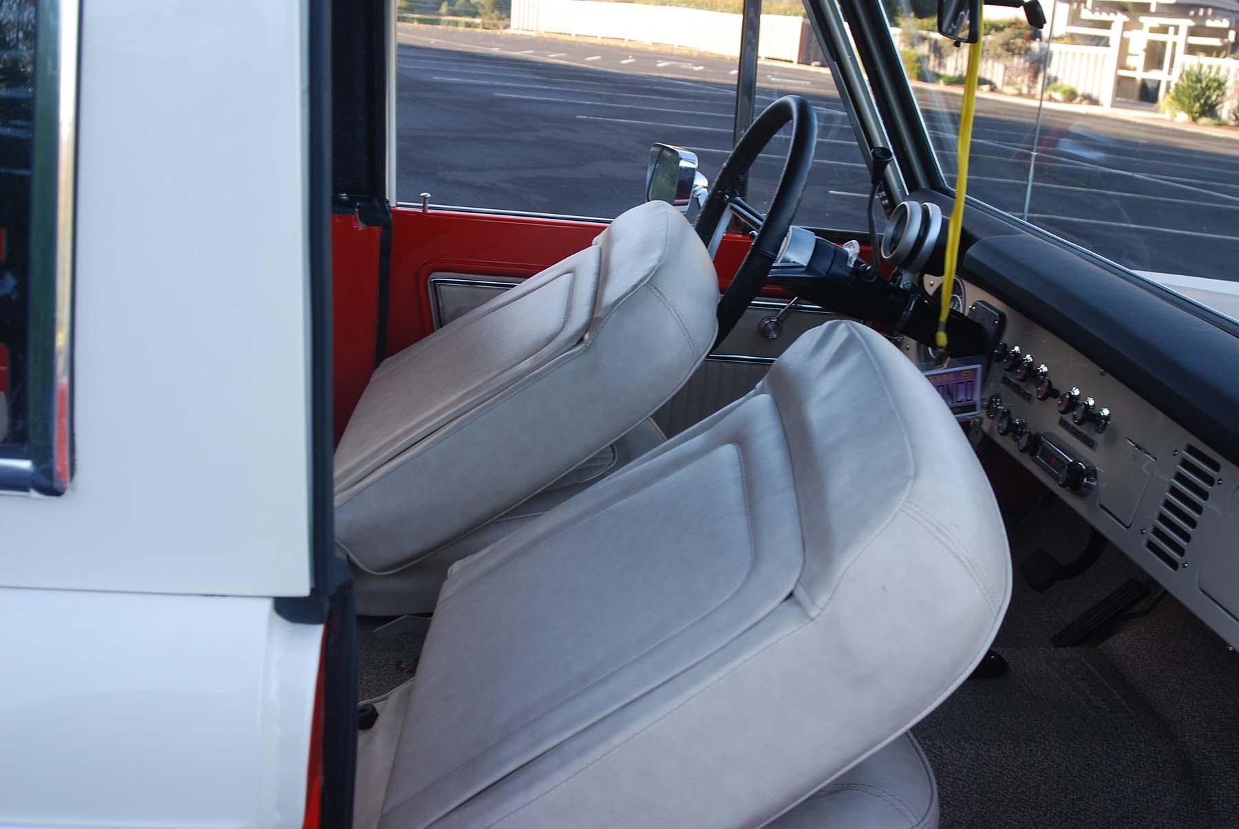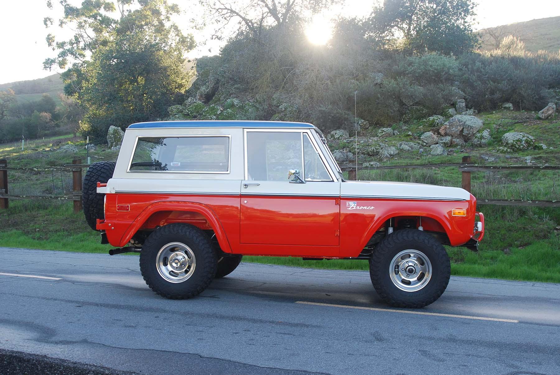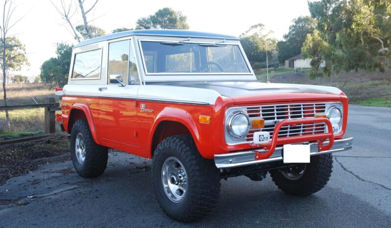 This 1973 Ford Bronco is one of a limited number of Baja models produced between 1971 and 1975 to commemorate victories in the Baja 500 and Baja 1000 by Bill Stroppe-prepared Broncos. the truck was subsequently refinished in red, white, and blue and fitted with a 5.0-liter V8 that was sourced from a 1987 Ford Mustang and fitted with Edelbrock Pro Flo 4 fuel injection, Sealed Power hypereutectic pistons, and Eagle connecting rods. Limited-slip front and rear differentials were also installed along with 3.55:1 gear sets, 15″ US Mags Indy wheels, James Duff radius arms, and Wilwood four-wheel disc brakes. The three-speed automatic transmission is linked to a dual-range transfer case, and other details include manually locking front hubs, power steering, a removable hardtop, chrome bumpers, a “Cactus Smasher” pushbar, and Cibie auxiliary lights. Inside, heated front seats are trimmed in Parchment upholstery, and a Bluetooth module is located in the glovebox.
