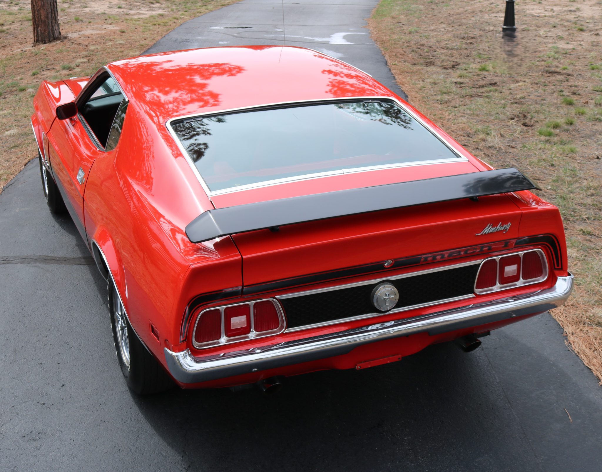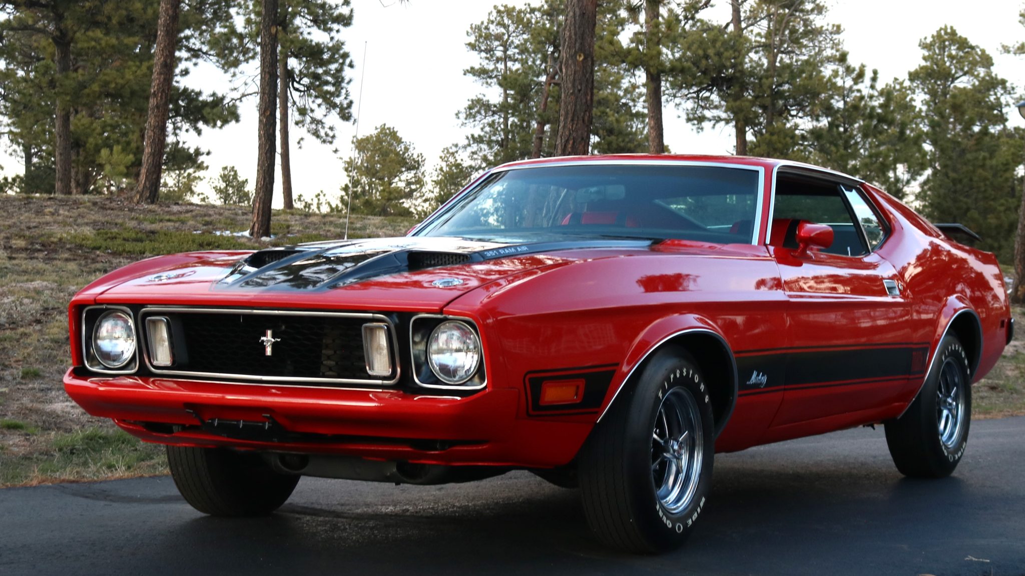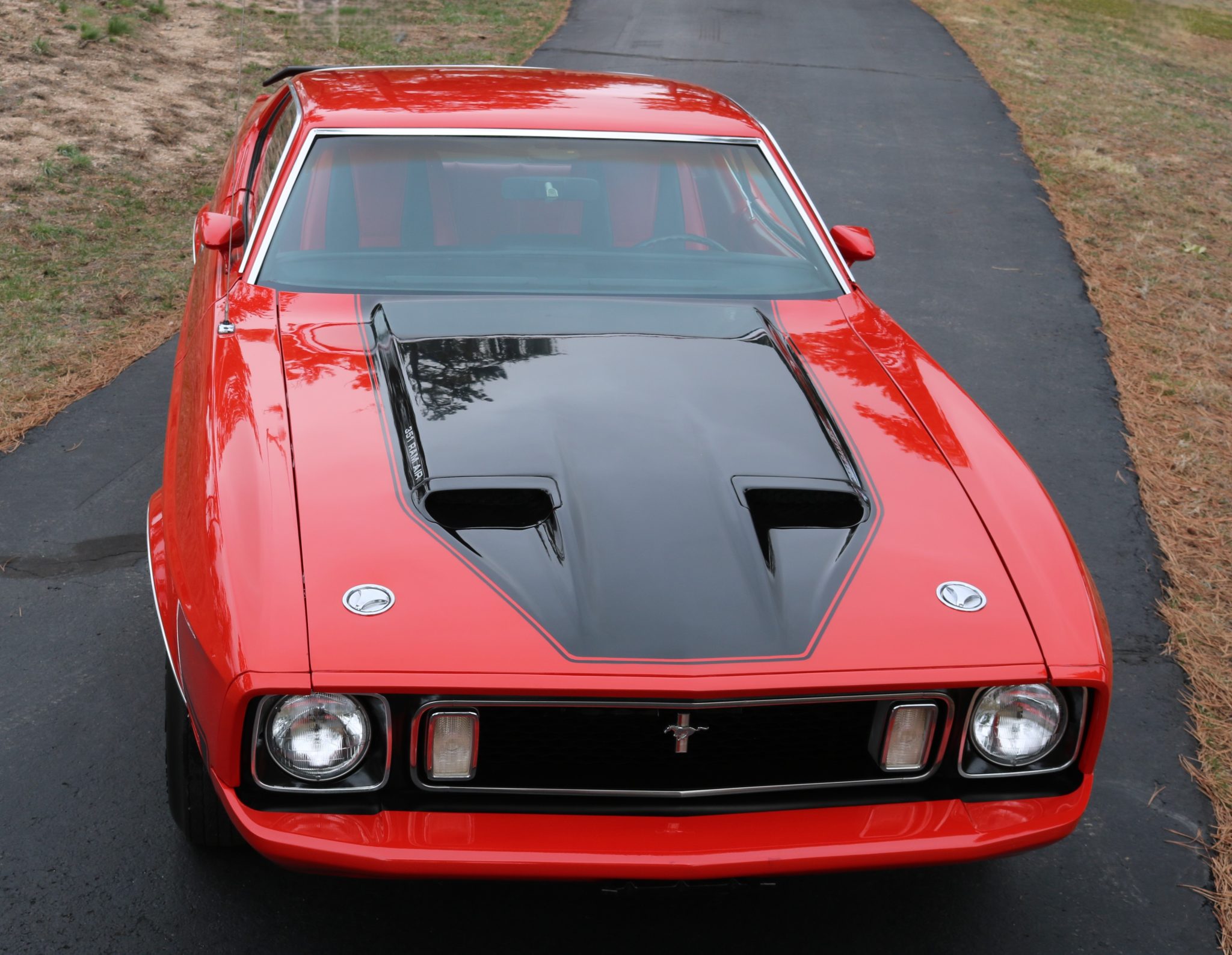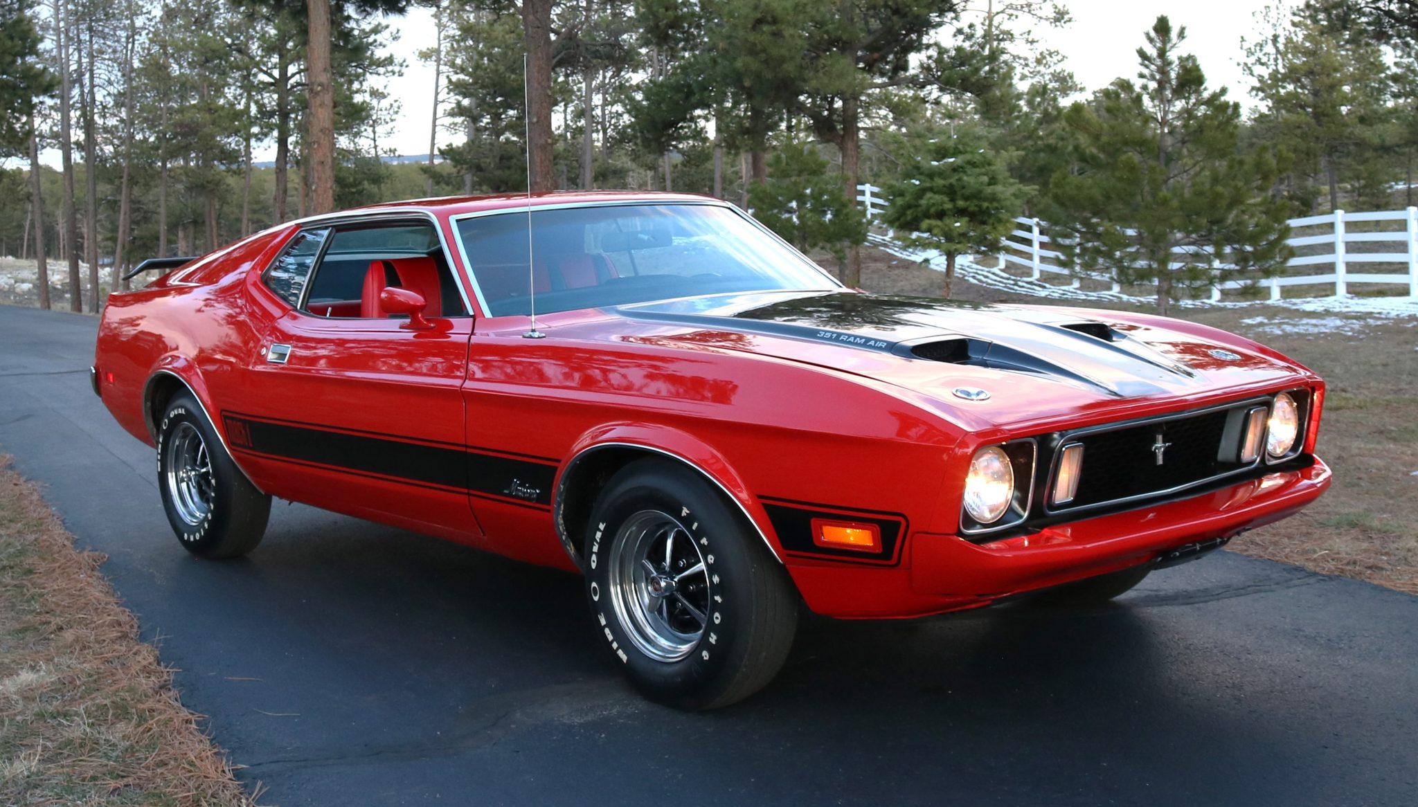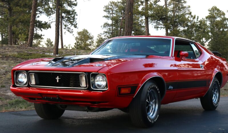 Power comes from a Cobra Jet 351ci Cleveland V8 paired with a three-speed automatic transmission, and equipment includes a rear spoiler, long-tube headers, power-assisted front disc brakes, power steering, 14″ Magnum 500-style wheels, a cassette stereo, and a heater.