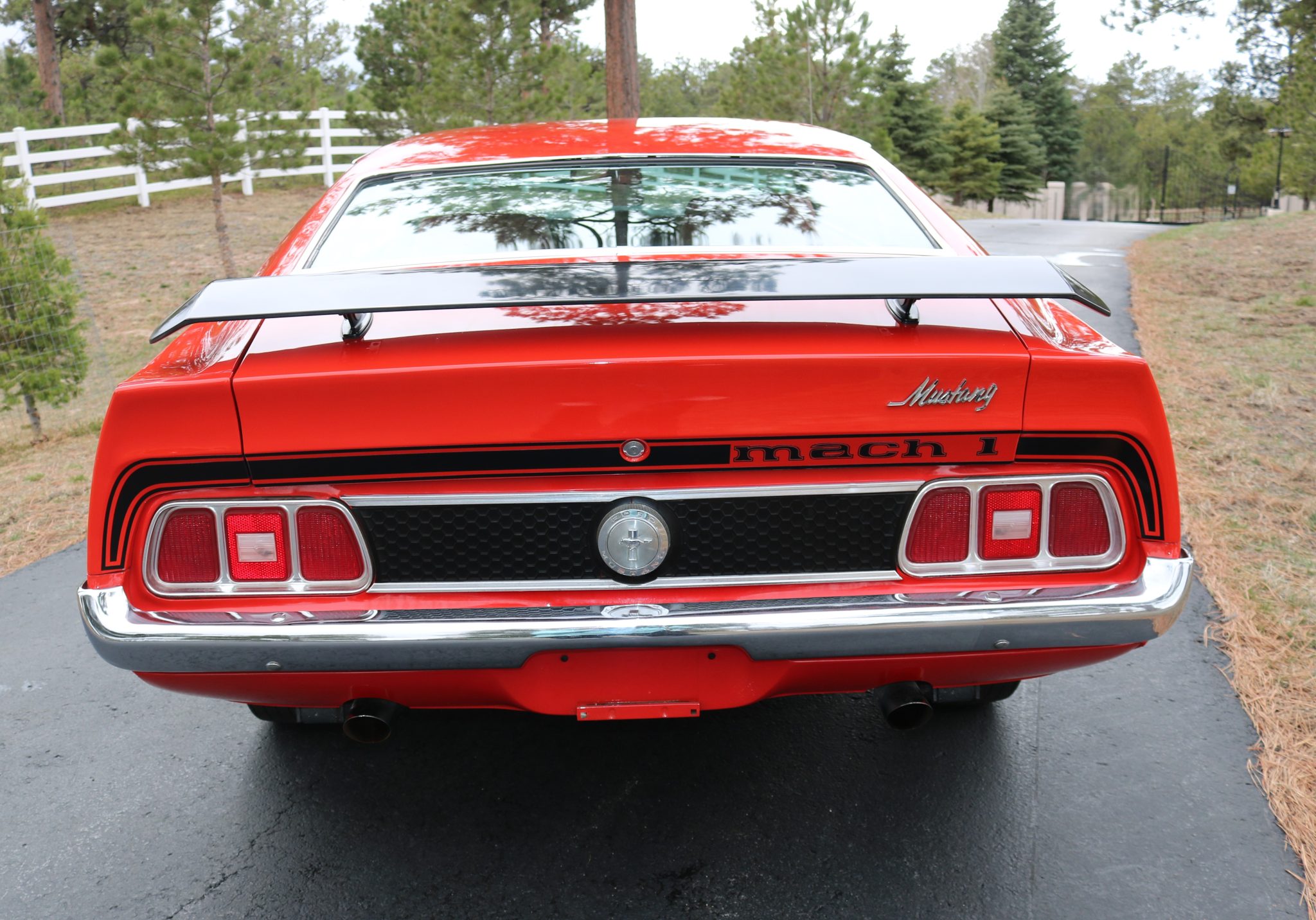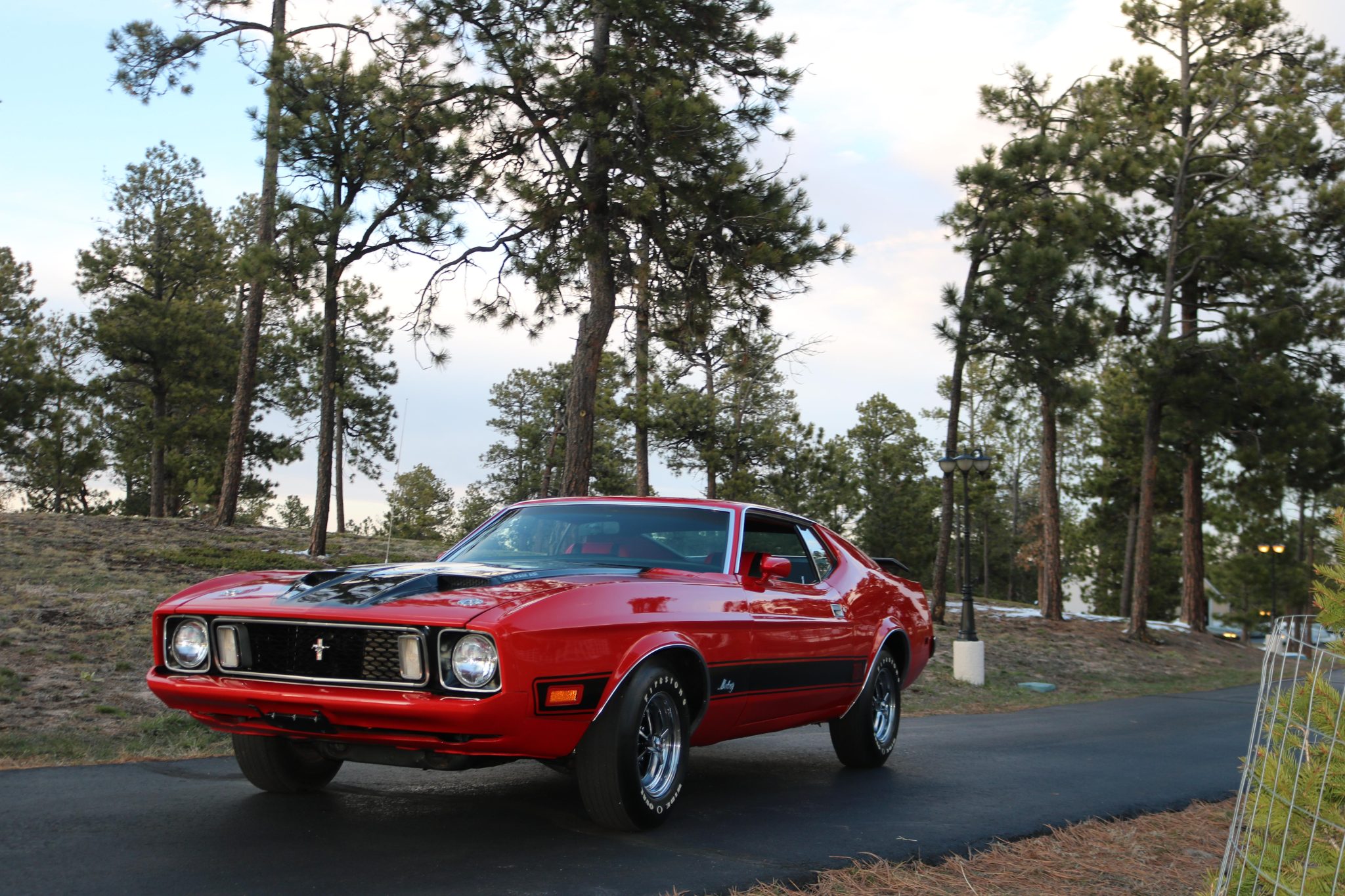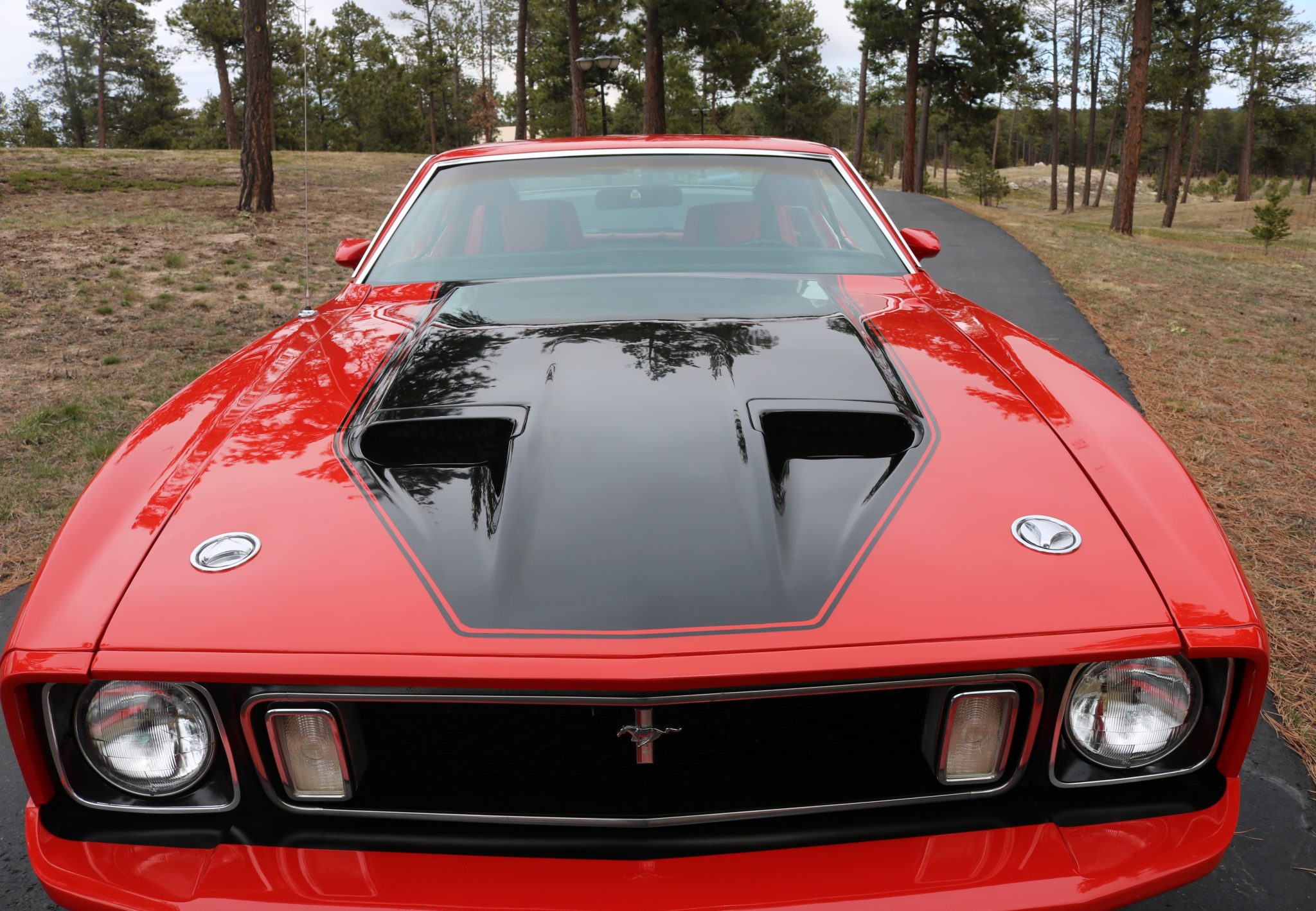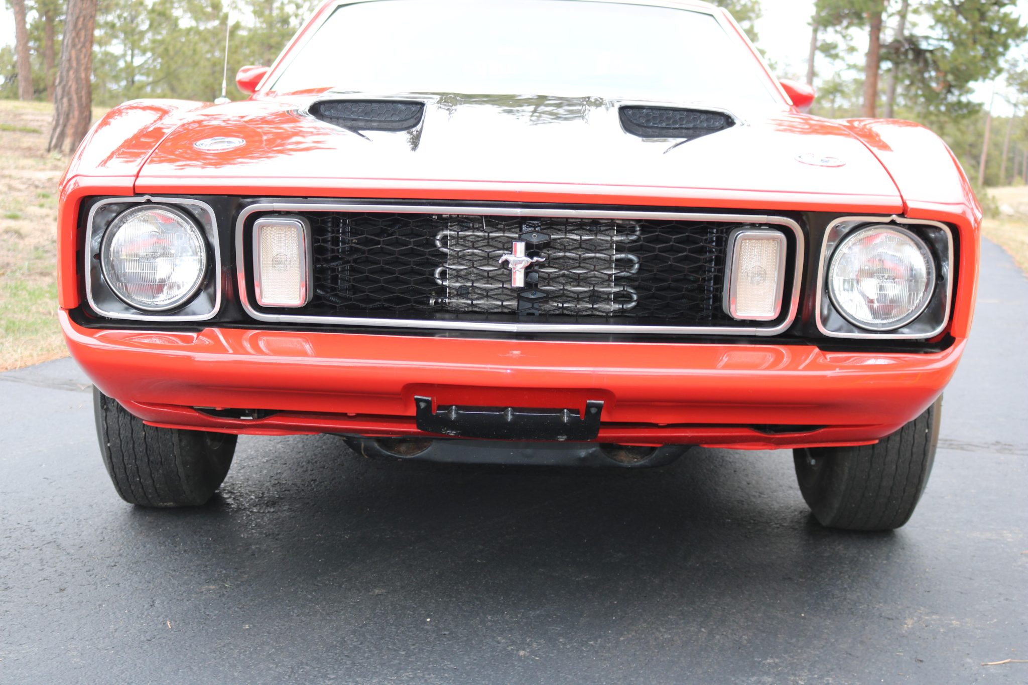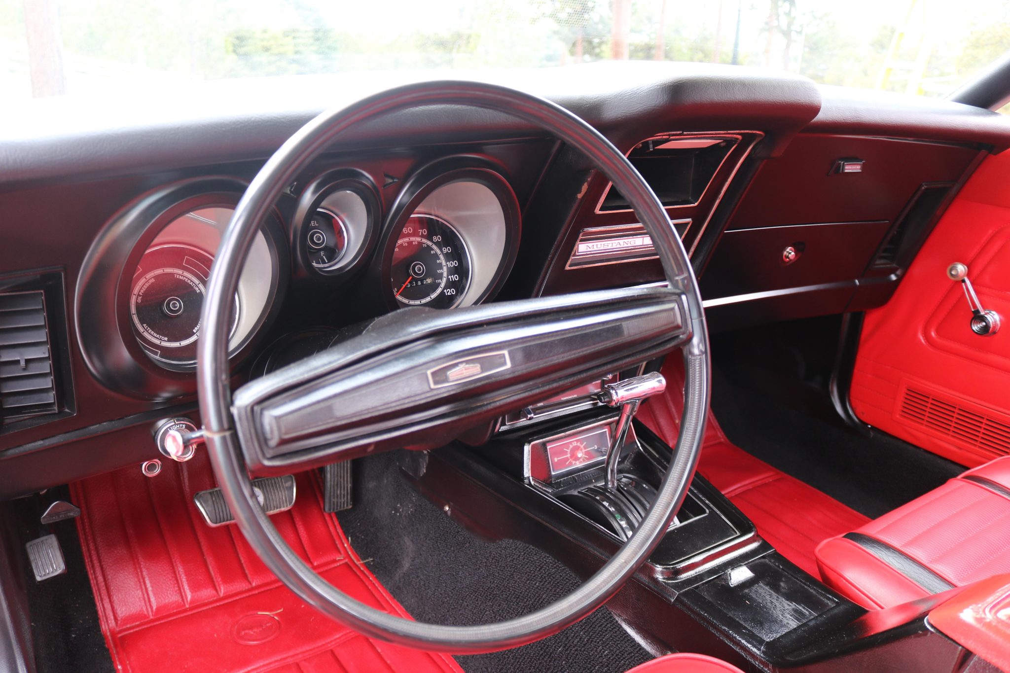 Power comes from a Cobra Jet 351ci Cleveland V8 paired with a three-speed automatic transmission, and equipment includes a rear spoiler, long-tube headers, power-assisted front disc brakes, power steering, 14″ Magnum 500-style wheels, a cassette stereo, and a heater.