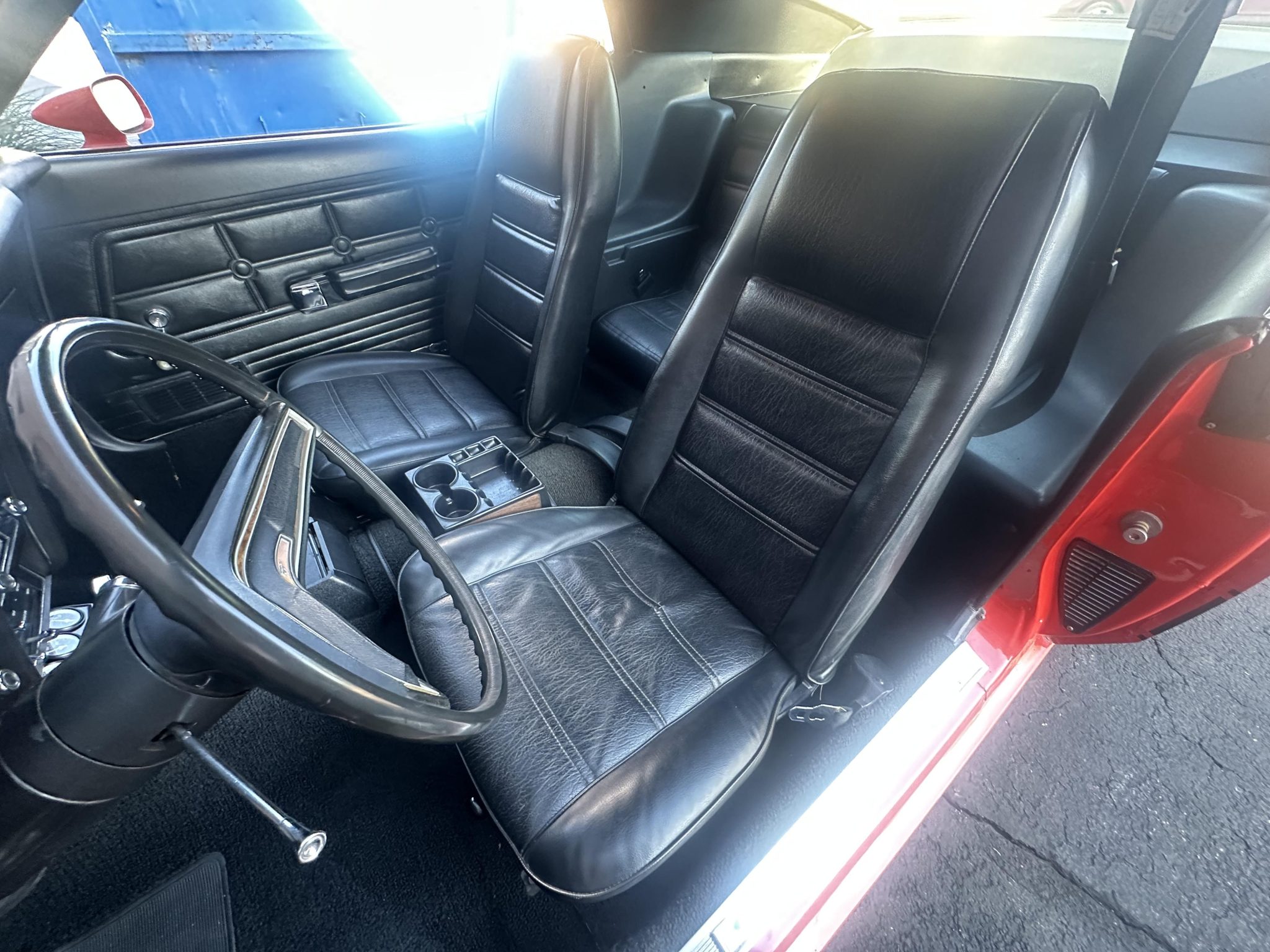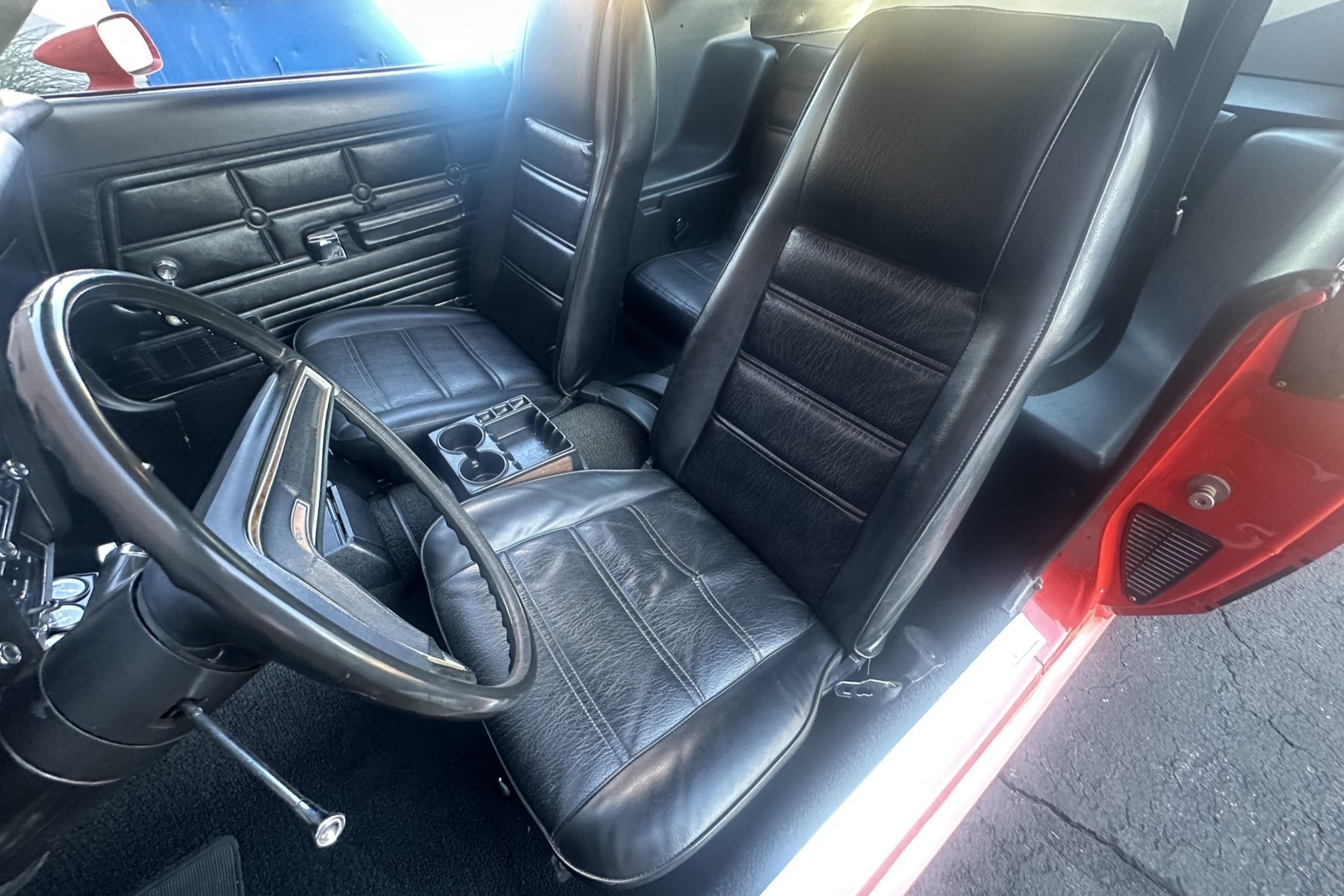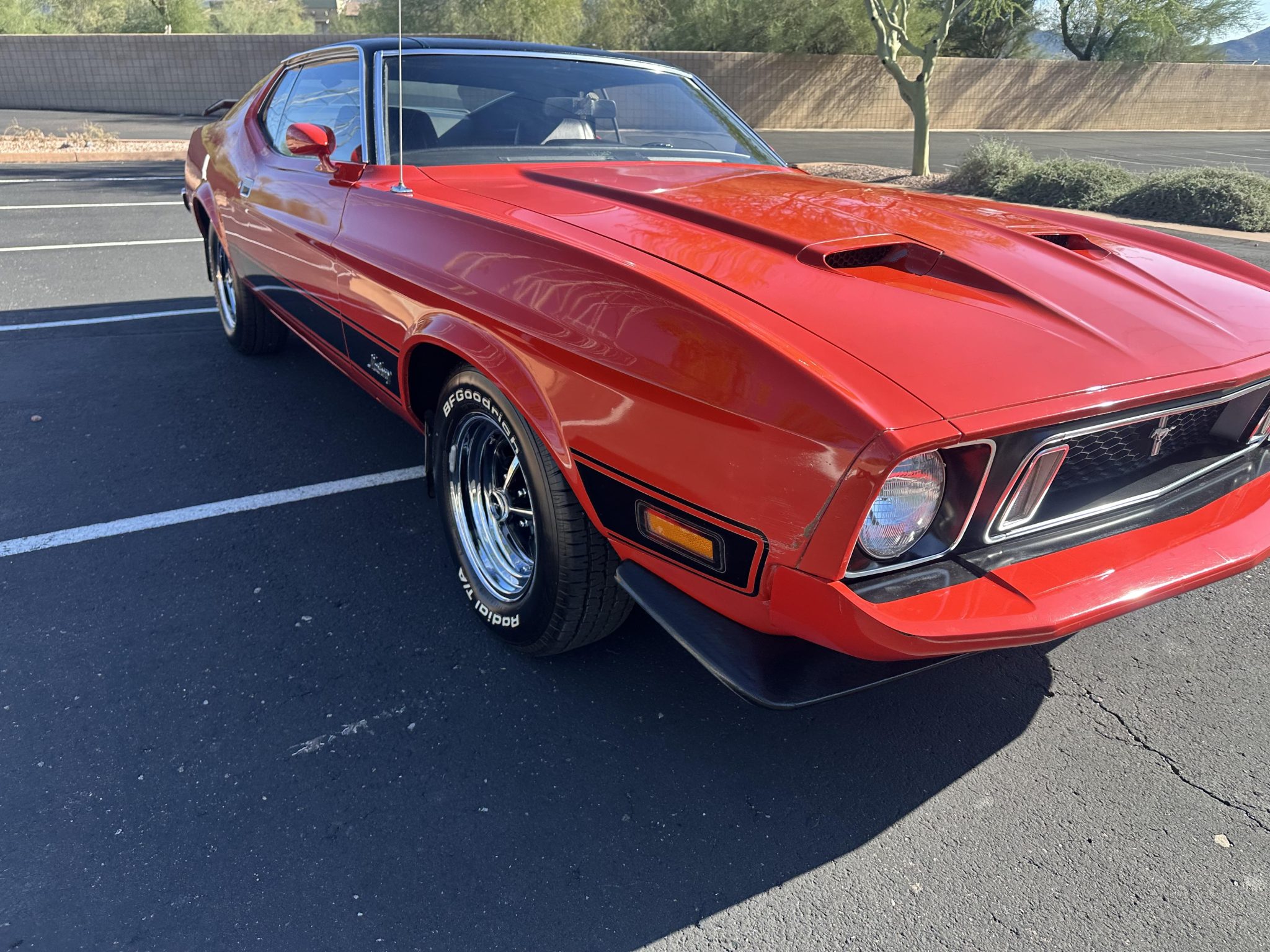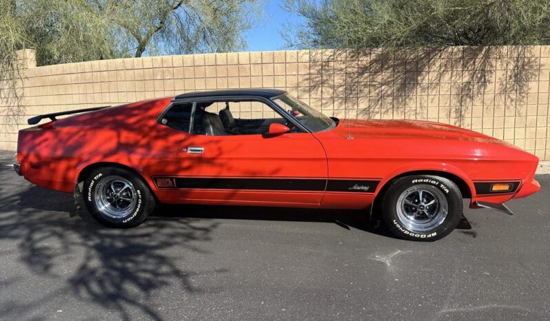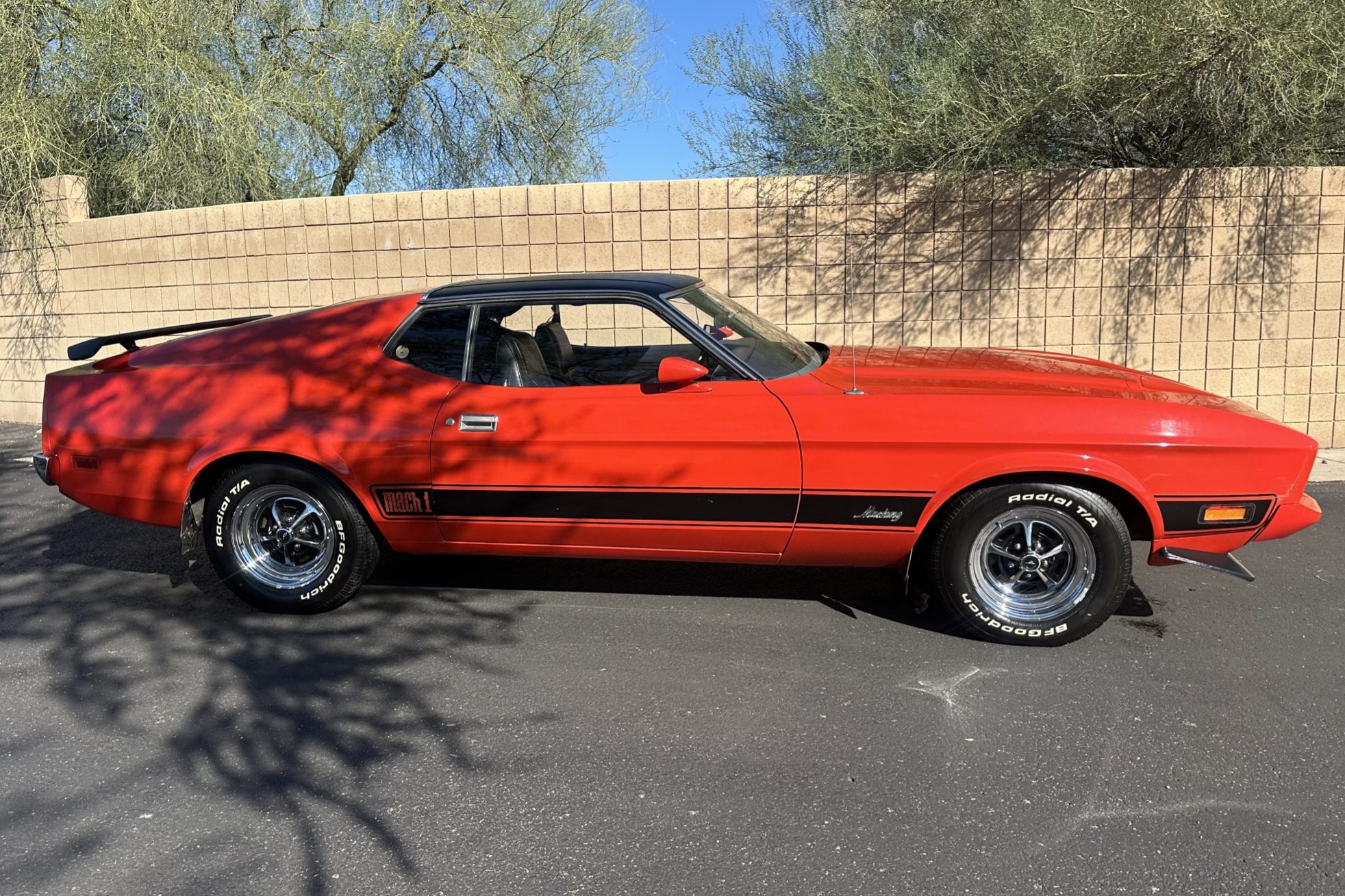This 1973 Ford Mustang Mach 1 was originally specified with Bright Red paintwork, a black Levant vinyl roof and black upholstery, and a 351ci 2V V8 linked to a C-6 automatic transmission and a 2.75 conventional rear end. Power steering, power-assisted front discs, sport wheel covers, rear bumper guards, and an 8-track radio were further optioned from the factory. It was fitted with 15″ Magnum 500-style wheels as well as front and rear spoilers
