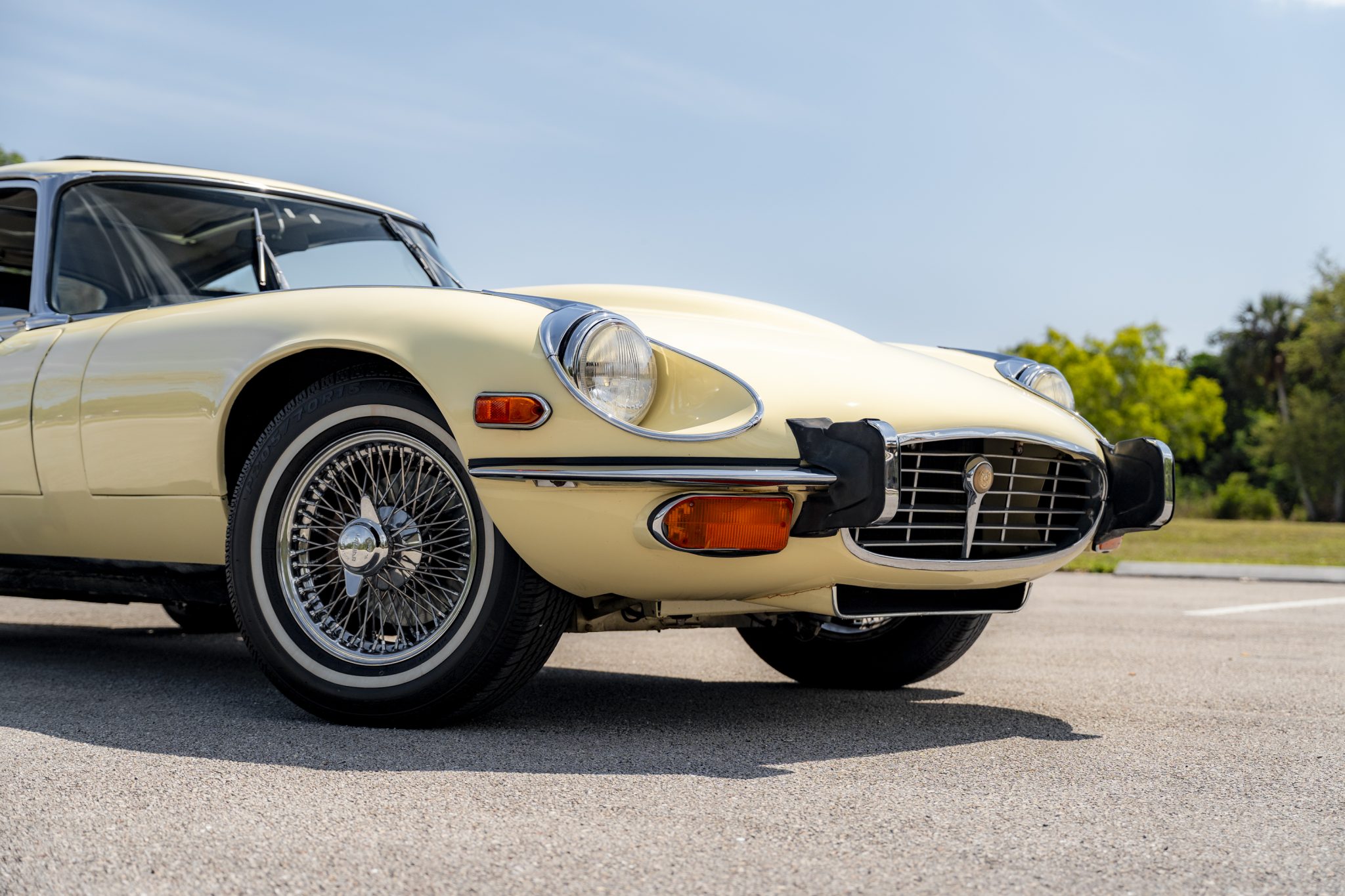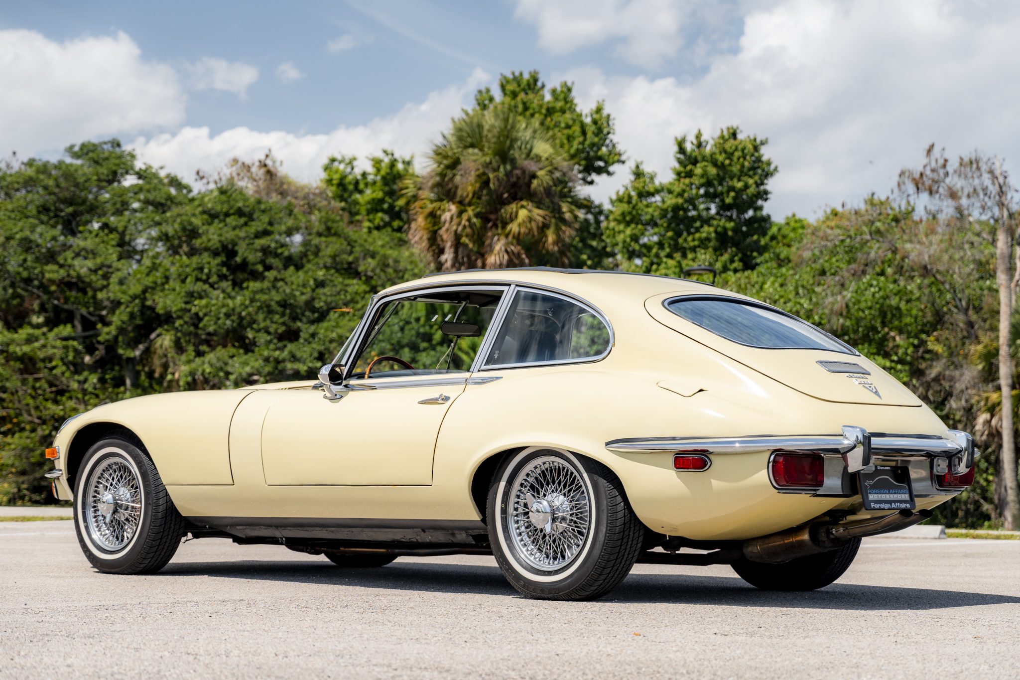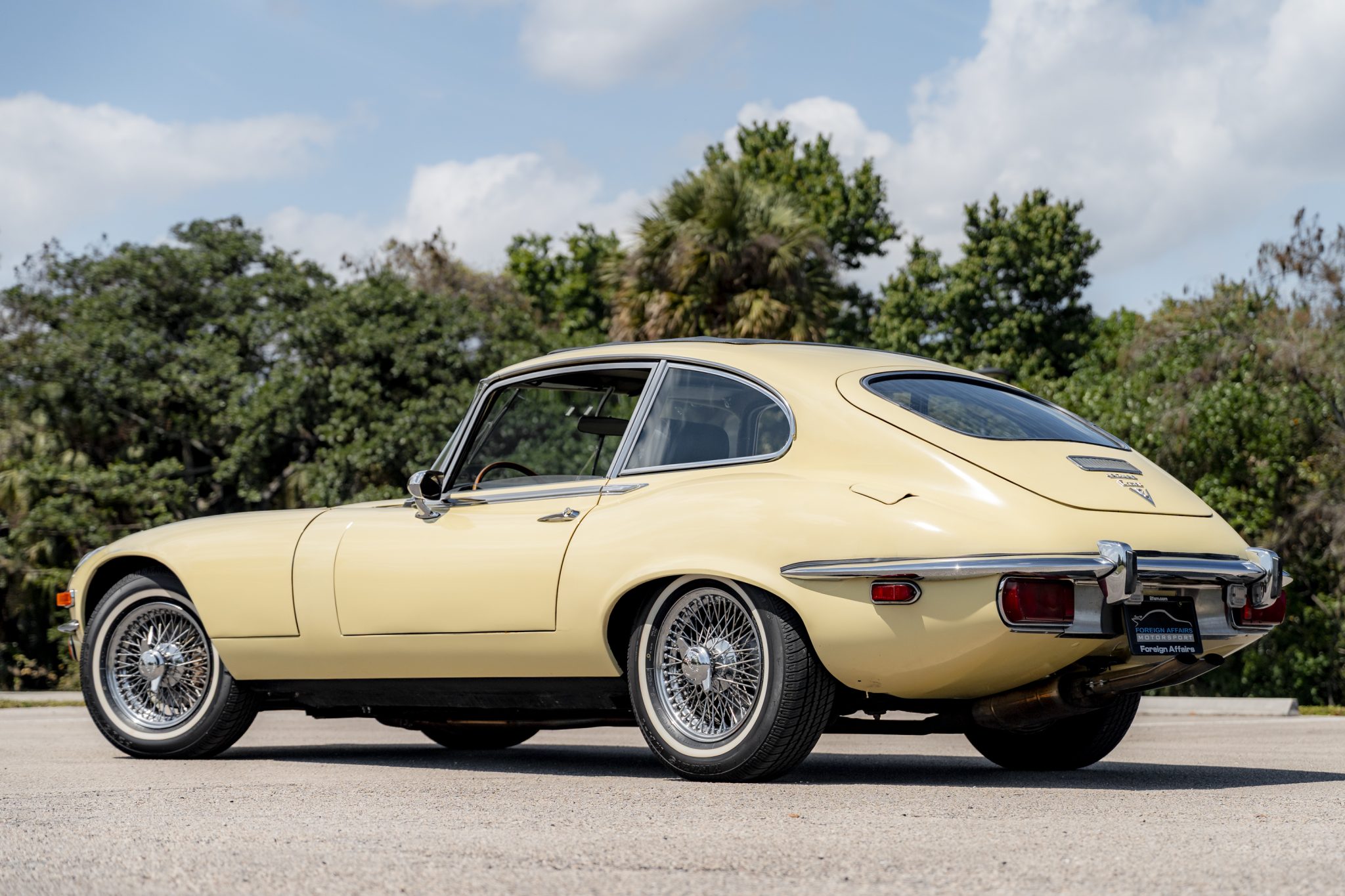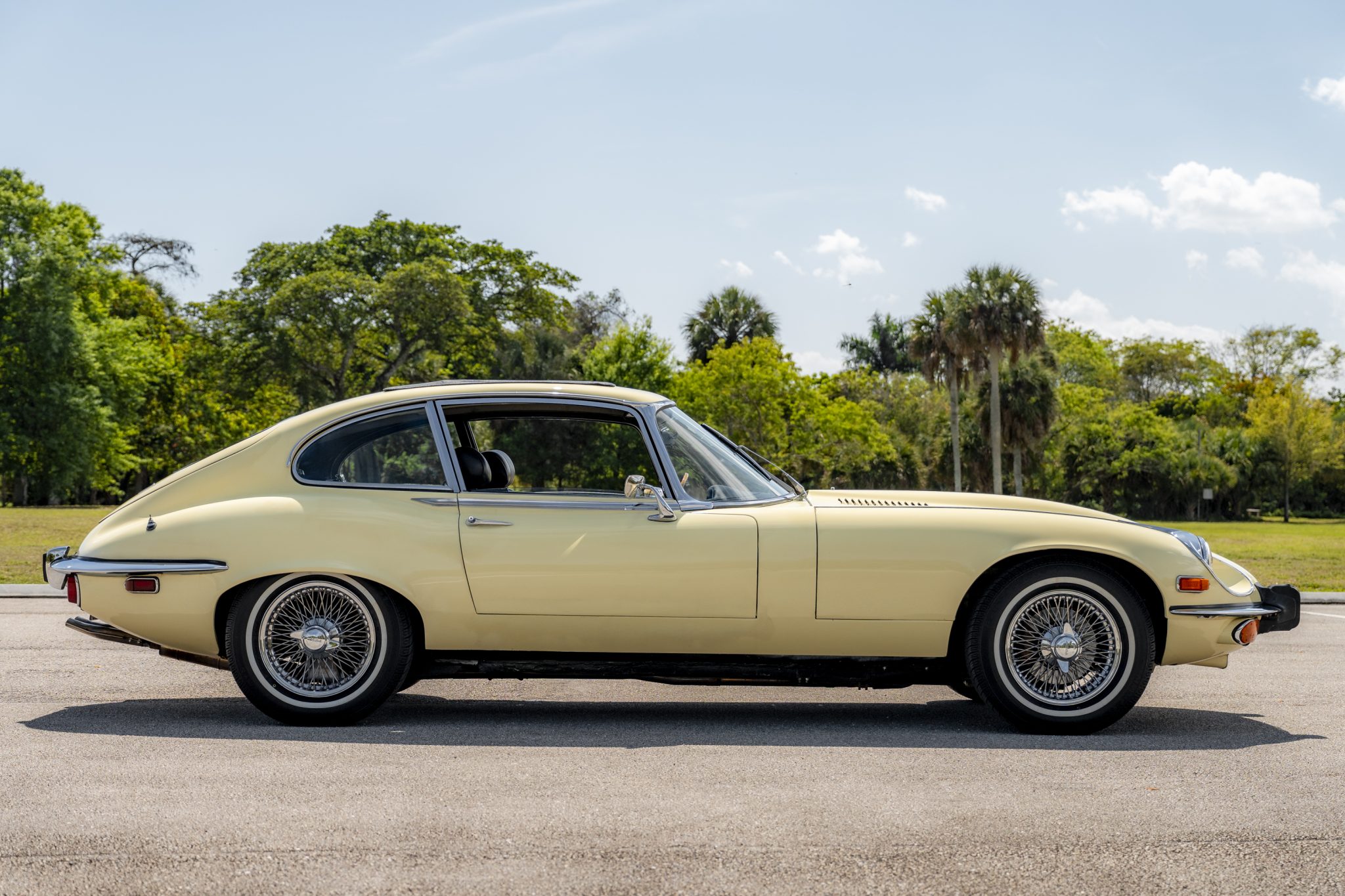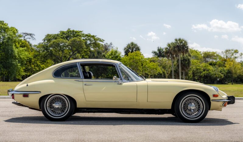 This 1973 Jaguar E-Type Series III 2+2 is powered by a 5.3-liter V12 linked with a Tremec six-speed manual transmission and a limited-slip differential. The car is finished in Pale Primrose over black leather, and features include four-wheel disc brakes, power steering, 15” knock-off wire wheels, quadruple carburetors, and a Sony CD stereo.