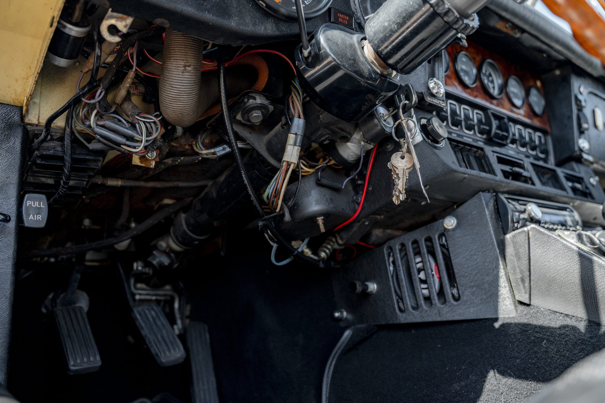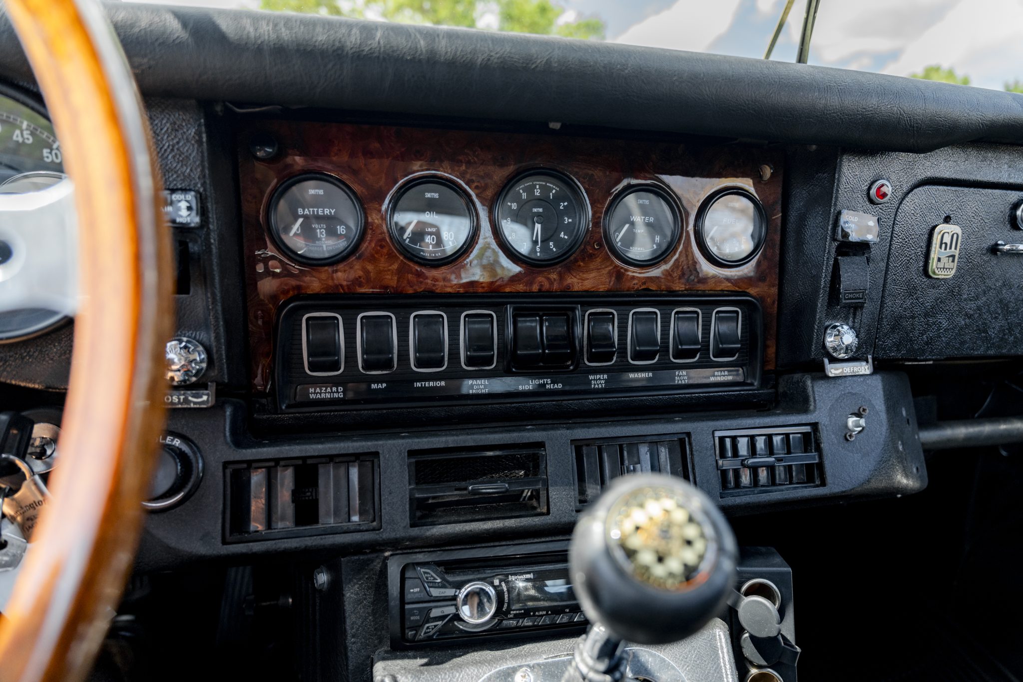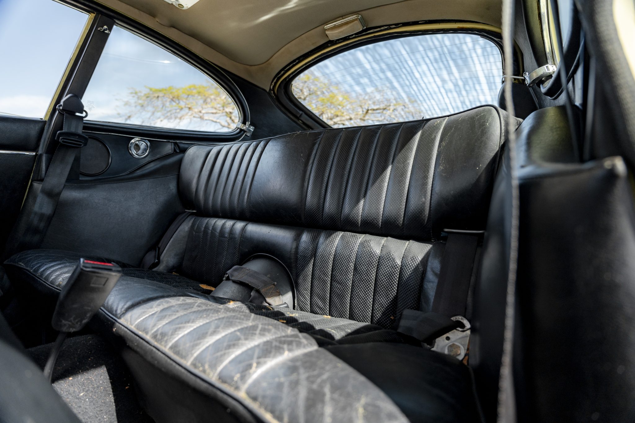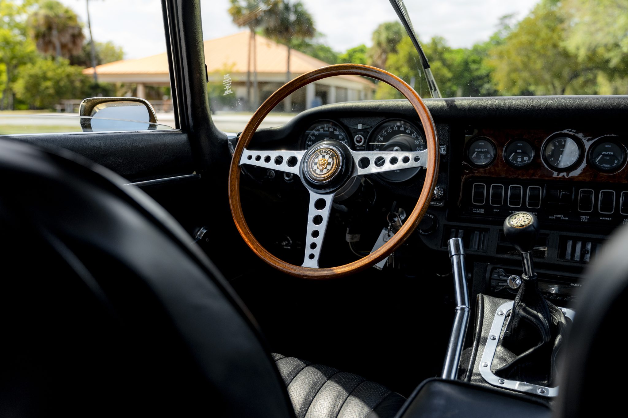 This 1973 Jaguar E-Type Series III 2+2 is powered by a 5.3-liter V12 linked with a Tremec six-speed manual transmission and a limited-slip differential. The car is finished in Pale Primrose over black leather, and features include four-wheel disc brakes, power steering, 15” knock-off wire wheels, quadruple carburetors, and a Sony CD stereo.