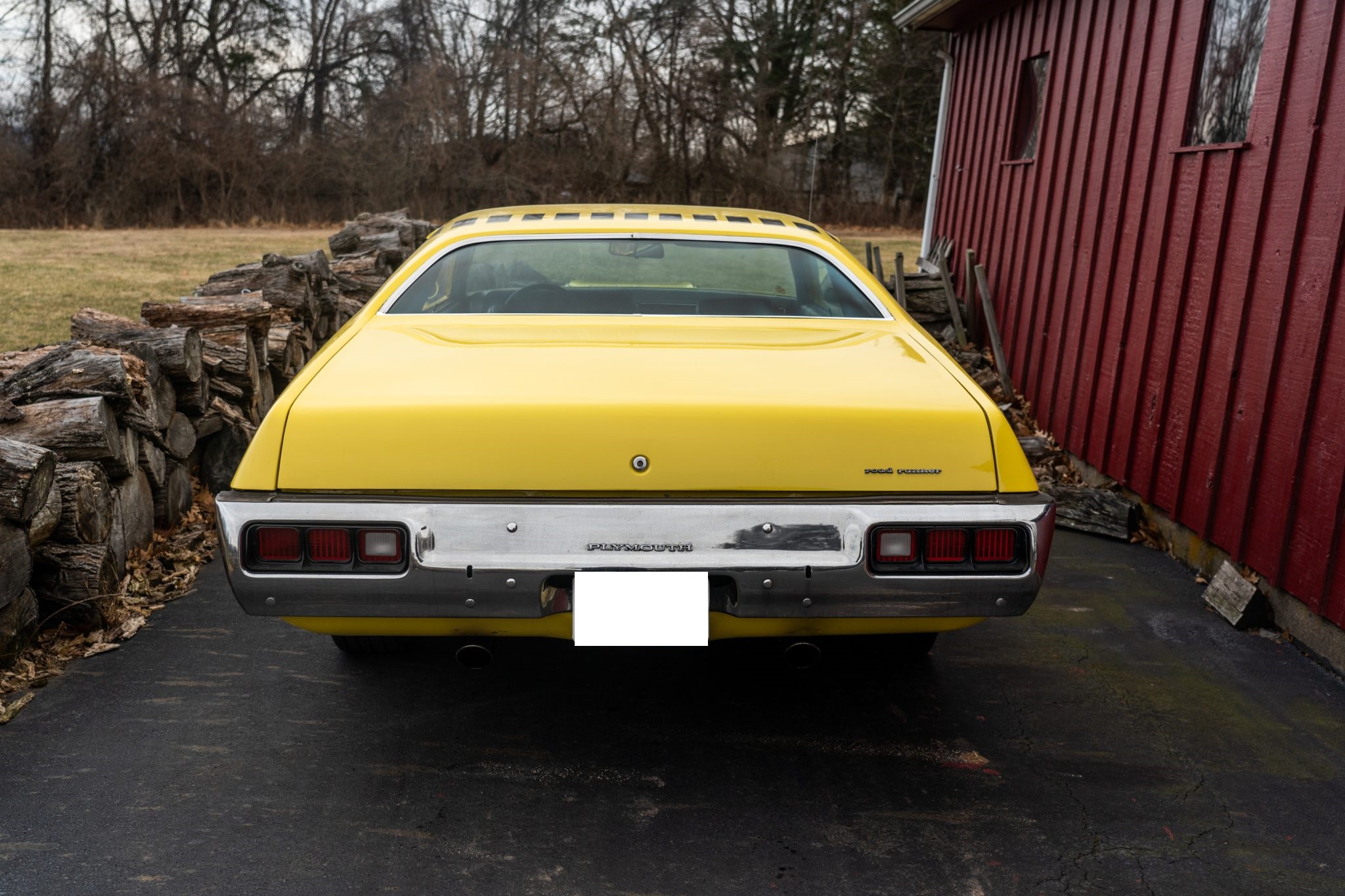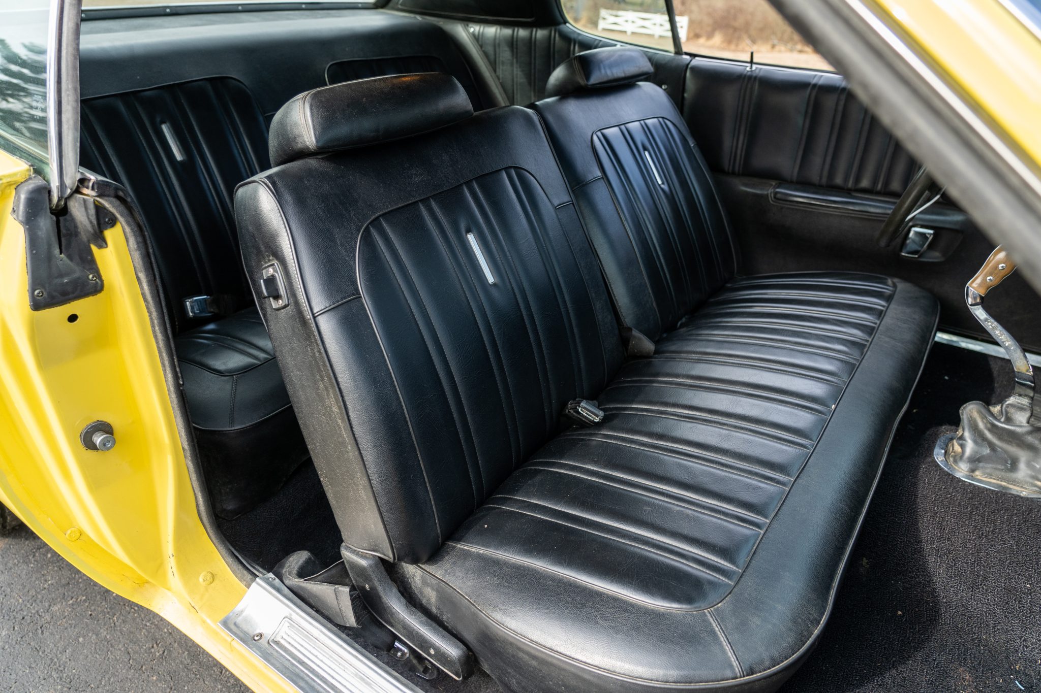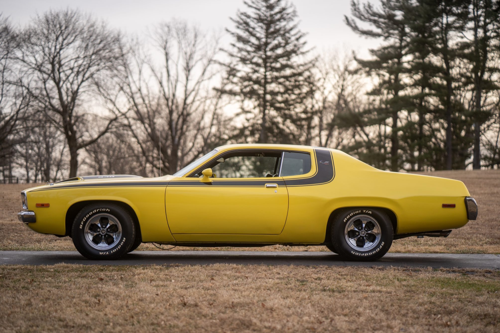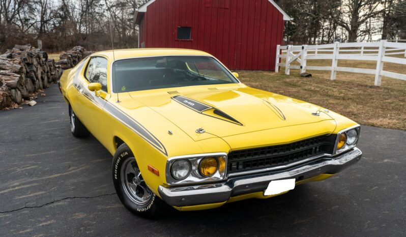This 1973 Plymouth Road Runner is powered by a numbers-matching 340ci V8 paired with a four-speed manual transmission and a Sure Grip rear end with 3.55:1 gearing. Finished in yellow with black side stripes over black vinyl, the car features a ventilated hood secured with pins, body-color side-view mirrors, polished 15” Keystone Klassic wheels, a push-button AM radio, and a Hurst pistol-grip shifter.