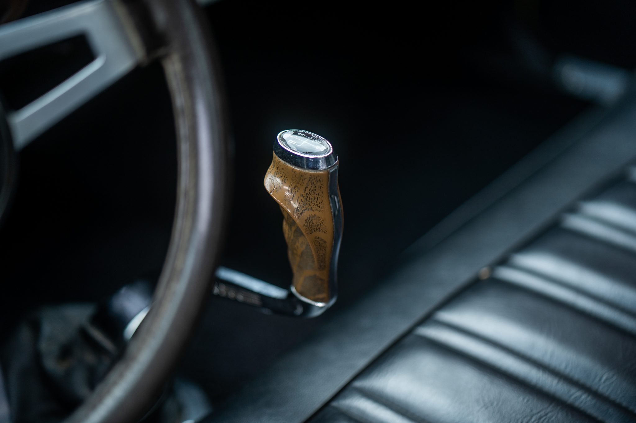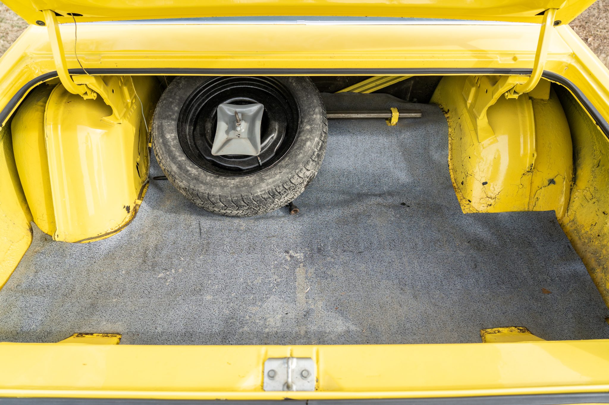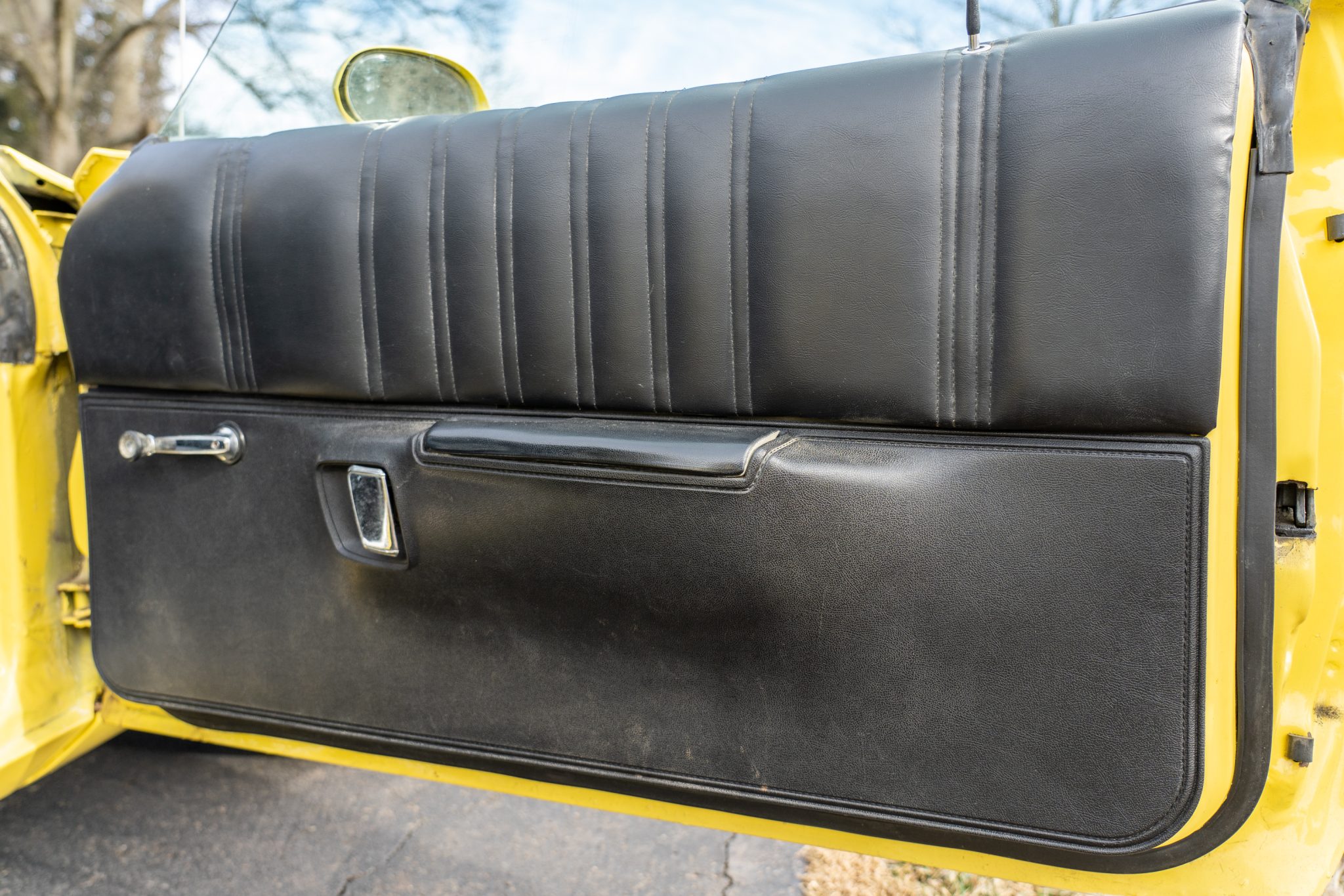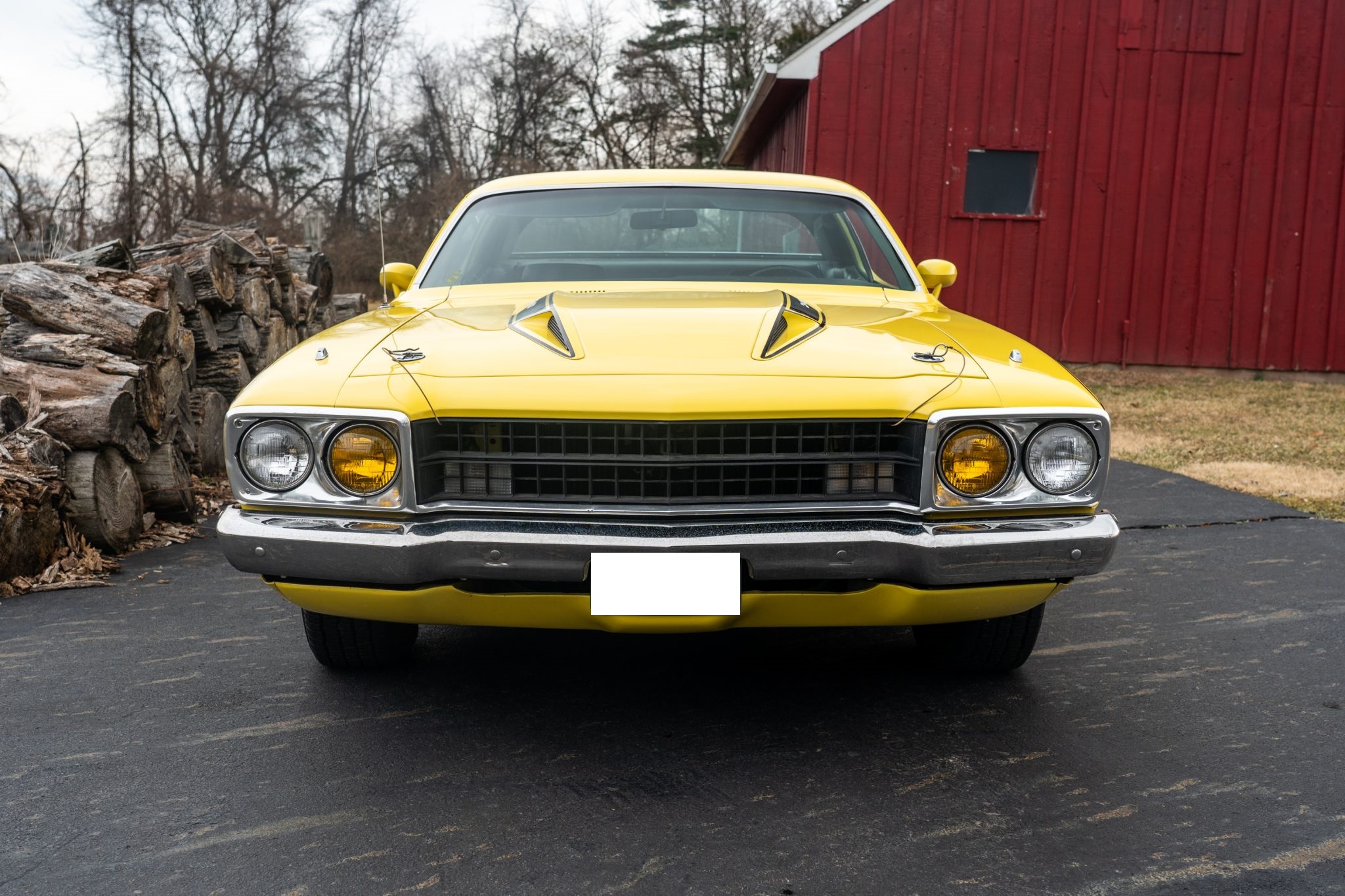 This 1973 Plymouth Road Runner is powered by a numbers-matching 340ci V8 paired with a four-speed manual transmission and a Sure Grip rear end with 3.55:1 gearing. Finished in yellow with black side stripes over black vinyl, the car features a ventilated hood secured with pins, body-color side-view mirrors, polished 15” Keystone Klassic wheels, a push-button AM radio, and a Hurst pistol-grip shifter.