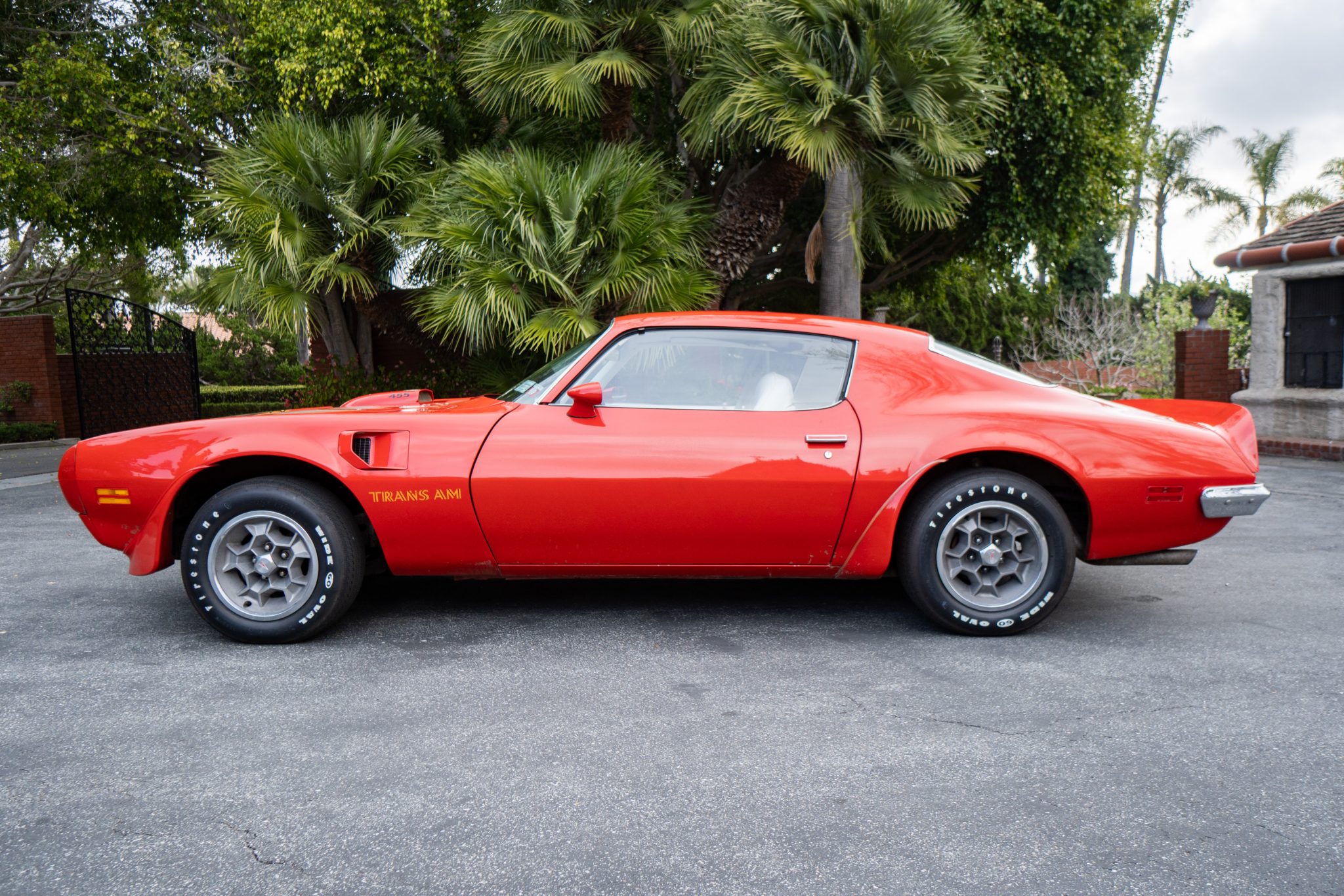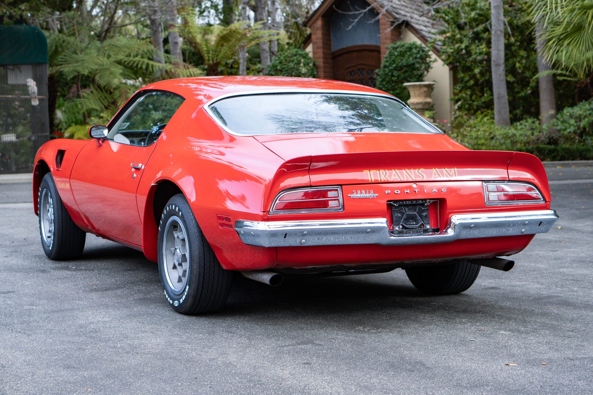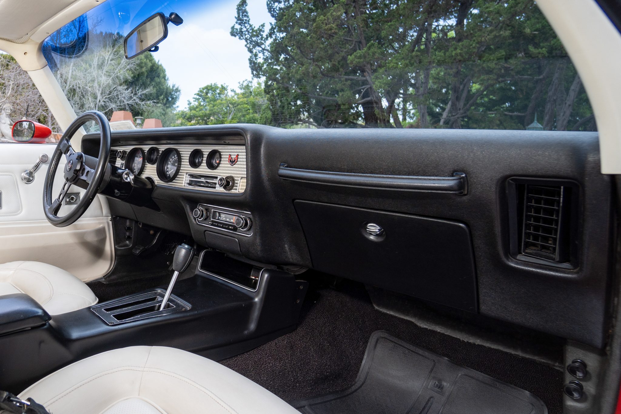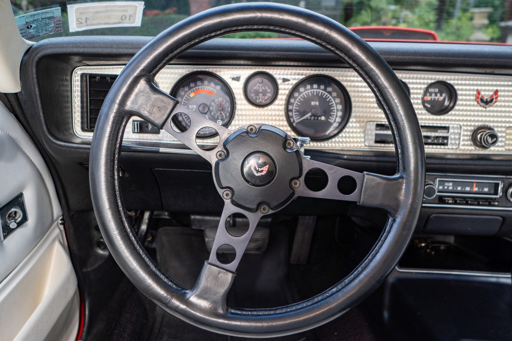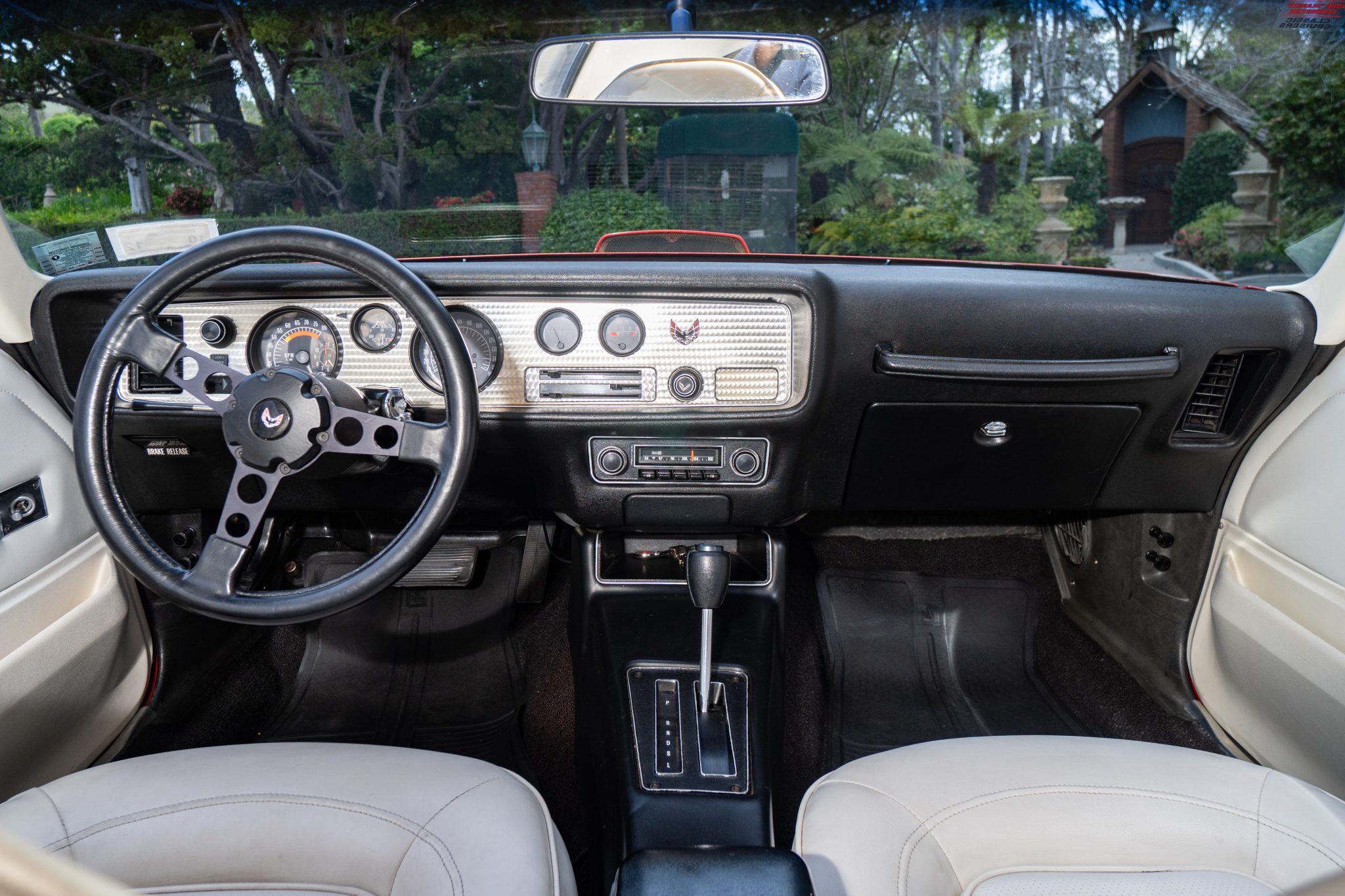 The car was optioned with a 455ci V8 linked to a Turbo Hydra-Matic three-speed automatic transmission and a Safe-T-Track limited-slip differential, and it is finished in Buccaneer Red over white vinyl. Equipment includes a shaker hood, a Trans Am hood decal, 15″ honeycomb-style wheels, power-assisted brakes, power steering, front bucket seats, an AM/FM radio, and a heater.