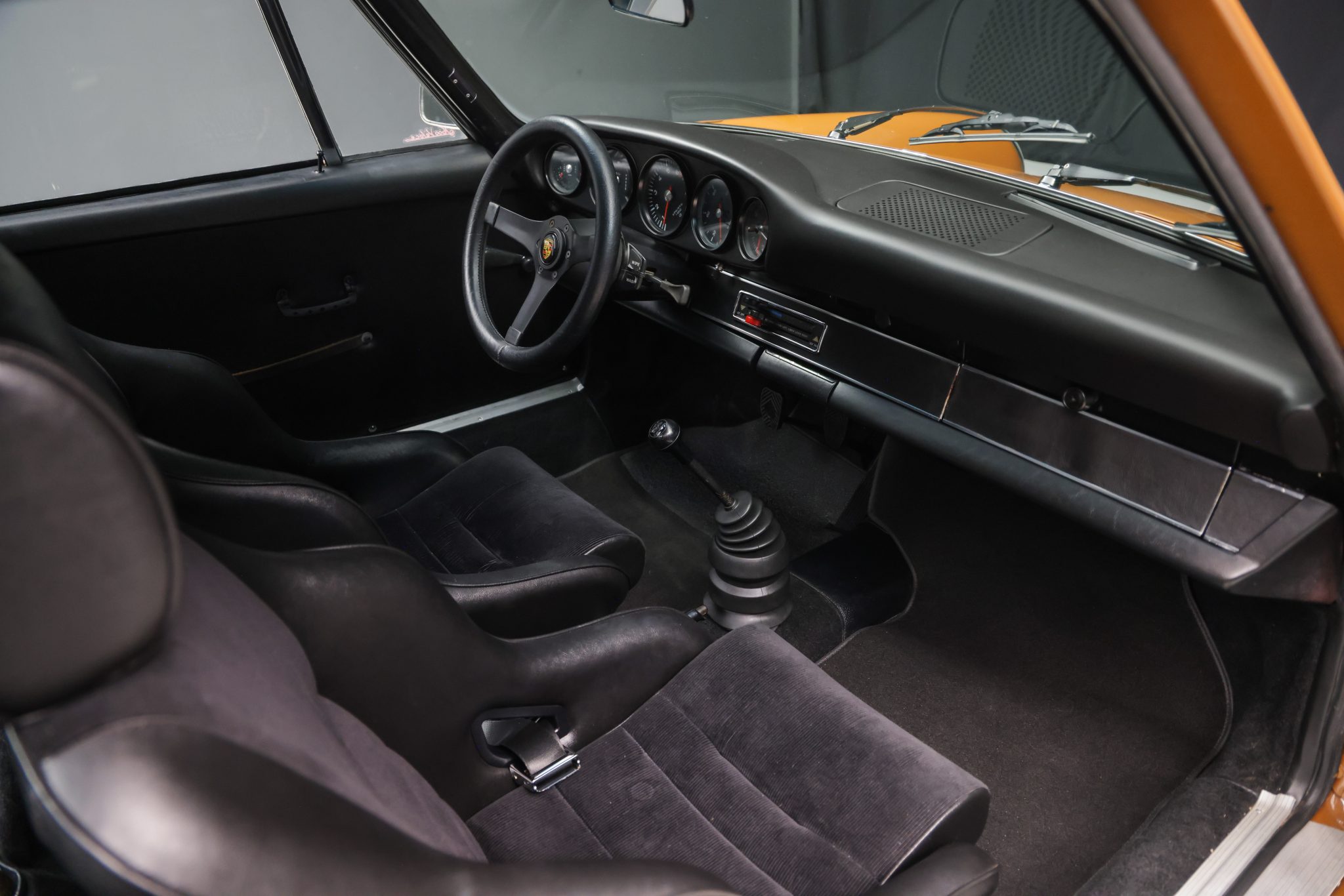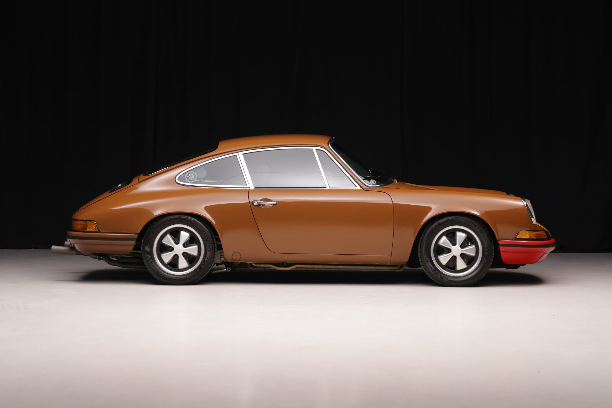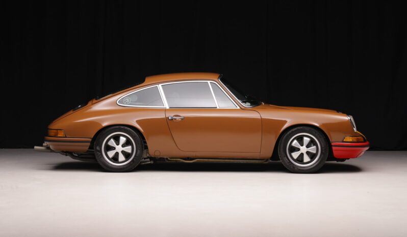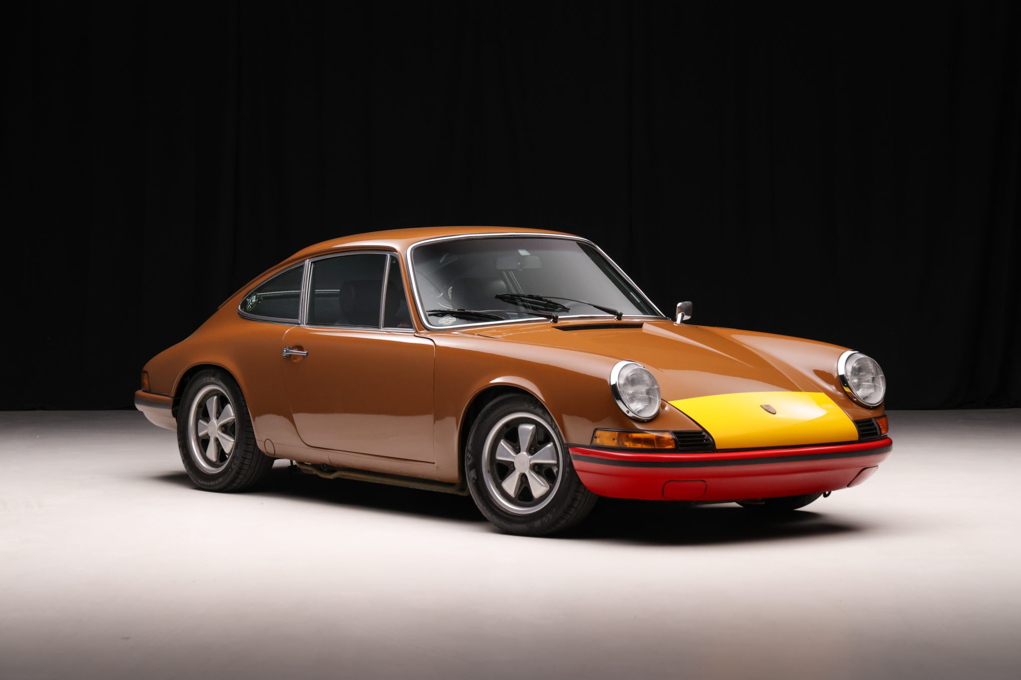 This 1973 Porsche 911T coupe has been modified with a 3.2L flat-six, a limited-slip differential, 911SC brakes, an aftermarket exhaust system, and fixed-back bucket seats. The car is finished in Sepia Brown with a red front bumper and yellow nose and also features a 915 five-speed manual transaxle, 15″ Fuchs alloy wheels, H4 headlights, and an aftermarket steering wheel.
