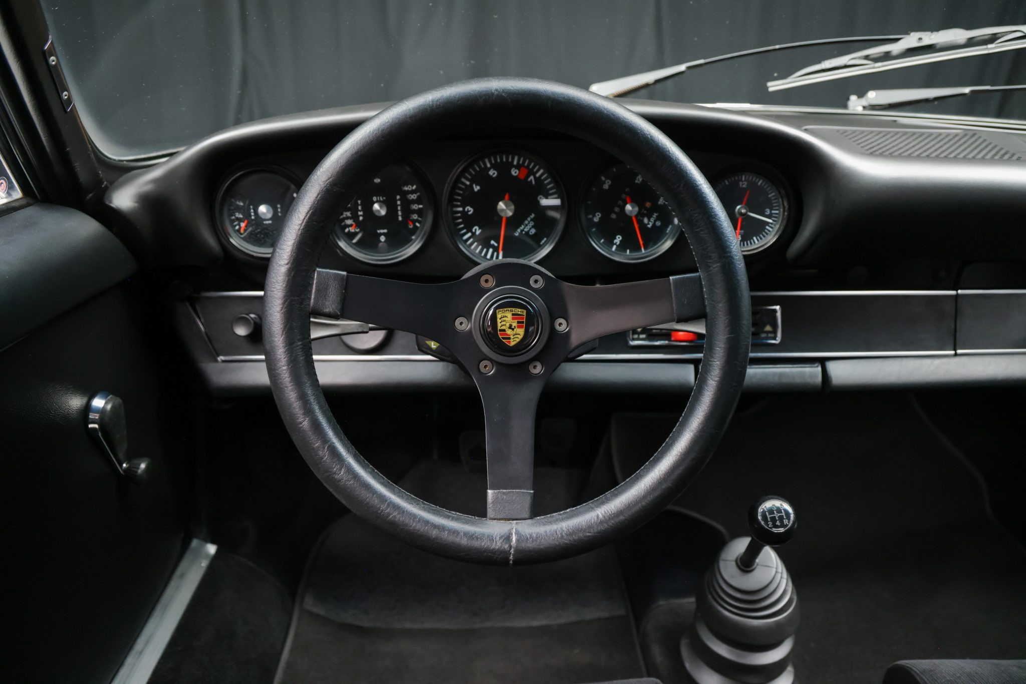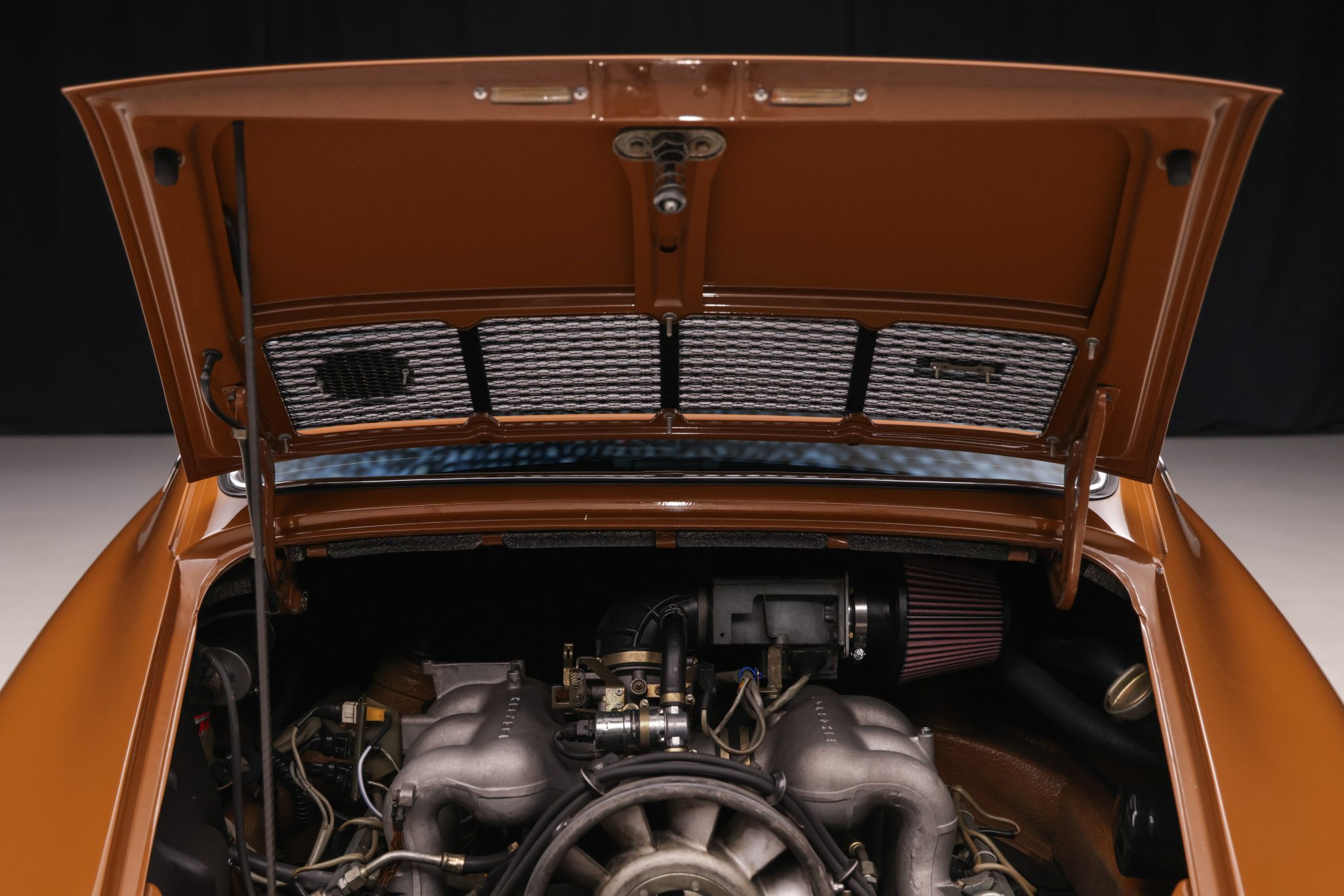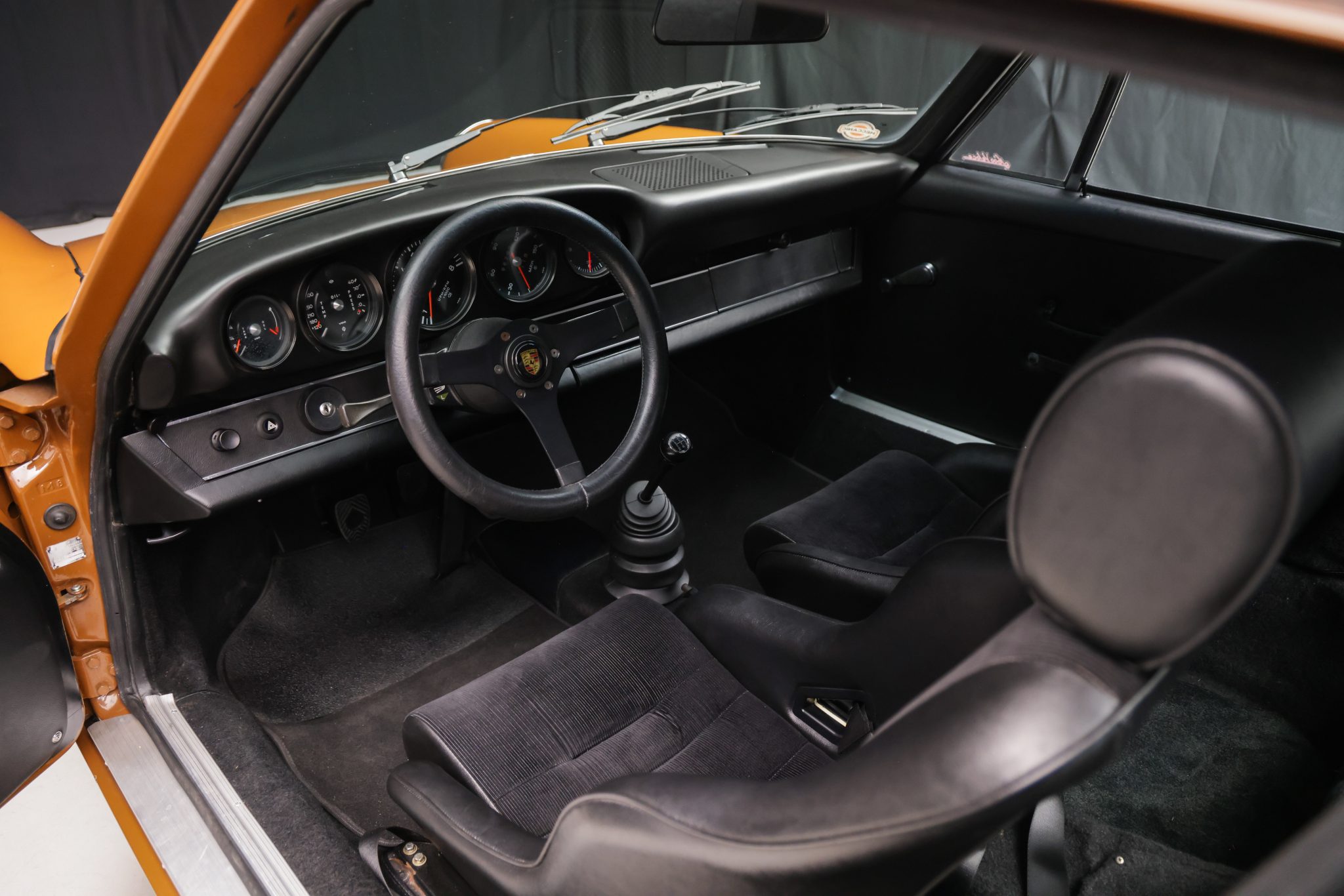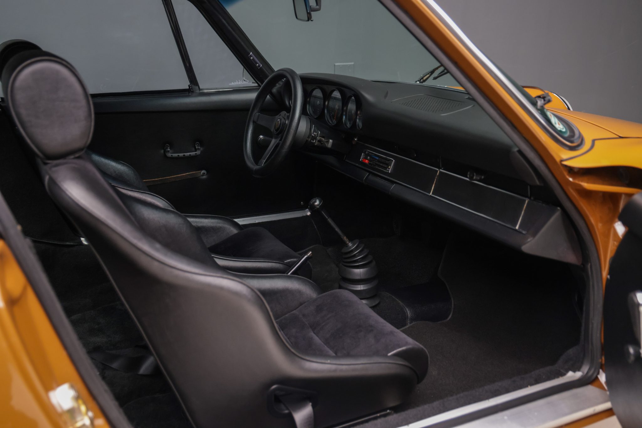 This 1973 Porsche 911T coupe has been modified with a 3.2L flat-six, a limited-slip differential, 911SC brakes, an aftermarket exhaust system, and fixed-back bucket seats. The car is finished in Sepia Brown with a red front bumper and yellow nose and also features a 915 five-speed manual transaxle, 15″ Fuchs alloy wheels, H4 headlights, and an aftermarket steering wheel.