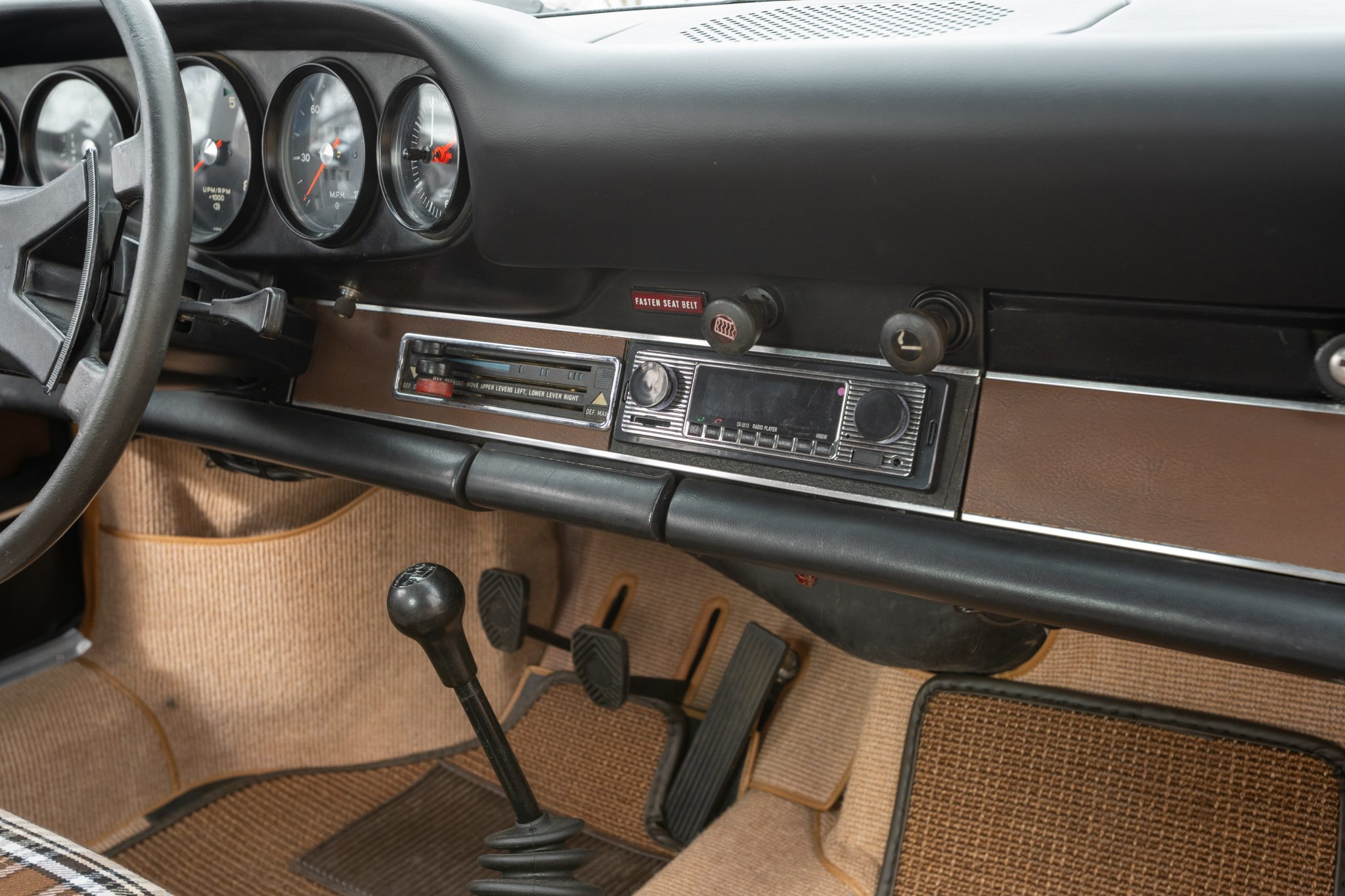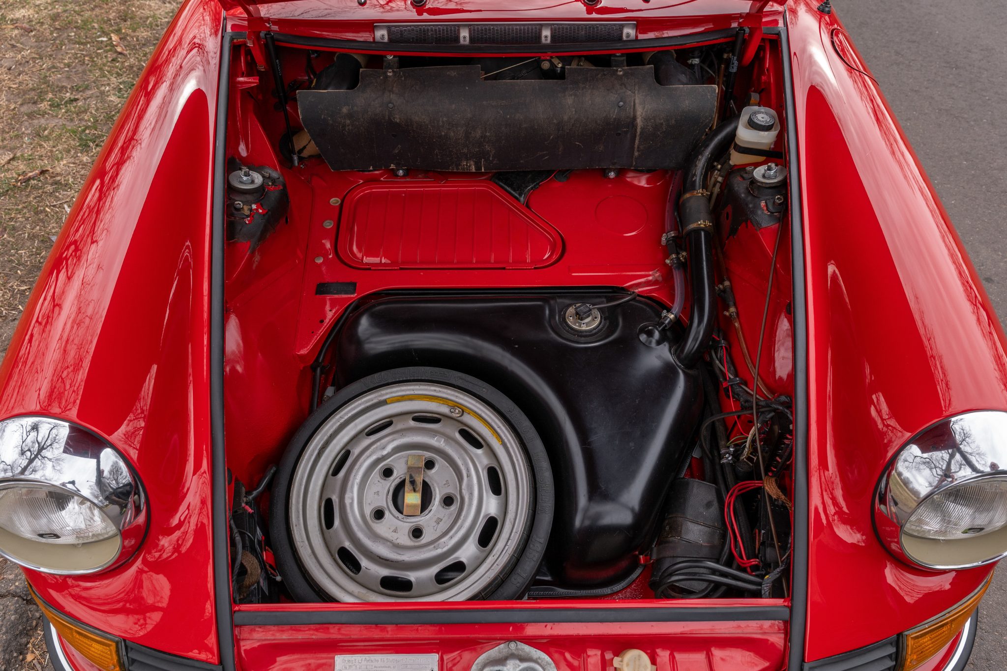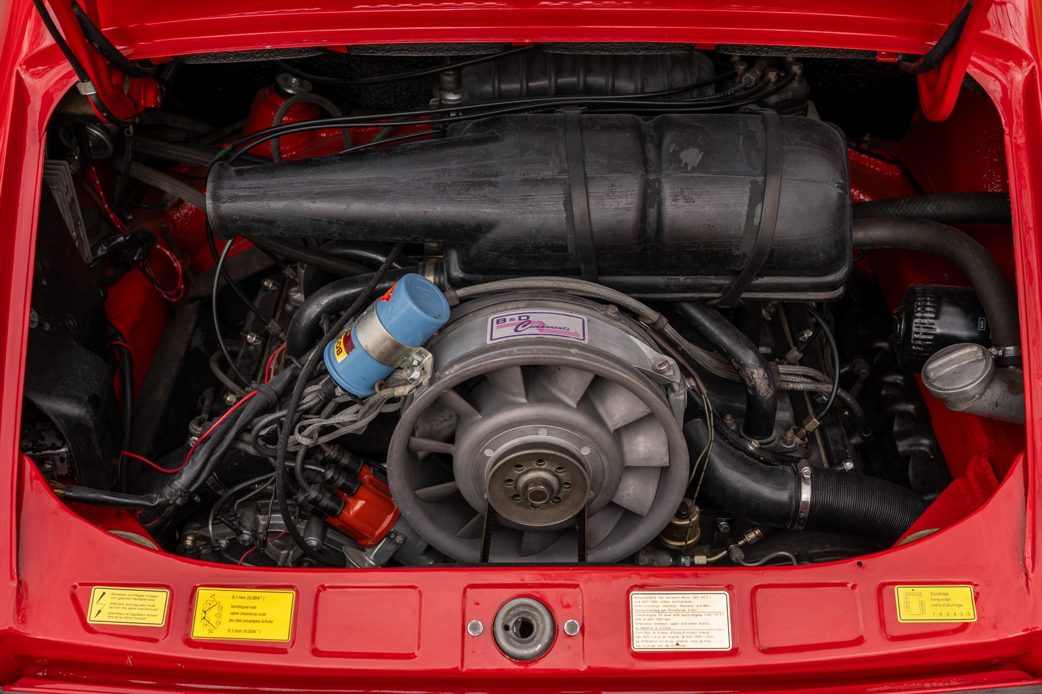 Work included rebuilding the air-cooled 2.4L flat-six and five-speed manual transaxle, refinishing the red exterior, and refreshing the brown vinyl and plaid fabric interior. The car is equipped with a removable black roof panel, 15″ Fuchs alloy wheels, four-wheel disc brakes, Bilstein dampers, oil-fed chain tensioners, square-weave carpeting, Recaro front seats, and a retro-style head unit.