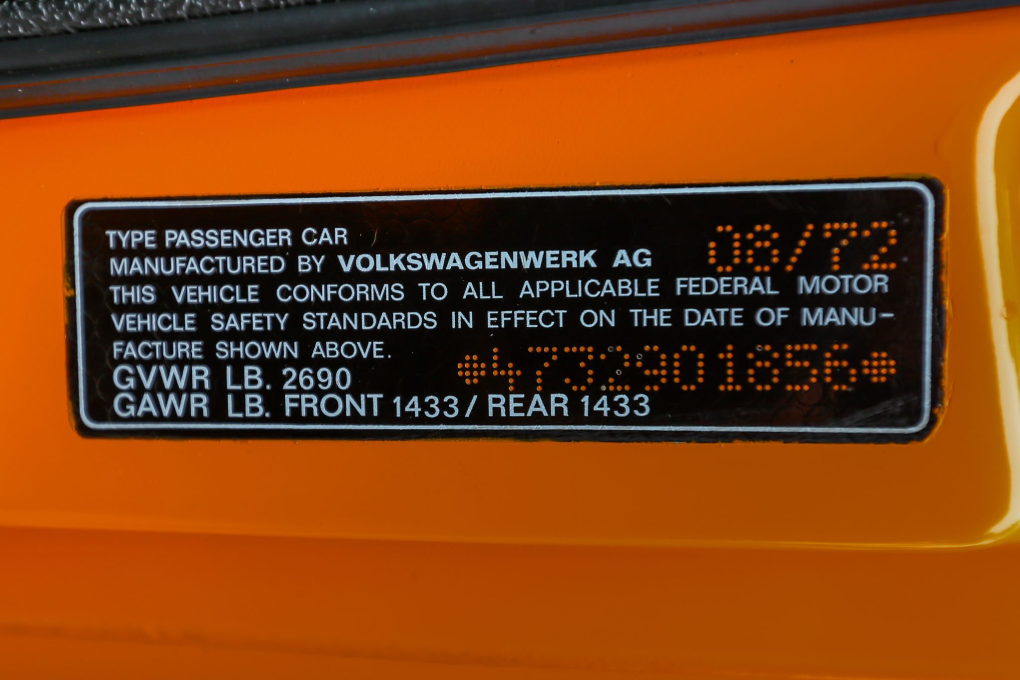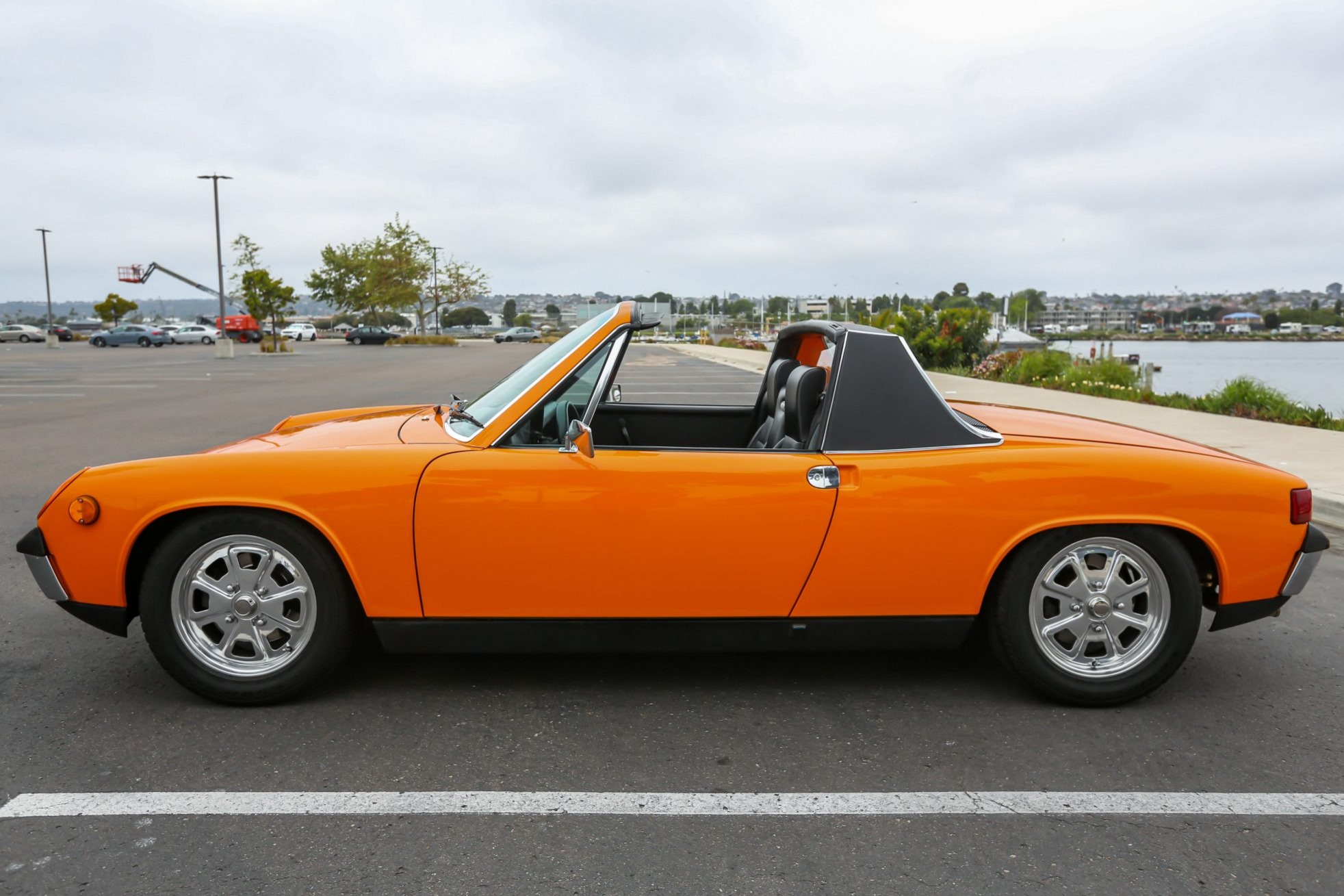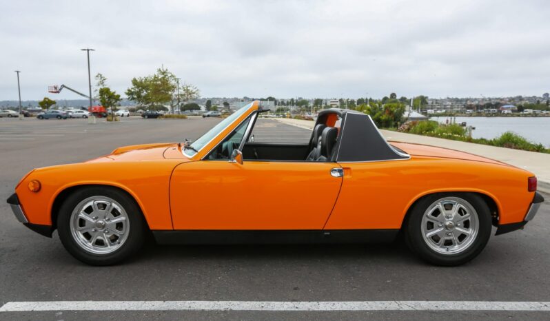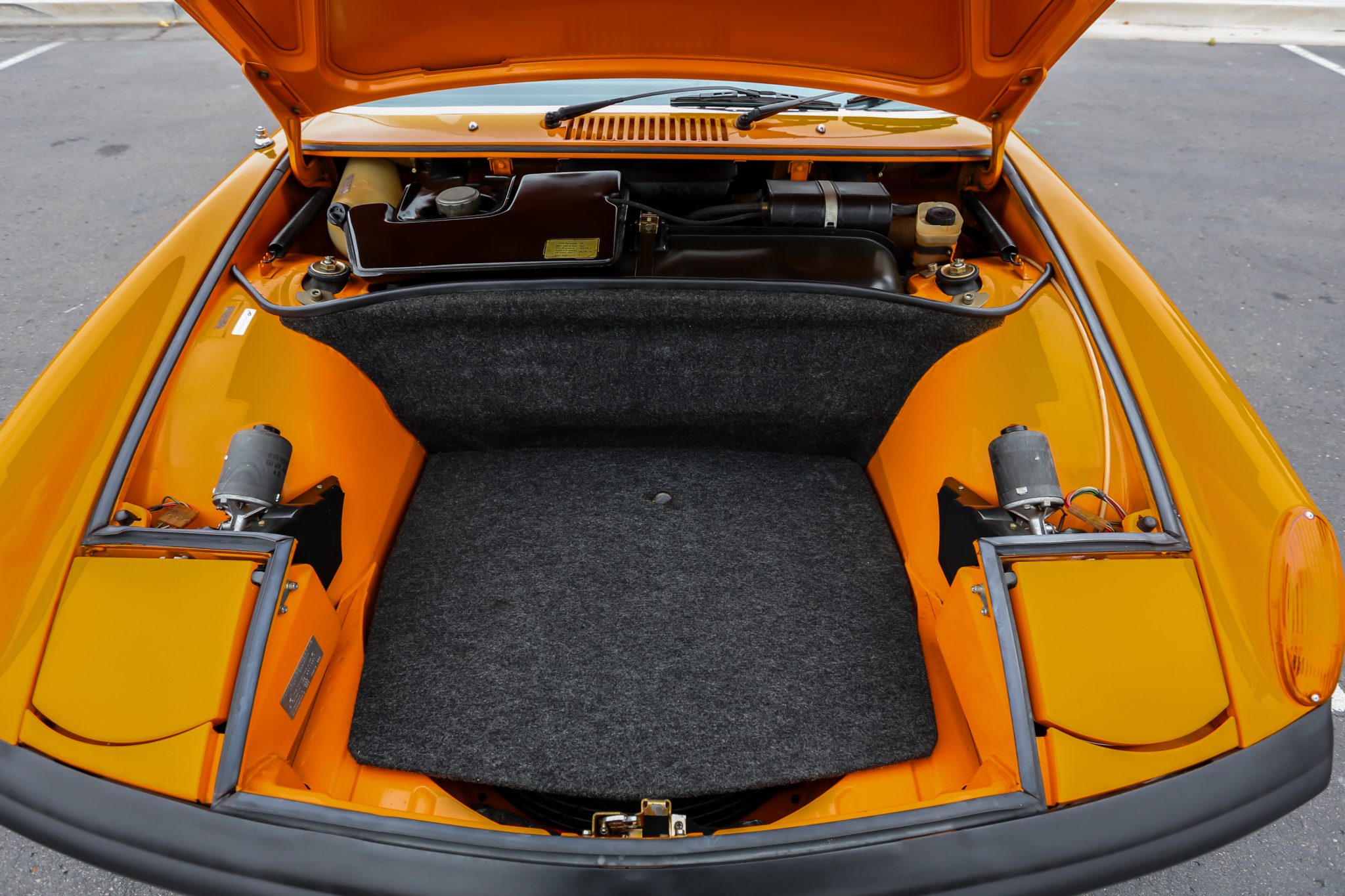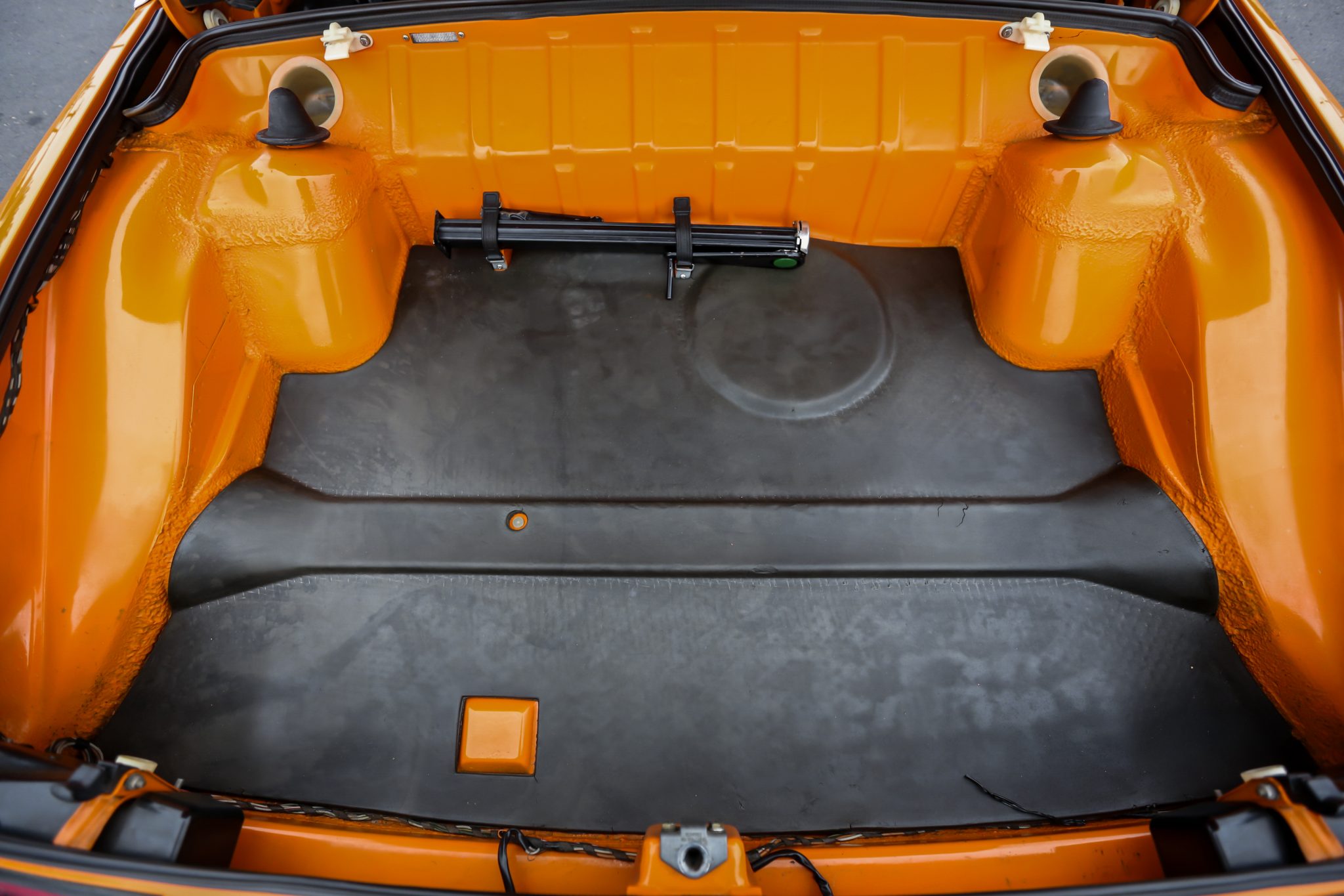 It is powered by a 2.0L air-cooled flat-four paired with a five-speed manual transaxle and is finished in orange over black vinyl upholstery. Equipment includes 15″ Fuchs-style alloy wheels, disc brakes, Elephant Racing PolyBronze suspension bushings, a removable Targa top, fog lights, a Kenwood cassette stereo, a cigarette lighter, and Bosch D-Jetronic fuel injection.