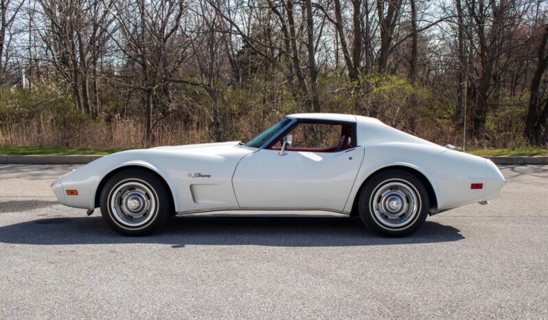 Finished in Classic White over Dark Red vinyl, the car is powered by a 350ci L48 V8 mated to a four-speed manual transmission. Equipment includes removable roof panels, a Positraction limited-slip differential, power steering, power-assisted brakes, air conditioning, power windows, pop-up headlights, a heater, and a retro-style digital stereo.