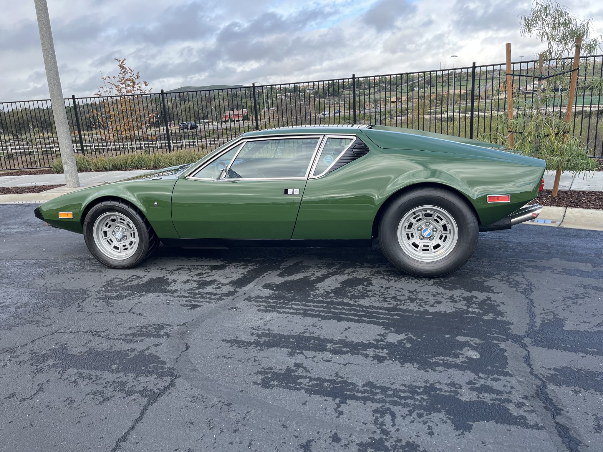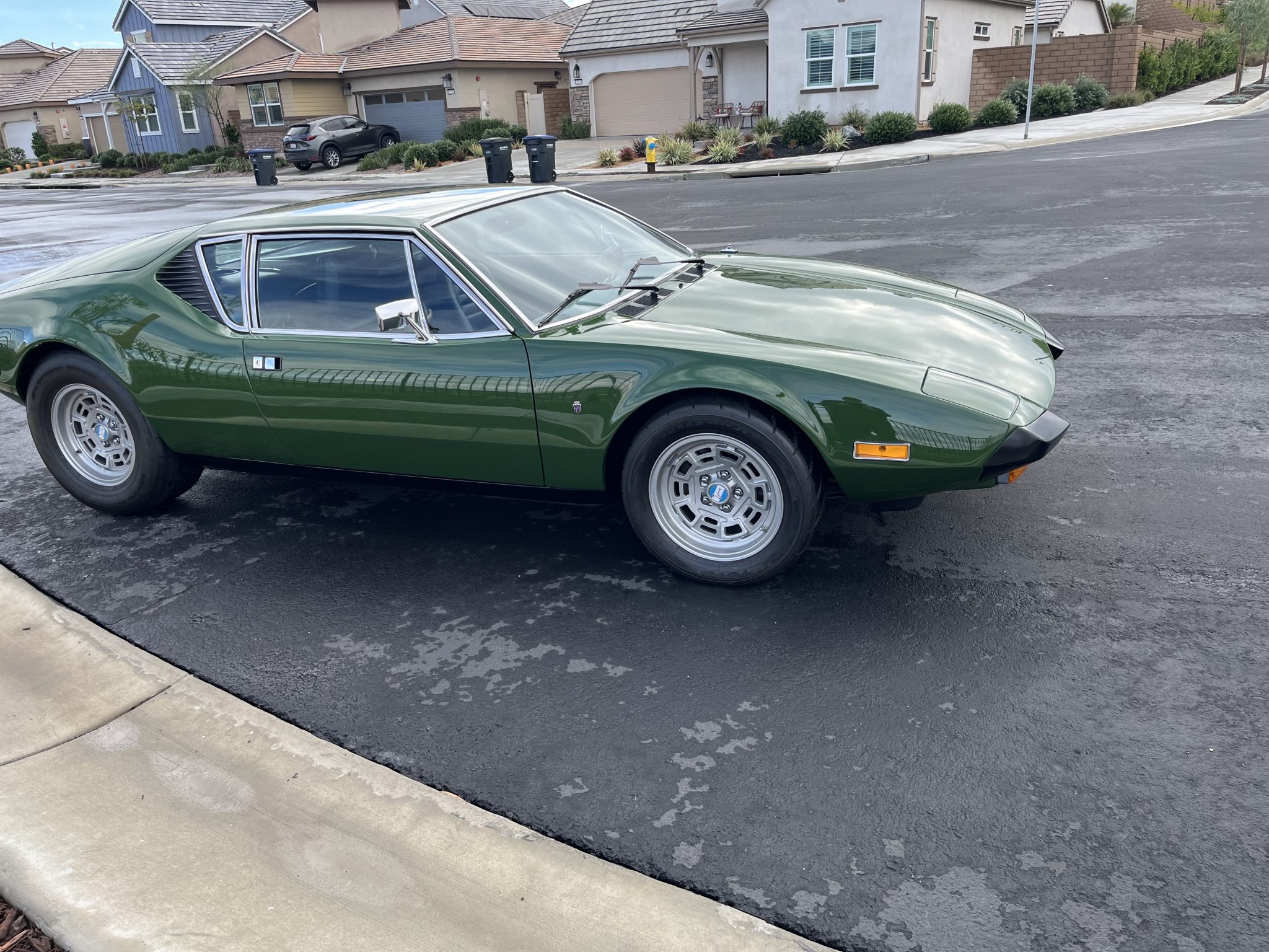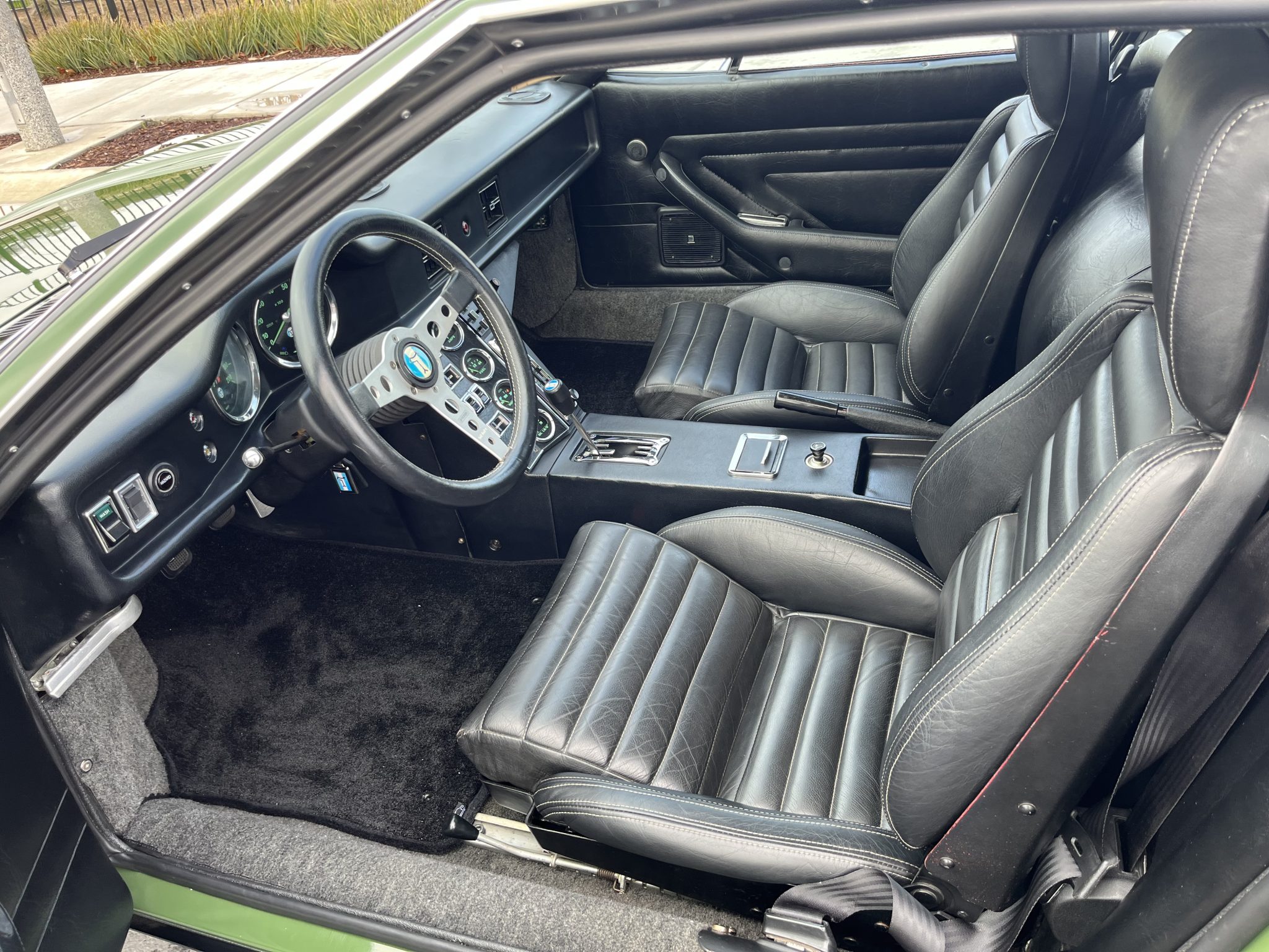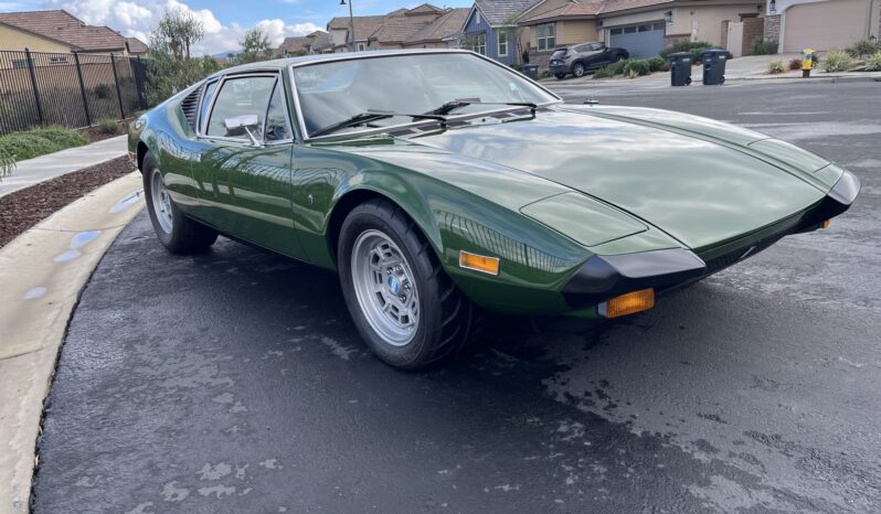 This 1974 DeTomaso Pantera was specified from the factory as one of 68 examples finished in Medium Green. Power is provided by a 351ci Ford Cleveland V8 fitted with Holley four-barrel carburetor, a Blue Thunder intake manifold, and Pat Mical 2¼” exhaust headers. Gear changes are through a ZF five-speed manual transaxle, and the car rides on 15″ Campagnolo cast magnesium wheels coupled with disc brakes at all four corners. Inside, a MOMO steering wheel is paired with a dogleg-pattern gated shifter and accompanied by Corvette C4–sourced bucket seats trimmed in black leather.