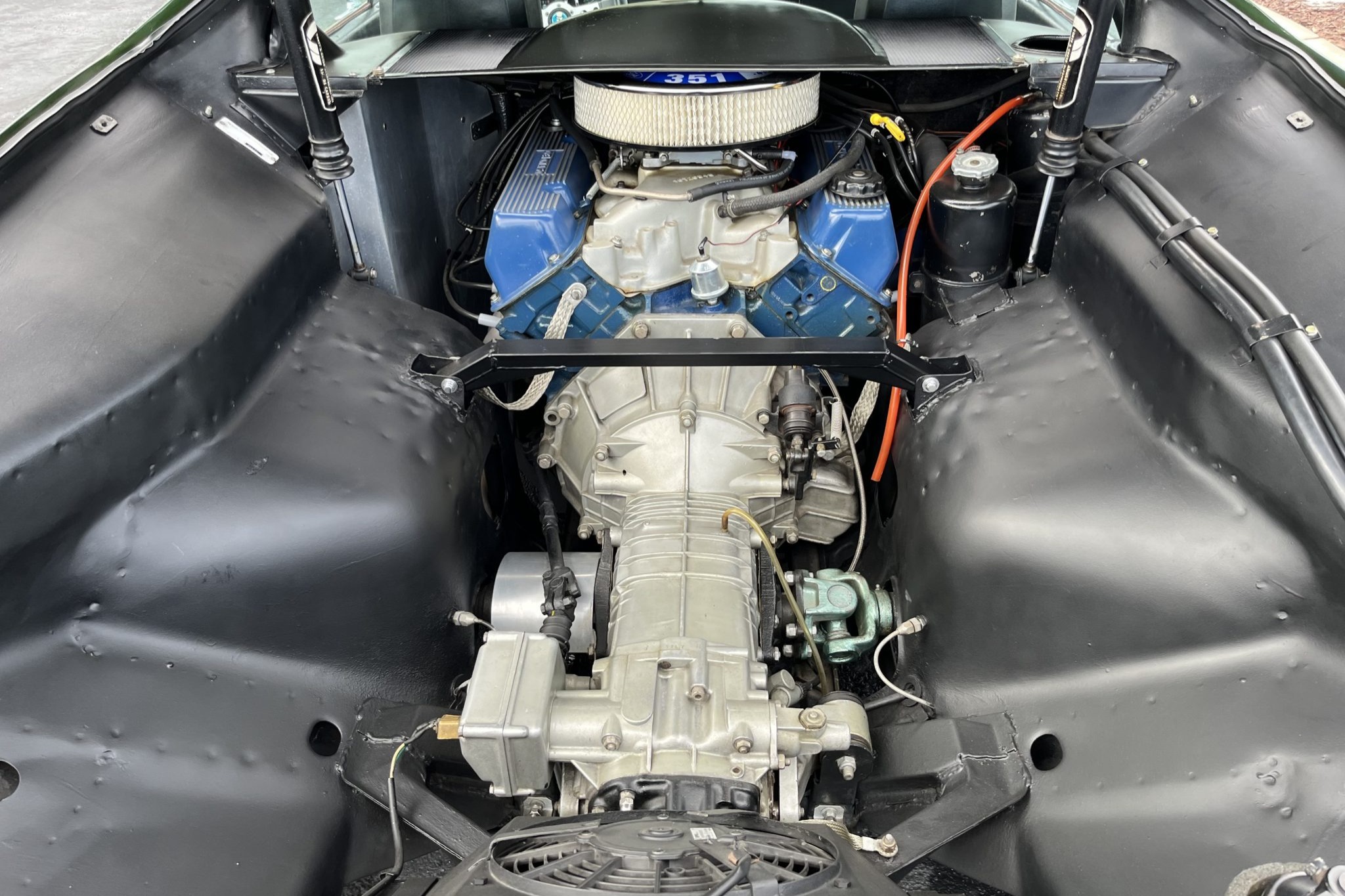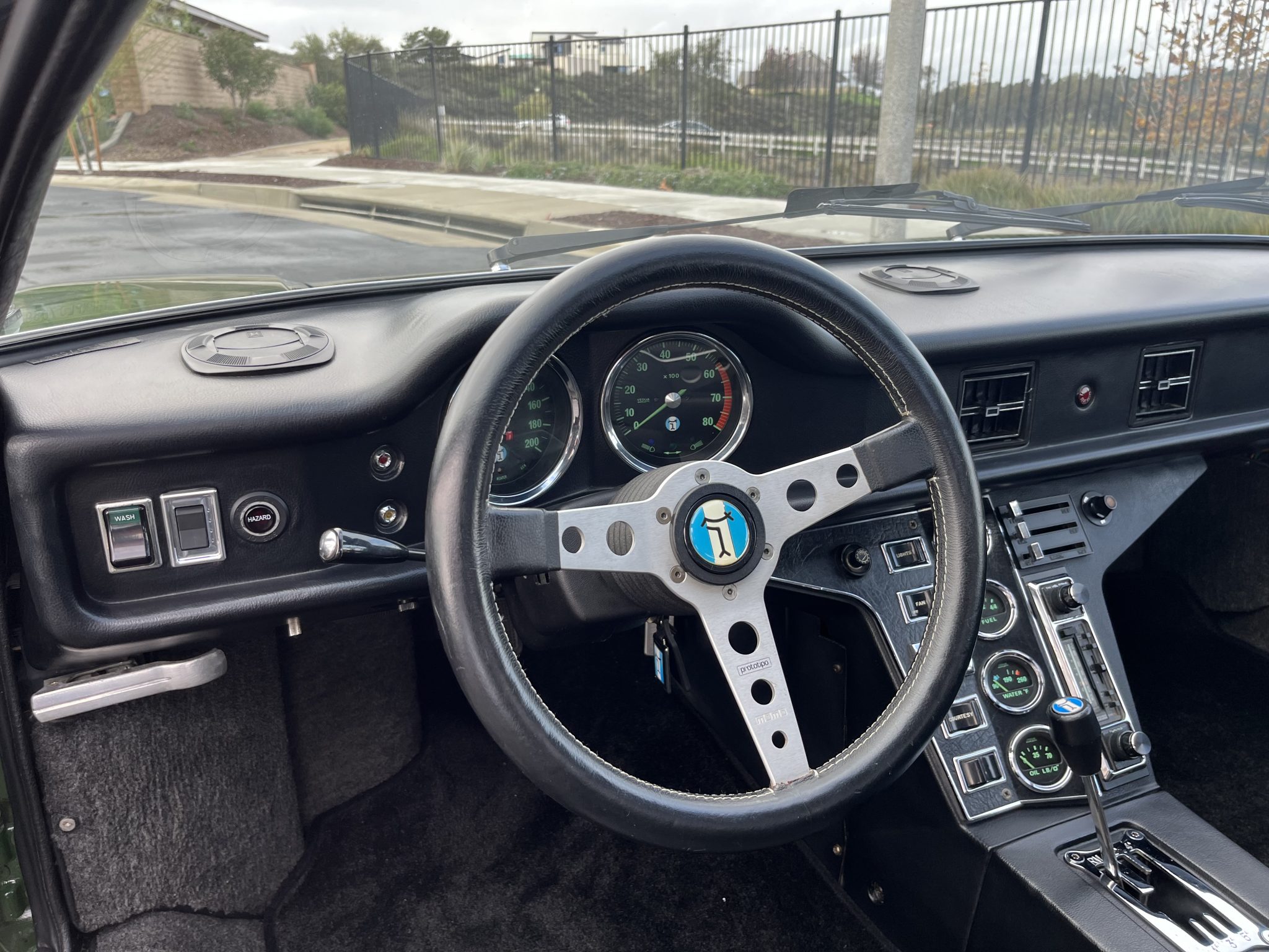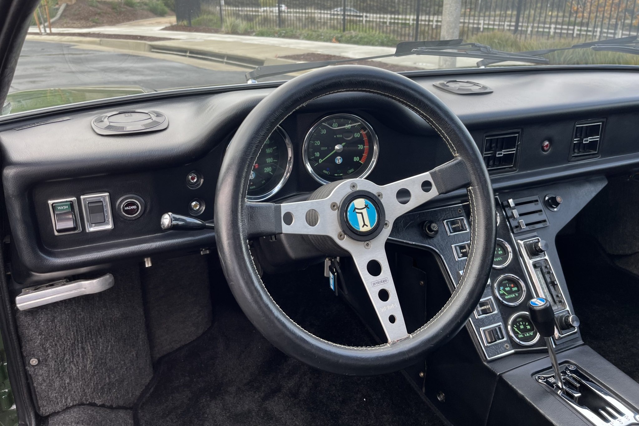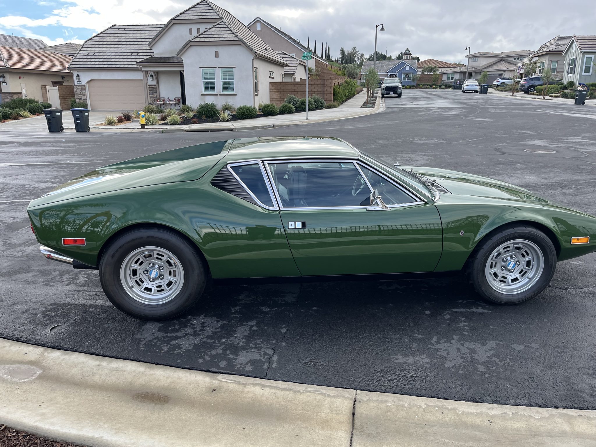 This 1974 DeTomaso Pantera was specified from the factory as one of 68 examples finished in Medium Green. Power is provided by a 351ci Ford Cleveland V8 fitted with Holley four-barrel carburetor, a Blue Thunder intake manifold, and Pat Mical 2¼” exhaust headers. Gear changes are through a ZF five-speed manual transaxle, and the car rides on 15″ Campagnolo cast magnesium wheels coupled with disc brakes at all four corners. Inside, a MOMO steering wheel is paired with a dogleg-pattern gated shifter and accompanied by Corvette C4–sourced bucket seats trimmed in black leather.