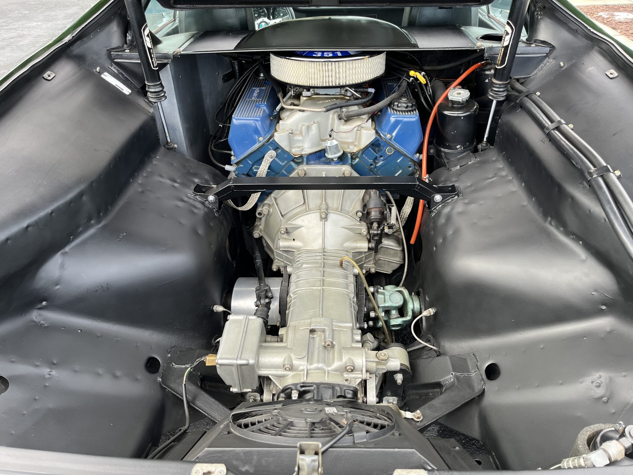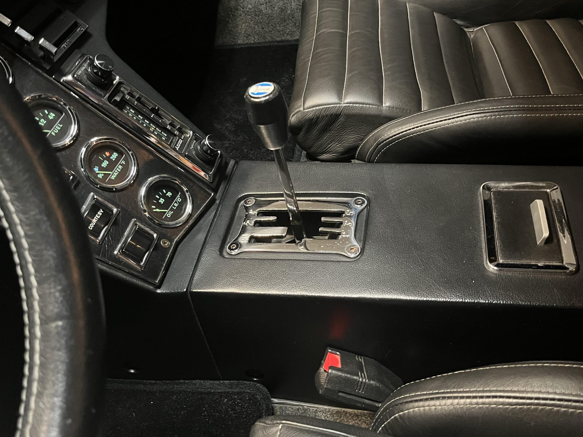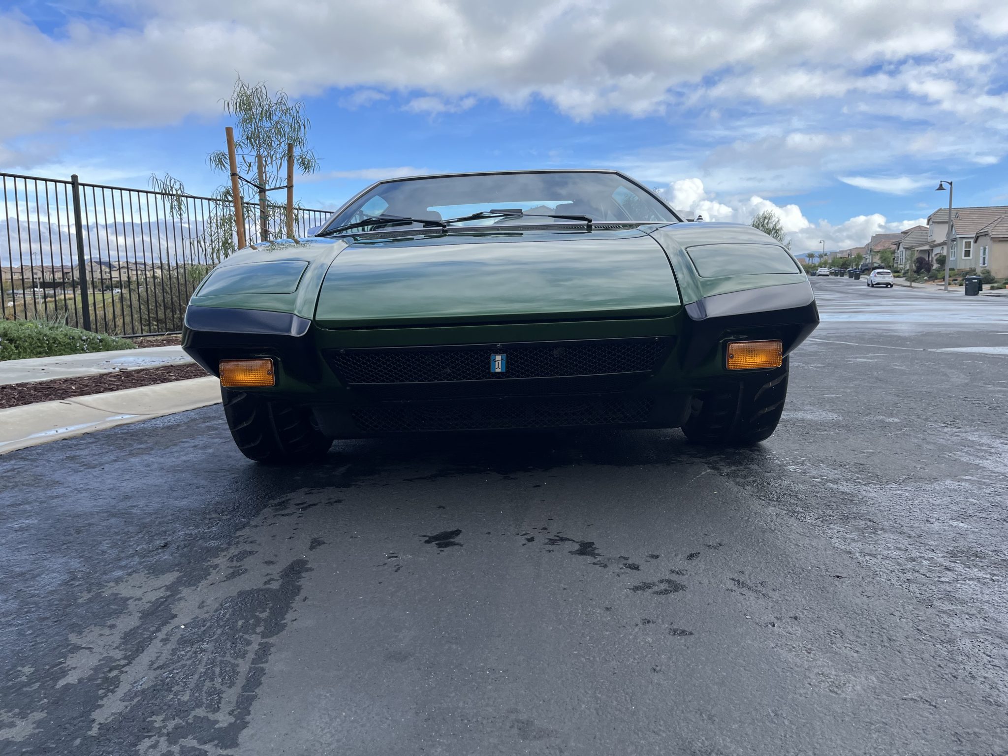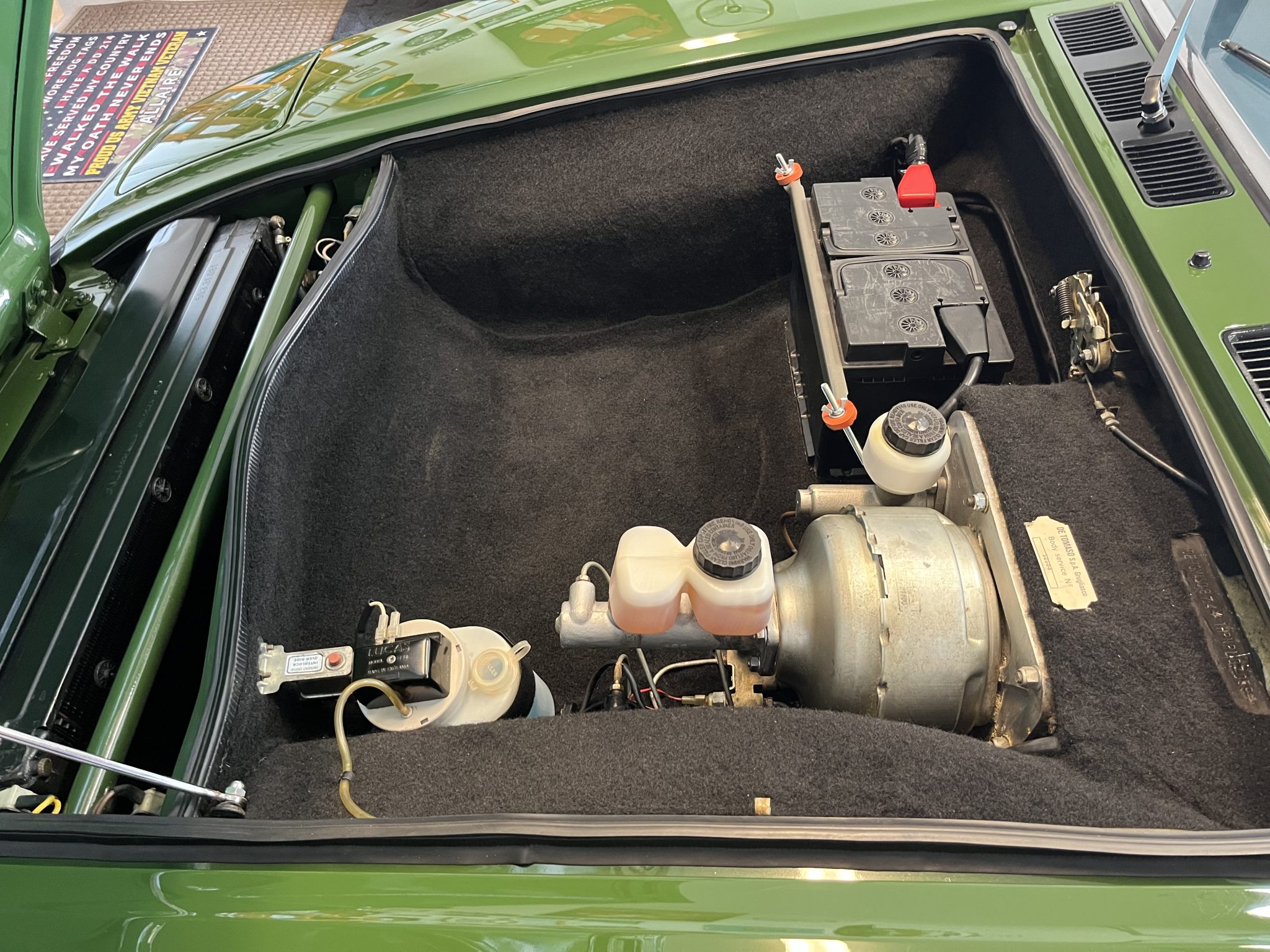 This 1974 DeTomaso Pantera was specified from the factory as one of 68 examples finished in Medium Green. Power is provided by a 351ci Ford Cleveland V8 fitted with Holley four-barrel carburetor, a Blue Thunder intake manifold, and Pat Mical 2¼” exhaust headers. Gear changes are through a ZF five-speed manual transaxle, and the car rides on 15″ Campagnolo cast magnesium wheels coupled with disc brakes at all four corners. Inside, a MOMO steering wheel is paired with a dogleg-pattern gated shifter and accompanied by Corvette C4–sourced bucket seats trimmed in black leather.