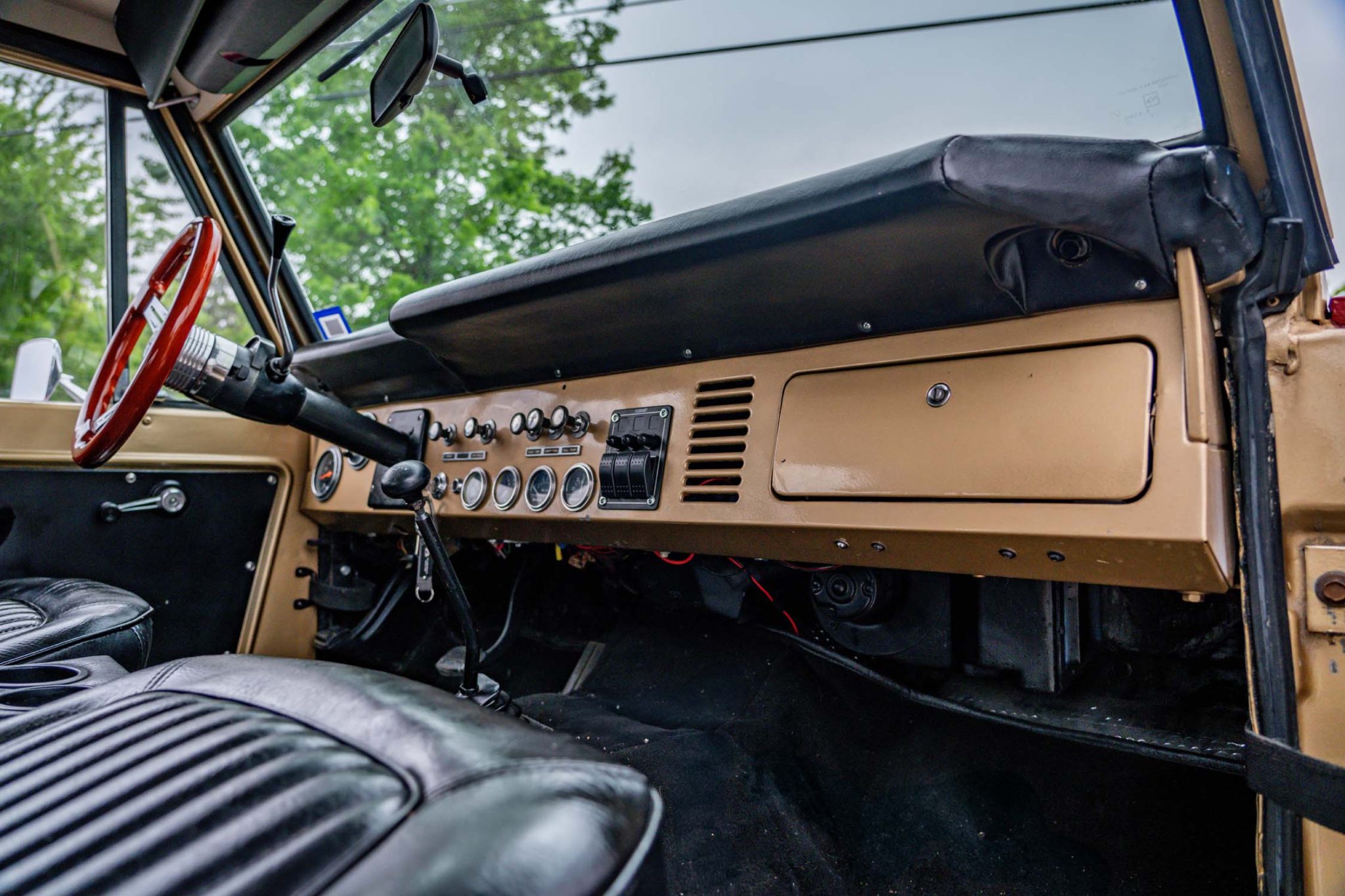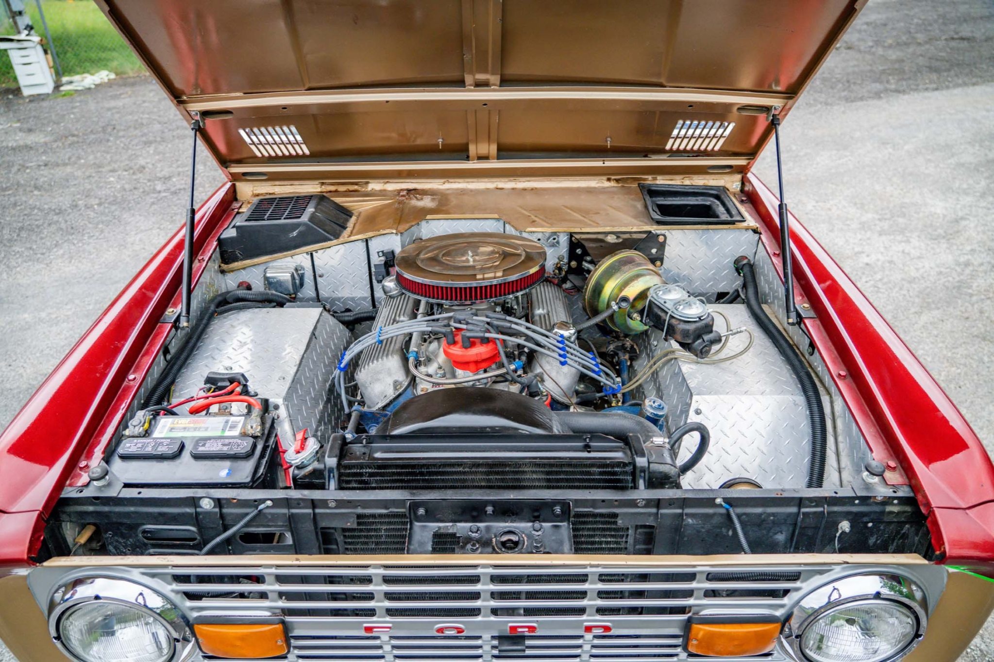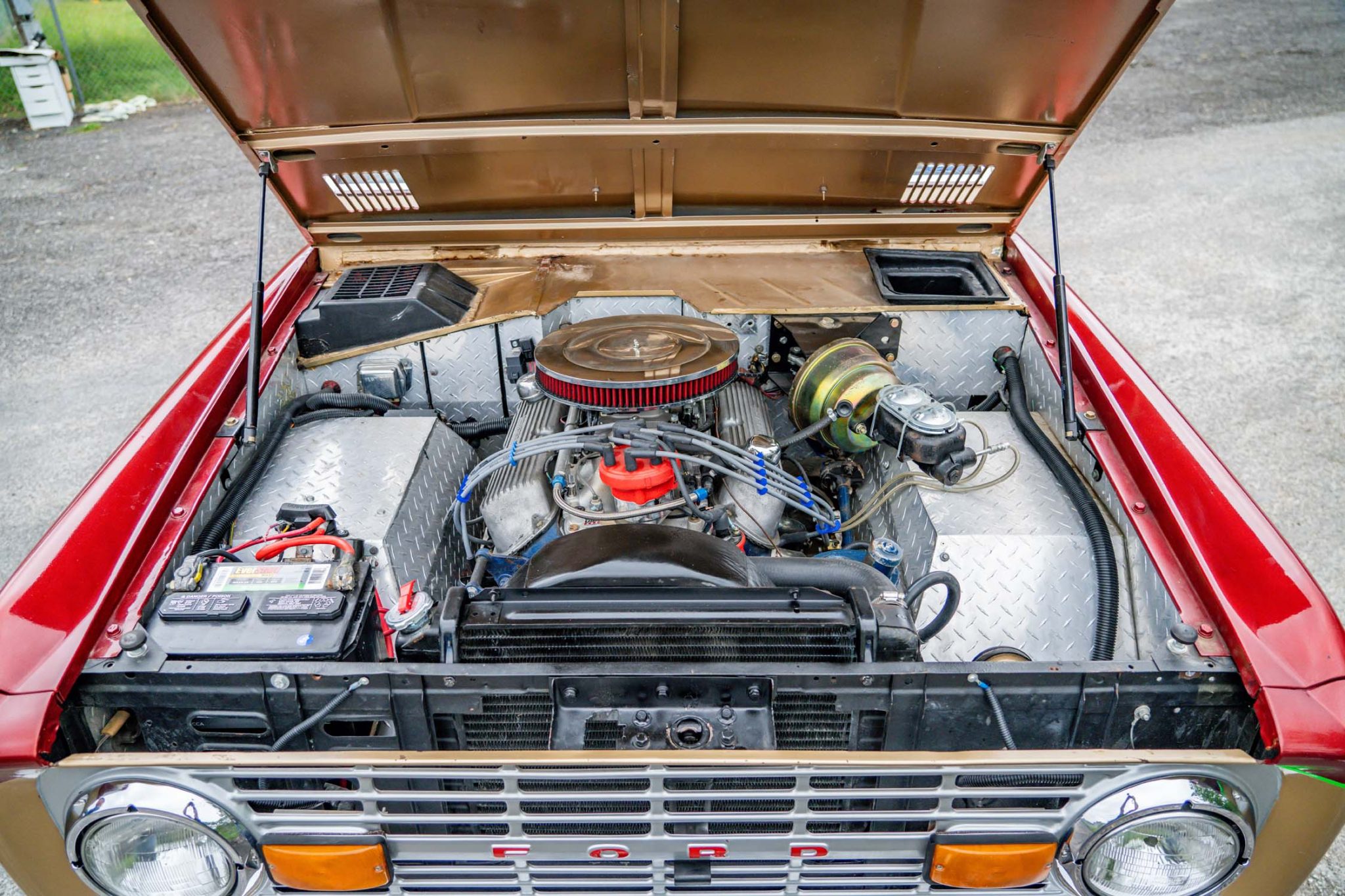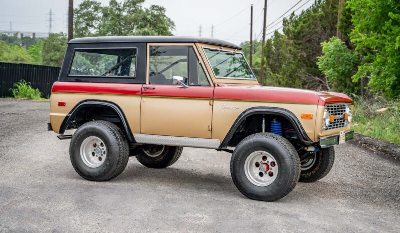 This 1974 Ford Bronco is powered by a fuel-injected 302ci V8 linked to a three-speed automatic transmission and a dual-range transfer case. Repainted in a gold, red, green, and black color scheme, it has a removable hardtop, cut fenders, a lifted suspension, 15” Eagle Alloy wheels, aftermarket shocks, and a dual exhaust system. Additional features include black seat upholstery, a roll bar, a wood-rimmed steering wheel, and AutoMeter and Sunpro instruments.