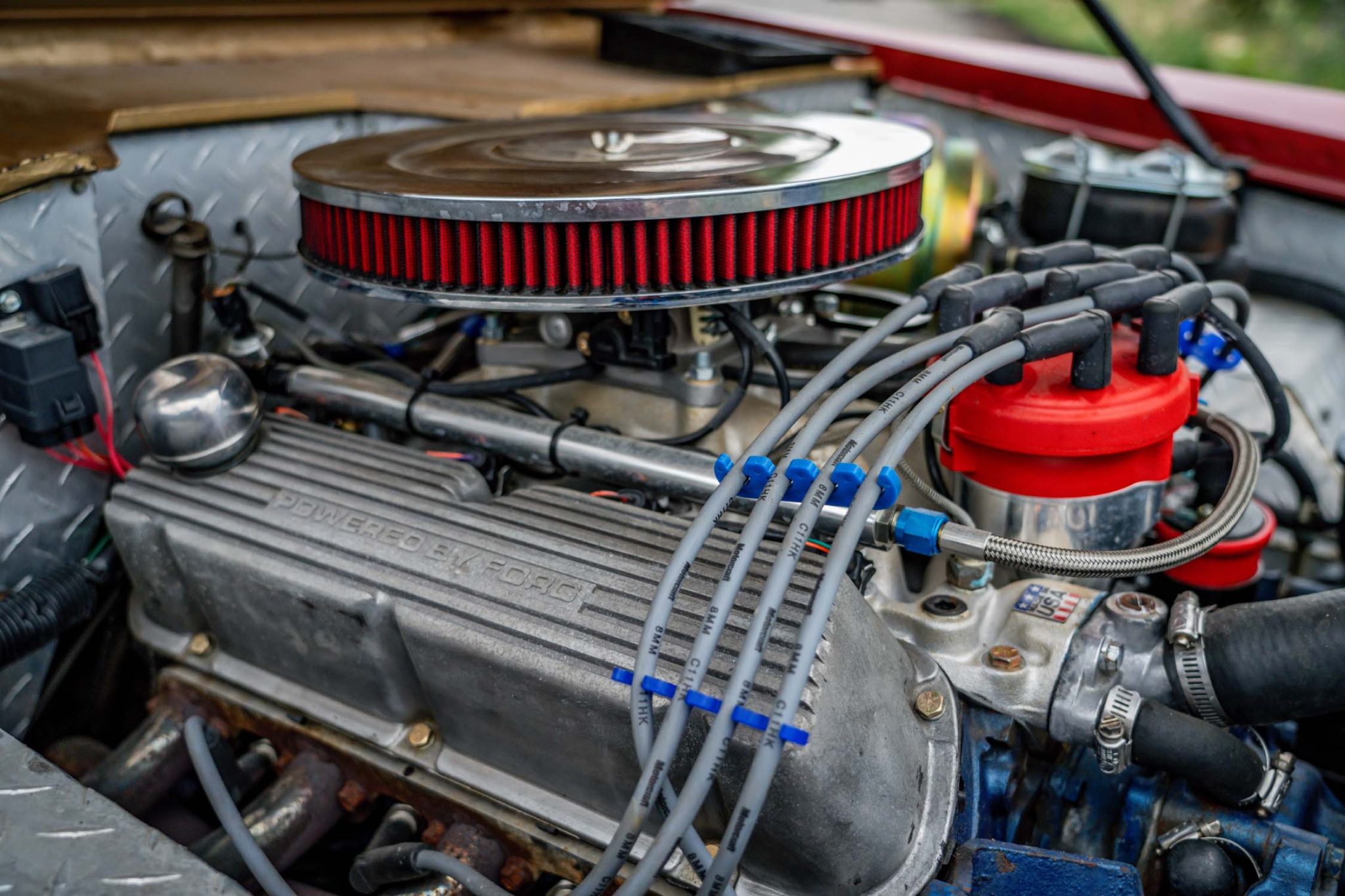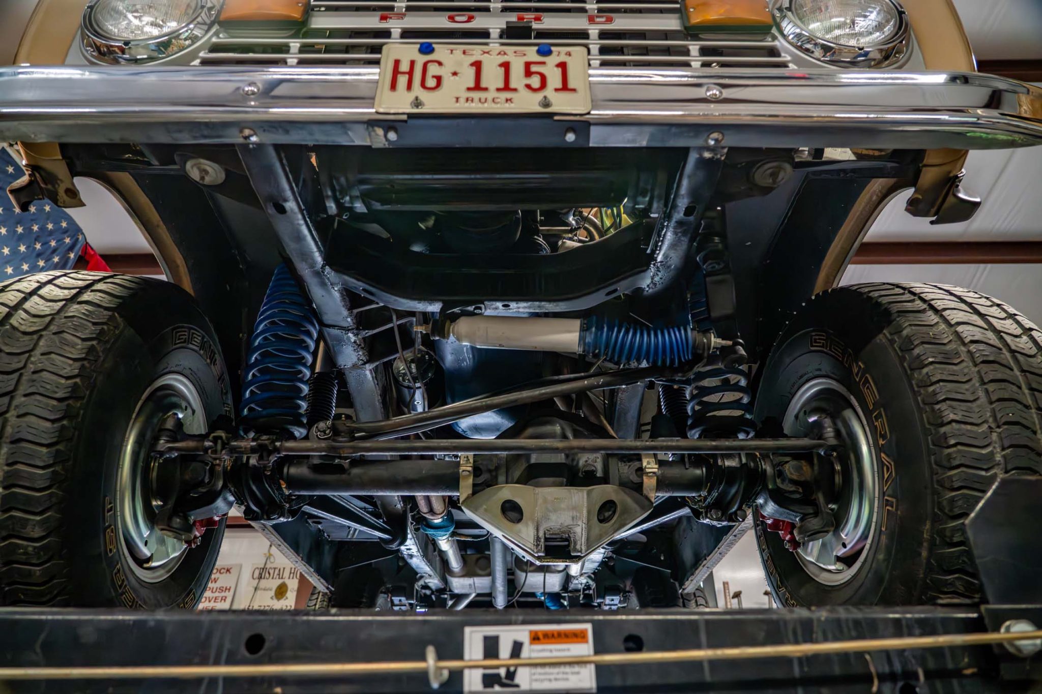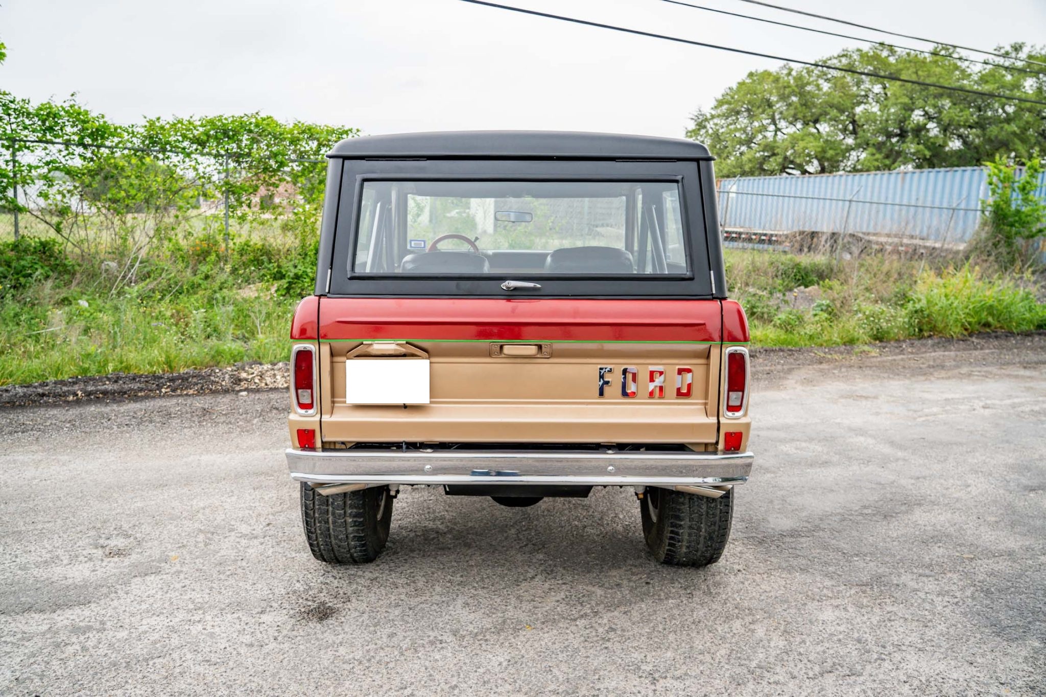 This 1974 Ford Bronco is powered by a fuel-injected 302ci V8 linked to a three-speed automatic transmission and a dual-range transfer case. Repainted in a gold, red, green, and black color scheme, it has a removable hardtop, cut fenders, a lifted suspension, 15” Eagle Alloy wheels, aftermarket shocks, and a dual exhaust system. Additional features include black seat upholstery, a roll bar, a wood-rimmed steering wheel, and AutoMeter and Sunpro instruments.