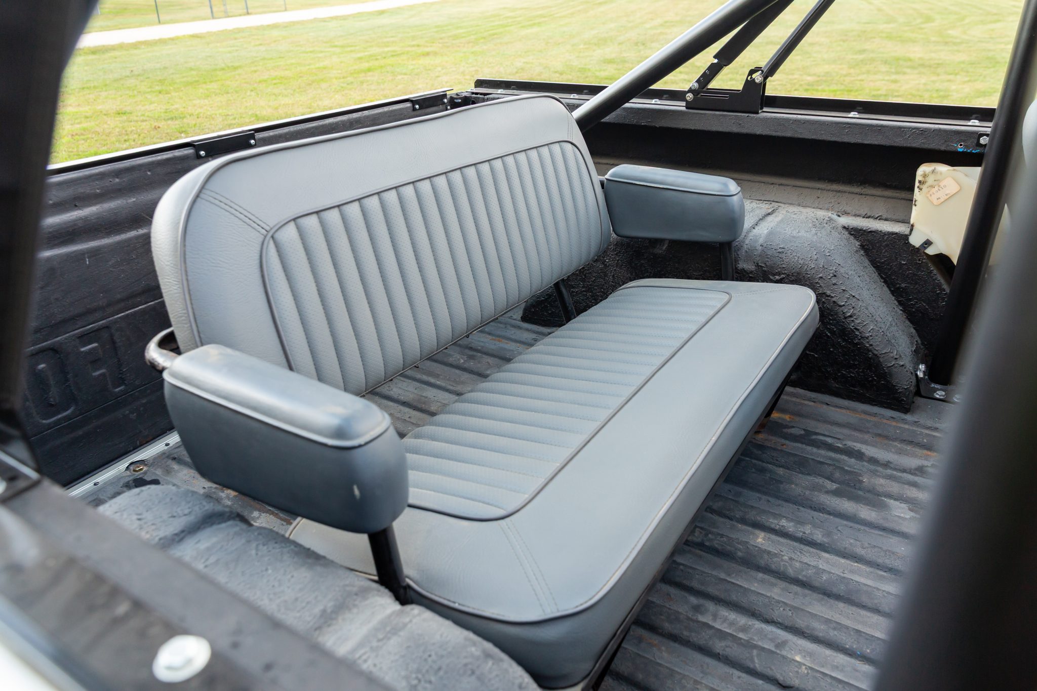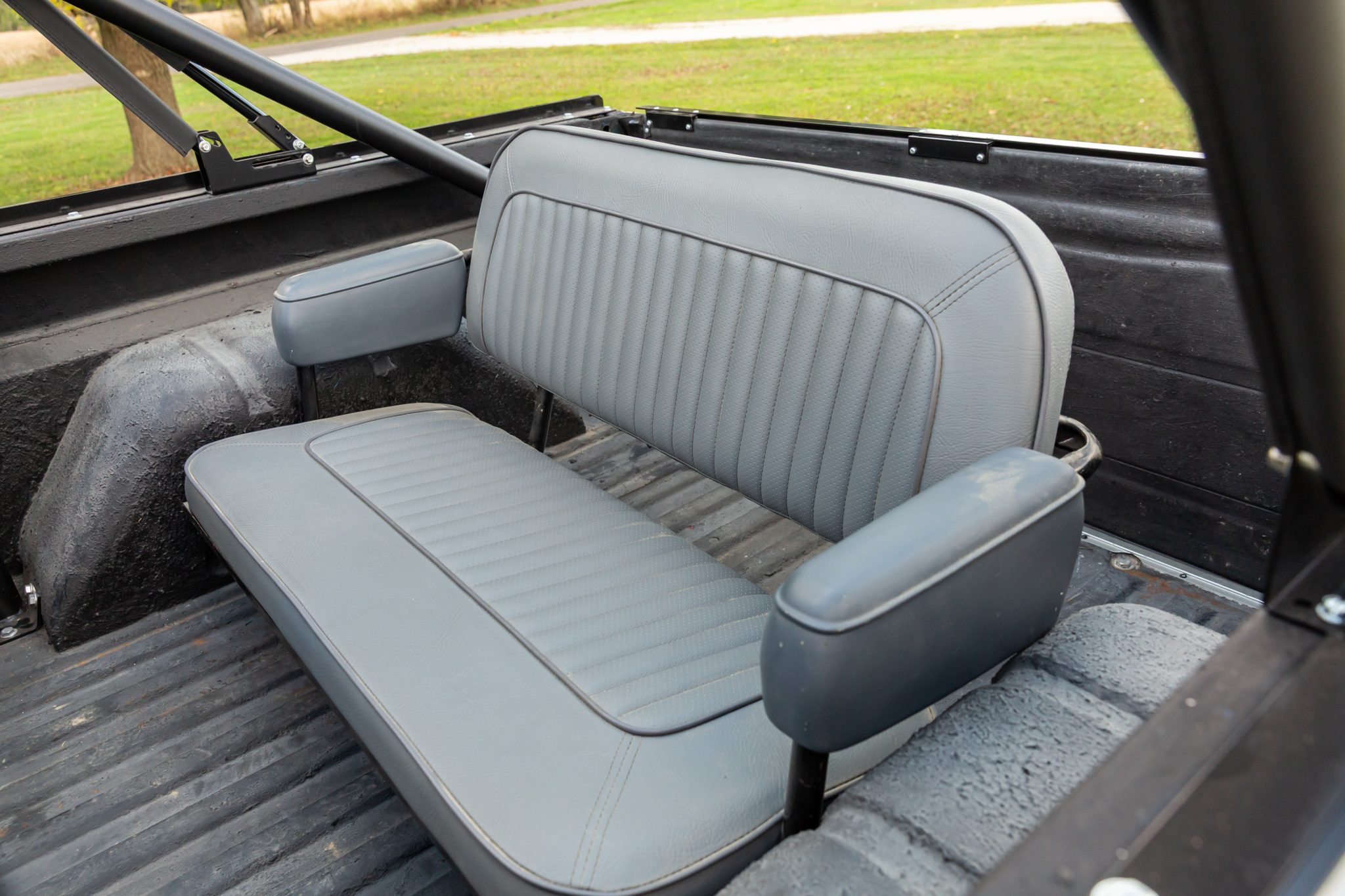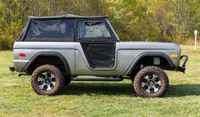 In addition to overhauling its body and 302ci V8, their subsequent refurbishments included a five-speed manual swap, adding front disc brakes, and refreshing its suspension and interior. The truck is refinished in gray with a black soft top, and it has gray leatherette upholstery, a roll bar, an auxiliary fuel tank, a limited-slip rear differential, a twin-stick transfer case, aftermarket bumpers, 15″ Dick Cepek wheels, tubular headers, and a dual exhaust with Flow FX mufflers.