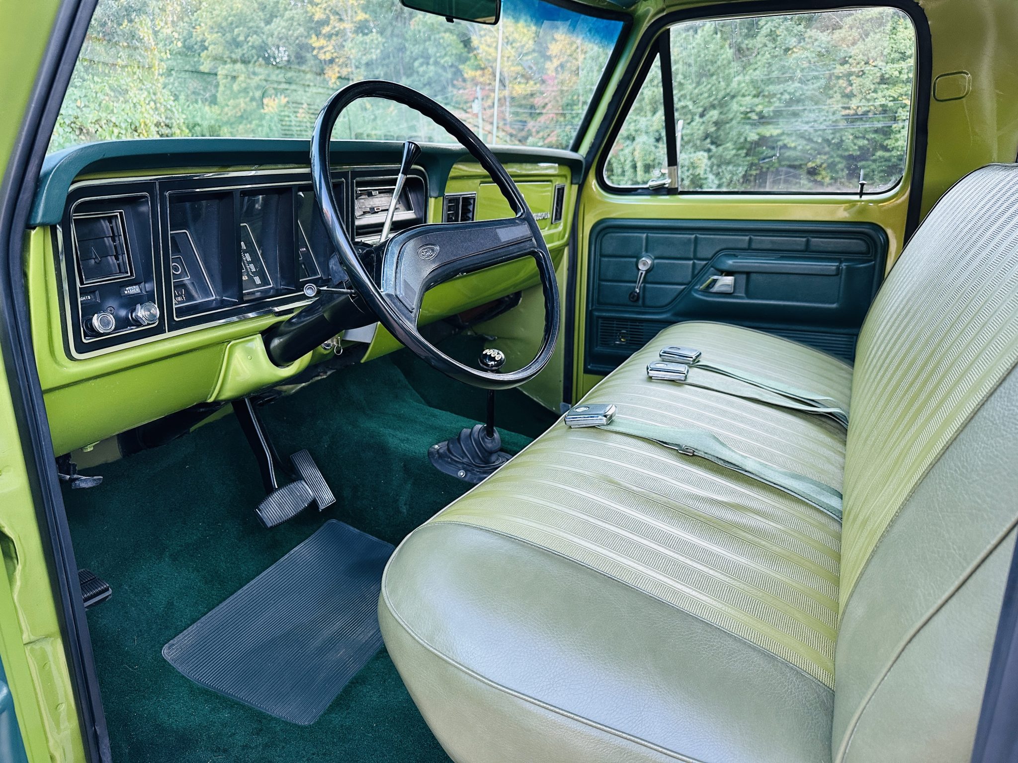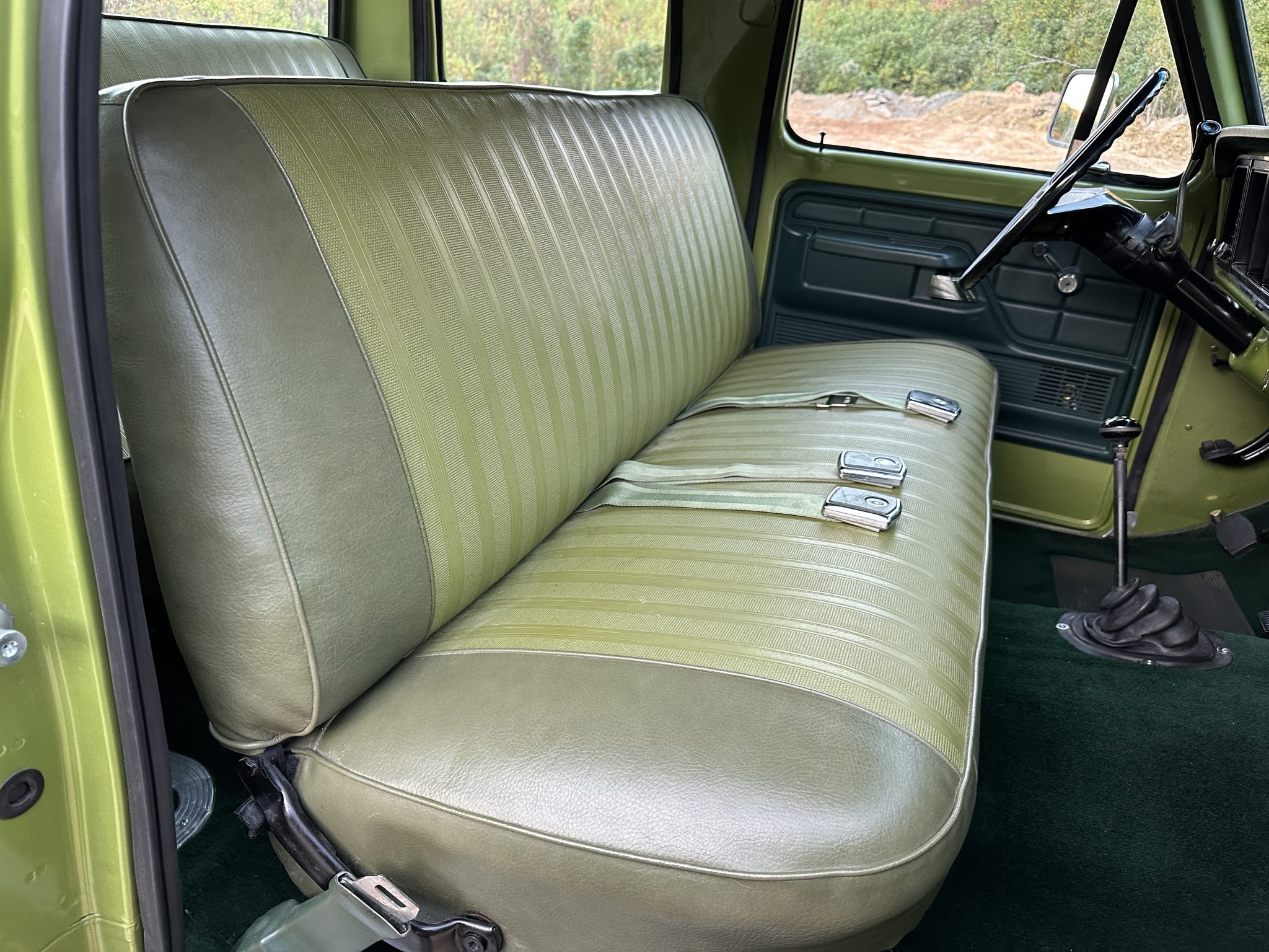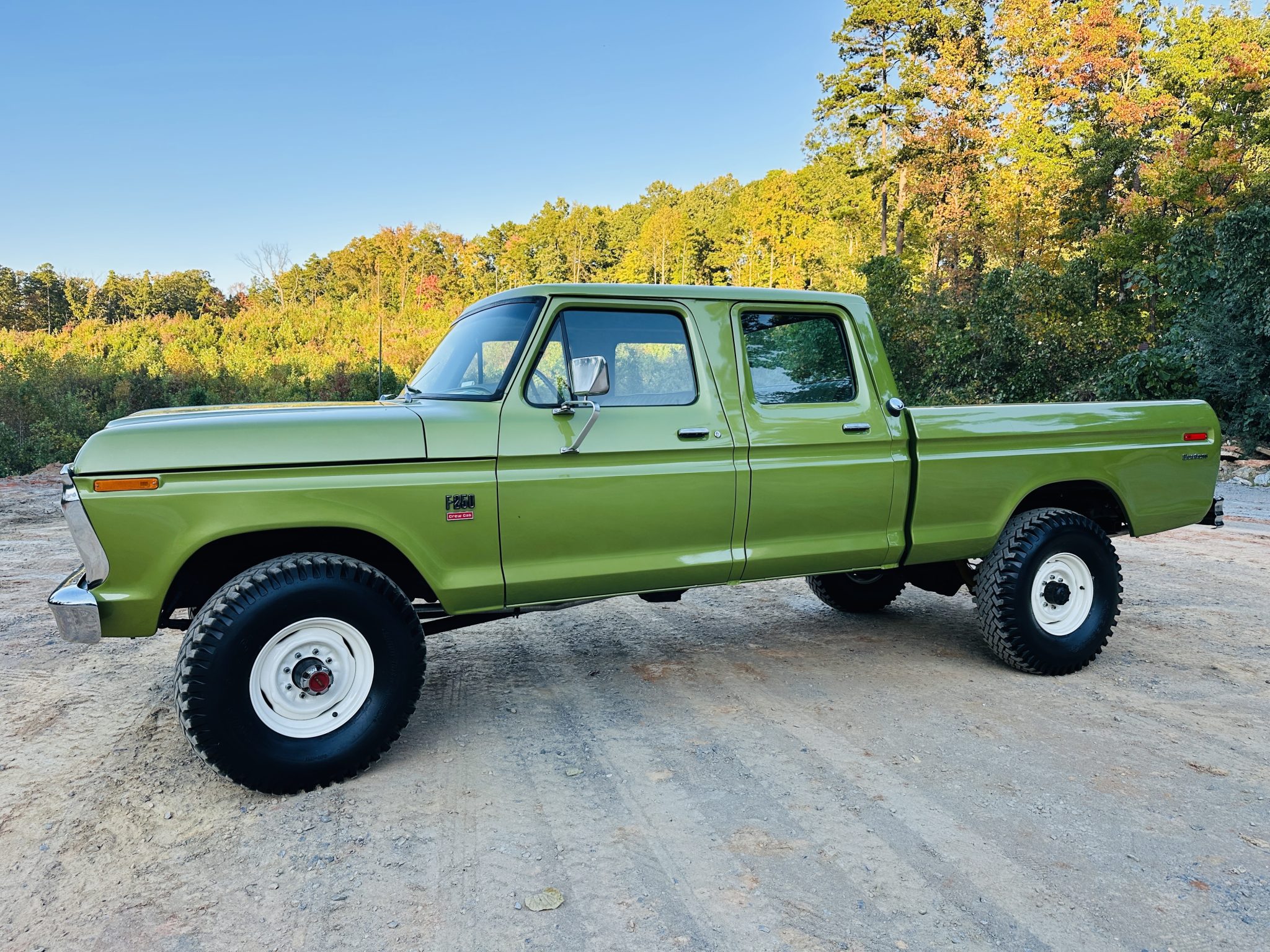 This 1974 Ford F-250 Custom 4×4 is a Crew Cab pickup A subsequent refurbishment involved rebuilding the three-speed automatic transmission, repainting the body in metallic green, and refreshing the green interior in addition to installing a dual exhaust system and replacement shocks. Power comes from a 390ci V8, and equipment includes manually locking front hubs, power steering and brakes, a body-color spray-on bed liner, air conditioning, and a retro-look digital radio with Bluetooth.
