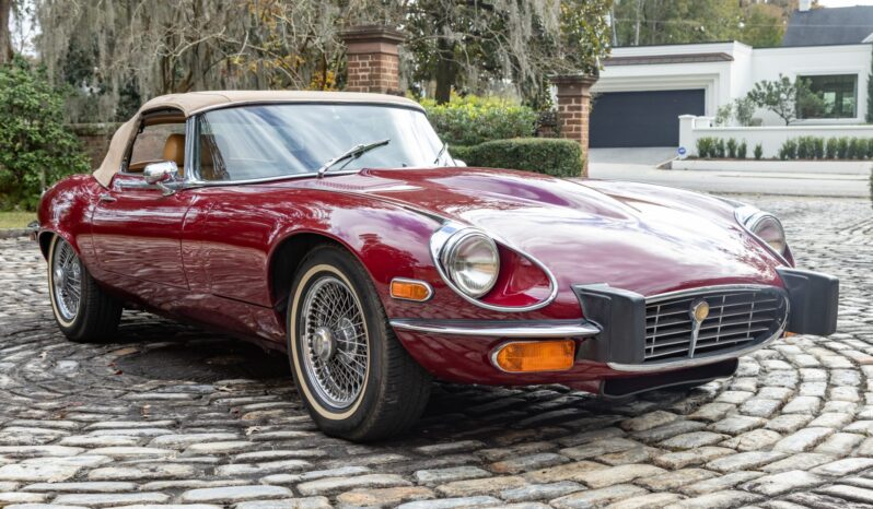 This 1974 Jaguar E-Type Series III roadster is powered by a 5.3-liter V12 linked with a three-speed automatic transmission and a limited-slip differential. The car is finished in red over tan leather, and features include a tan soft top, four-wheel disc brakes, power steering, 15” knock-off wire wheels, quadruple SU carburetors, an aluminum radiator, auxiliary electric cooling fans, MSD ignition components, an oil cooler, and air conditioning.