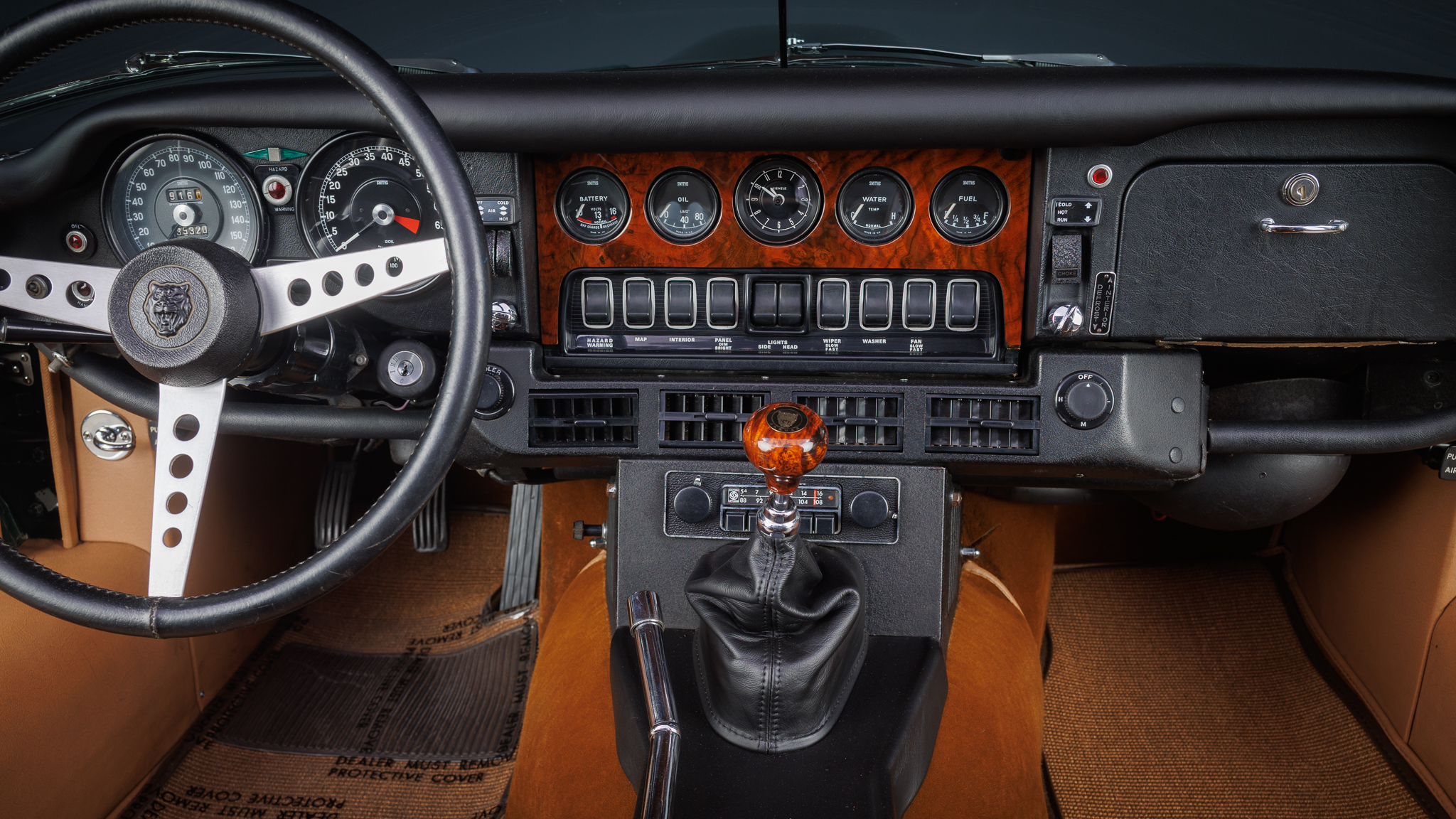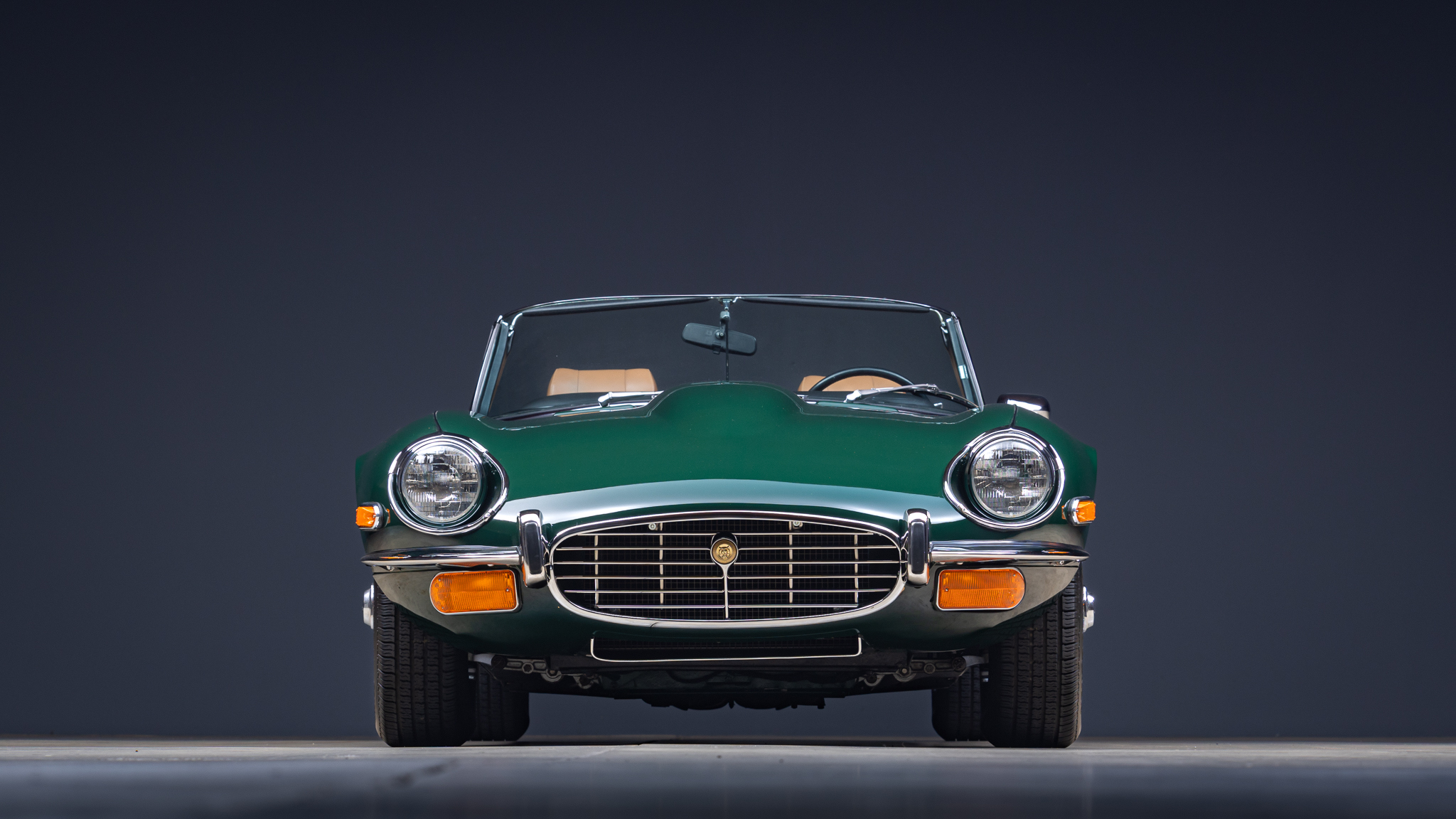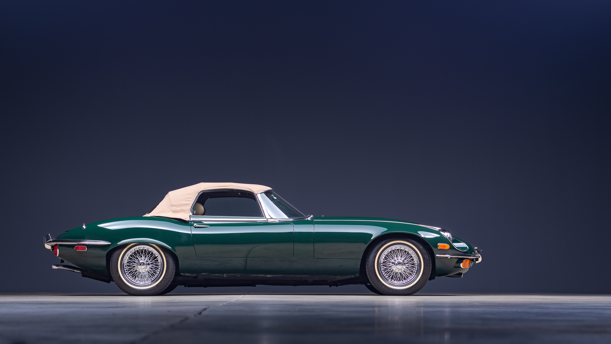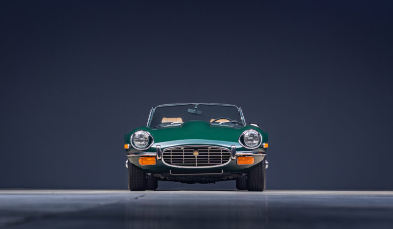 This 1974 Jaguar E-Type Series III roadster is powered by a 5.3-liter V12 linked with a four-speed manual transmission and a limited-slip differential. The car is finished in British Racing Green over Cinnamon leather, and features include a tan soft top, four-wheel disc brakes, power steering, 15” knock-off wire wheels, quadruple Zenith-Stromberg carburetors, air conditioning, wood interior trim, and an AM/FM radio.