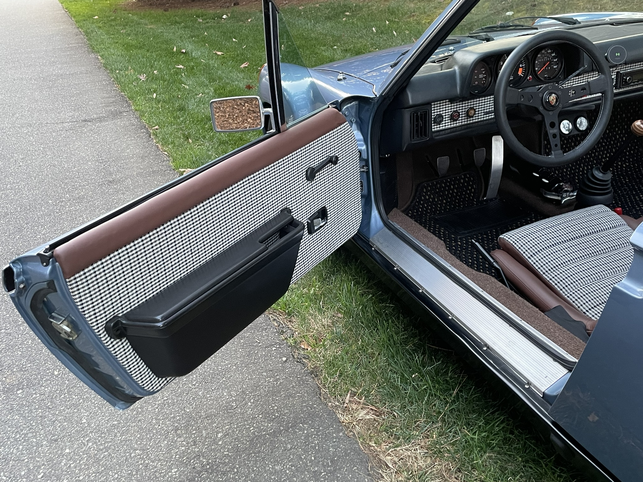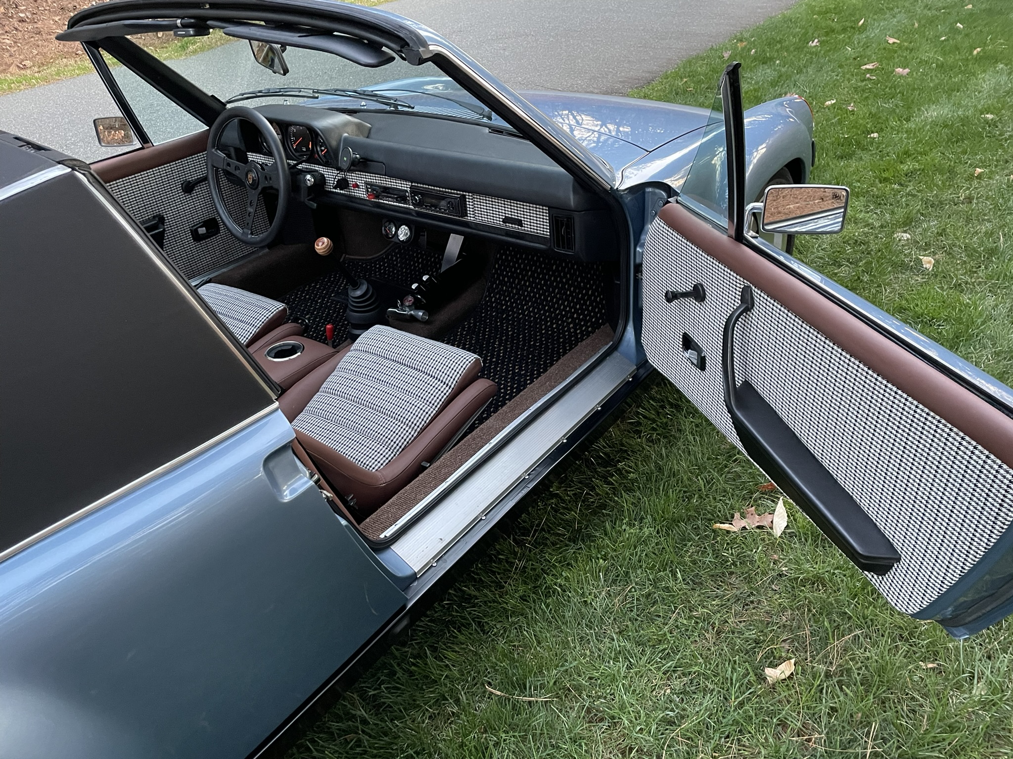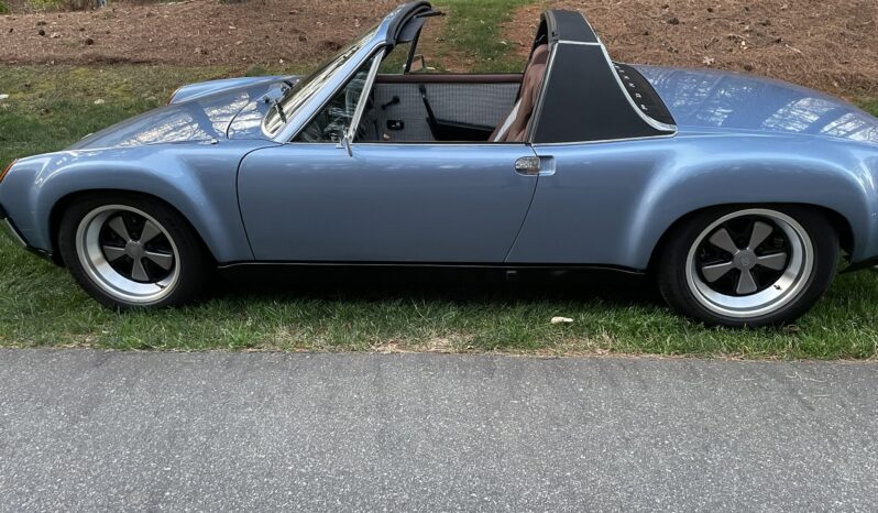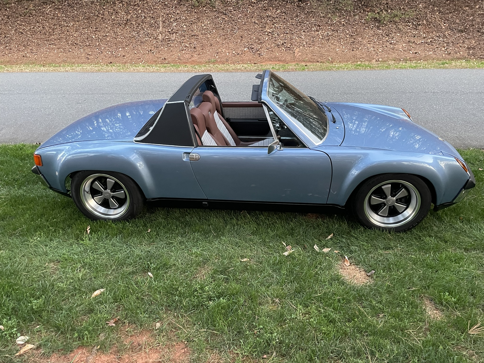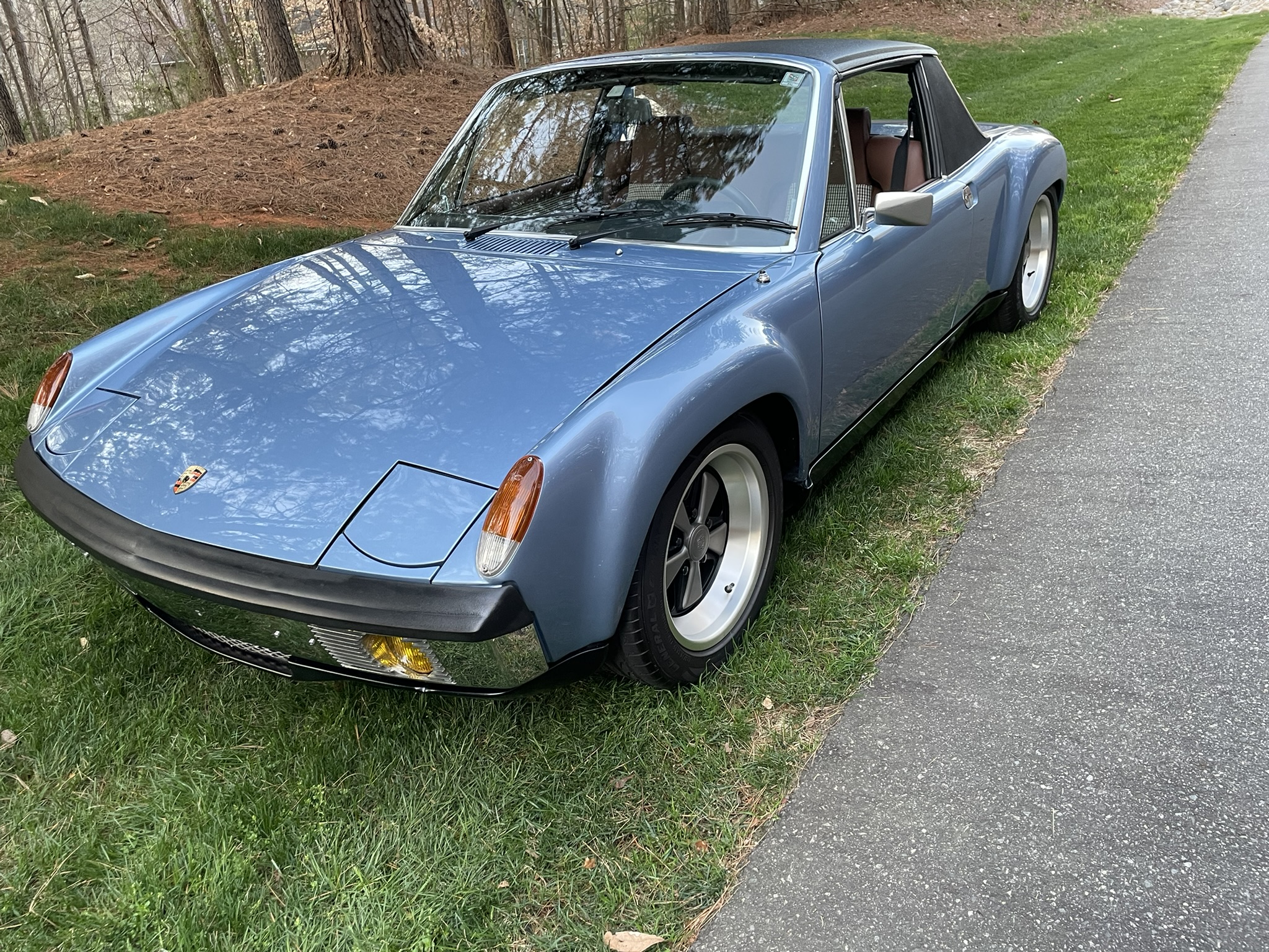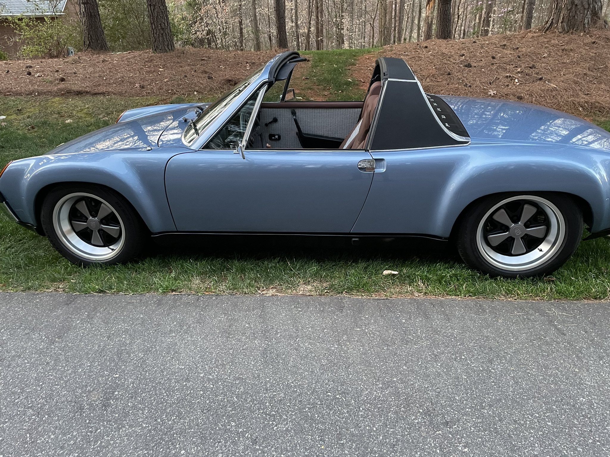 This 1974 Porsche 914 was built in the style of a 914-6 GT with steel flared bodywork painted GM Metallic Blue, a custom interior with brown leather and pepita accents, and a rebuilt 3.2-liter flat-six linked to a Boxster-sourced five-speed manual transaxle. The car rides on Fuchs-style 16″ wheels with Bilstein dampers and rear coilovers, and 928-specification front calipers were installed along with Hawk brake pads. The engine is based on a European Carrera block and was built by Marty Hostetler with 9.5:1-compression JE pistons, Jerry Woods camshafts, and PMO 46mm individual throttle bodies, and it is claimed to produce ~290 horsepower.