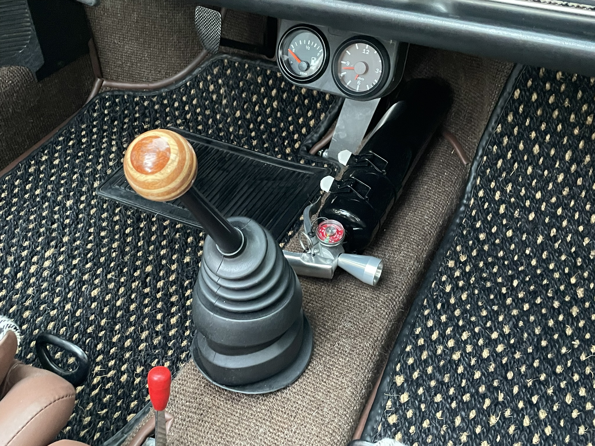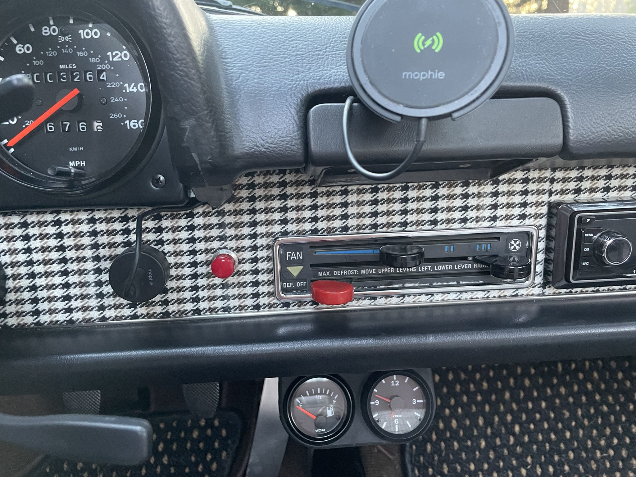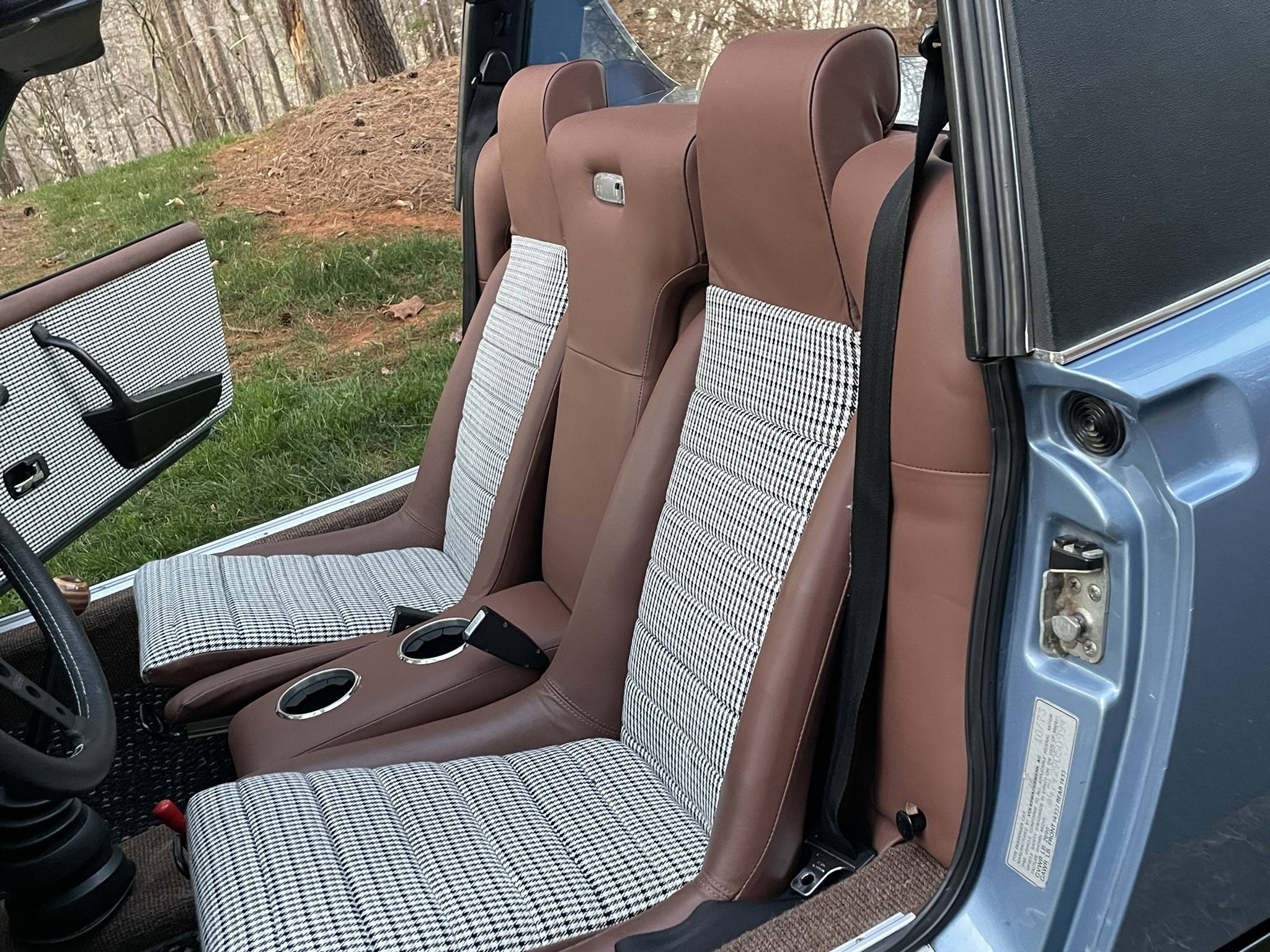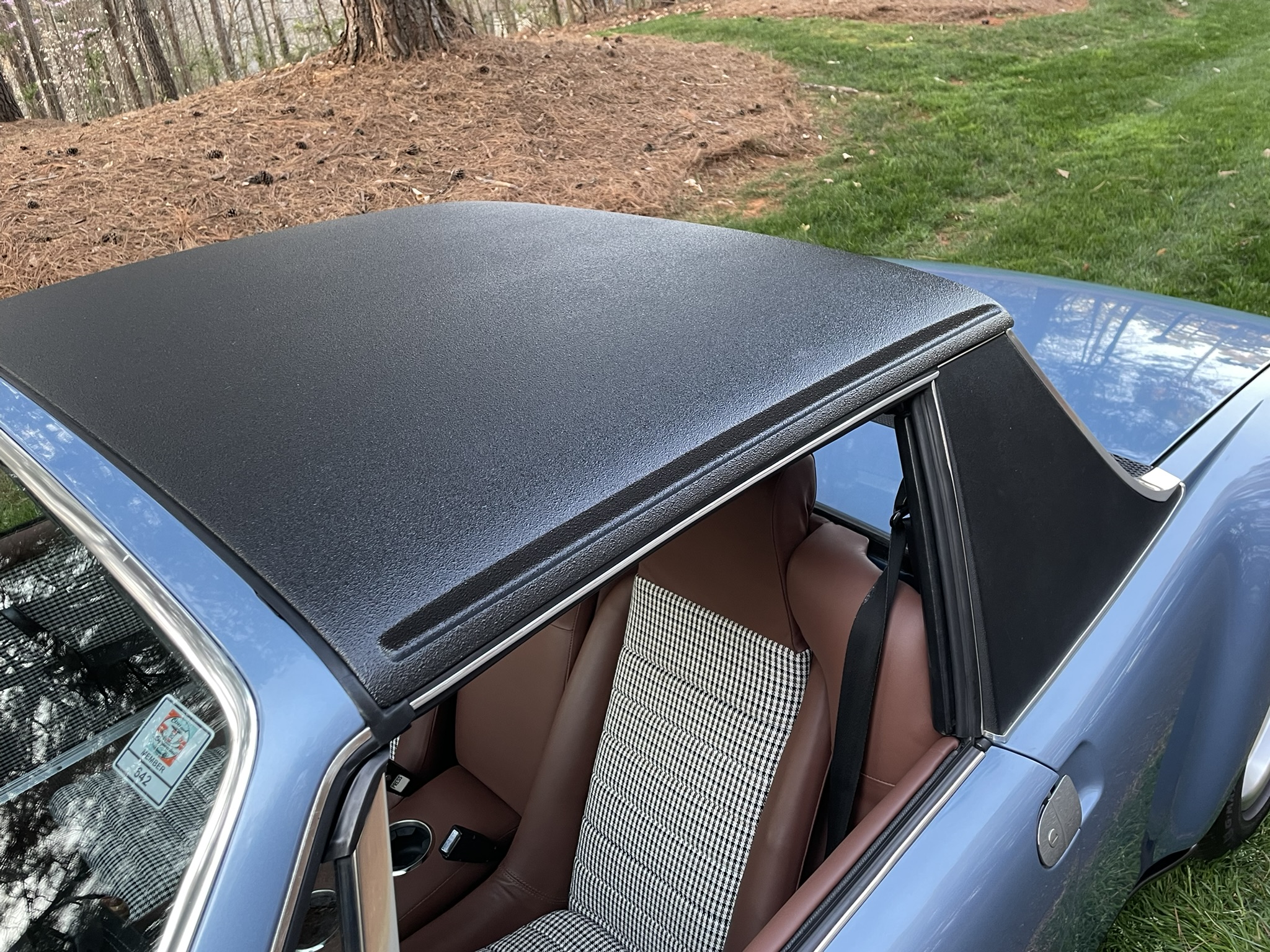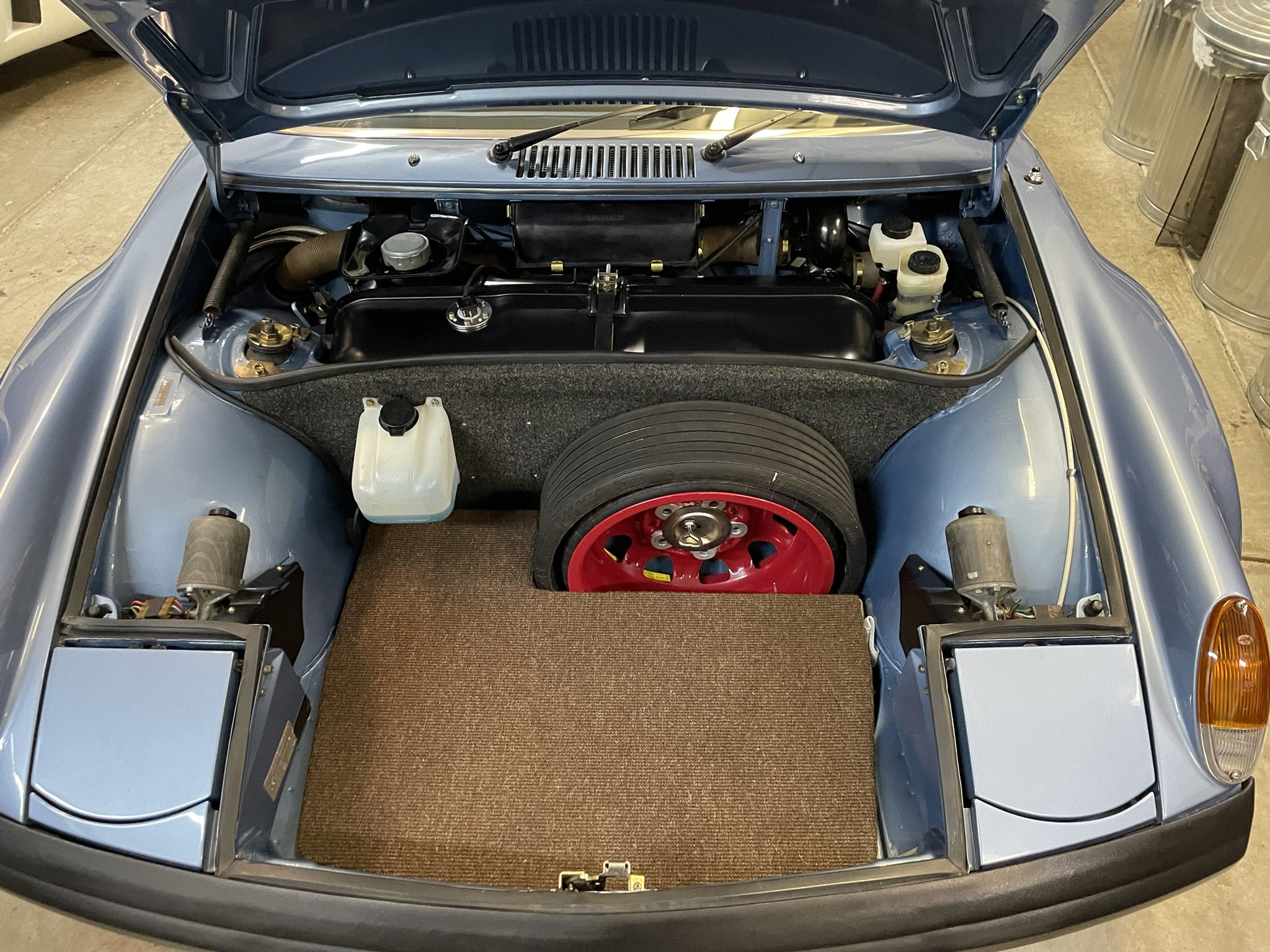 This 1974 Porsche 914 was built in the style of a 914-6 GT with steel flared bodywork painted GM Metallic Blue, a custom interior with brown leather and pepita accents, and a rebuilt 3.2-liter flat-six linked to a Boxster-sourced five-speed manual transaxle. The car rides on Fuchs-style 16″ wheels with Bilstein dampers and rear coilovers, and 928-specification front calipers were installed along with Hawk brake pads. The engine is based on a European Carrera block and was built by Marty Hostetler with 9.5:1-compression JE pistons, Jerry Woods camshafts, and PMO 46mm individual throttle bodies, and it is claimed to produce ~290 horsepower.