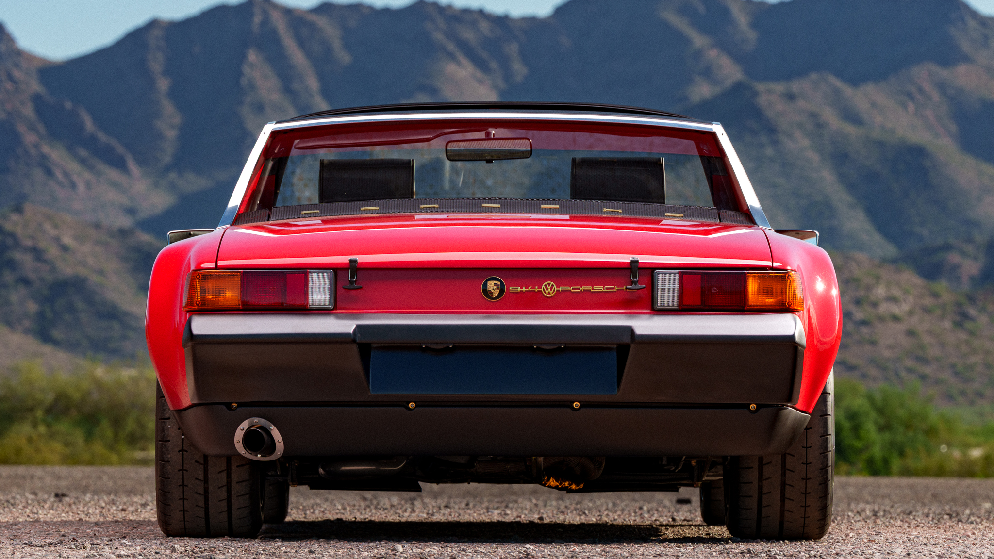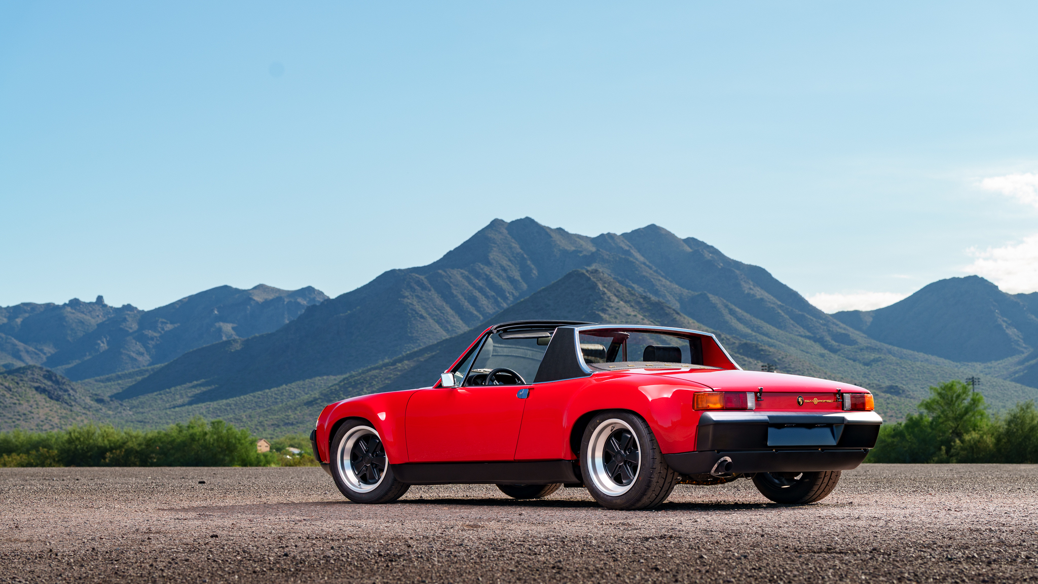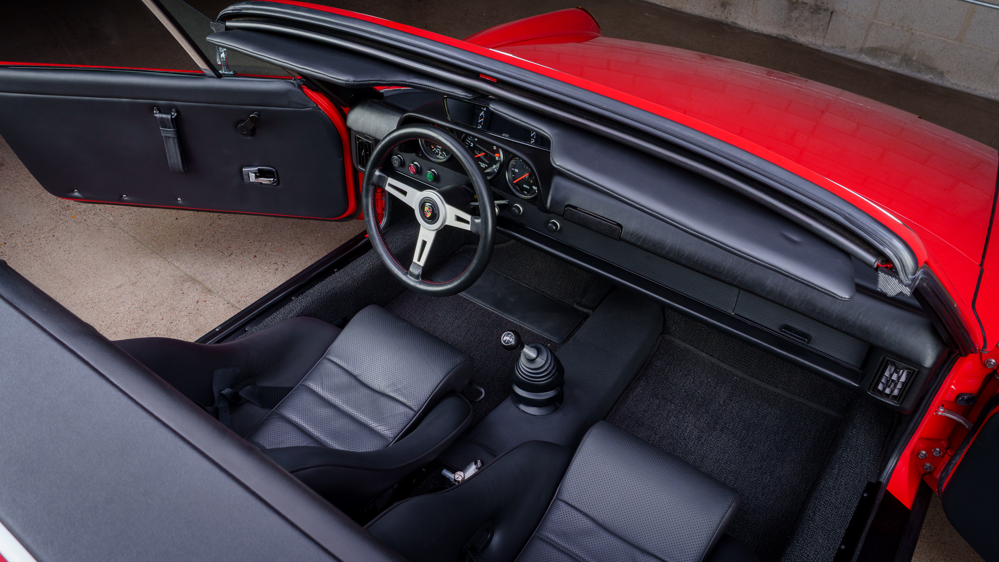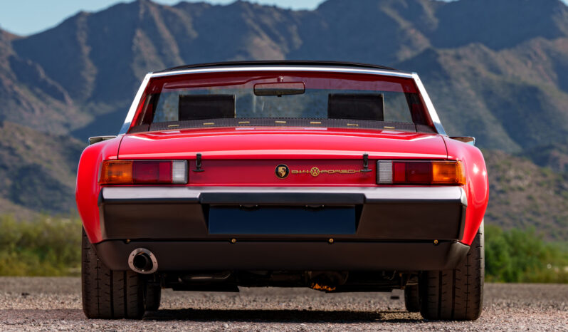 This 1974 Porsche 914 has been fitted with a 2,563cc flat-four built by Jake Raby of Aircooled Technology around 2020. The engine is paired with a 901 five-speed manual transaxle that was rebuilt by Bill Rader Motorsports and is equipped with a Wavetrac limited-slip differential. The car has also been fitted with a fiberglass GT-style widebody kit, a Tarrett coilover suspension, 16″ Maxilite wheels, and 986 Boxster-sourced brakes. The cabin features custom black leather upholstery, GTS Rallye seats, and a MOMO steering wheel.