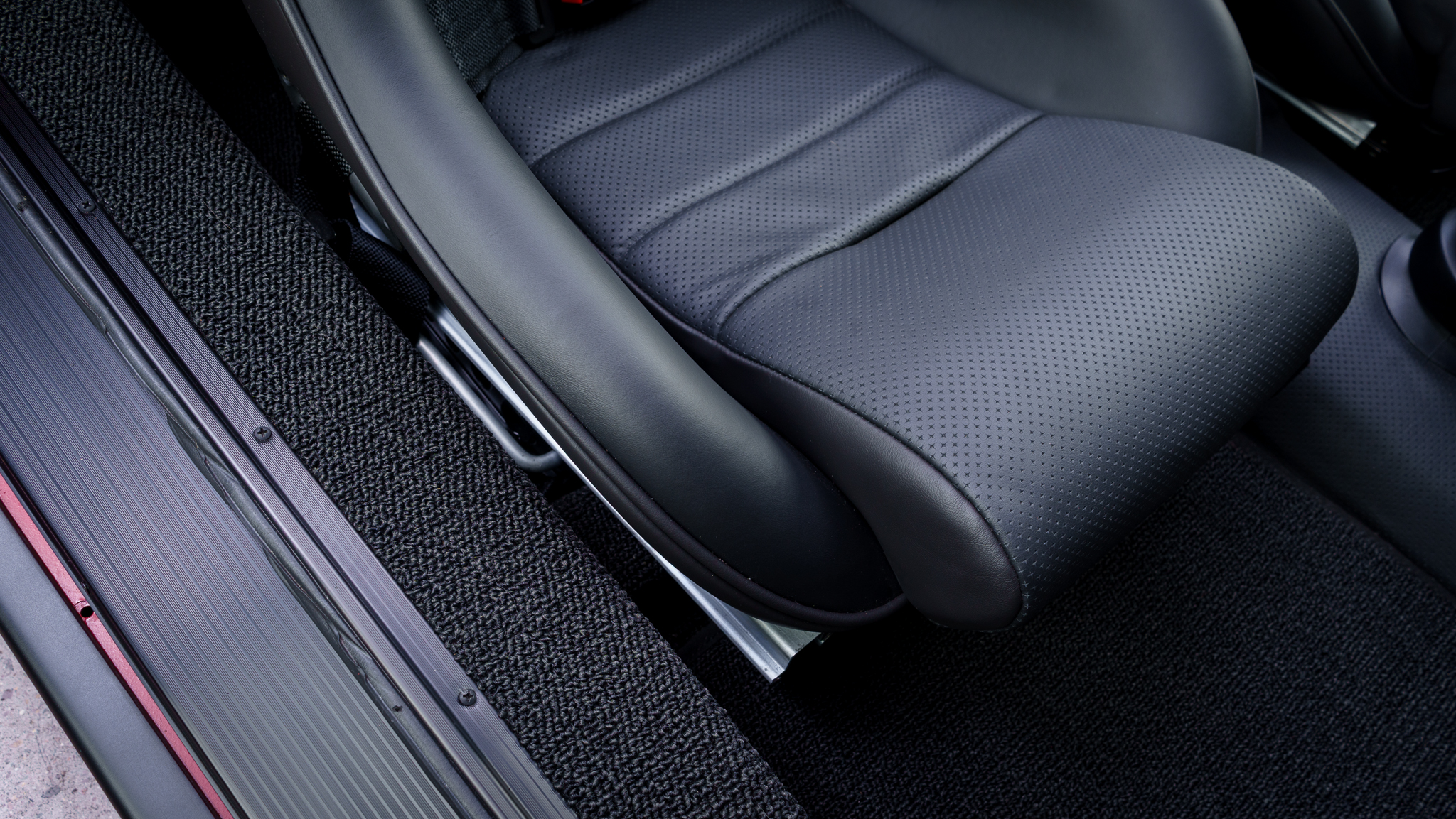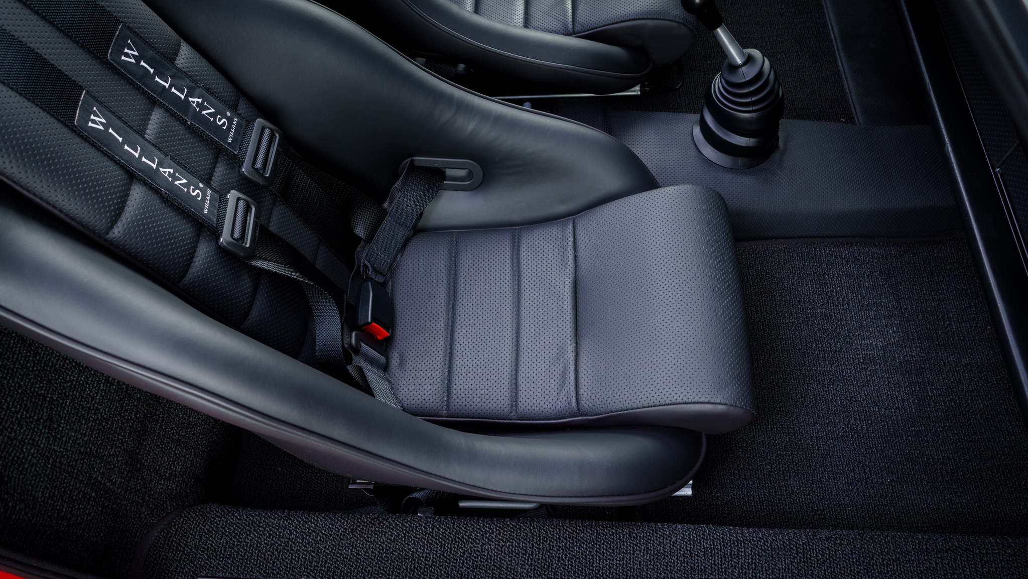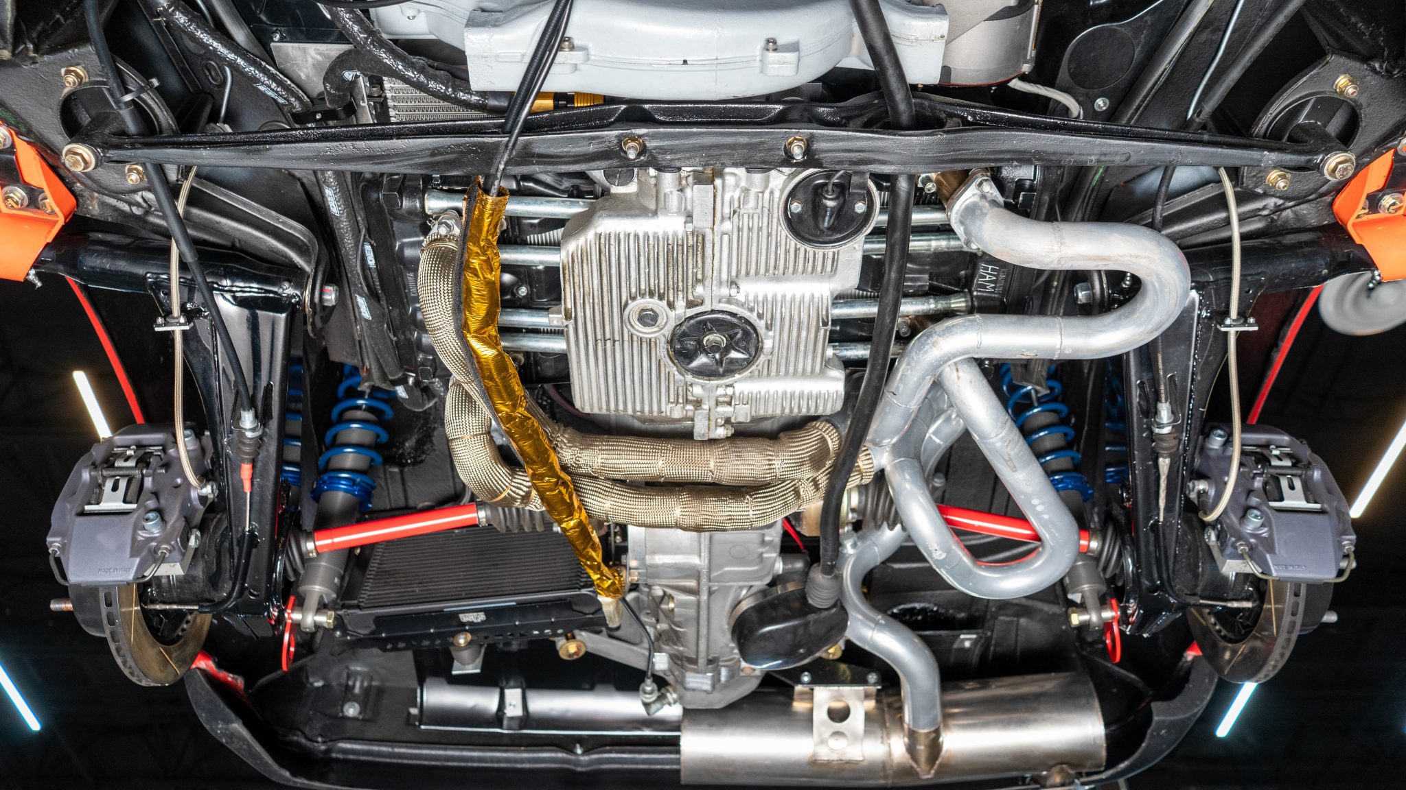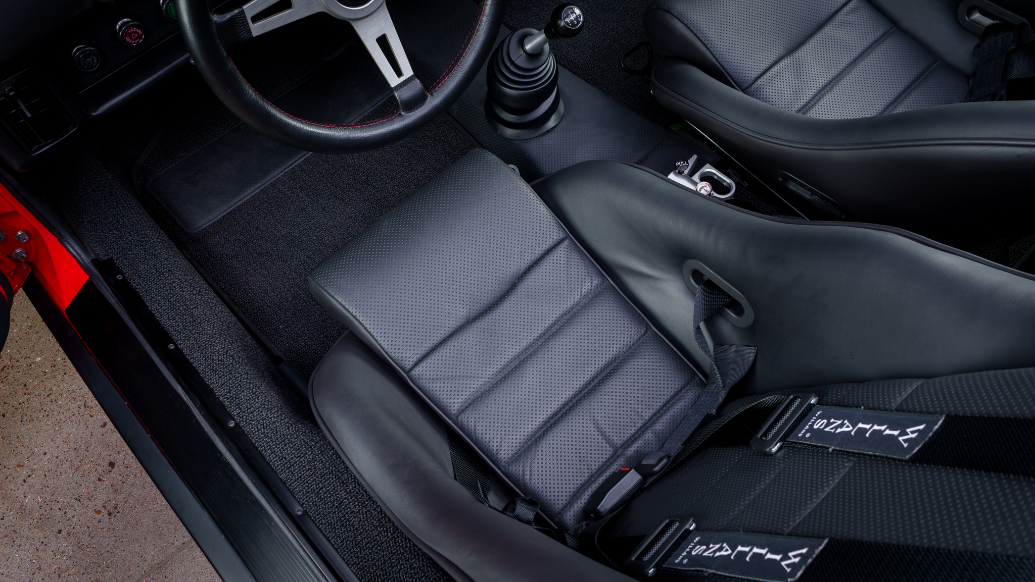 This 1974 Porsche 914 has been fitted with a 2,563cc flat-four built by Jake Raby of Aircooled Technology around 2020. The engine is paired with a 901 five-speed manual transaxle that was rebuilt by Bill Rader Motorsports and is equipped with a Wavetrac limited-slip differential. The car has also been fitted with a fiberglass GT-style widebody kit, a Tarrett coilover suspension, 16″ Maxilite wheels, and 986 Boxster-sourced brakes. The cabin features custom black leather upholstery, GTS Rallye seats, and a MOMO steering wheel.