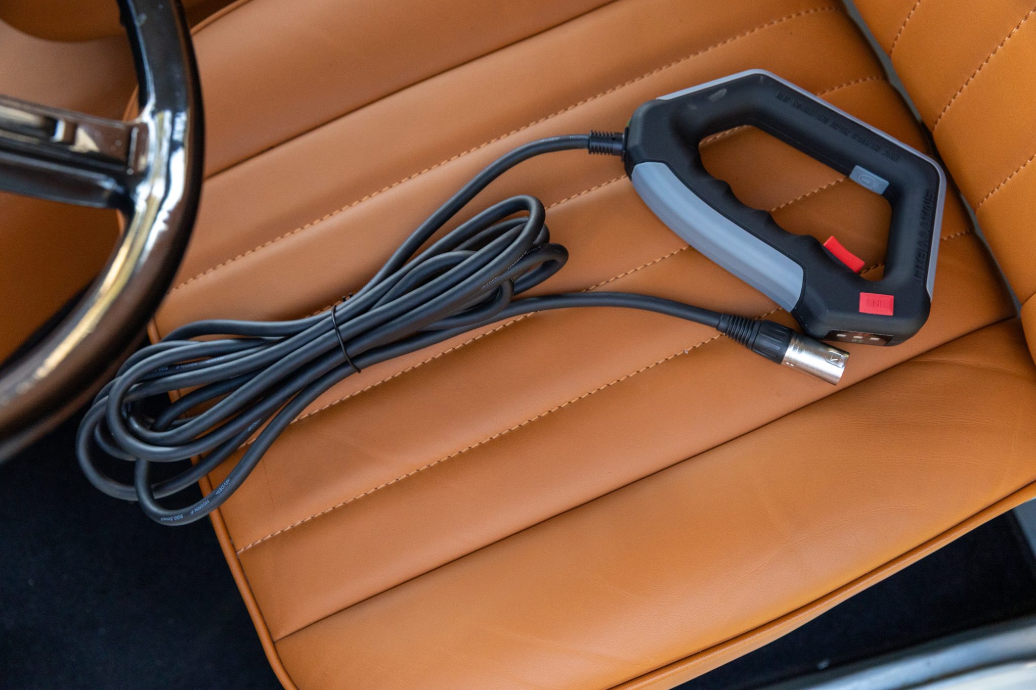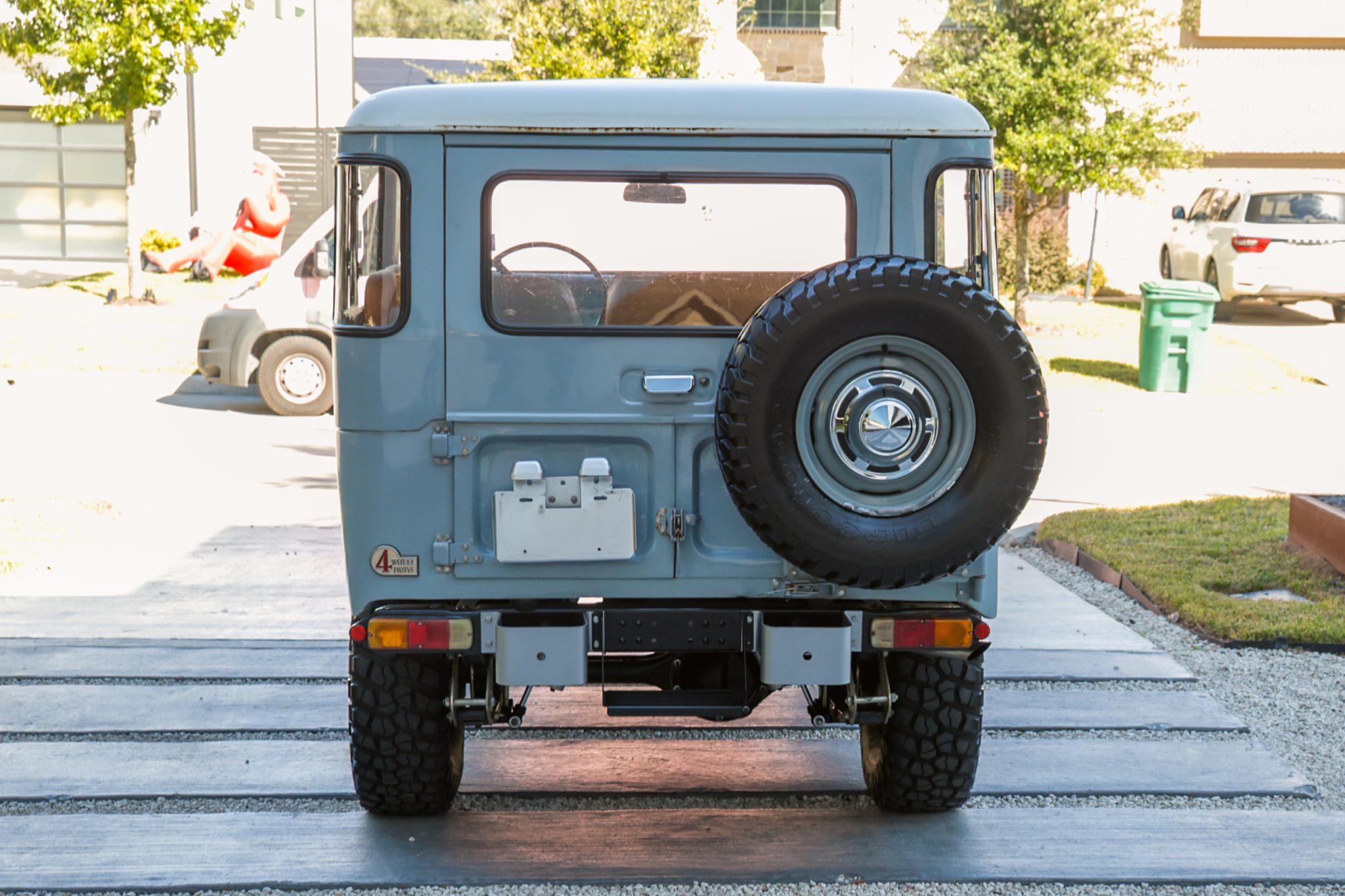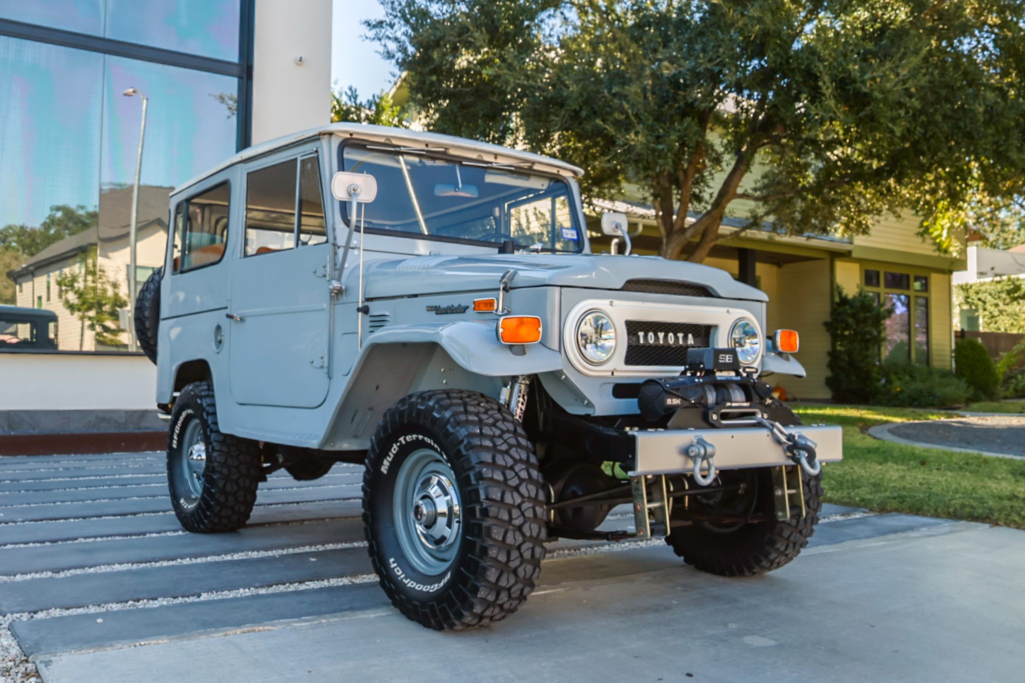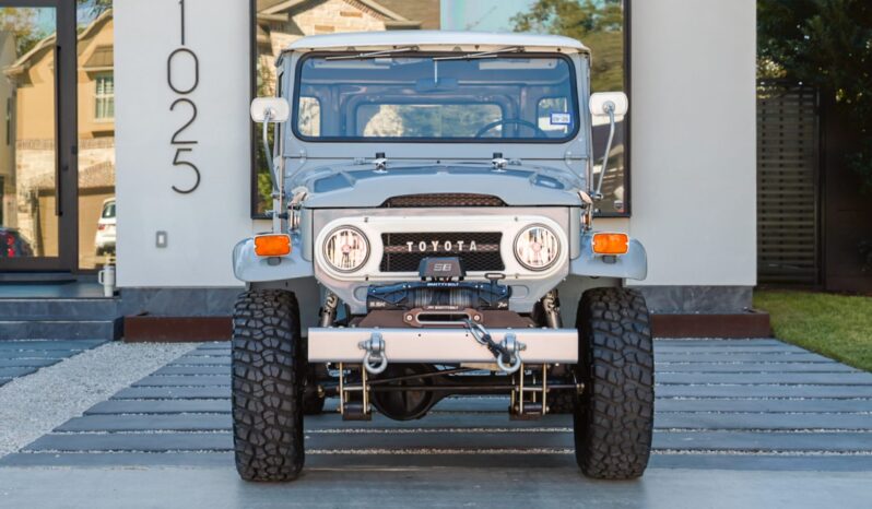 A disc brake conversion was performed, the rear axle was replaced, and Fox remote-reservoir shocks were installed. The truck is finished in light blue, and the cabin was overhauled in February 2023 and features replacement seats that have been trimmed in orange upholstery. Power is provided by a 4.2-liter 2F inline-six linked with a four-speed manual transmission and a dual-range transfer case. Equipment includes 15″ steel wheels with polished hubcaps, manually locking front hubs, KC HiLiTES headlights, a Smittybilt front winch, air conditioning, and rear jump seats.