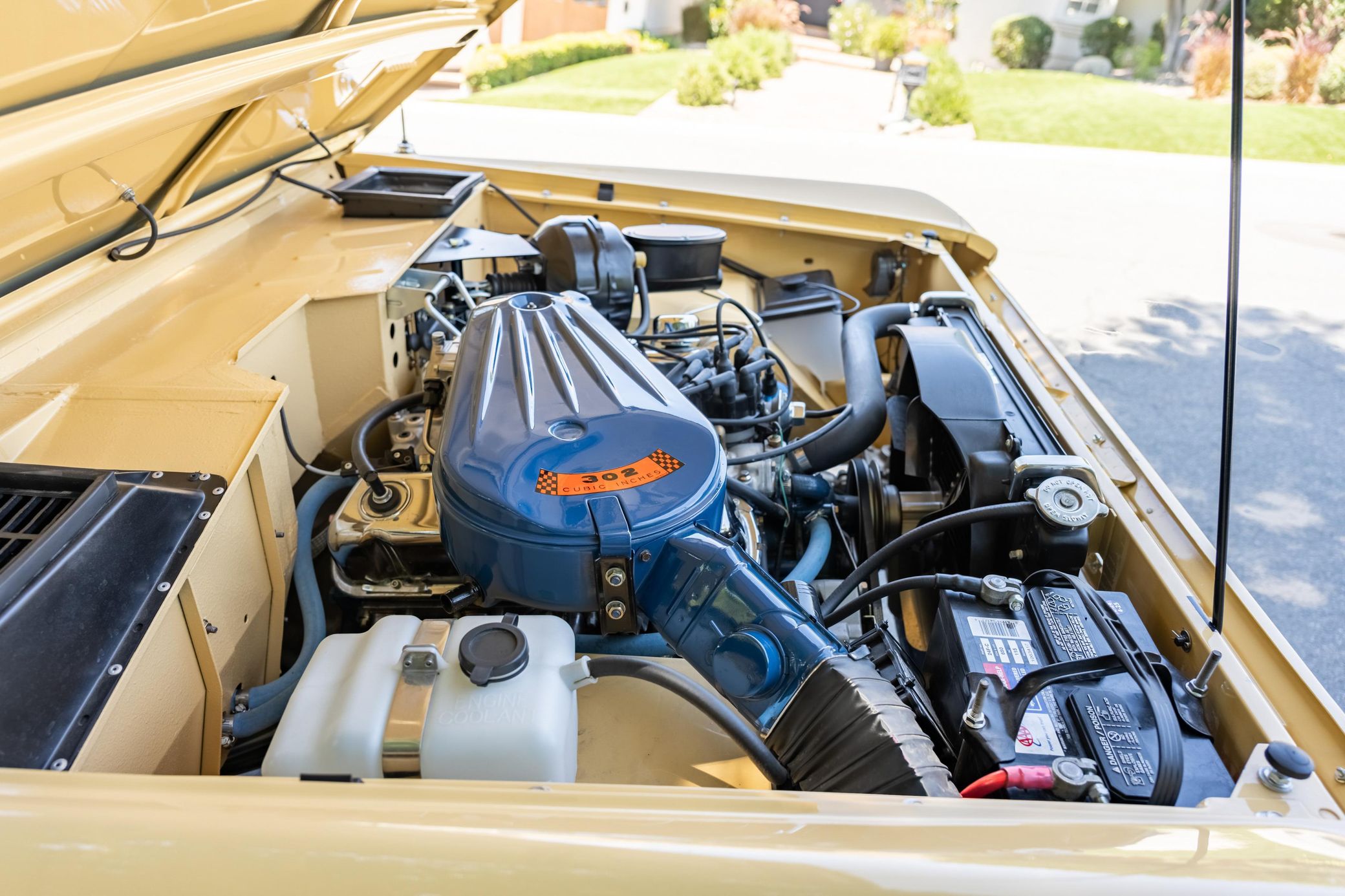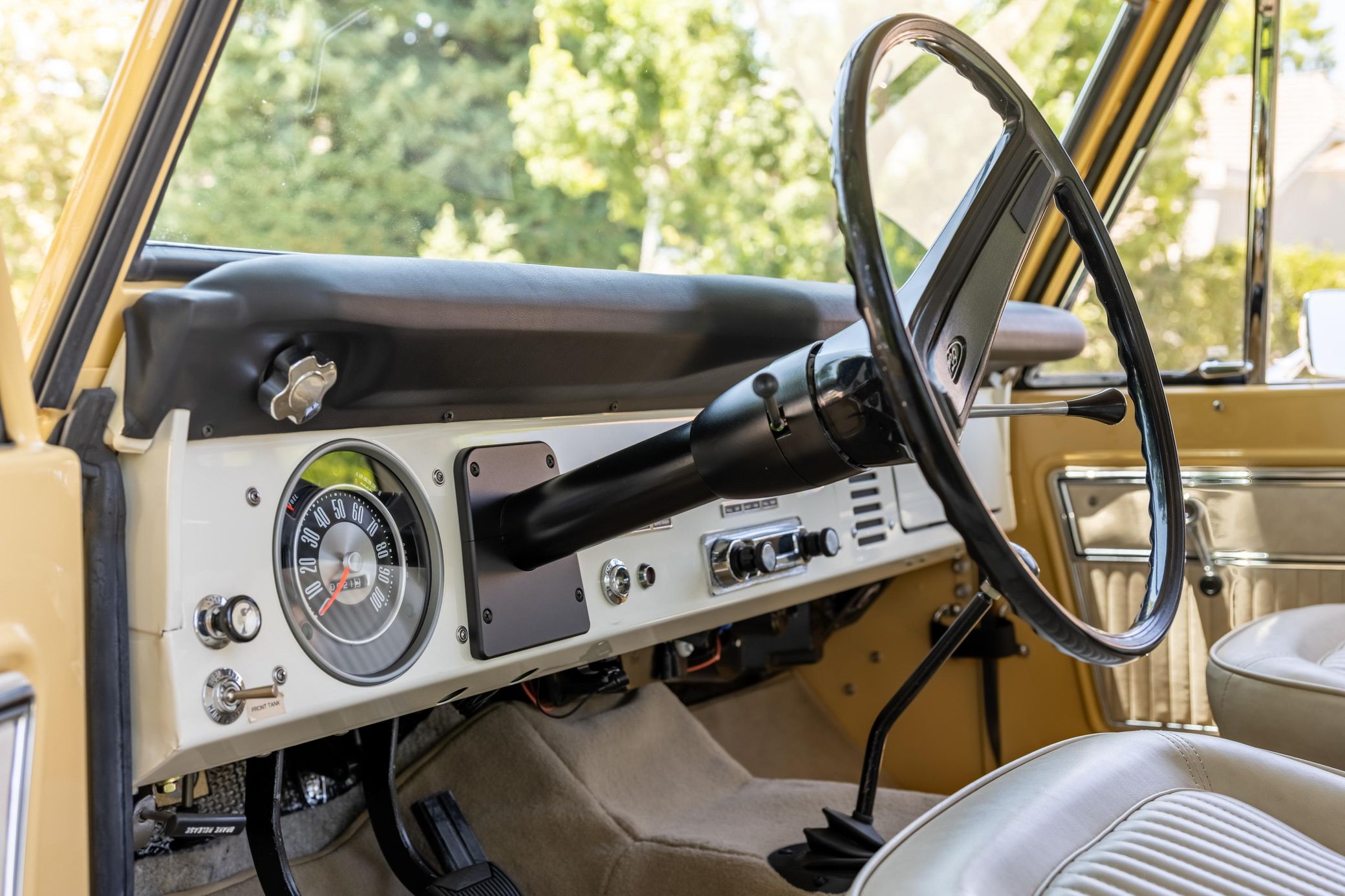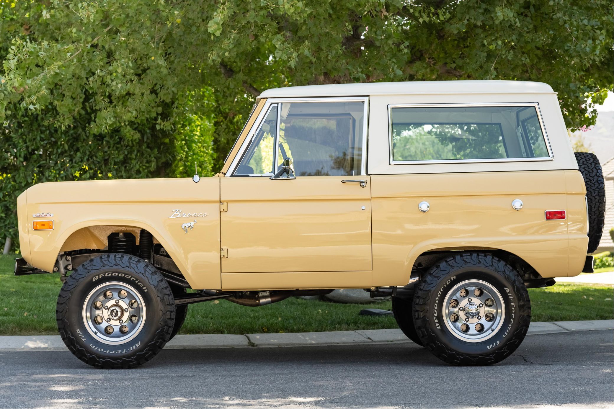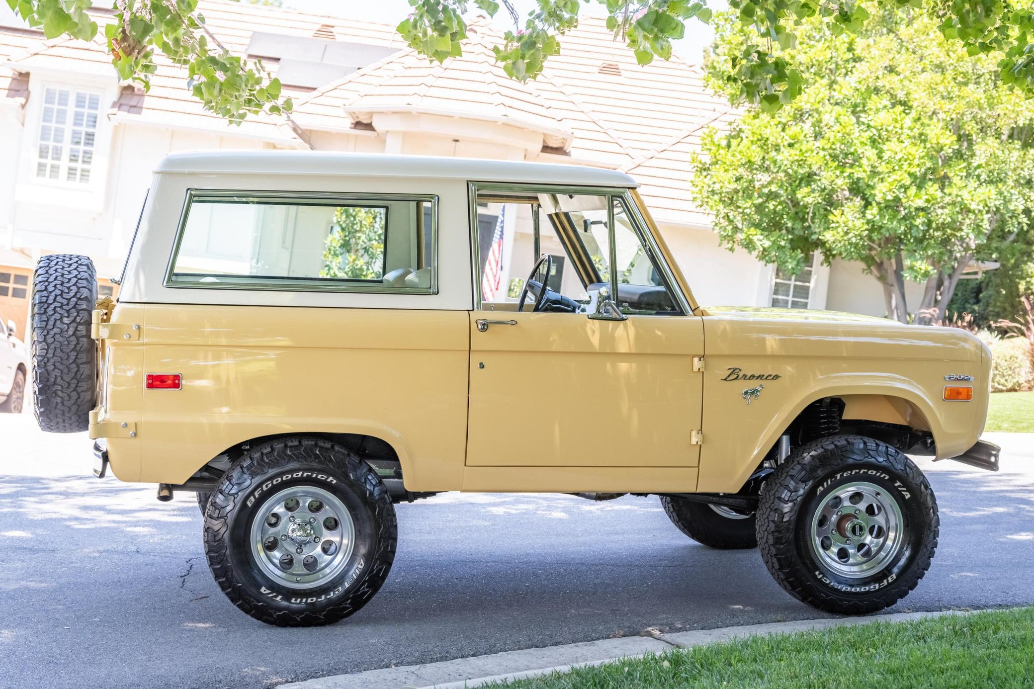 It boasts a 302-cubic-inch V8, a 3-speed manual transmission, and a gorgeous color scheme – along with some great features like an auxiliary fuel tank, a 2.5-inch lift kit, and a removable hardtop