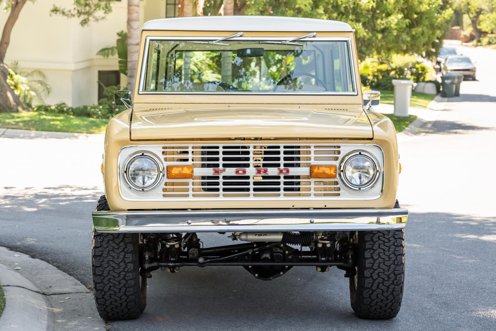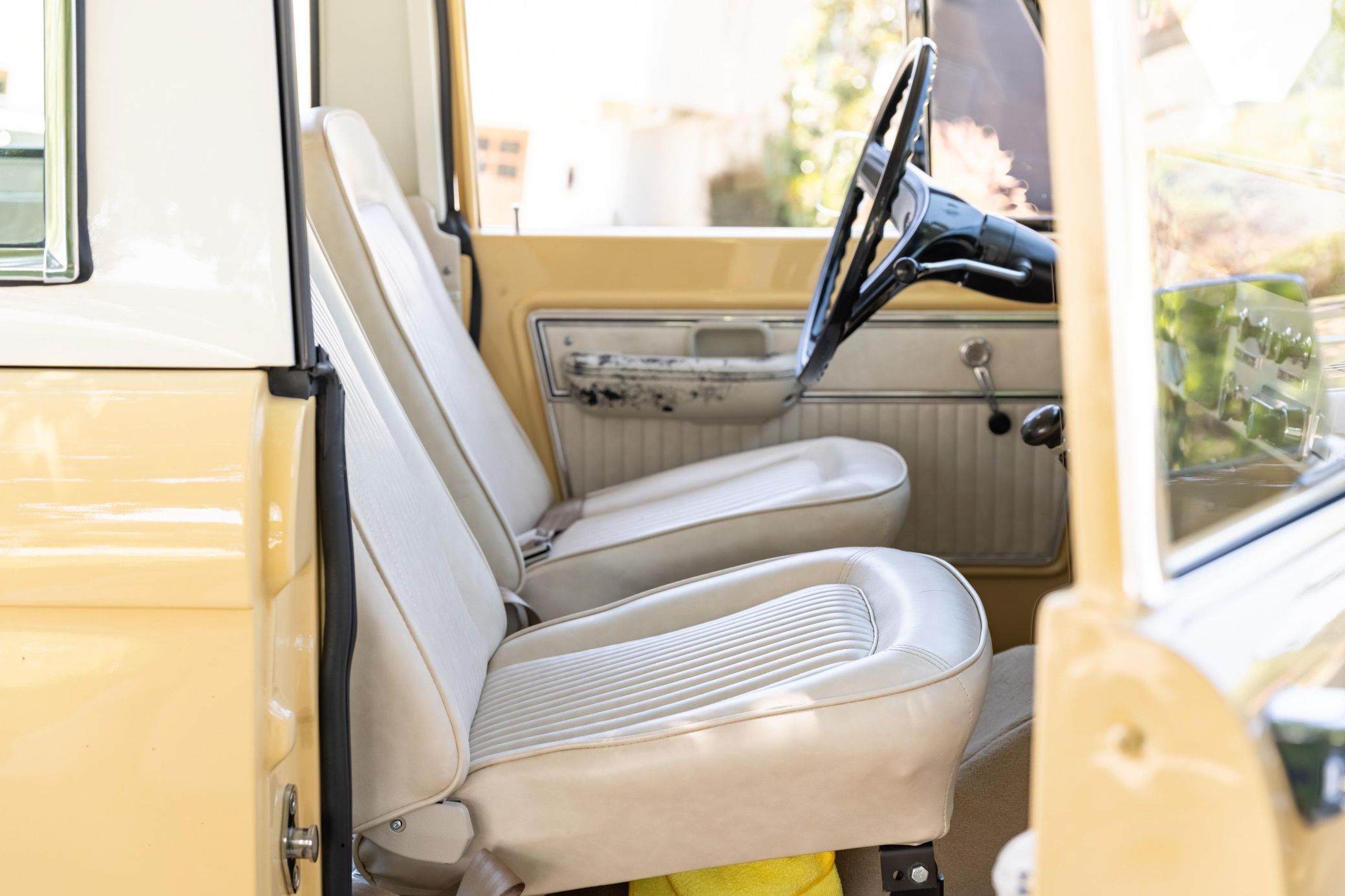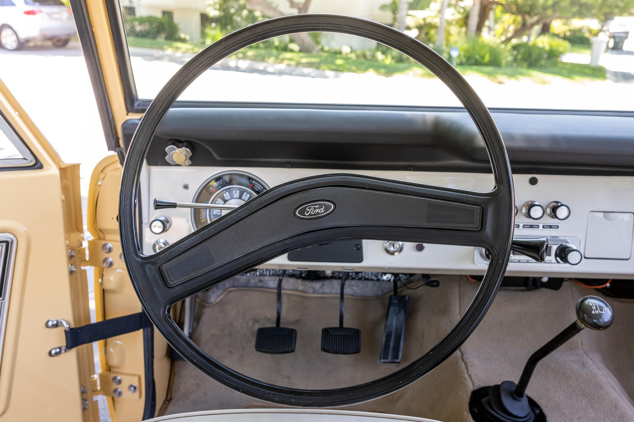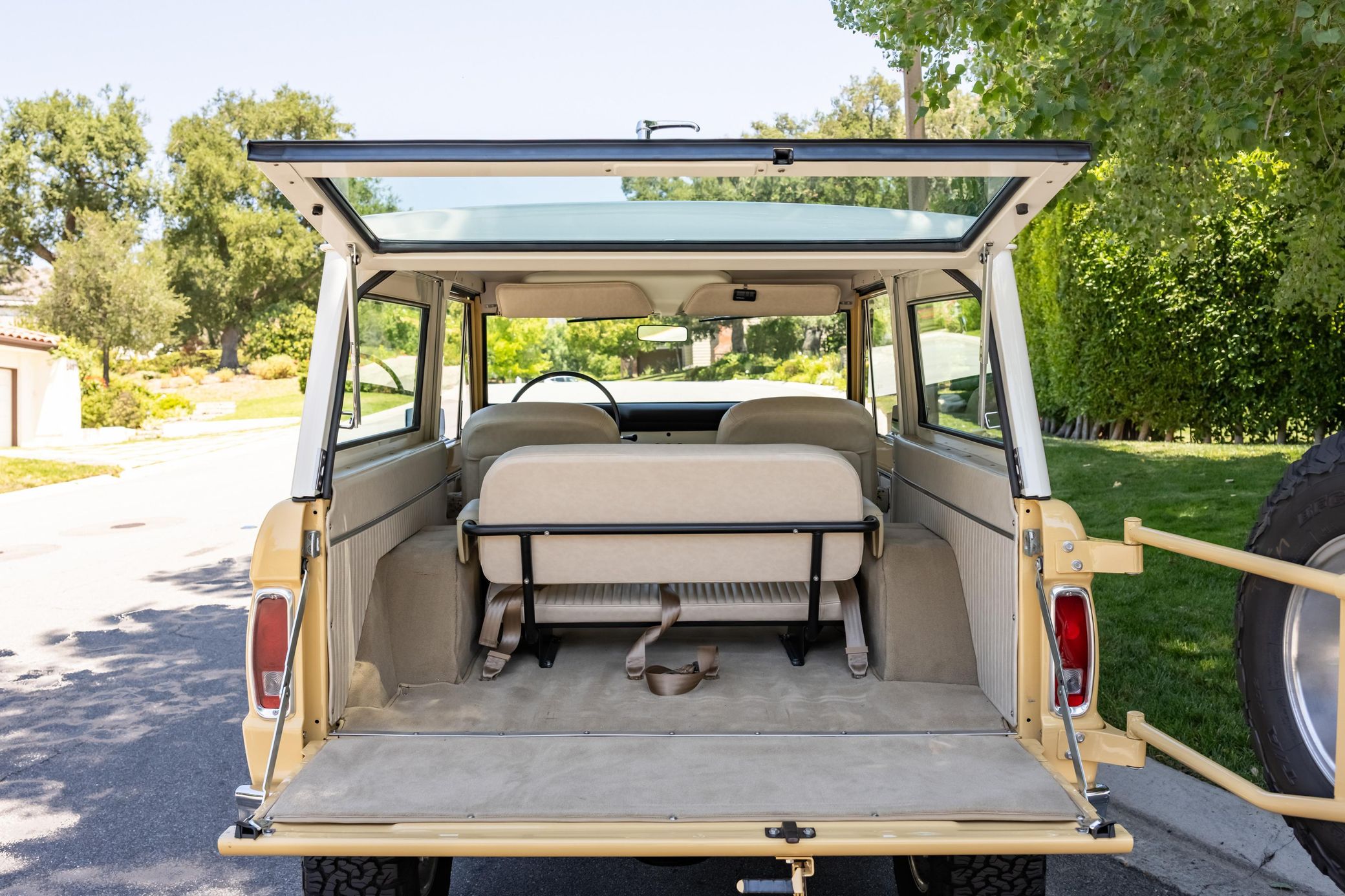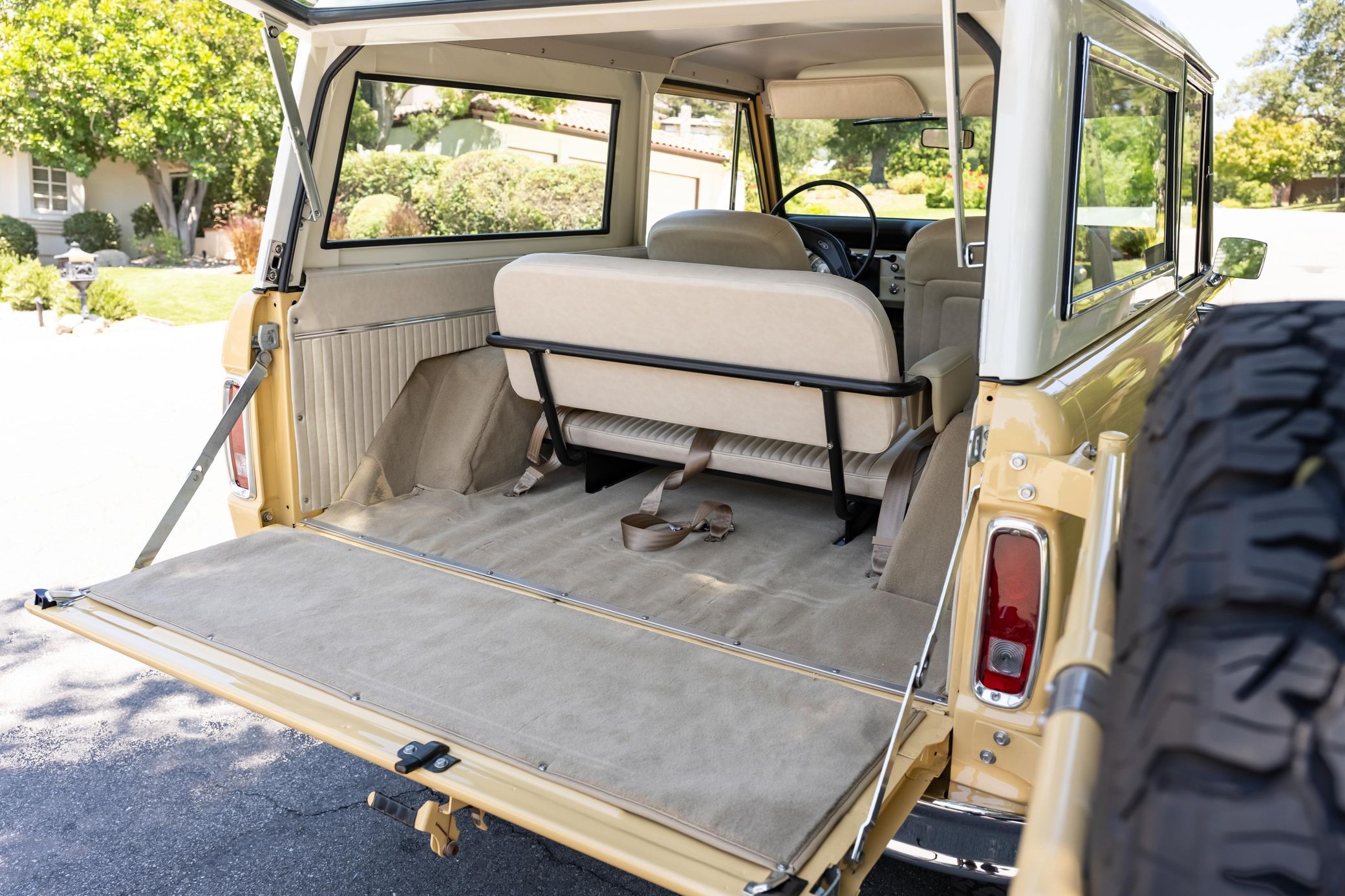 It boasts a 302-cubic-inch V8, a 3-speed manual transmission, and a gorgeous color scheme – along with some great features like an auxiliary fuel tank, a 2.5-inch lift kit, and a removable hardtop