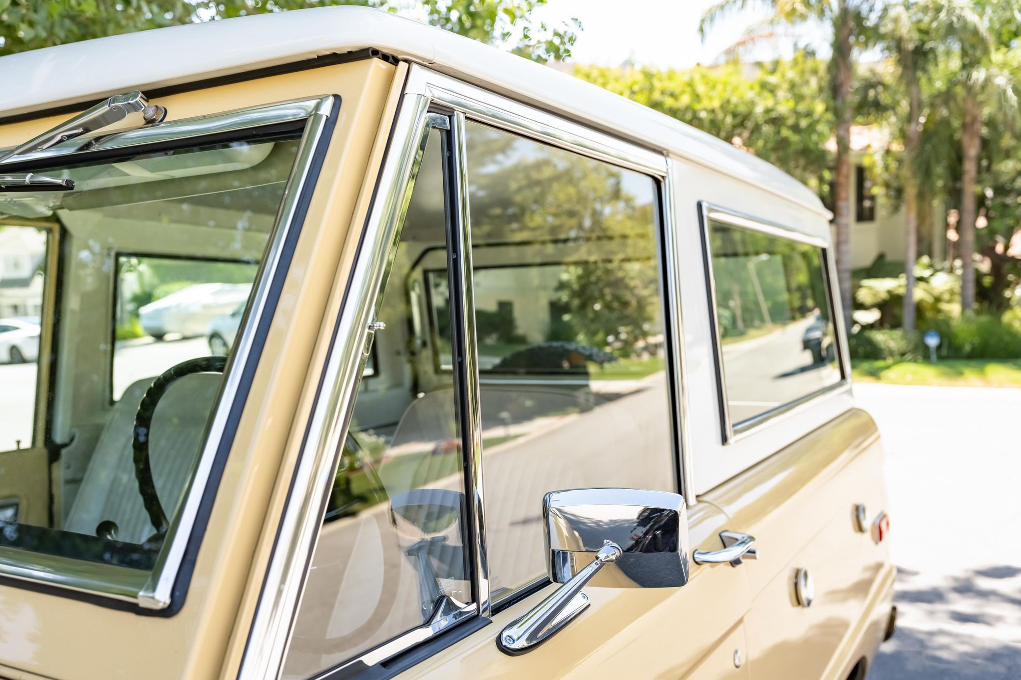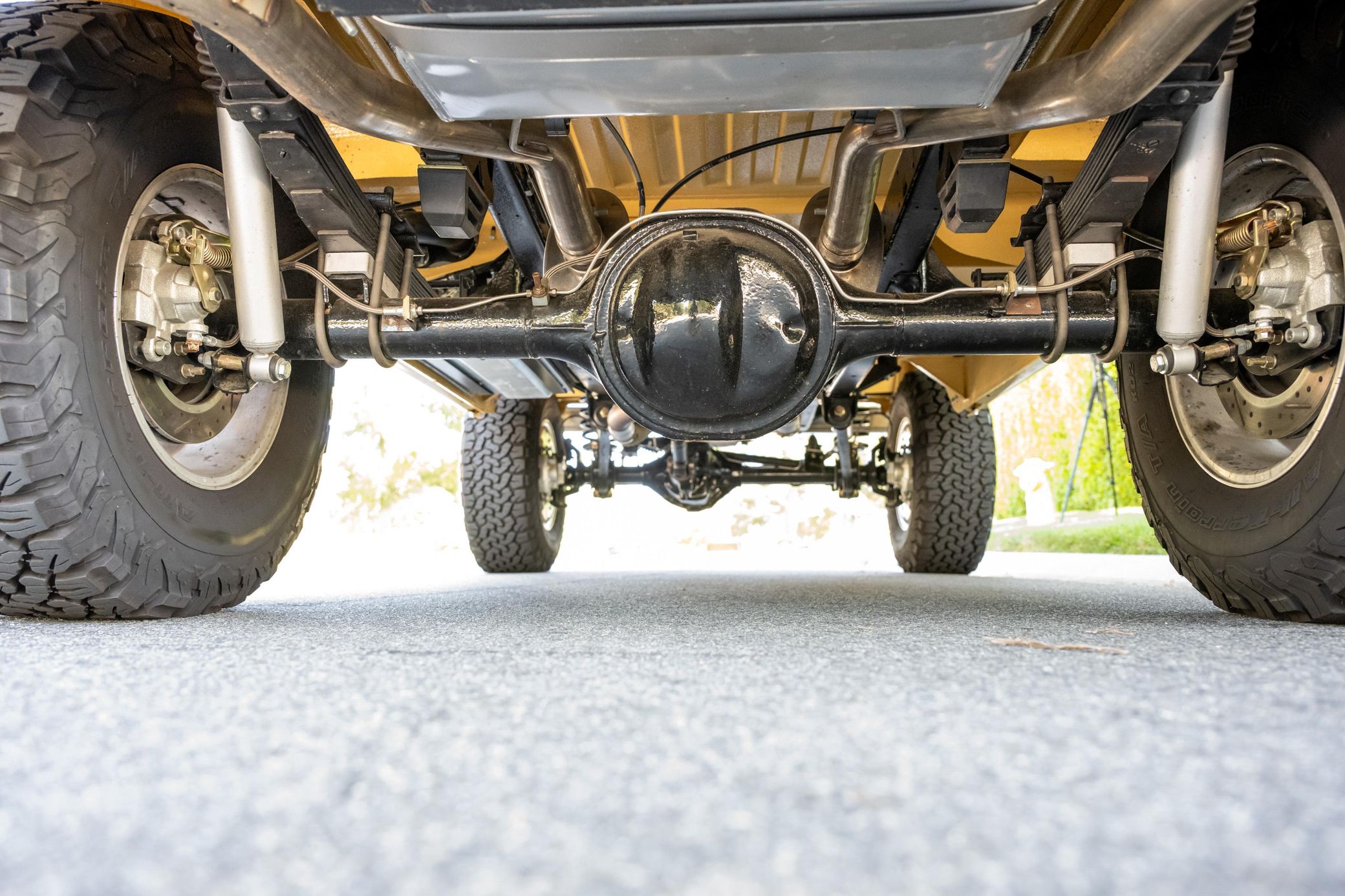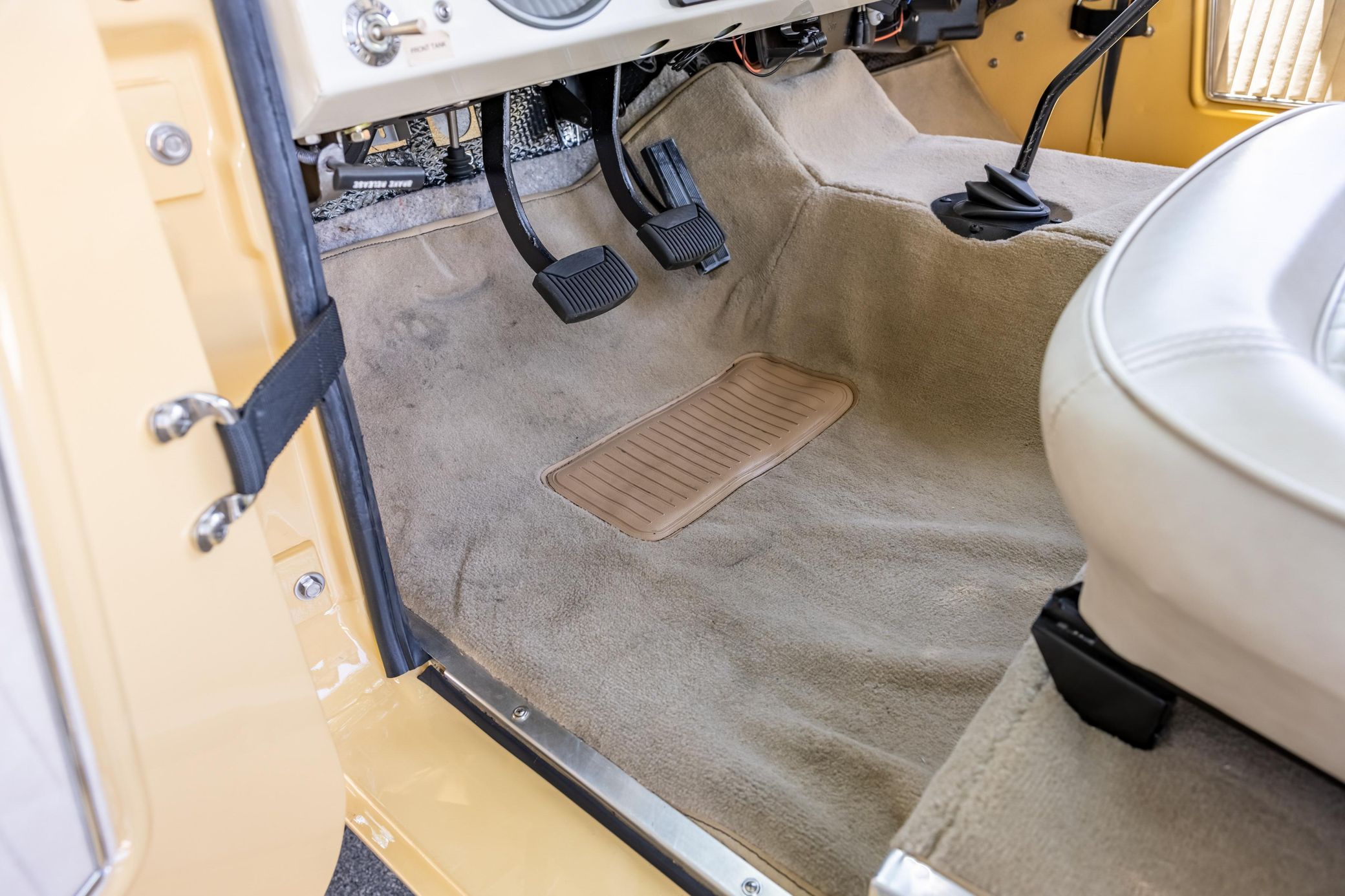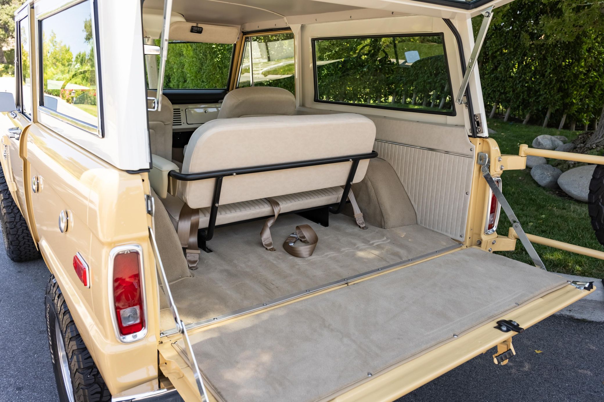 It boasts a 302-cubic-inch V8, a 3-speed manual transmission, and a gorgeous color scheme – along with some great features like an auxiliary fuel tank, a 2.5-inch lift kit, and a removable hardtop