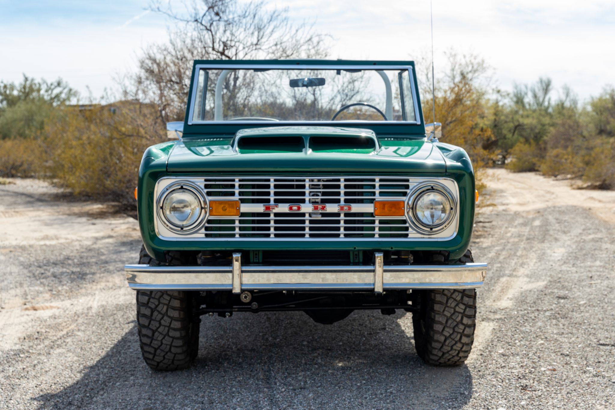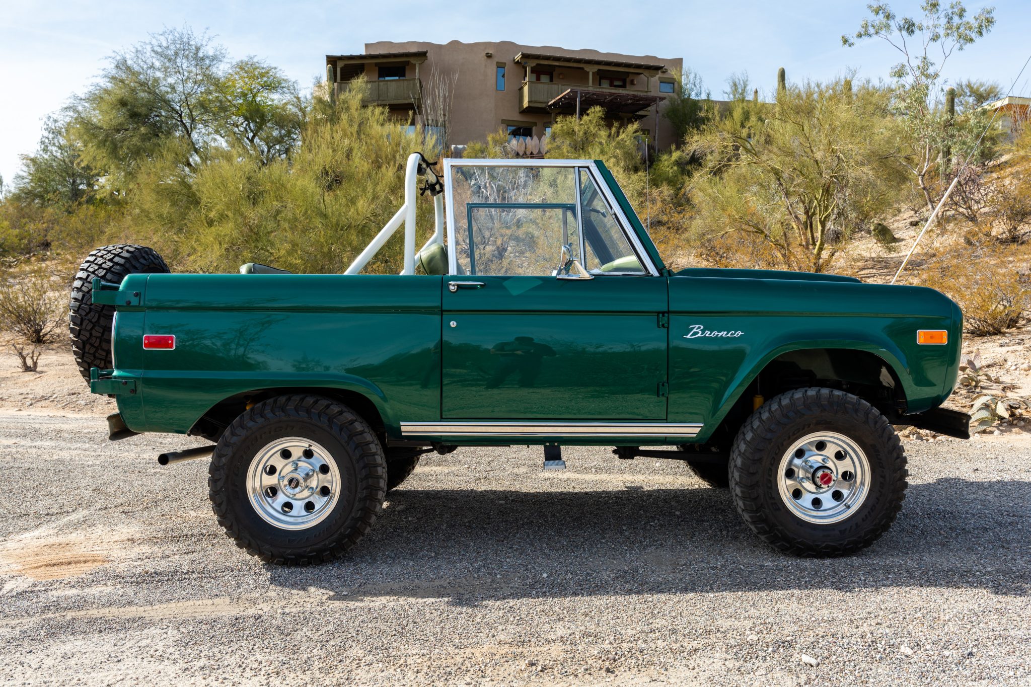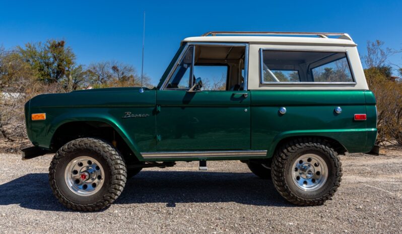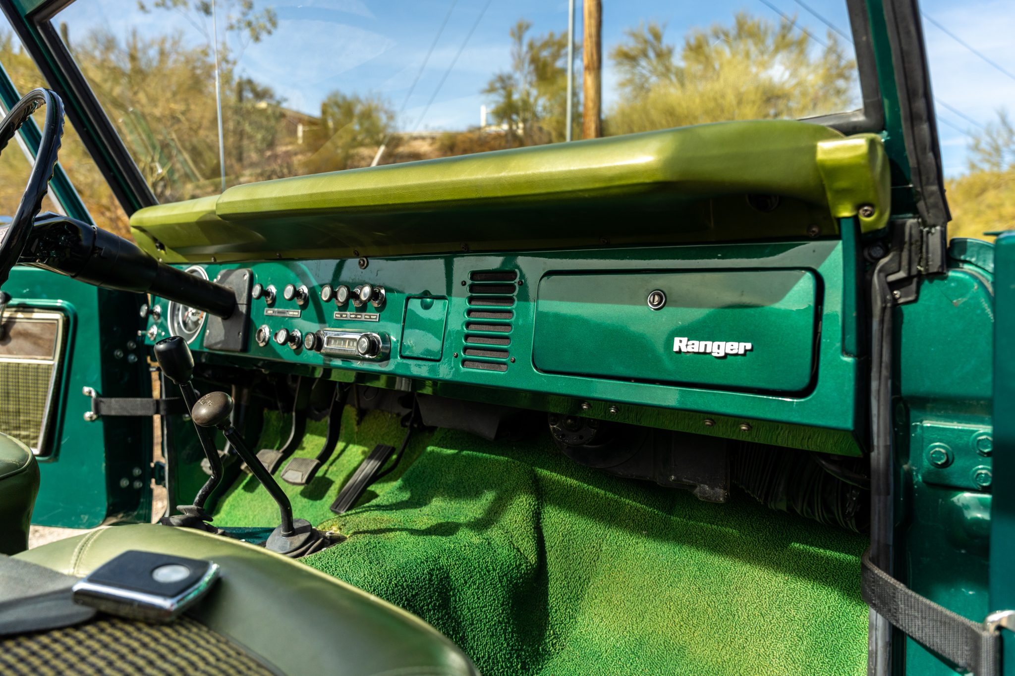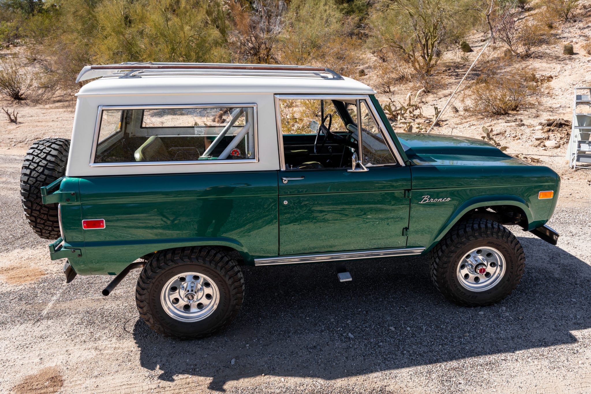 This 1975 Ford Bronco Ranger was refurbished between 2022 and 2024. Work is said to have included installing a replacement tub, tailgate, hood, doors, and front fenders as well as overhauling the three-speed manual transmission, refinishing the frame, and replacing braking, suspension, power steering, and exhaust components. The truck rides on a 2″ body lift and 15″ American Racing wheels with 31×10.5″ BFGoodrich Mud-Terrain T/A KM3 tires, and power is from a 302ci V8. It is finished in Dark Jade Metallic with a white hardtop over green upholstery, and additional equipment includes a Dana 20 dual-range transfer case, locking front hubs, a roll bar, chrome bumpers, dual hood scoops, and locking center console.