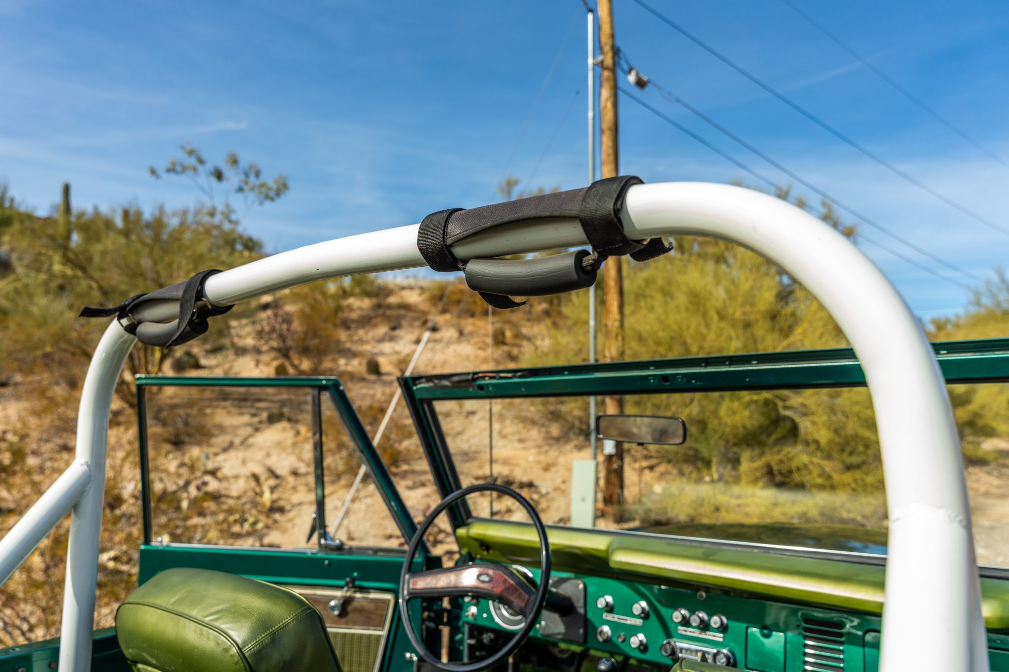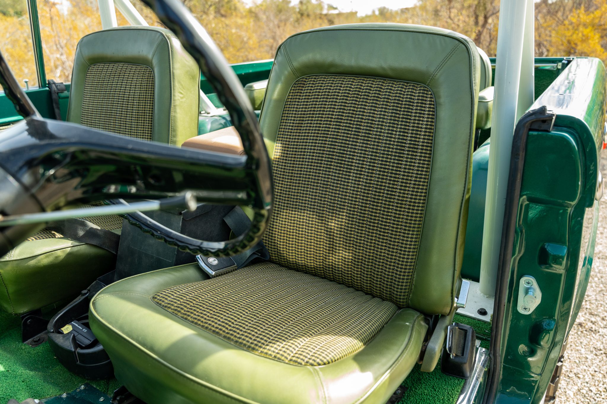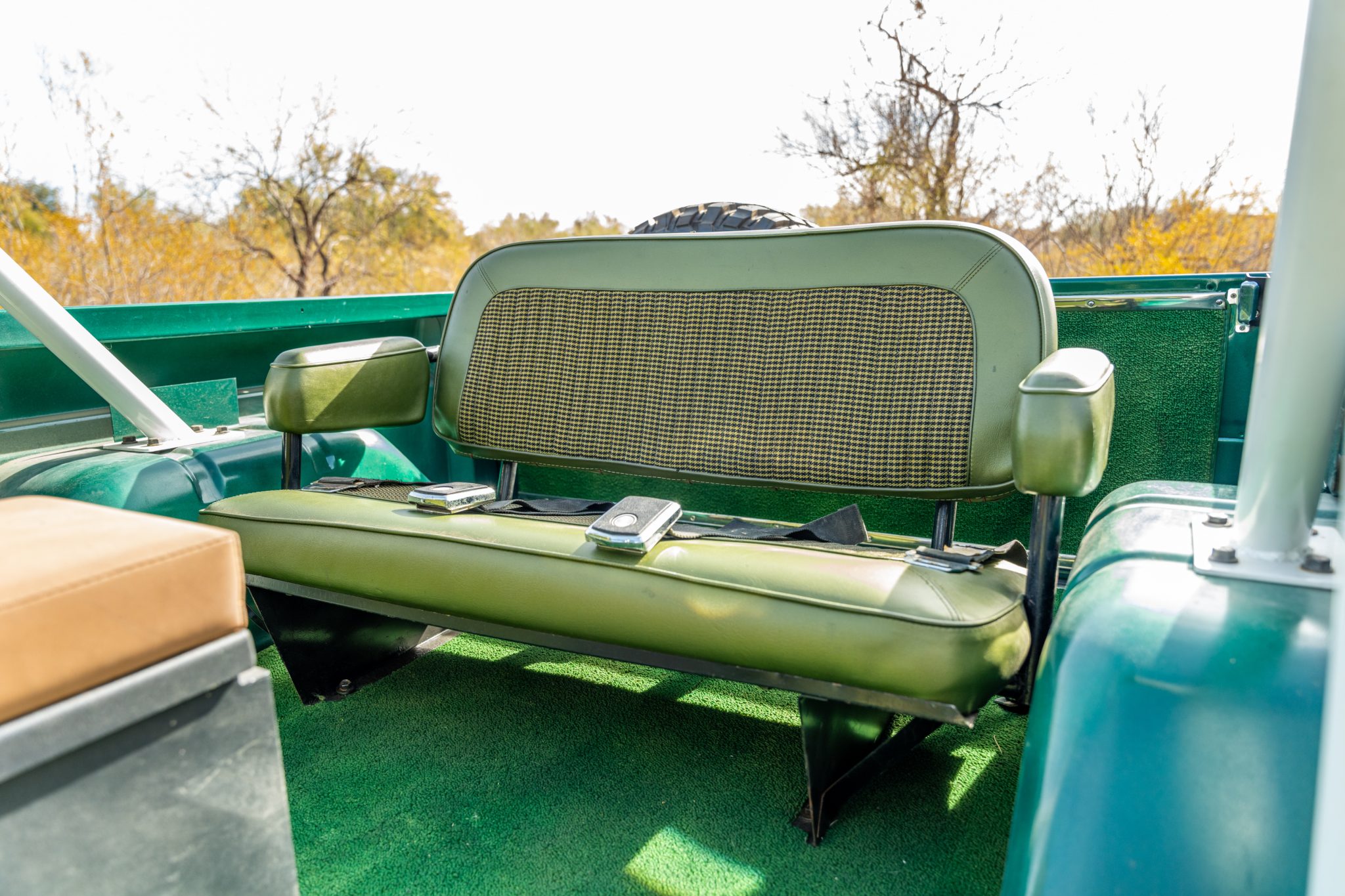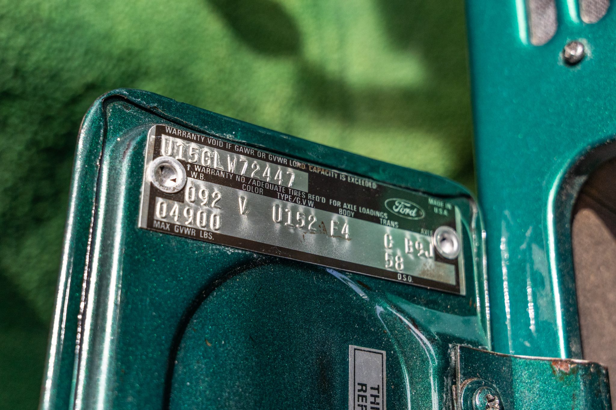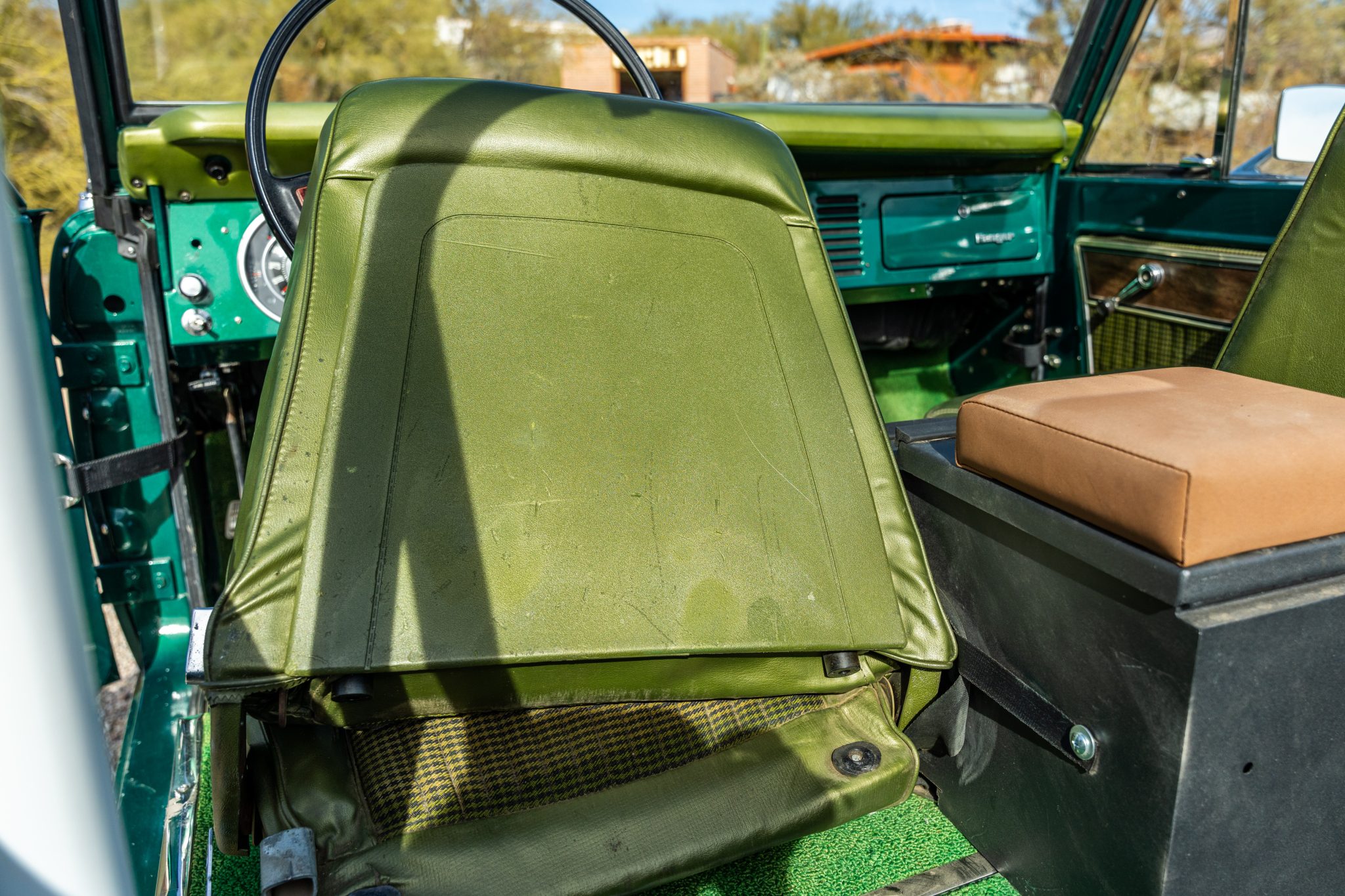 This 1975 Ford Bronco Ranger was refurbished between 2022 and 2024. Work is said to have included installing a replacement tub, tailgate, hood, doors, and front fenders as well as overhauling the three-speed manual transmission, refinishing the frame, and replacing braking, suspension, power steering, and exhaust components. The truck rides on a 2″ body lift and 15″ American Racing wheels with 31×10.5″ BFGoodrich Mud-Terrain T/A KM3 tires, and power is from a 302ci V8. It is finished in Dark Jade Metallic with a white hardtop over green upholstery, and additional equipment includes a Dana 20 dual-range transfer case, locking front hubs, a roll bar, chrome bumpers, dual hood scoops, and locking center console.