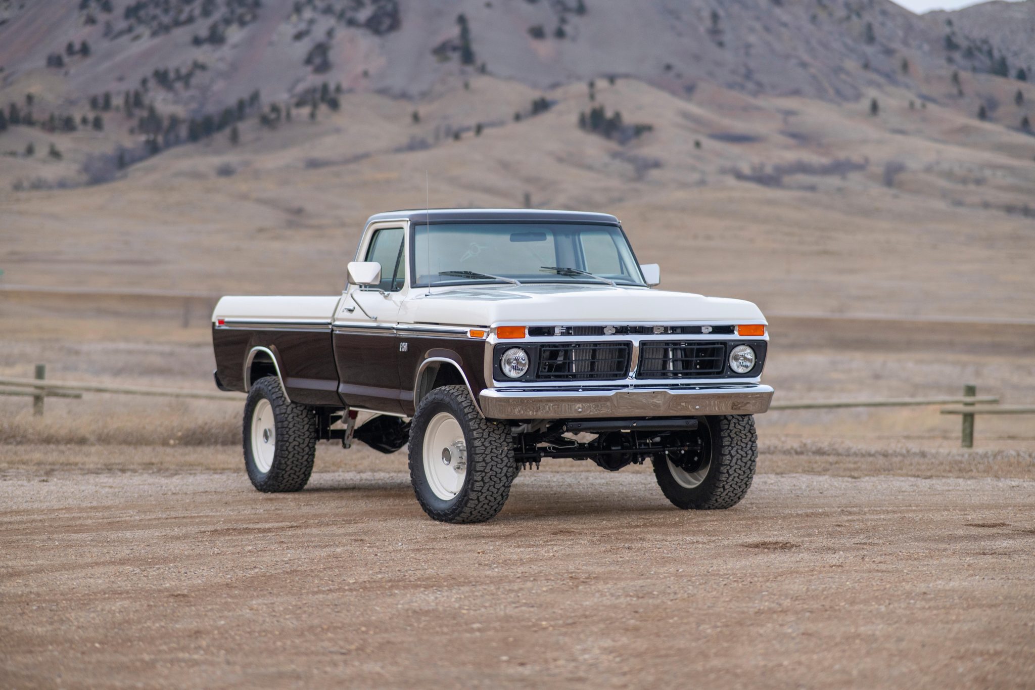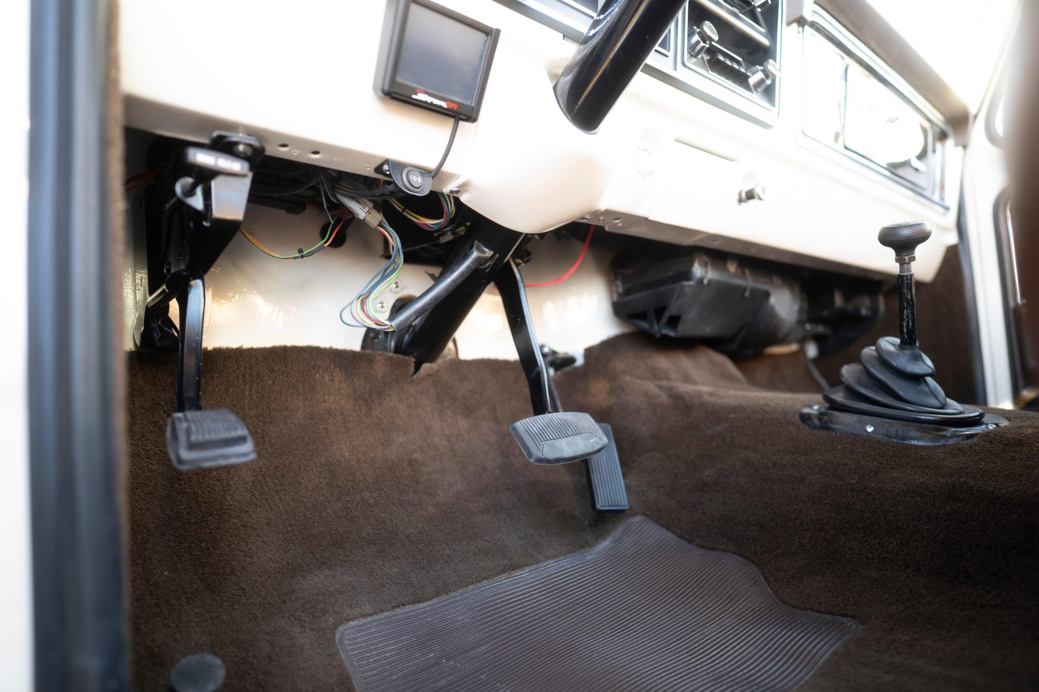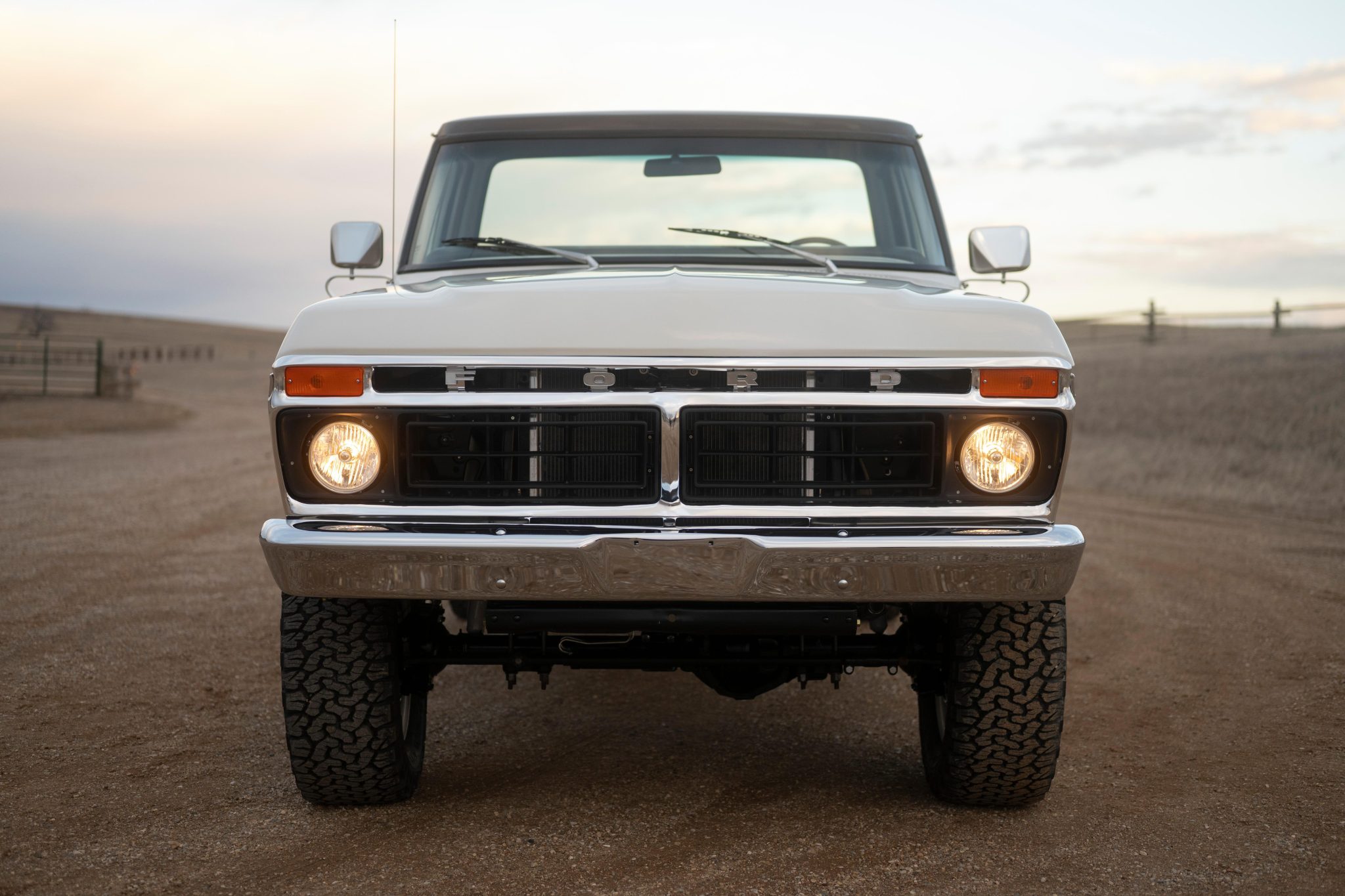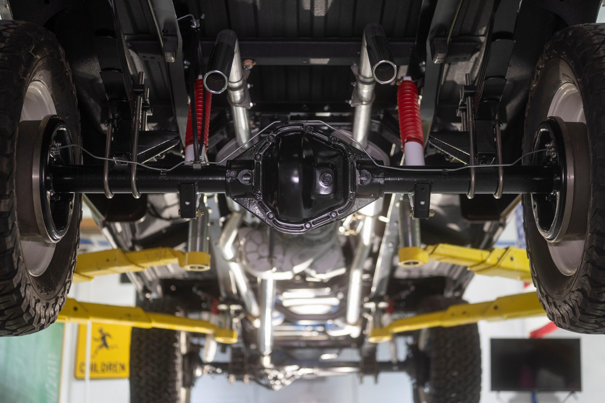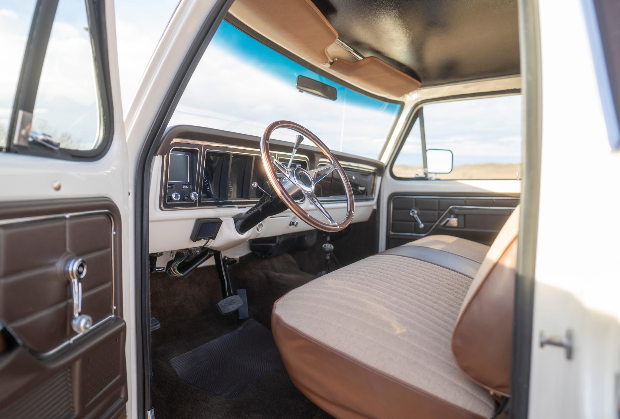 Work involved repainting the body in Hot Chocolate and White Frost, reupholstering the brown and beige bench seat, overhauling the brakes and the suspension, and rebuilding the 390ci V8, the three-speed automatic transmission, and the differentials. Equipment includes a divorced dual-range transfer case, a Holley Sniper 2 electronic fuel injection system, a Painless Performance wiring harness, long-tube headers, 20″ steel wheels, Dakota Digital instruments, an aluminum radiator, and an AM radio. T