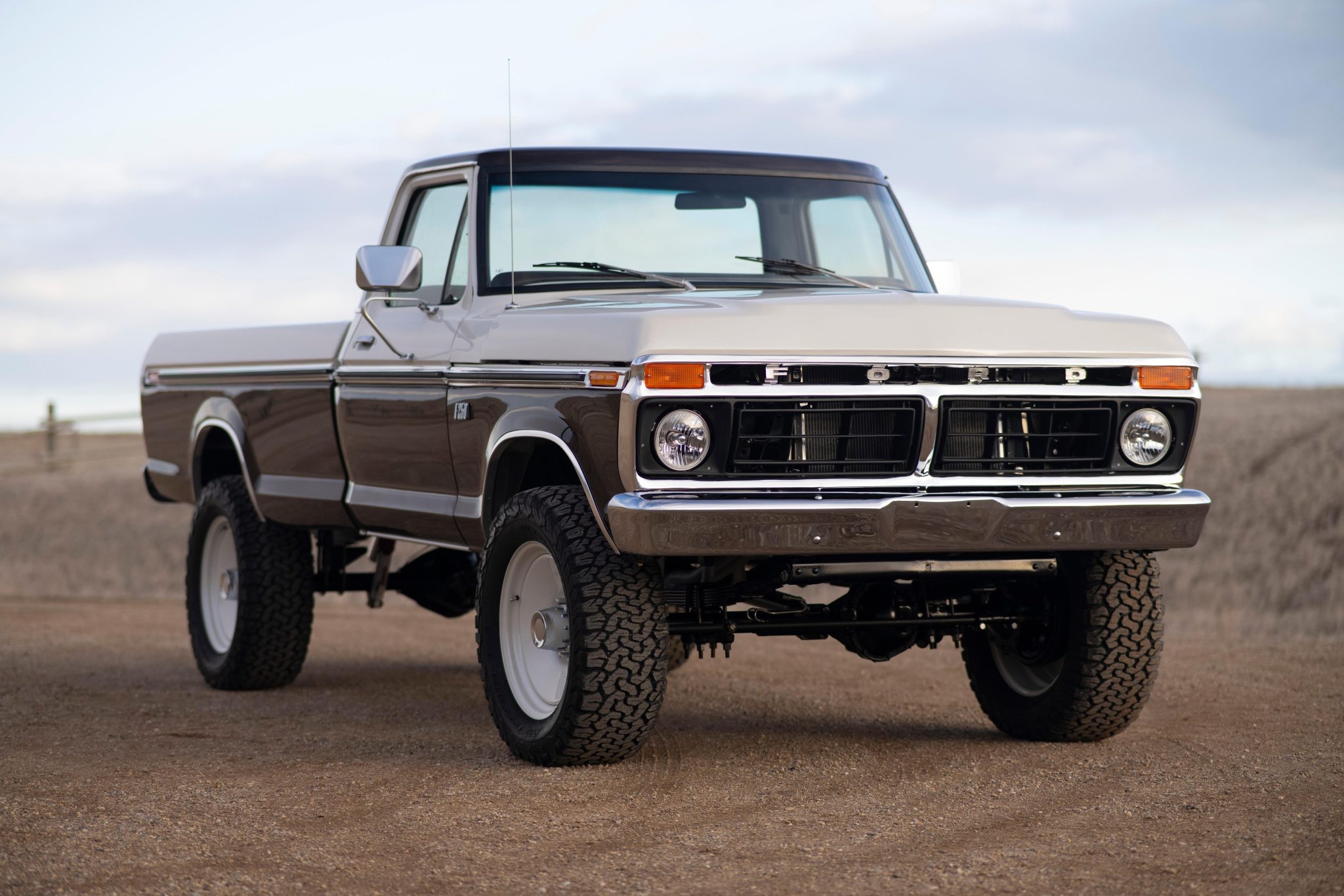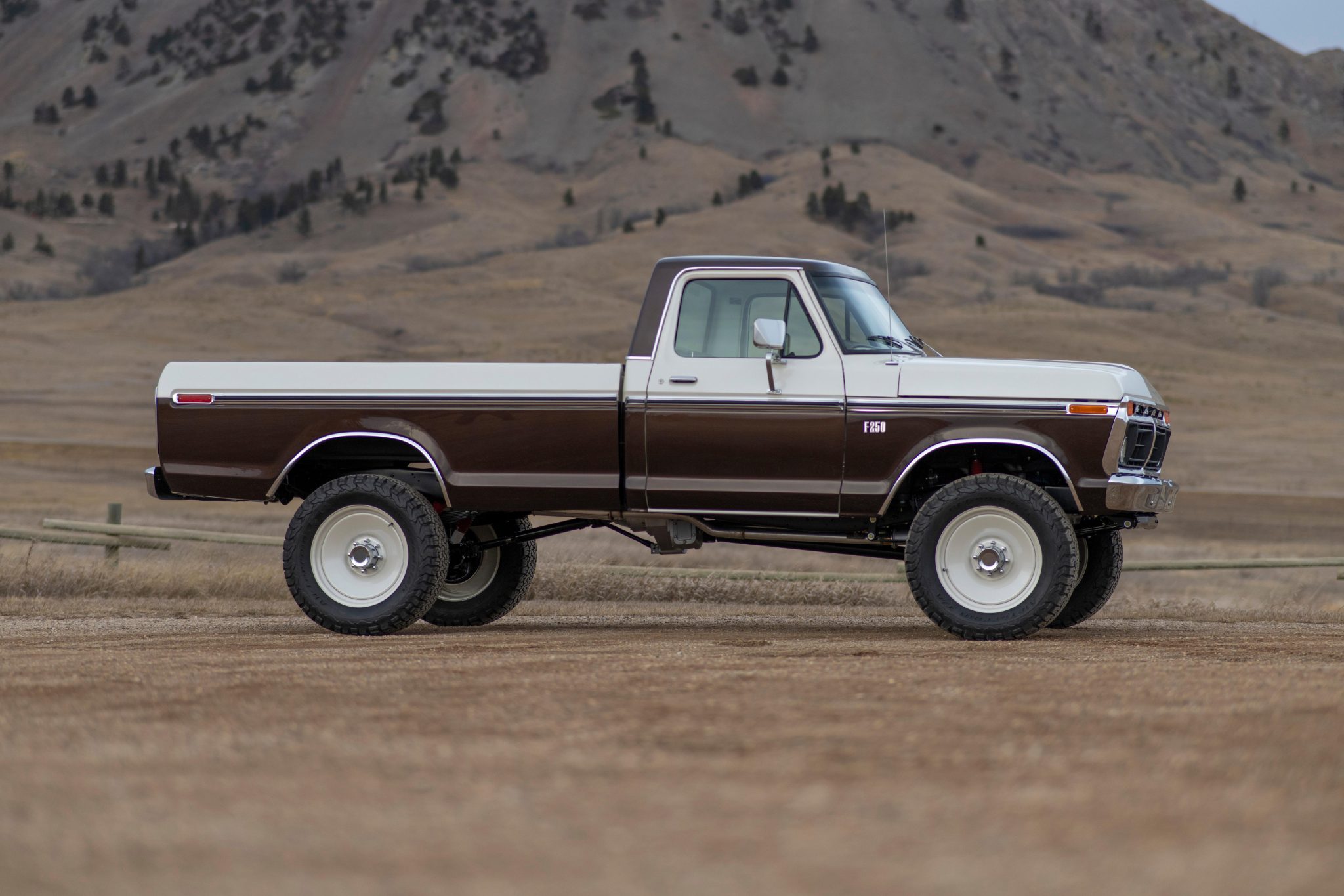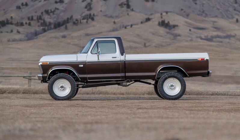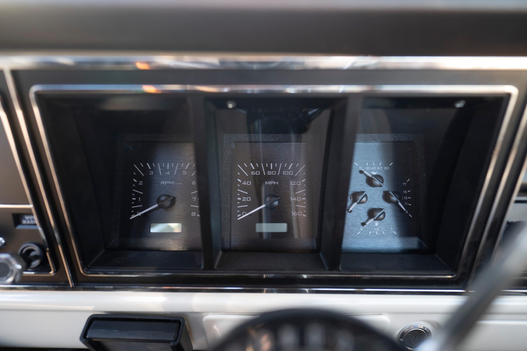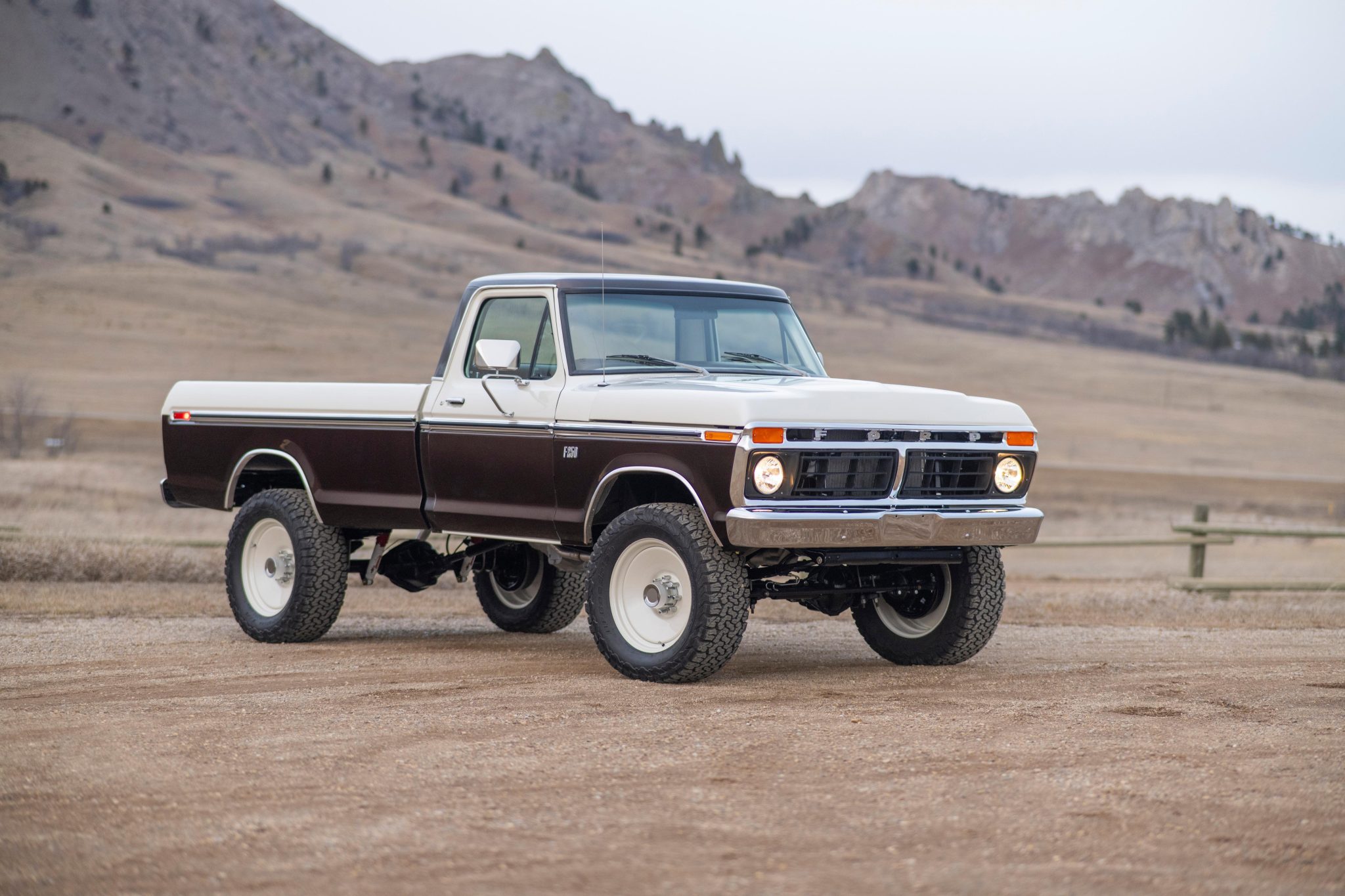Work involved repainting the body in Hot Chocolate and White Frost, reupholstering the brown and beige bench seat, overhauling the brakes and the suspension, and rebuilding the 390ci V8, the three-speed automatic transmission, and the differentials. Equipment includes a divorced dual-range transfer case, a Holley Sniper 2 electronic fuel injection system, a Painless Performance wiring harness, long-tube headers, 20″ steel wheels, Dakota Digital instruments, an aluminum radiator, and an AM radio. T