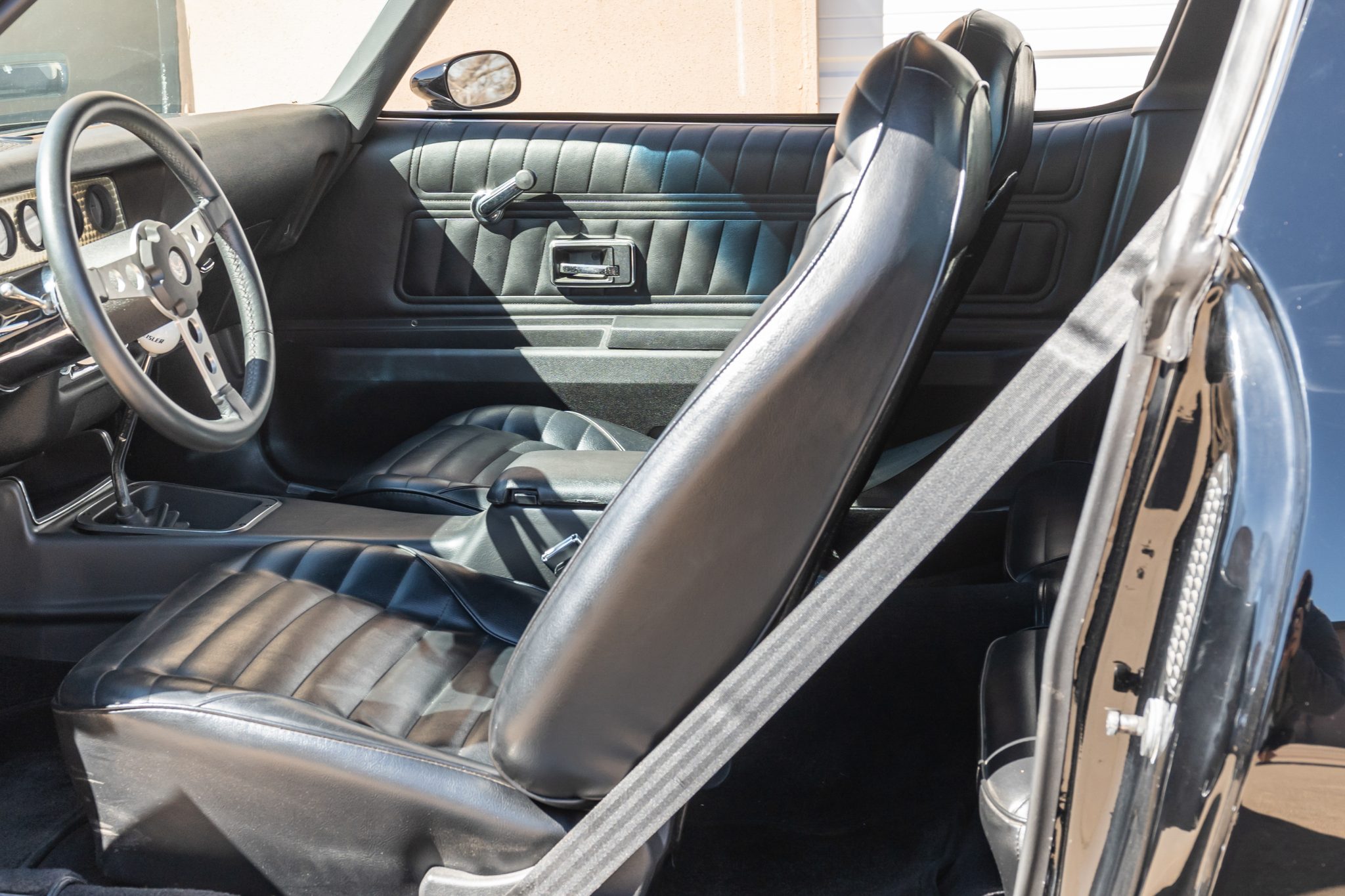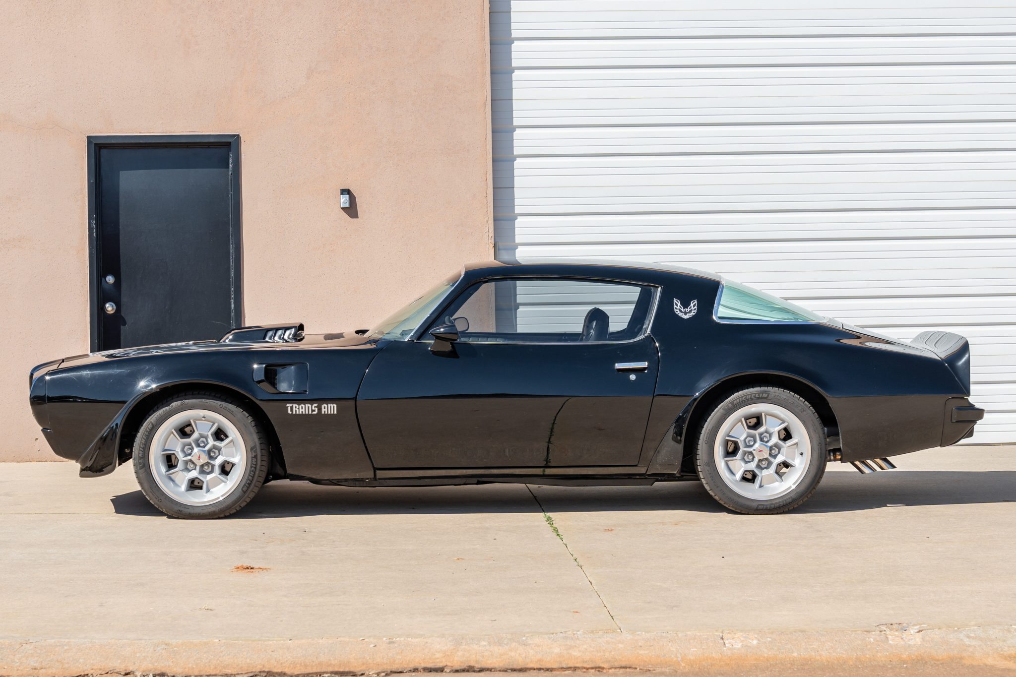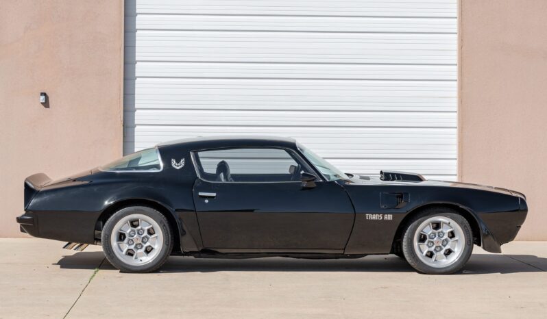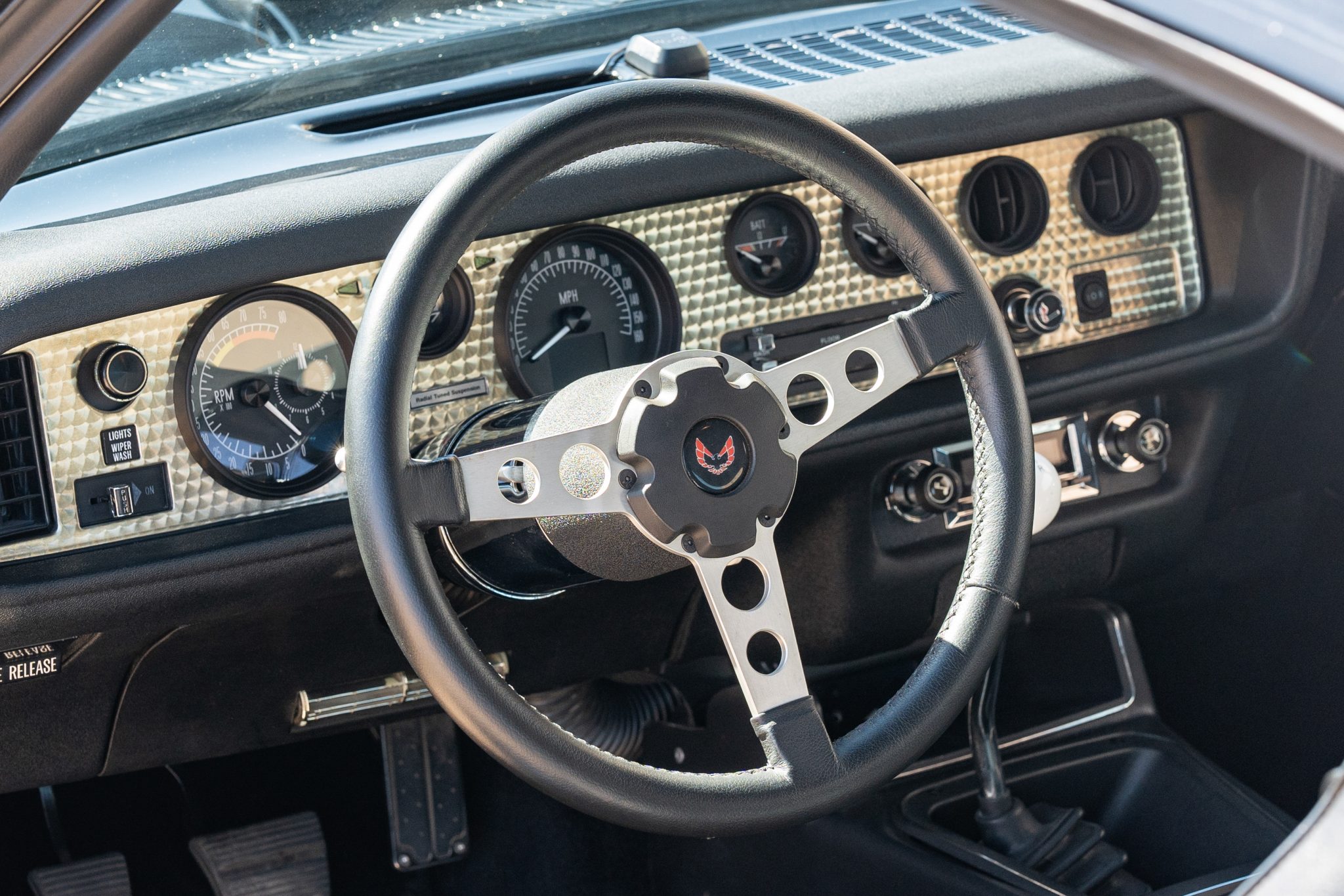 This 1975 Pontiac Firebird Trans Am was subsequent service included mounting a 17″ honeycomb-style wheel and tire package, resealing the transmission, differential, and intake manifold, installing Dakota Digital RTX gauges, repainting the spoilers, and replacing the headers, exhaust system, and air cleaner assembly. It is powered by a 383ci V8 linked with a Keisler five-speed manual transmission and a 9″ rear end, and the car rides on a Heidts independent front suspension, a four-link rear setup, and Ridetech coilovers. Equipment includes honeycomb-style wheels, Wilwood disc brakes, and backdated bodywork. The cabin is trimmed in black vinyl and features Vintage Air climate control, a center console, a Formula-style steering wheel, and a RetroSound Bluetooth receiver.