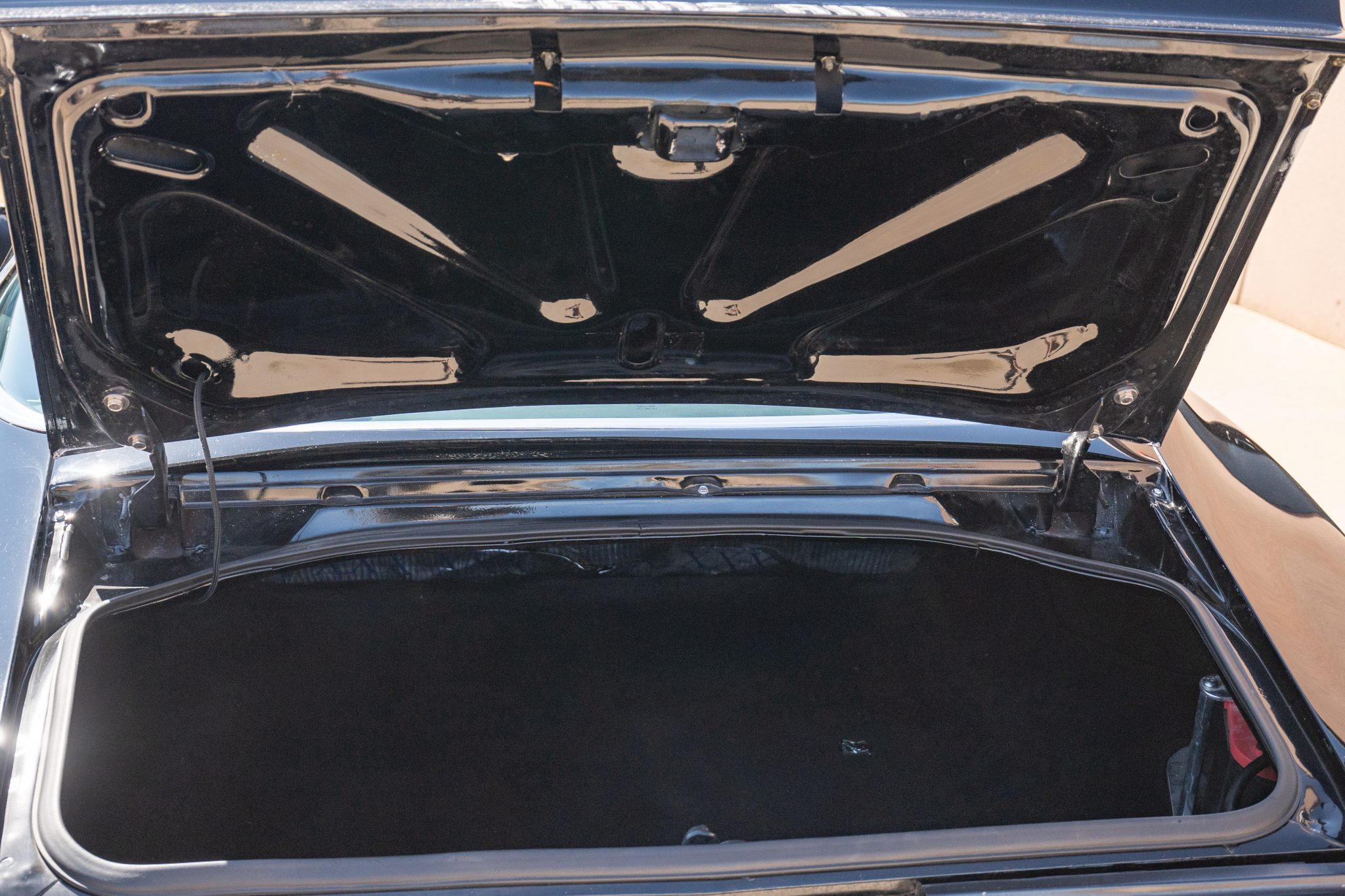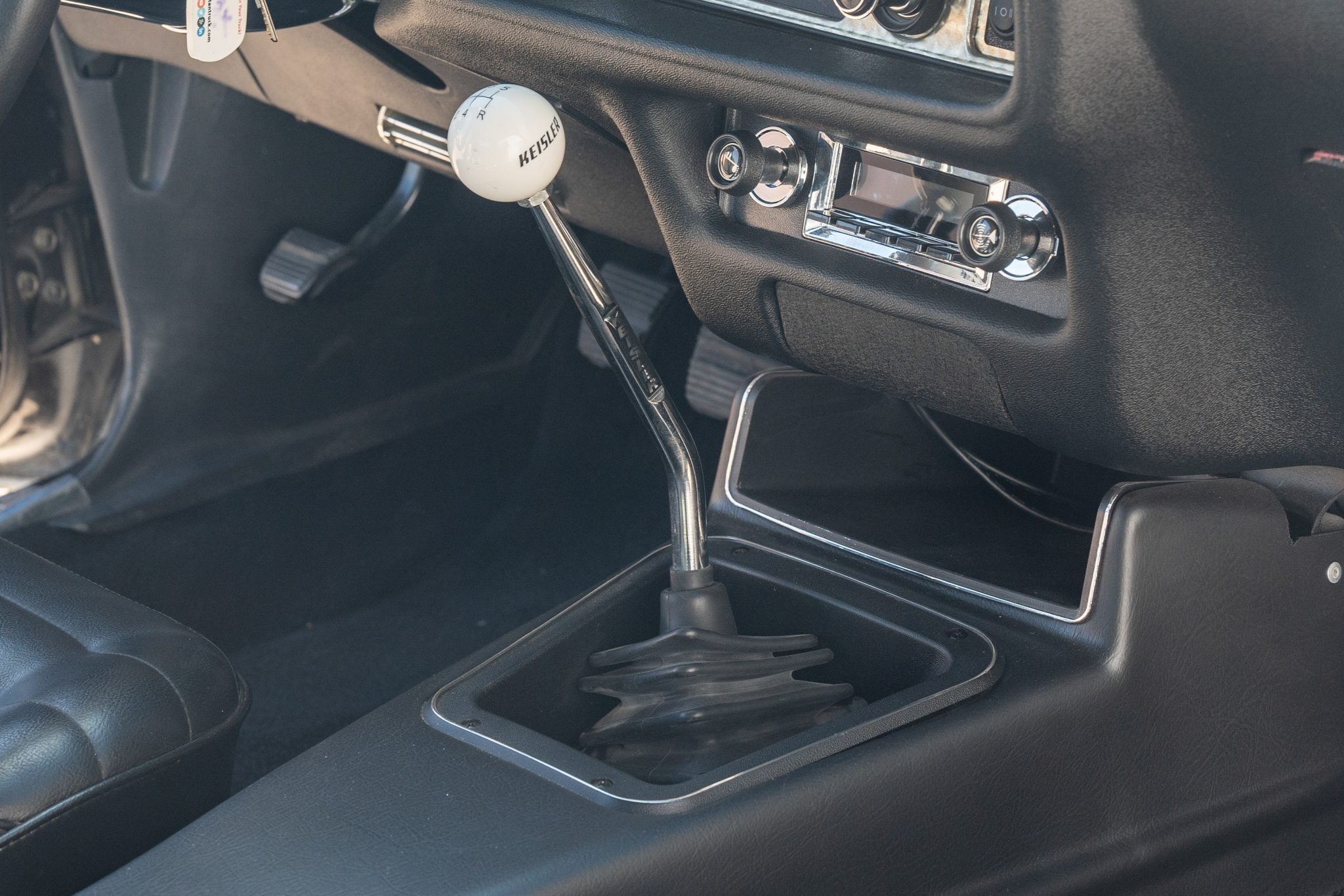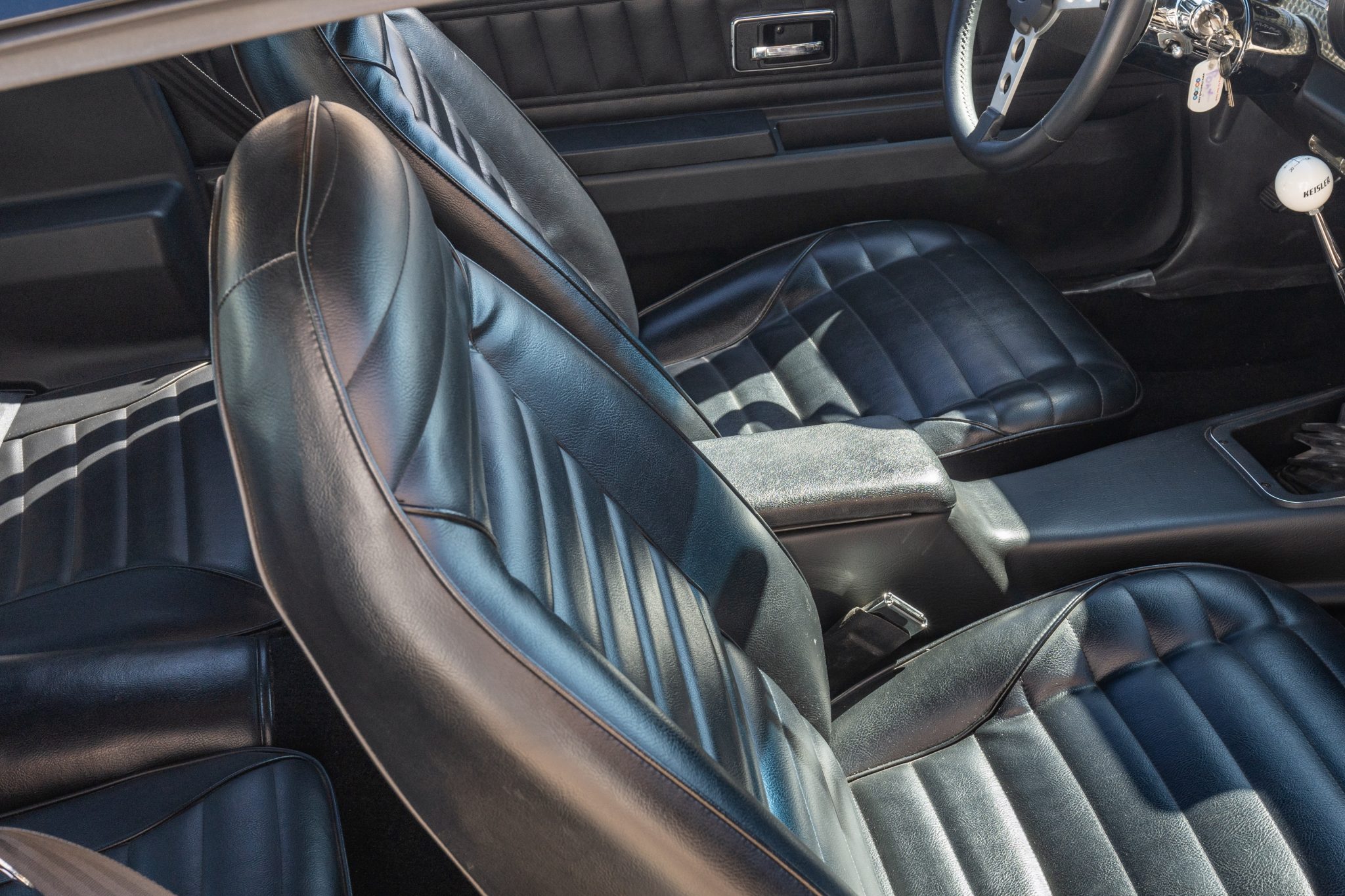 This 1975 Pontiac Firebird Trans Am was subsequent service included mounting a 17″ honeycomb-style wheel and tire package, resealing the transmission, differential, and intake manifold, installing Dakota Digital RTX gauges, repainting the spoilers, and replacing the headers, exhaust system, and air cleaner assembly. It is powered by a 383ci V8 linked with a Keisler five-speed manual transmission and a 9″ rear end, and the car rides on a Heidts independent front suspension, a four-link rear setup, and Ridetech coilovers. Equipment includes honeycomb-style wheels, Wilwood disc brakes, and backdated bodywork. The cabin is trimmed in black vinyl and features Vintage Air climate control, a center console, a Formula-style steering wheel, and a RetroSound Bluetooth receiver.