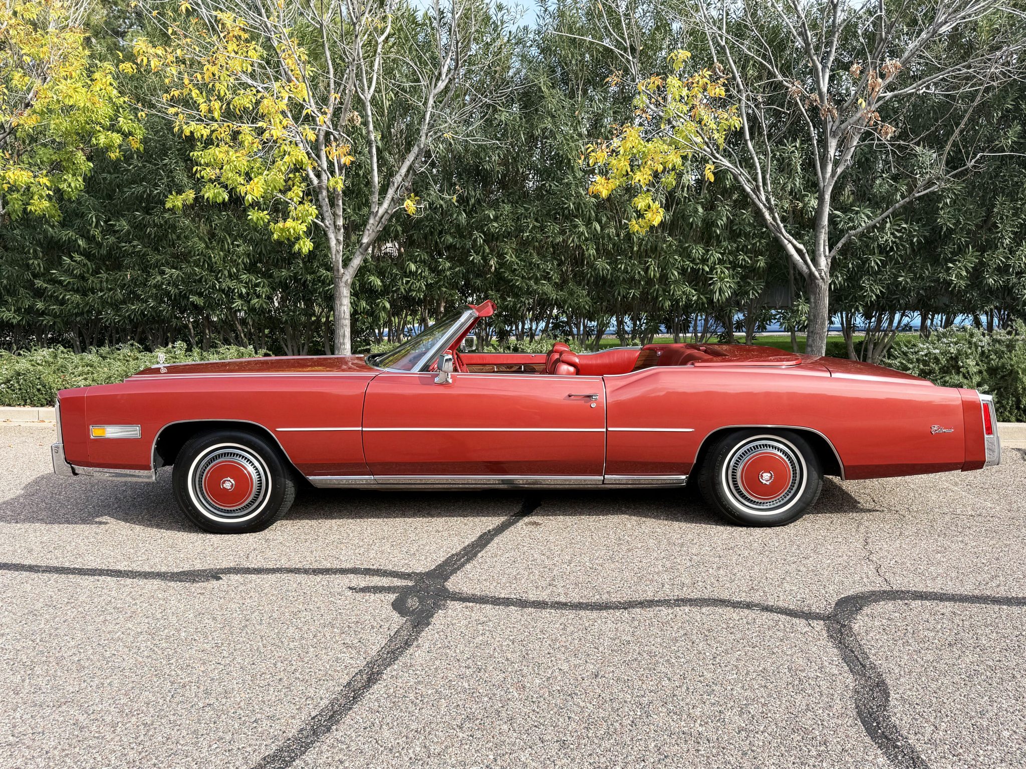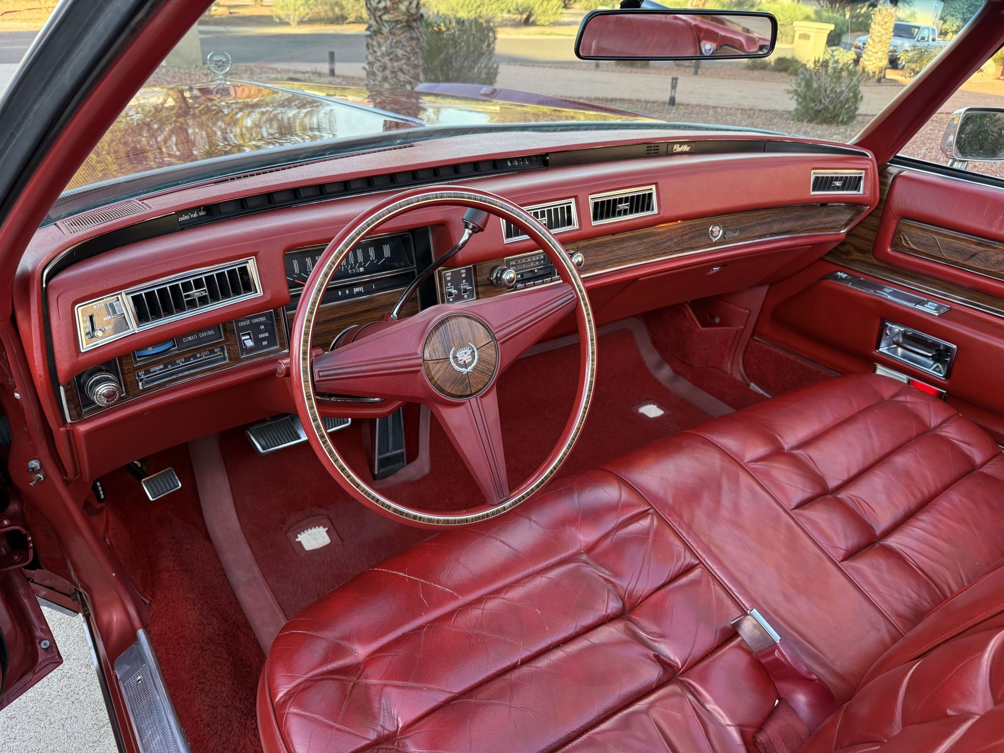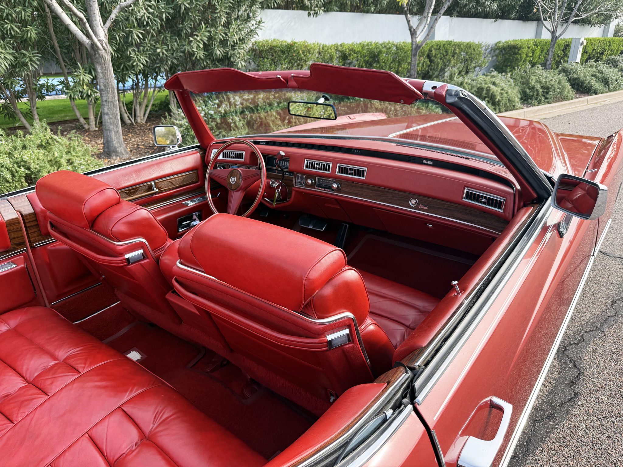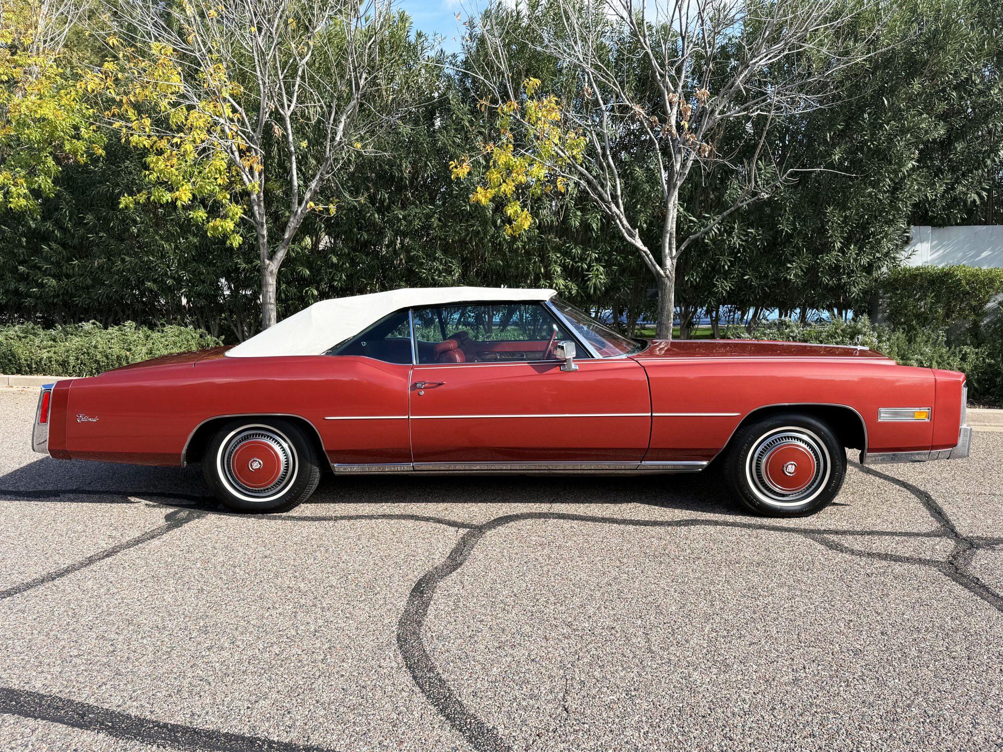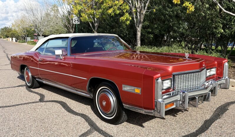 It is powered by a 500ci V8 paired with a three-speed automatic transmission and is finished in Firethorn Metallic over Antique Dark Firethorn Sierra Grain leather. Equipment includes a white convertible soft top, 15″ steel wheels, body-color wheel covers, four-wheel disc brakes, automatic climate control, cruise control, power windows, and a power-adjustable front bench.