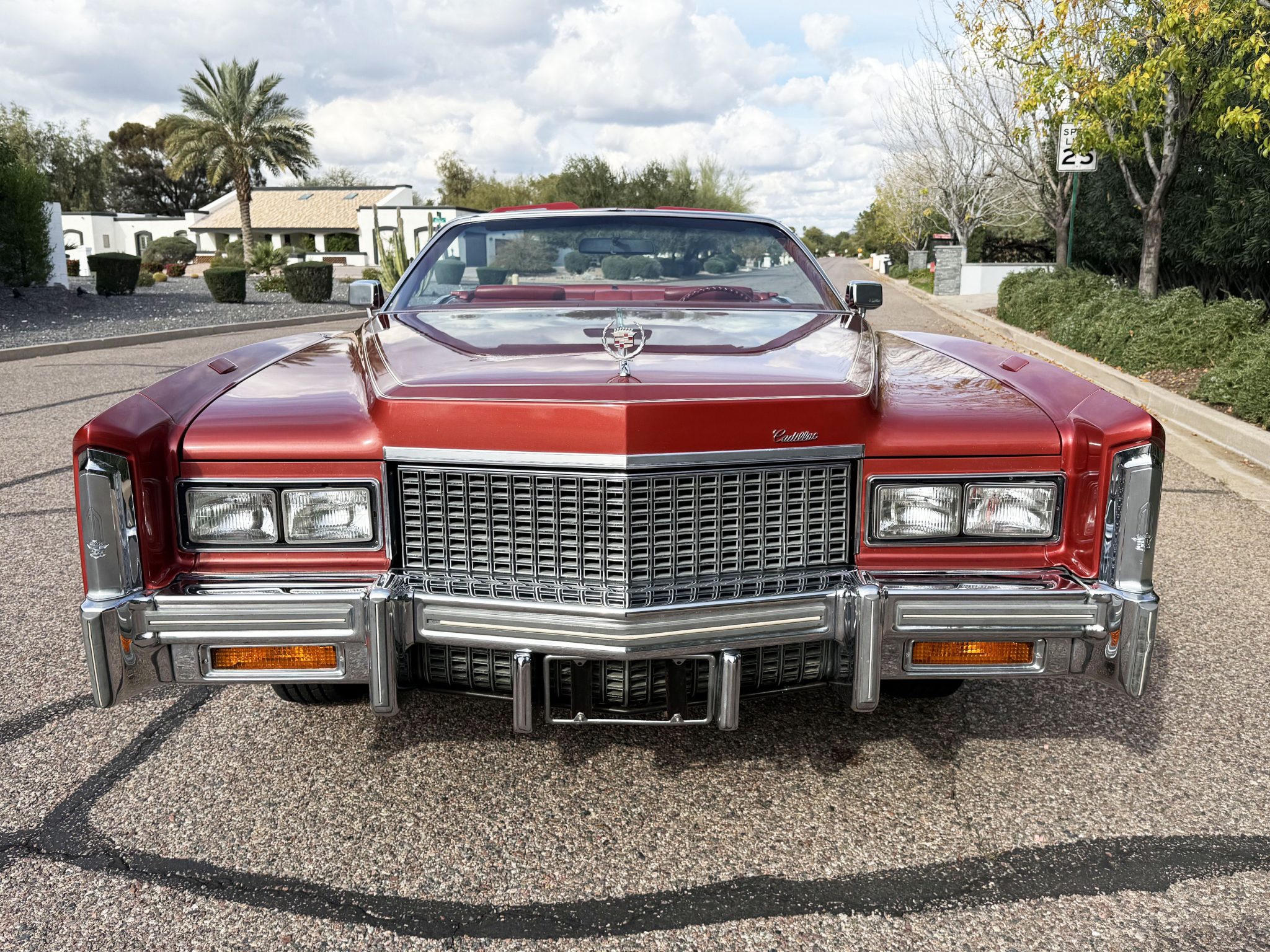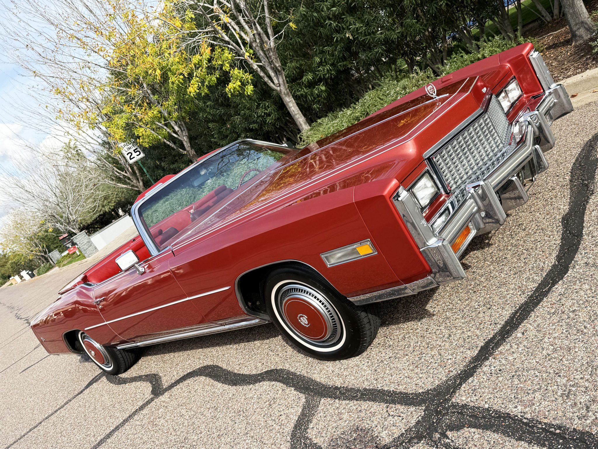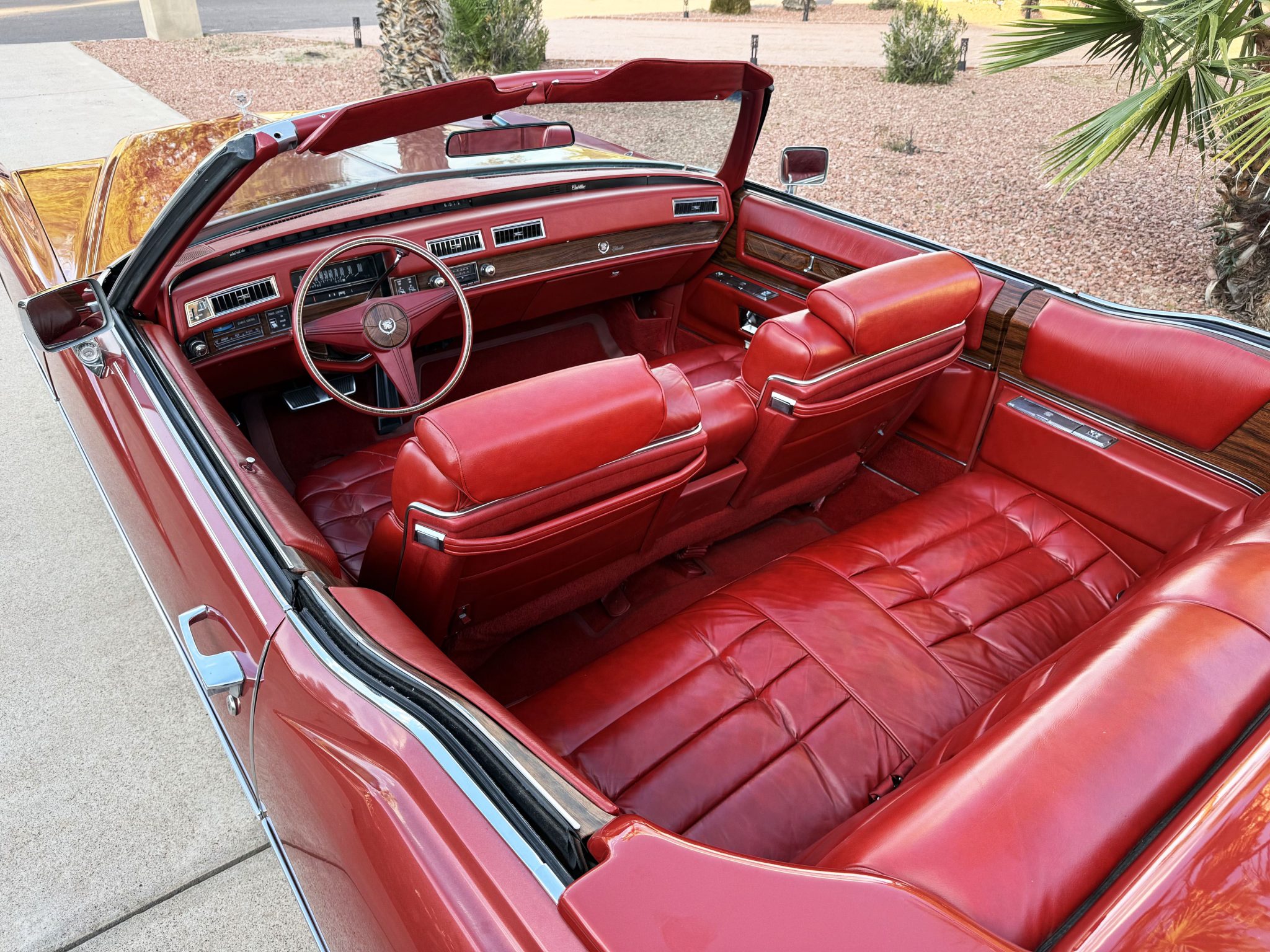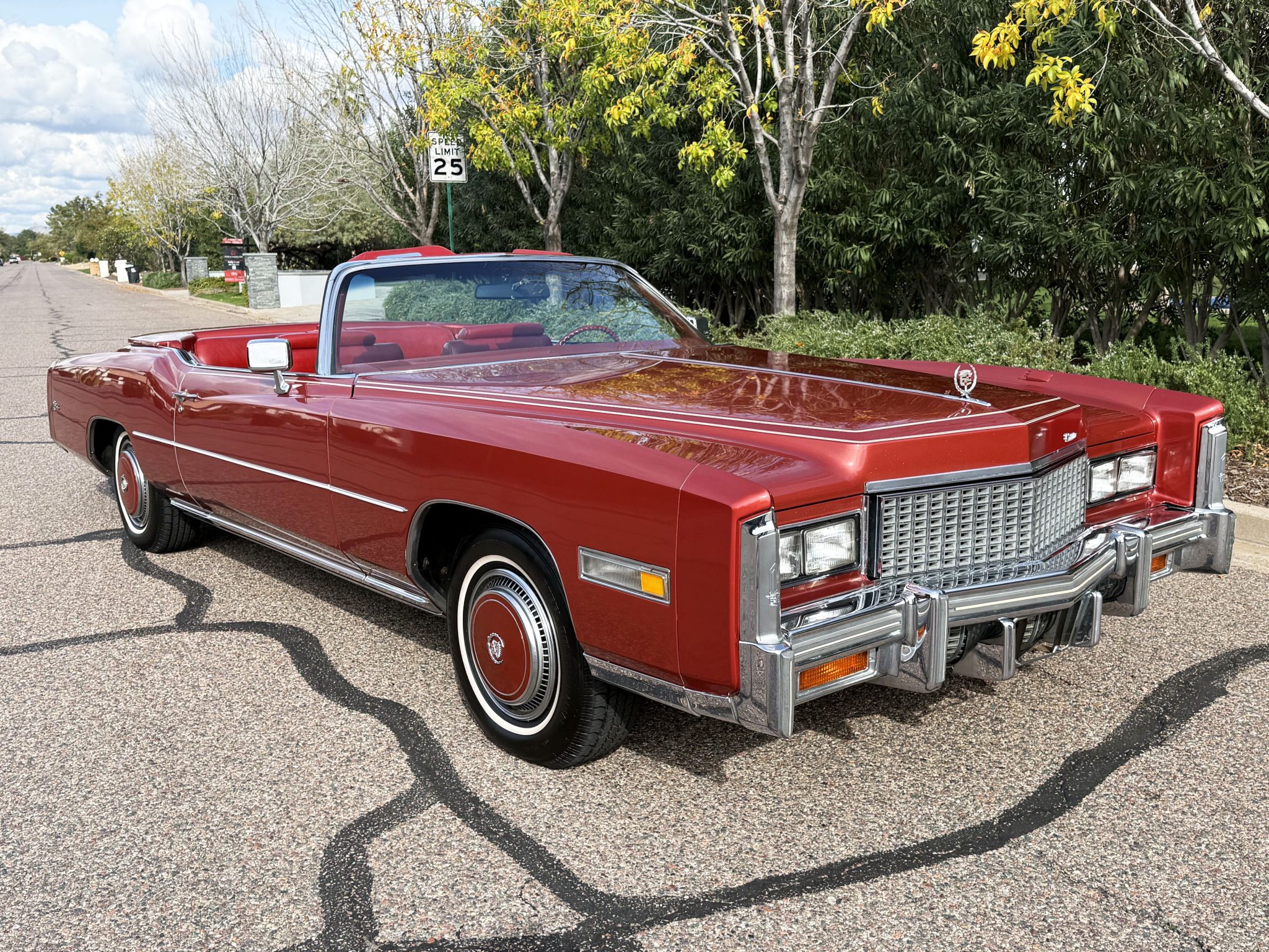 It is powered by a 500ci V8 paired with a three-speed automatic transmission and is finished in Firethorn Metallic over Antique Dark Firethorn Sierra Grain leather. Equipment includes a white convertible soft top, 15″ steel wheels, body-color wheel covers, four-wheel disc brakes, automatic climate control, cruise control, power windows, and a power-adjustable front bench.