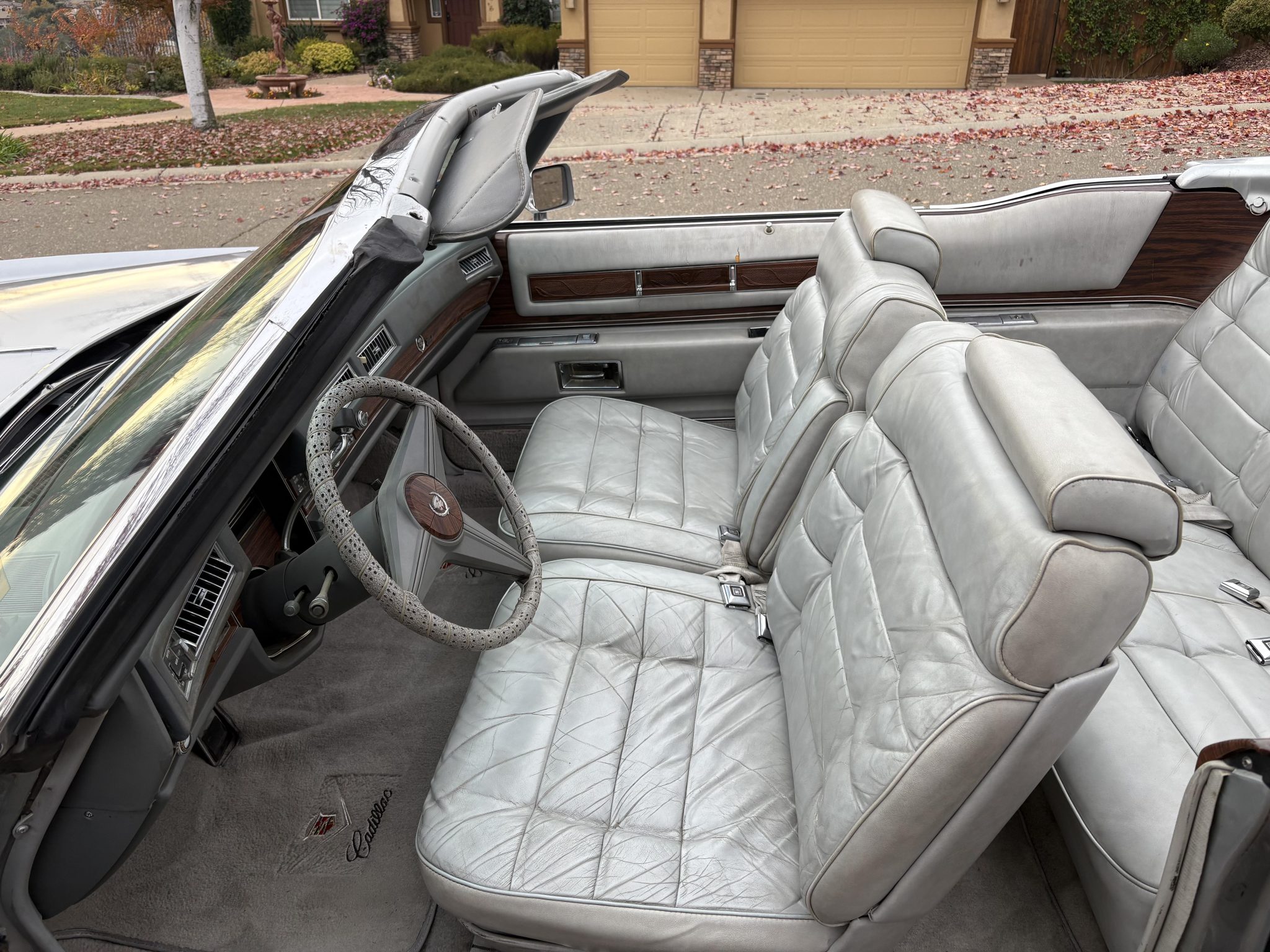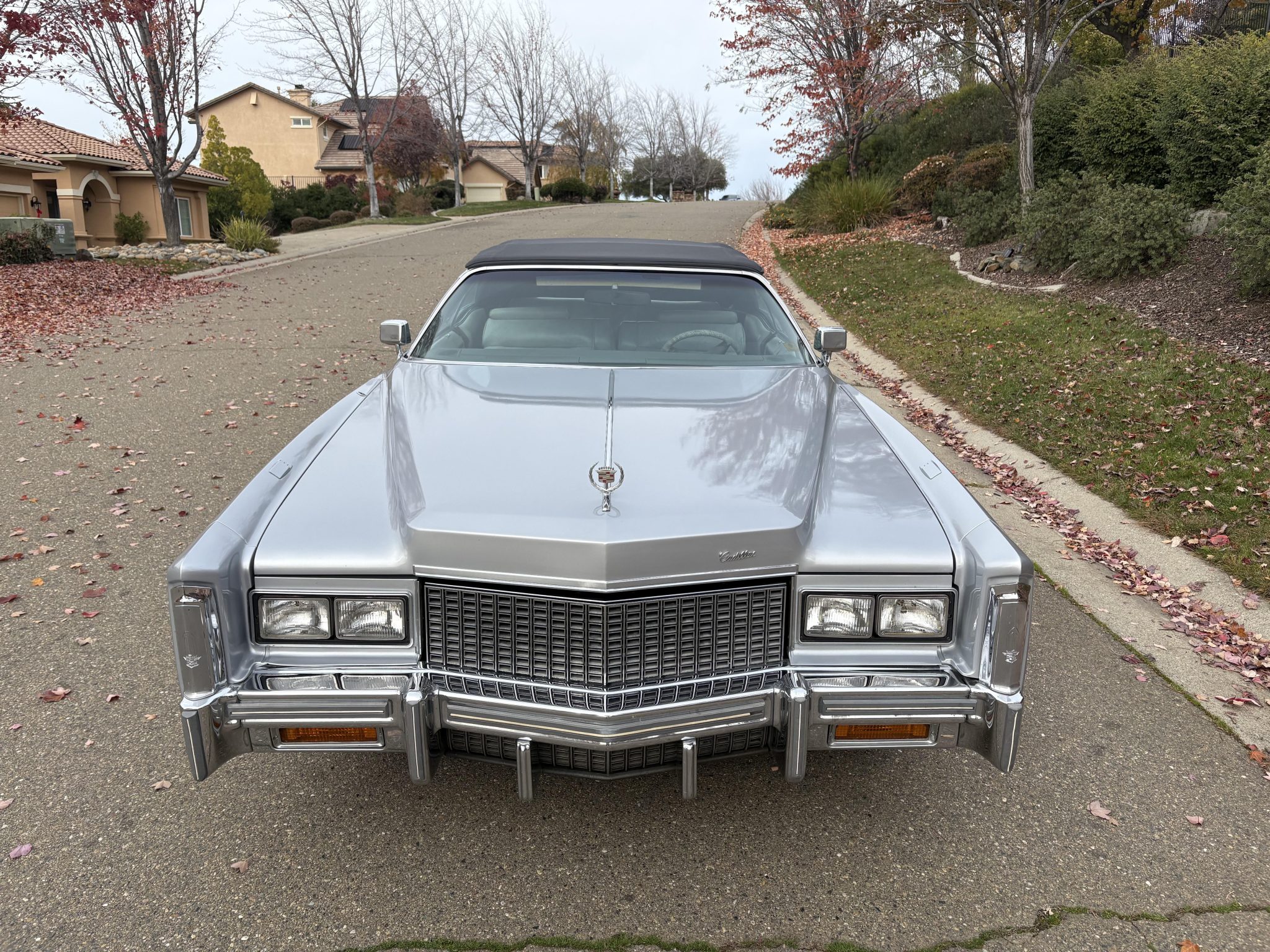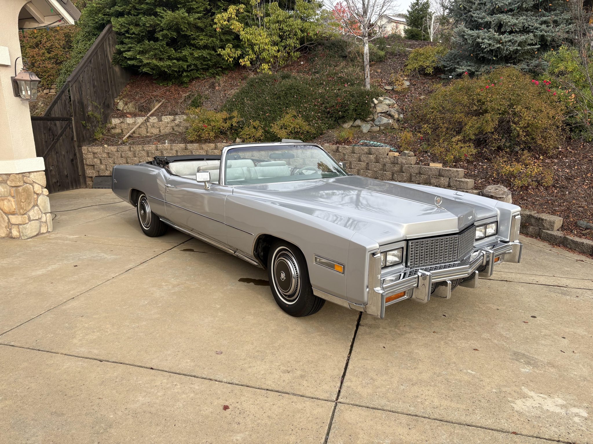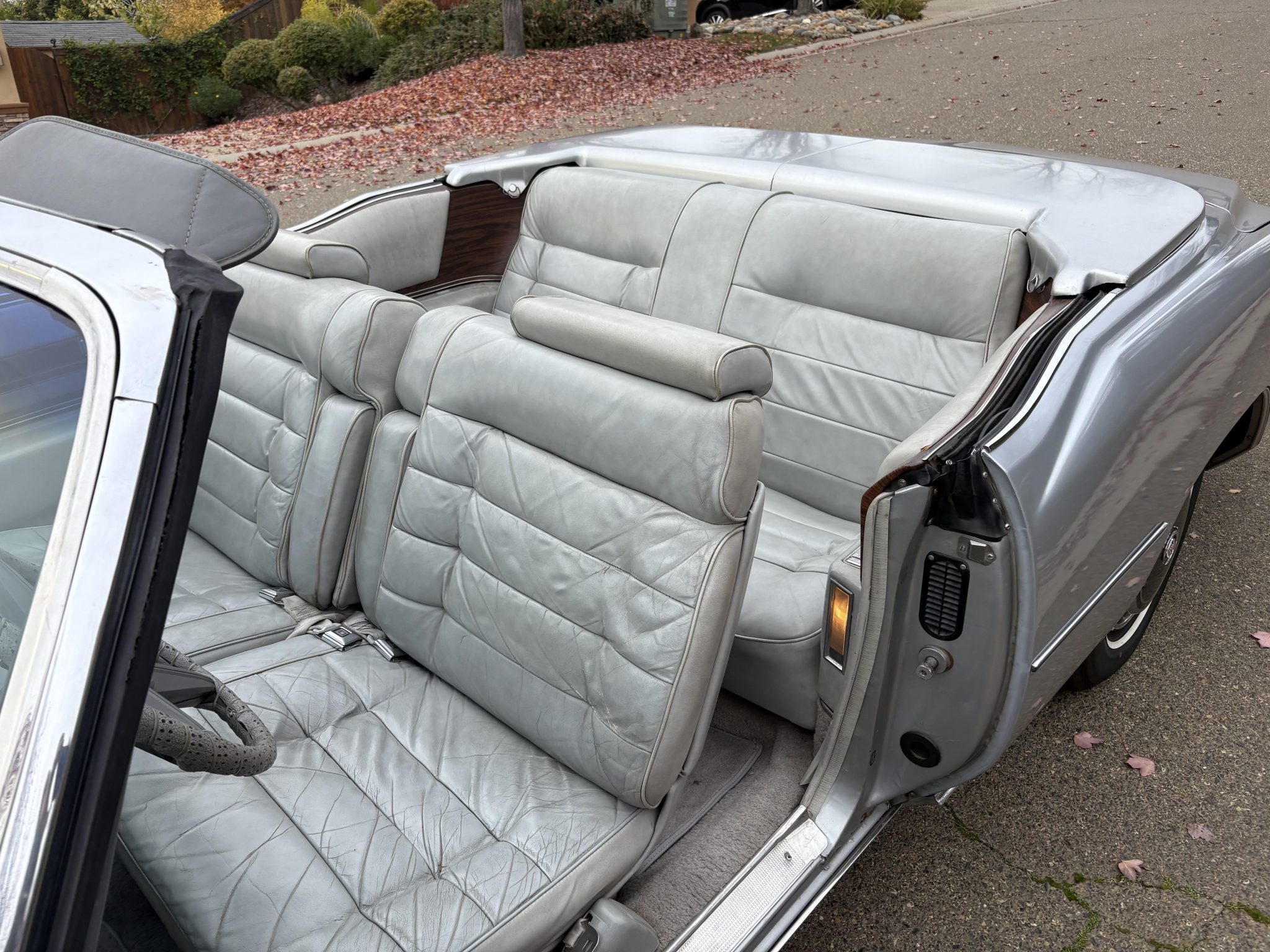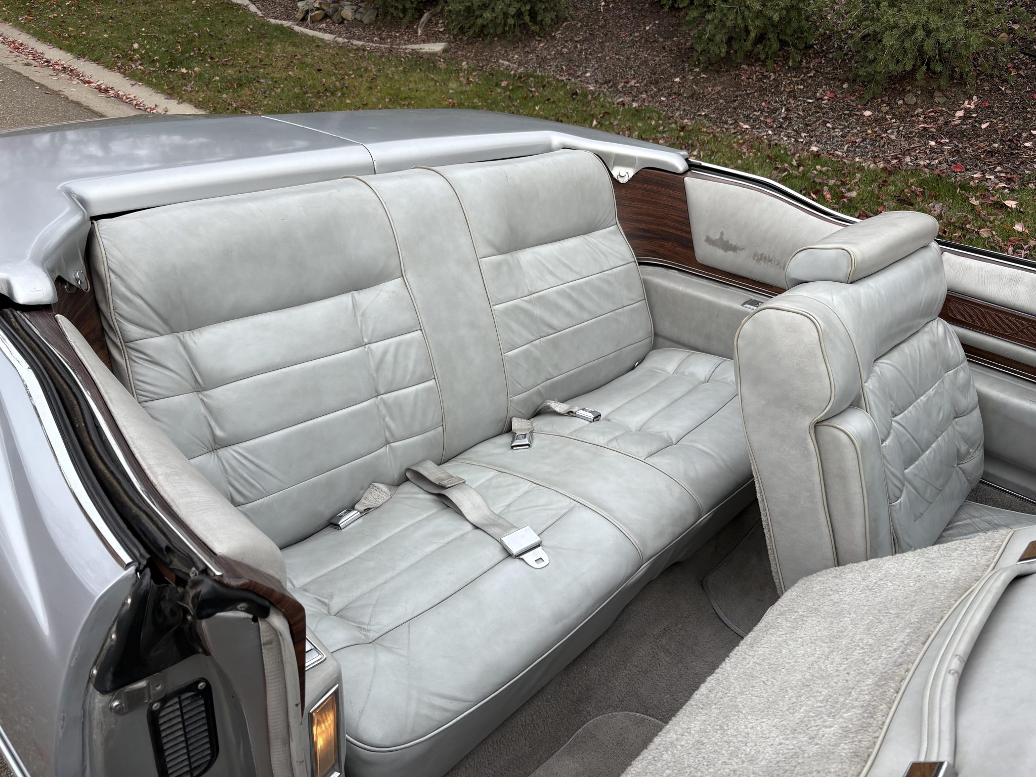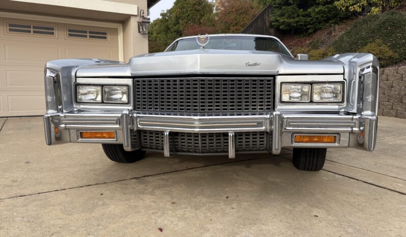 Recent work consisted of repainting the body, installing four tires, and replacing the exhaust system, catalytic converter, fuel pump, fuel hoses, carburetor float, and brakes. It is powered by a 500ci V8 paired with a three-speed automatic transmission and is finished in silver over Antique Light Smoke Gray Sierra Grain leather. Features include a black convertible soft top, 15″ steel wheels, black wheel covers, four-wheel disc brakes, and a retro-style digital stereo with Bluetooth connectivity as well as a rear window defroster, an illuminated thermometer, automatic climate control, cruise control, power windows, and power-adjustable front seats.