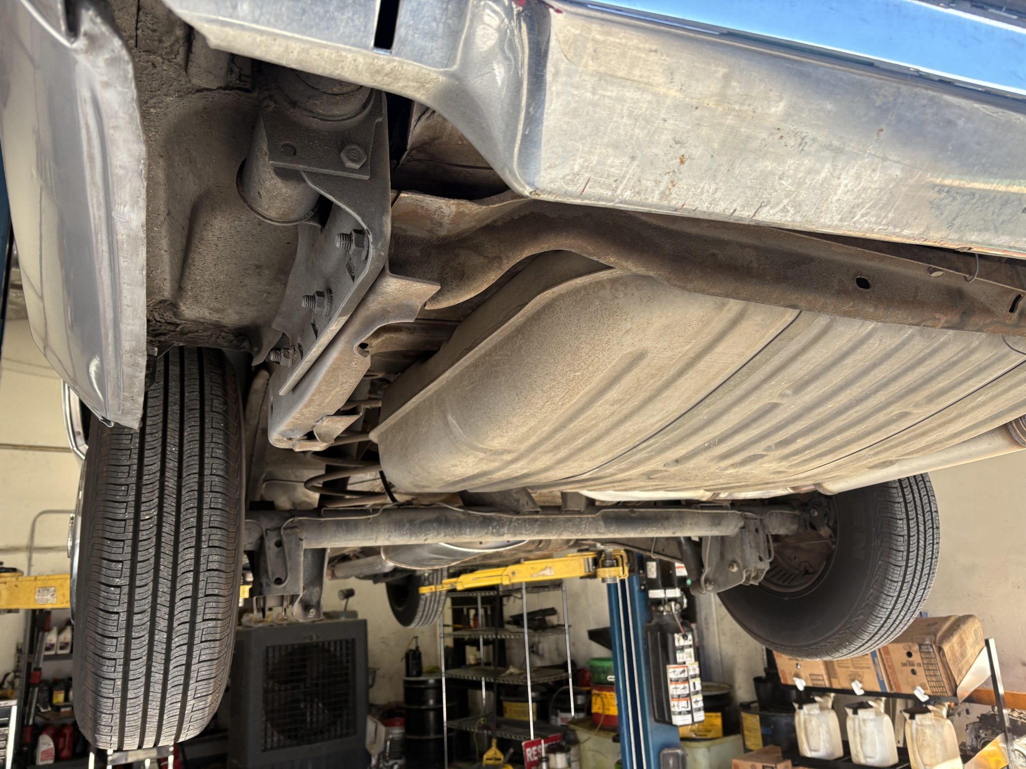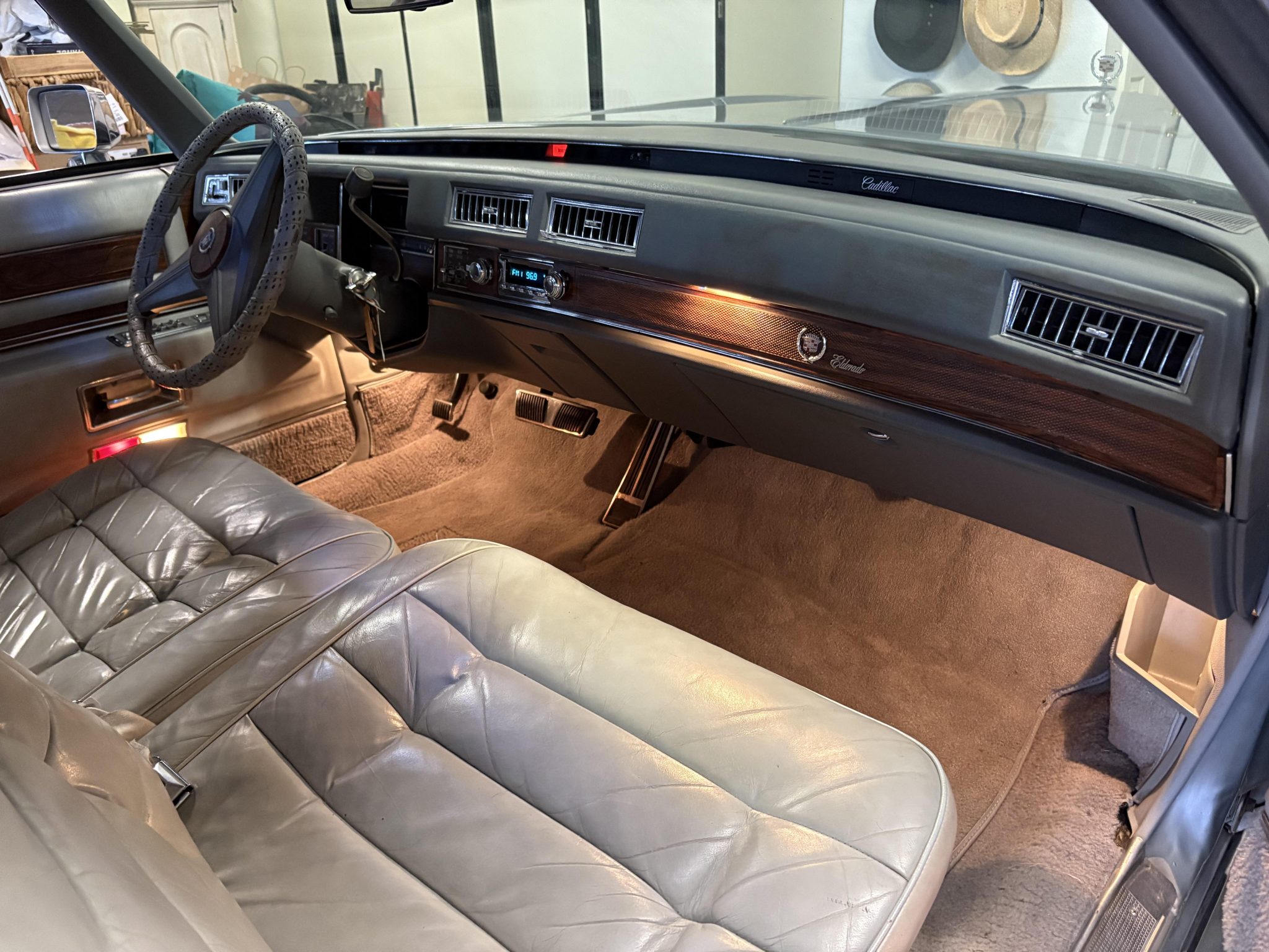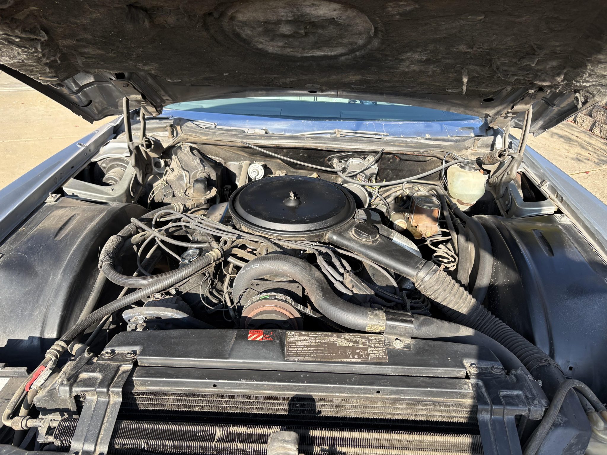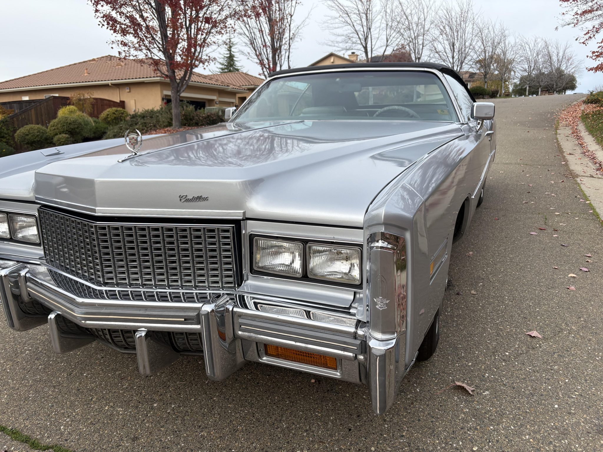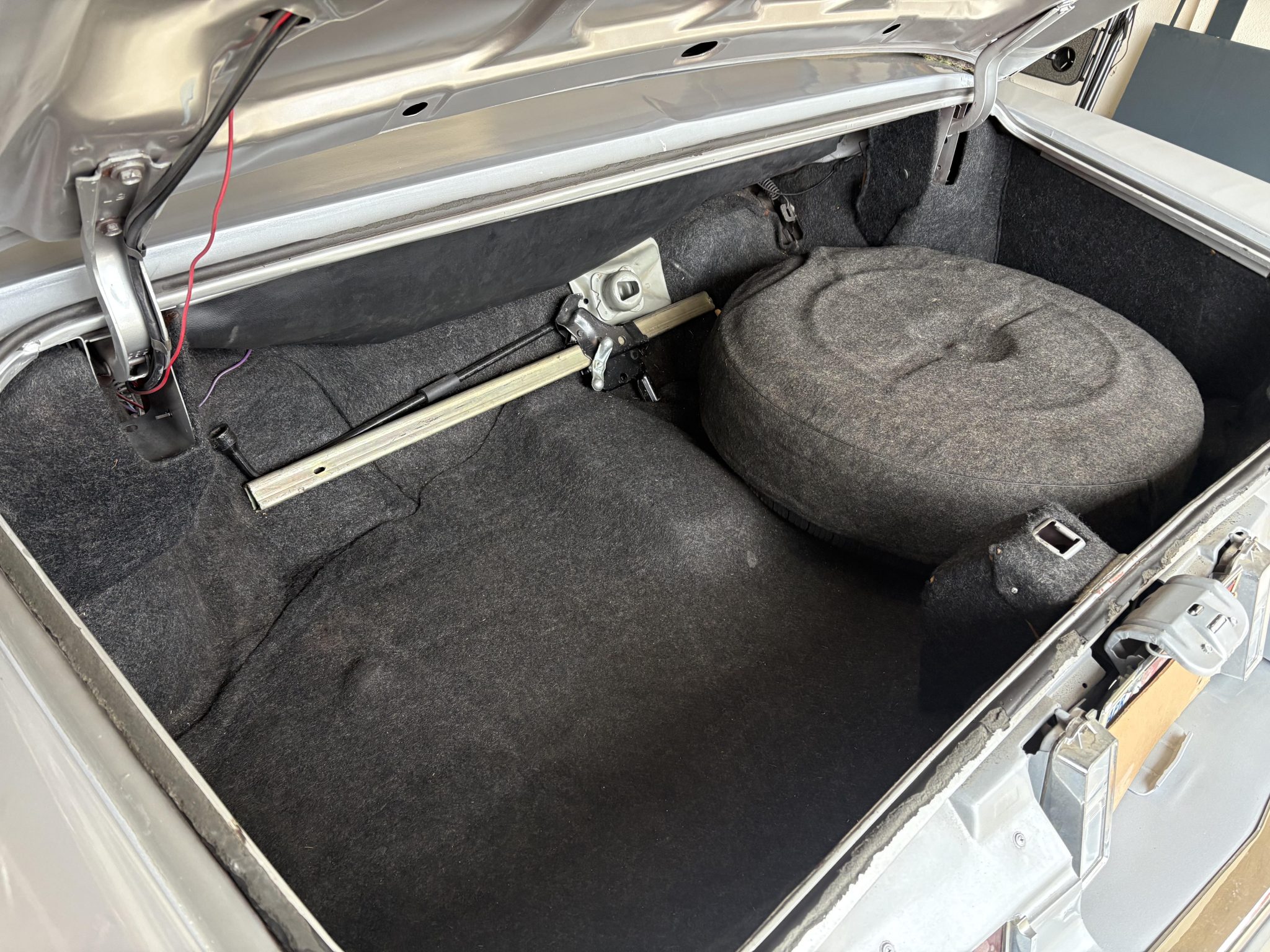 Recent work consisted of repainting the body, installing four tires, and replacing the exhaust system, catalytic converter, fuel pump, fuel hoses, carburetor float, and brakes. It is powered by a 500ci V8 paired with a three-speed automatic transmission and is finished in silver over Antique Light Smoke Gray Sierra Grain leather. Features include a black convertible soft top, 15″ steel wheels, black wheel covers, four-wheel disc brakes, and a retro-style digital stereo with Bluetooth connectivity as well as a rear window defroster, an illuminated thermometer, automatic climate control, cruise control, power windows, and power-adjustable front seats.