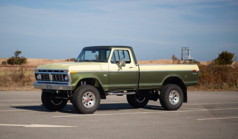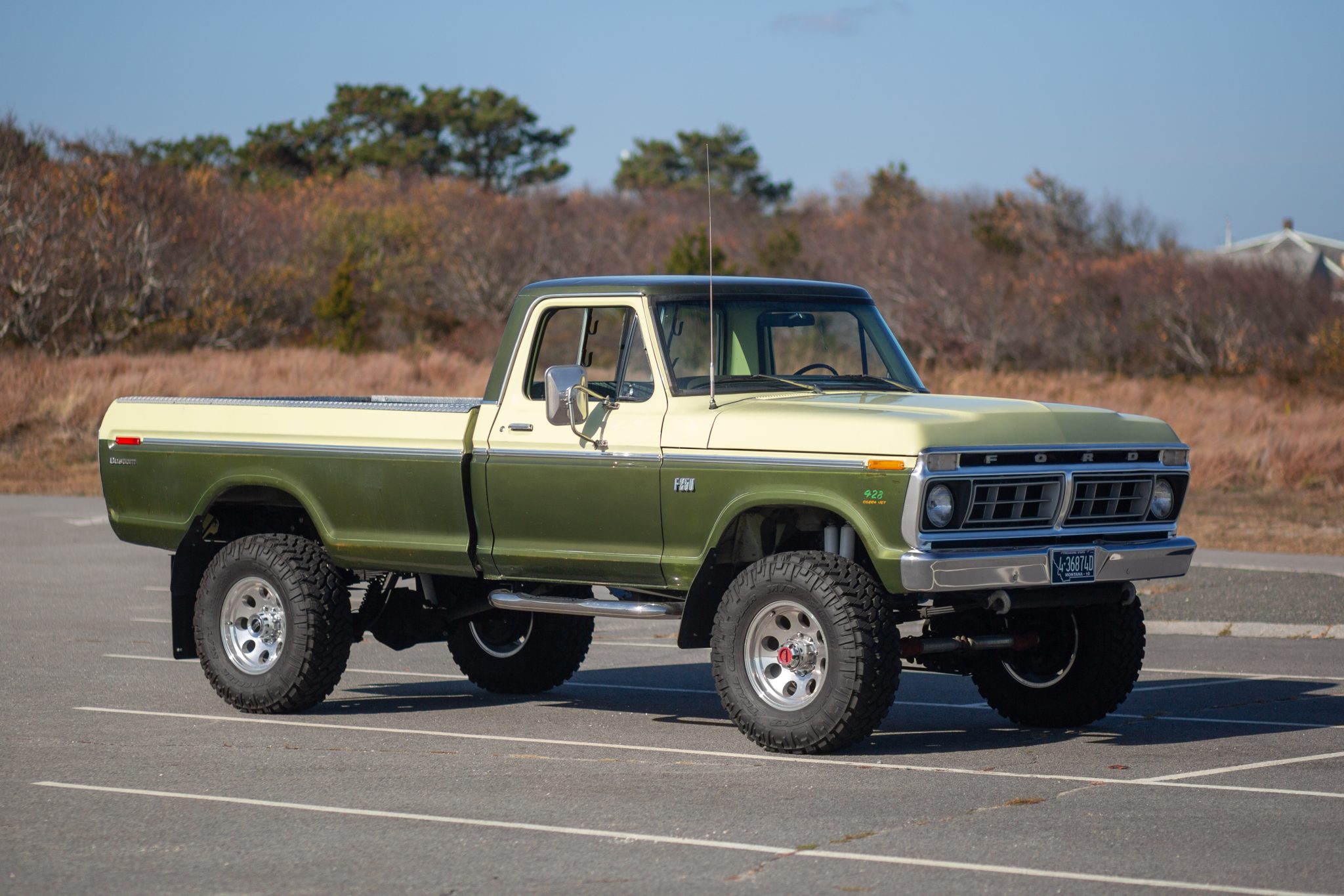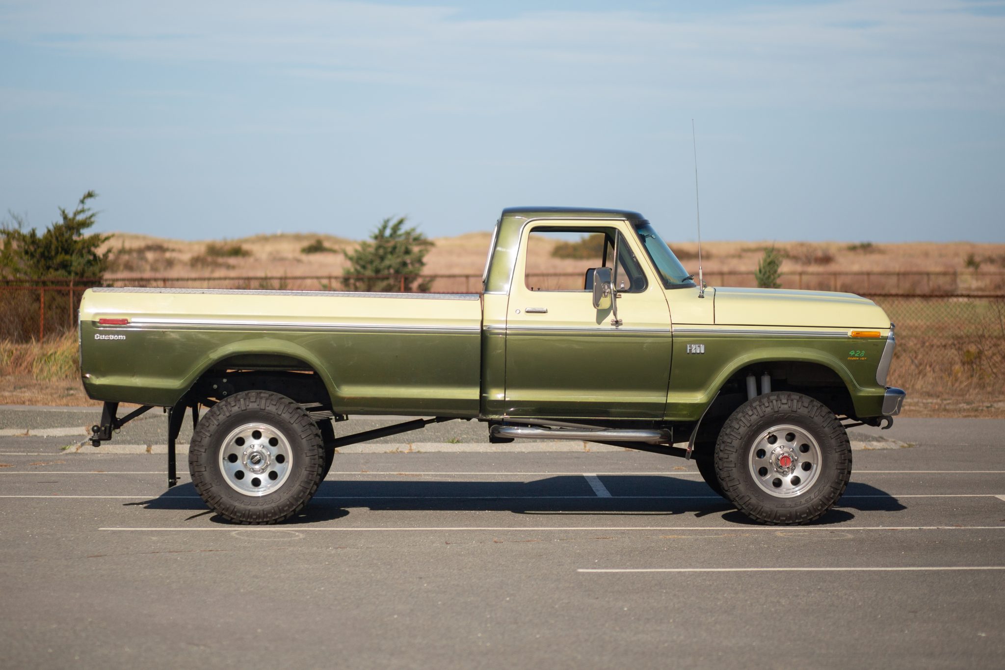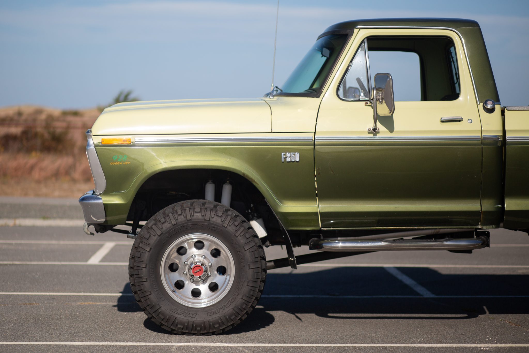 It was fitted with a 428ci V8 under previous ownership, and further equipment includes an Edelbrock four-barrel carburetor, Super Cobra Jet cylinder heads, long-tube exhaust headers, and a dual exhaust system with Flowmaster mufflers. The truck is finished in two-tone Glen Green Metallic and Hatteras Green over patterned green cloth upholstery and features a four-speed manual transmission, a dual-range transfer case, and a Dana limited-slip rear axle. Additional equipment includes power steering, polished 17″ American Racing wheels, power front disc brakes, manually locking front hubs, steering stabilizers, tubular side steps, mud flaps, a drop hitch, and the cabin is outfitted with a Kelsey trailer brake controller, a Realistic CB radio, a Clarion AM/FM stereo, and a heater.