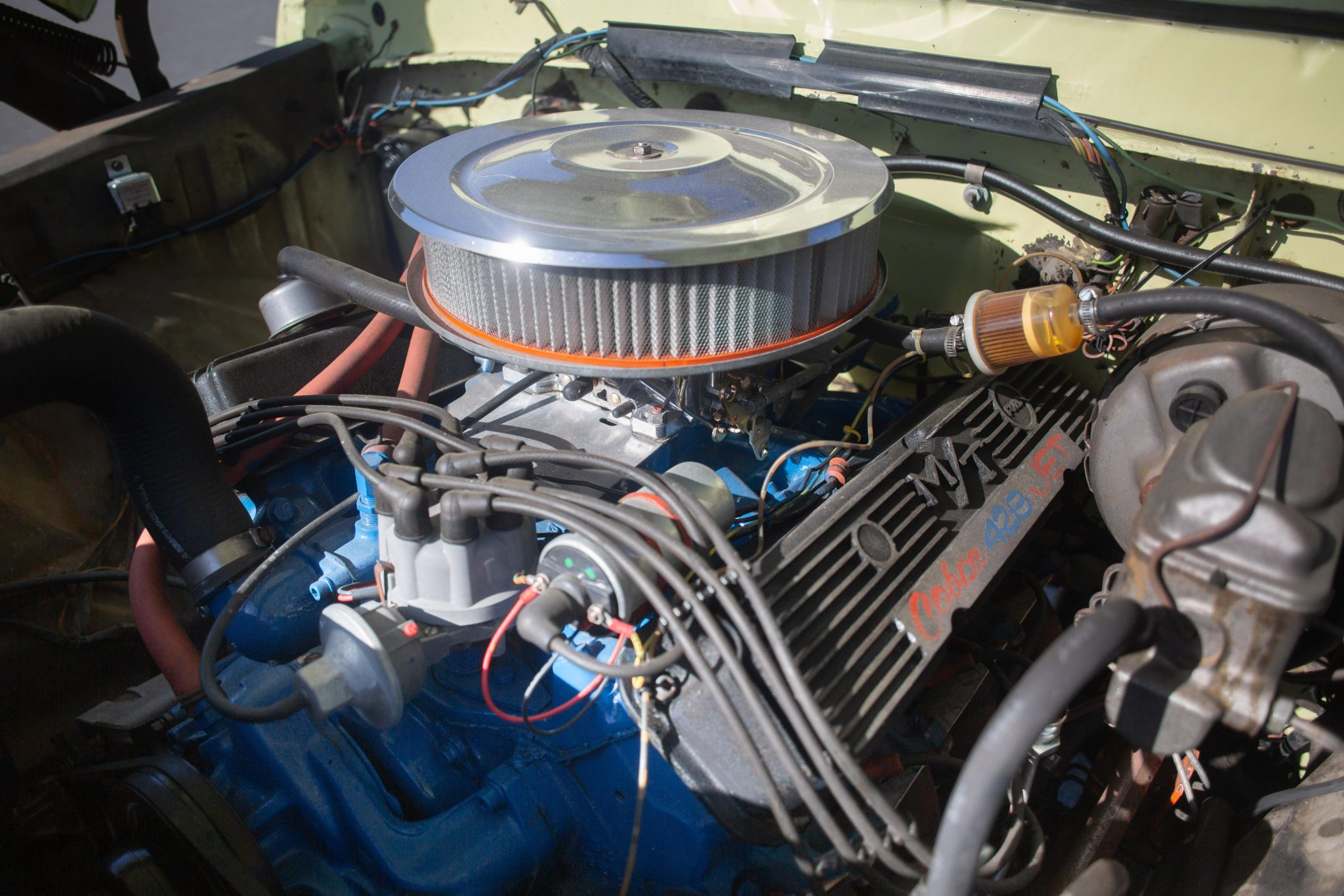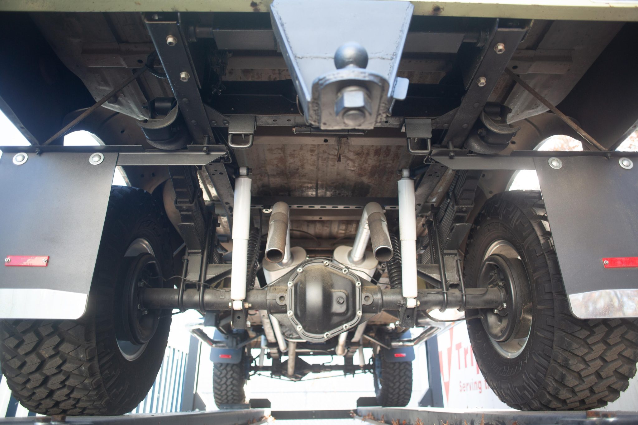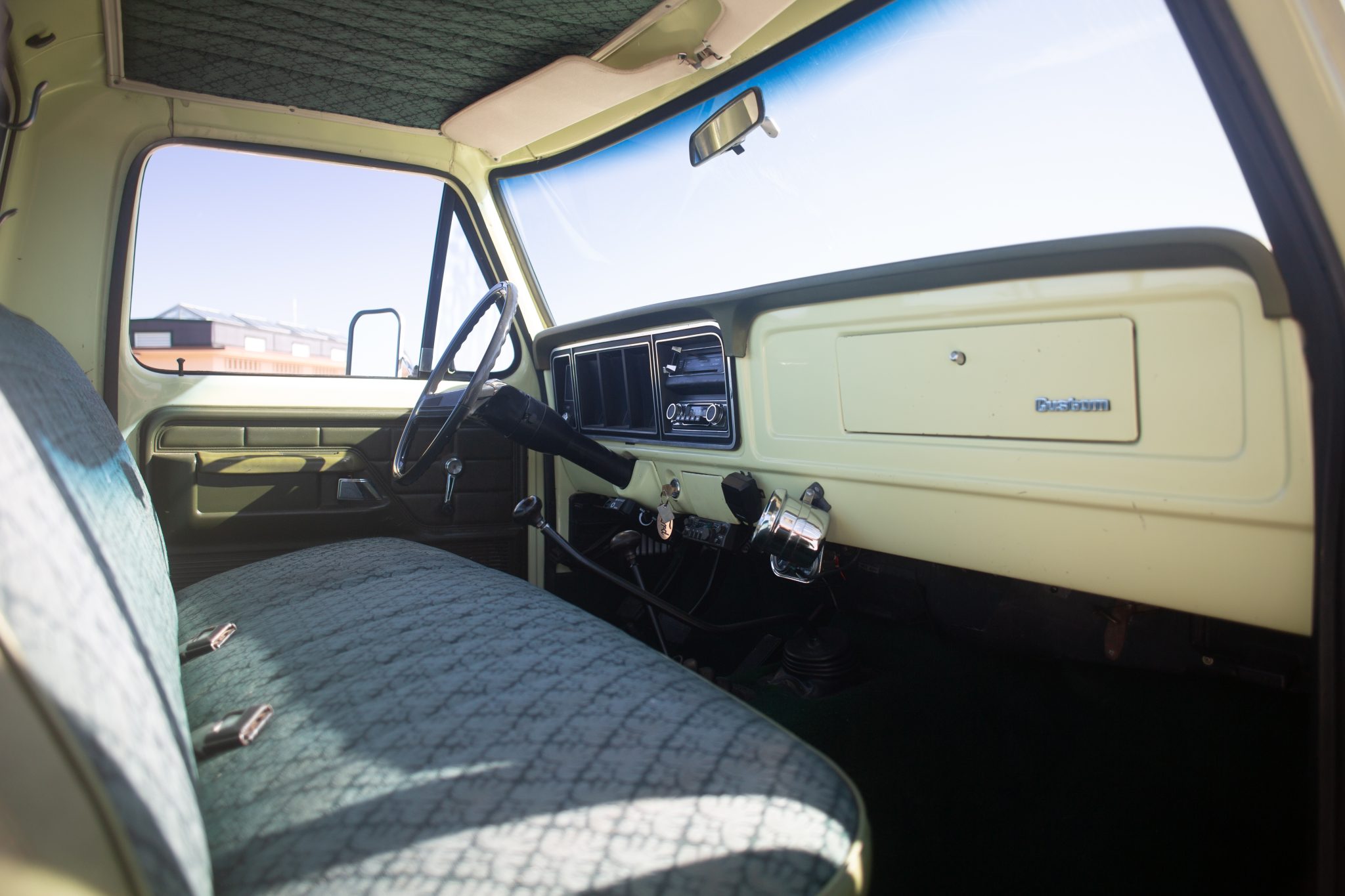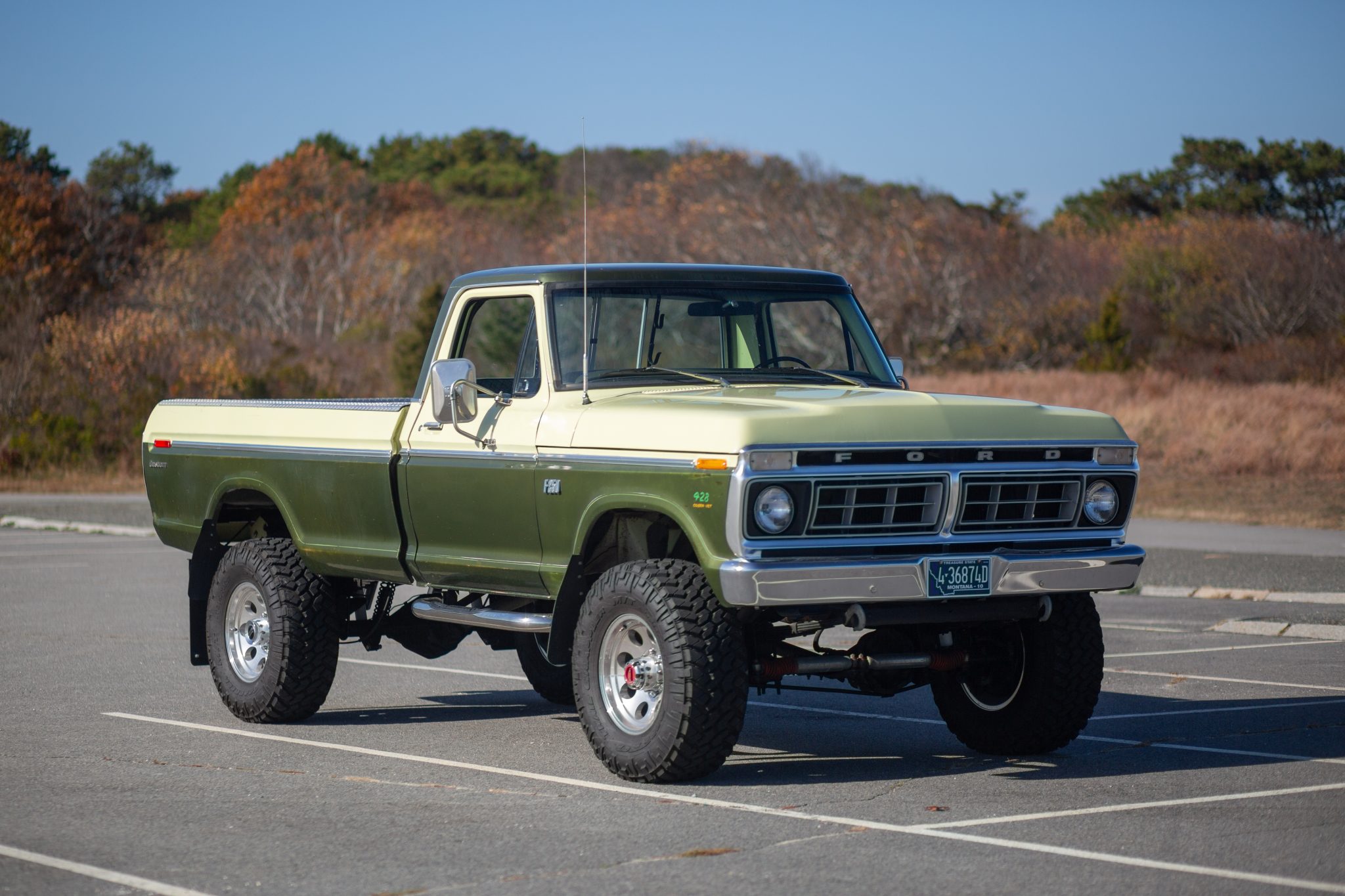 It was fitted with a 428ci V8 under previous ownership, and further equipment includes an Edelbrock four-barrel carburetor, Super Cobra Jet cylinder heads, long-tube exhaust headers, and a dual exhaust system with Flowmaster mufflers. The truck is finished in two-tone Glen Green Metallic and Hatteras Green over patterned green cloth upholstery and features a four-speed manual transmission, a dual-range transfer case, and a Dana limited-slip rear axle. Additional equipment includes power steering, polished 17″ American Racing wheels, power front disc brakes, manually locking front hubs, steering stabilizers, tubular side steps, mud flaps, a drop hitch, and the cabin is outfitted with a Kelsey trailer brake controller, a Realistic CB radio, a Clarion AM/FM stereo, and a heater.