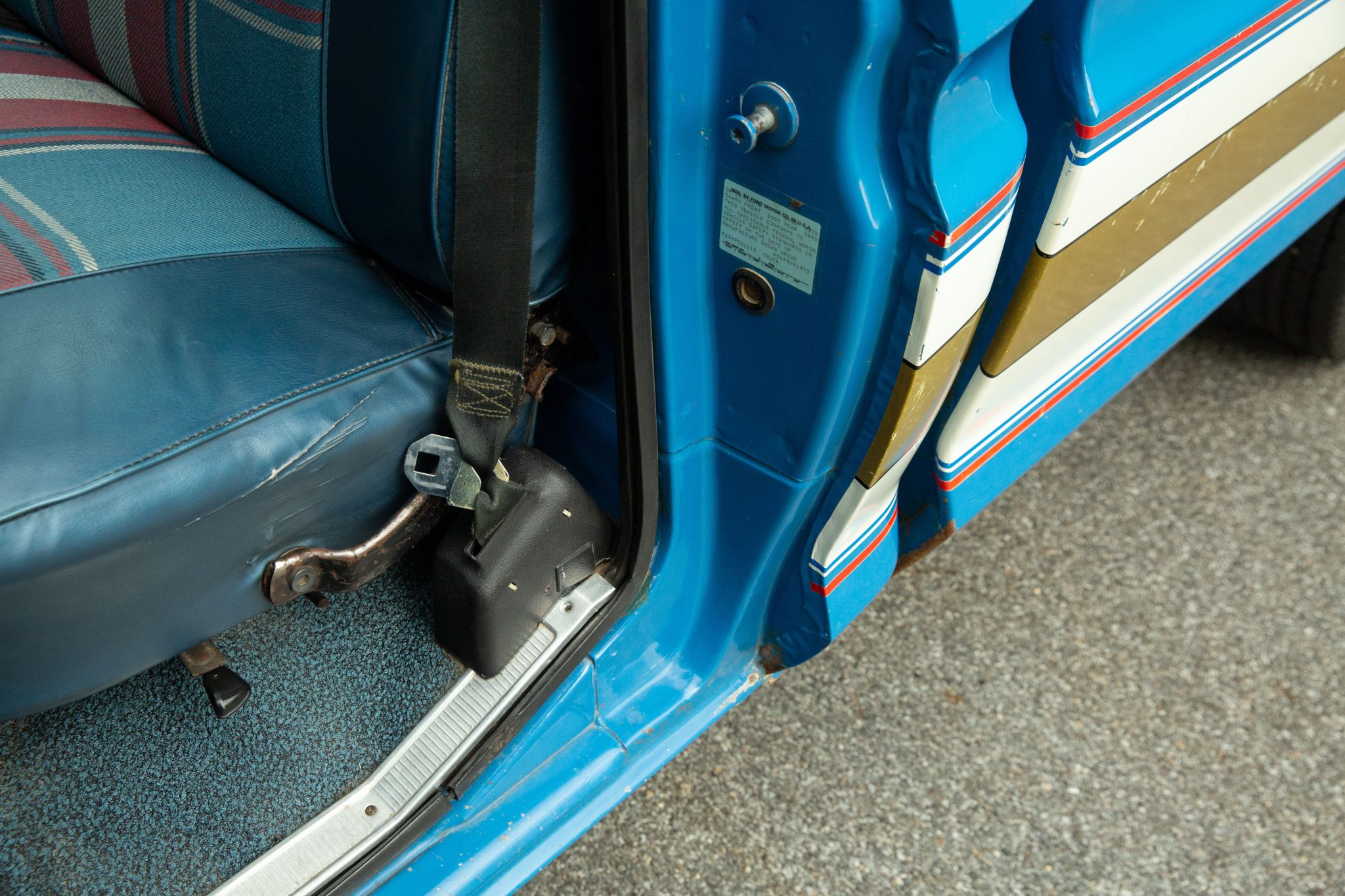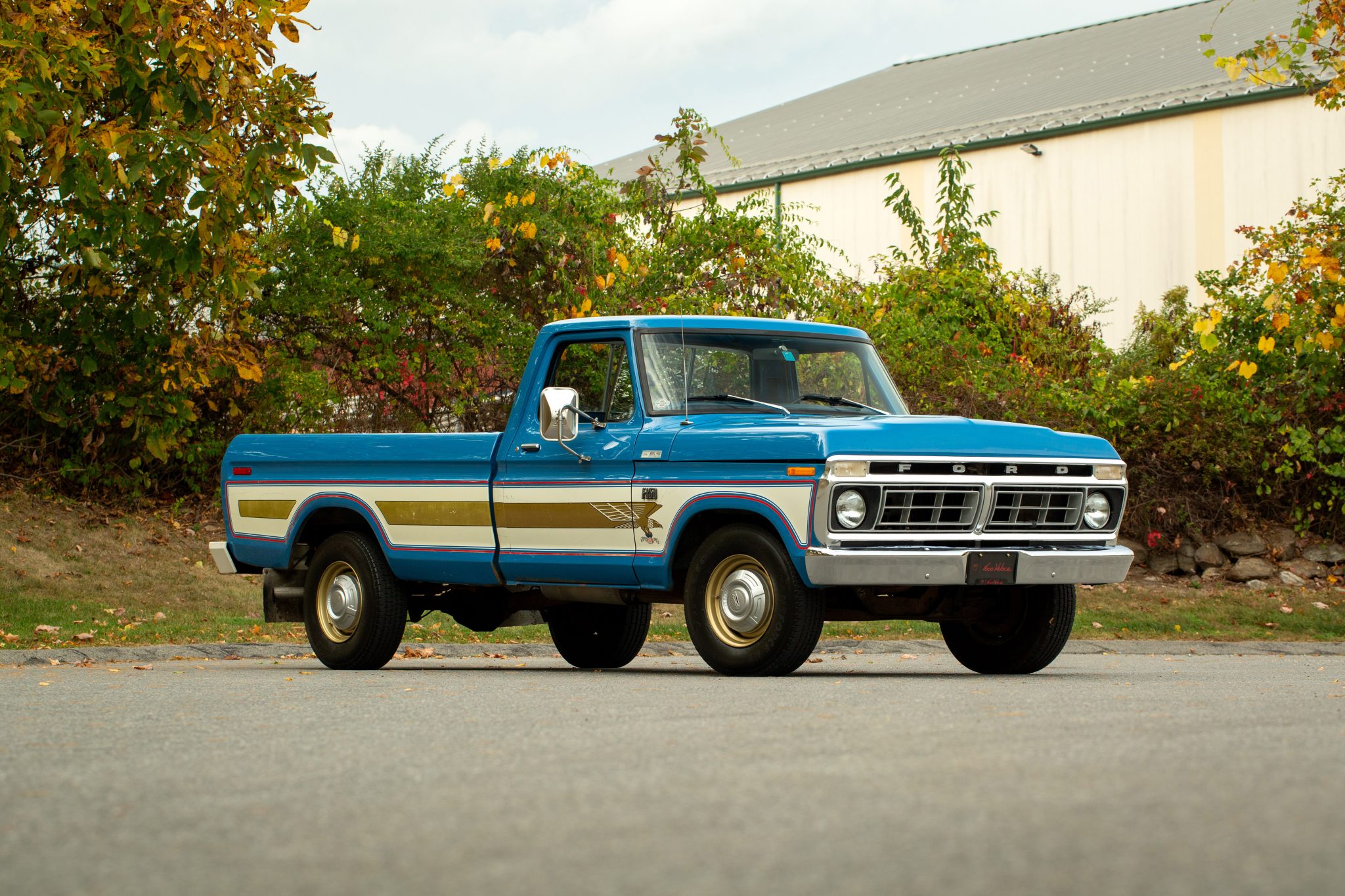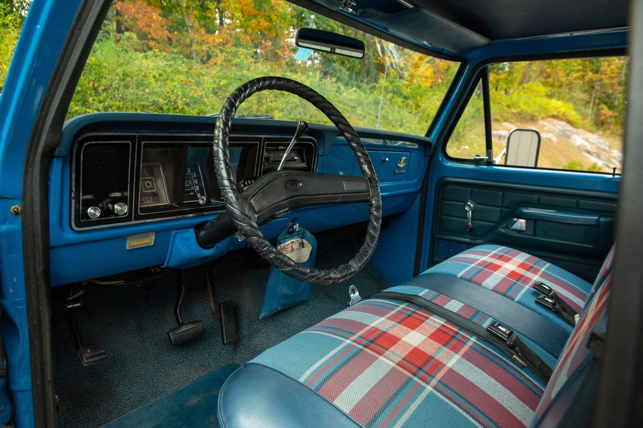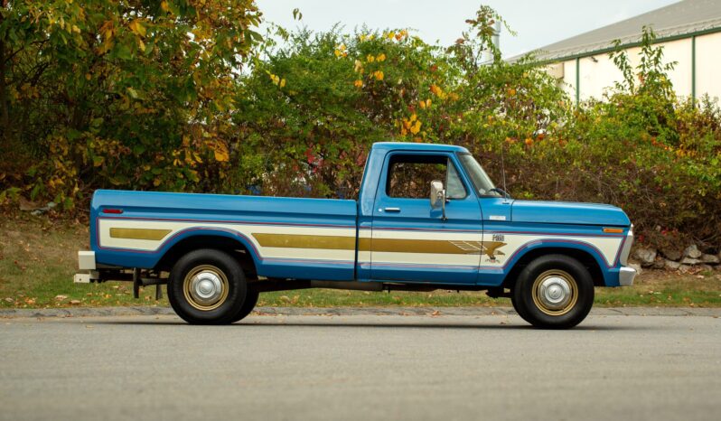 This Bahama Blue 1976 Ford F-250 is a Custom 4×2 that was ordered with a Bicentennial trim package, which featured side graphics in addition to red, white, and blue plaid cloth upholstery. Powered by a 390ci V8 paired with a three-speed automatic transmission, it has power steering, 16.5″ steel wheels, towing mirrors, a sliding rear window, and an AM radio.