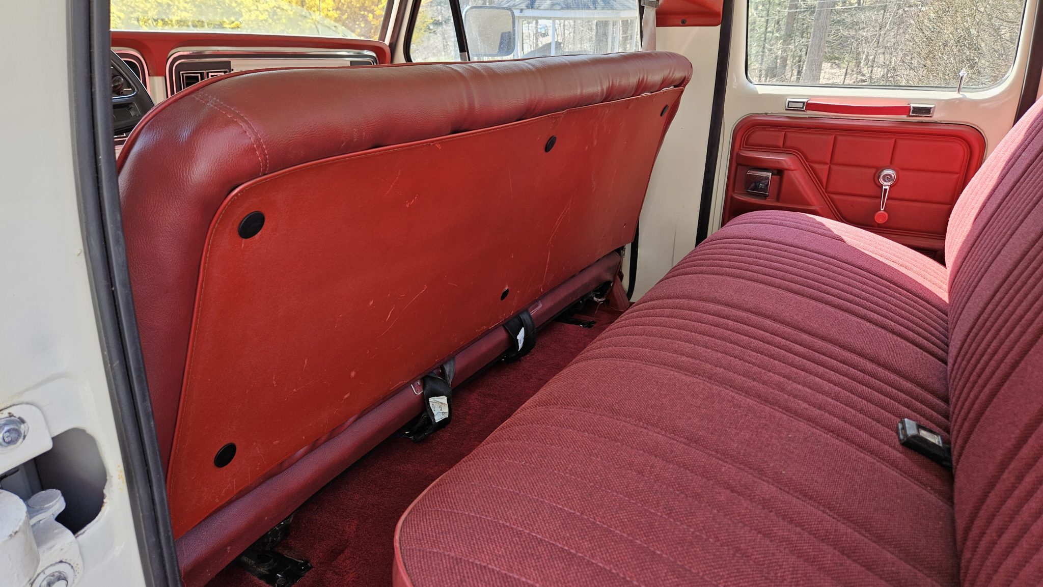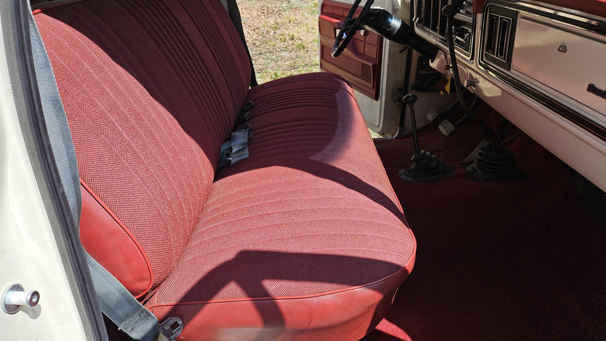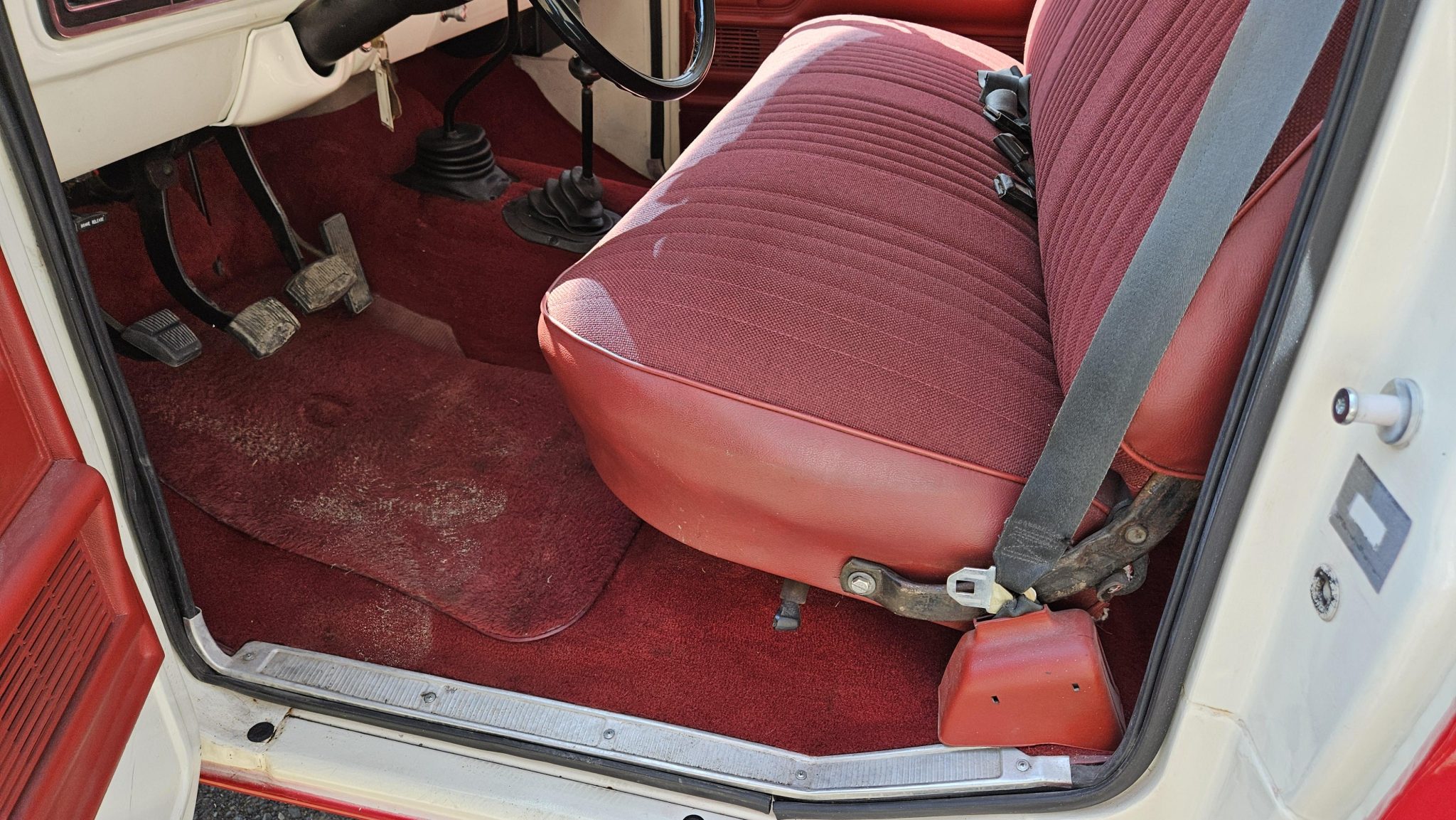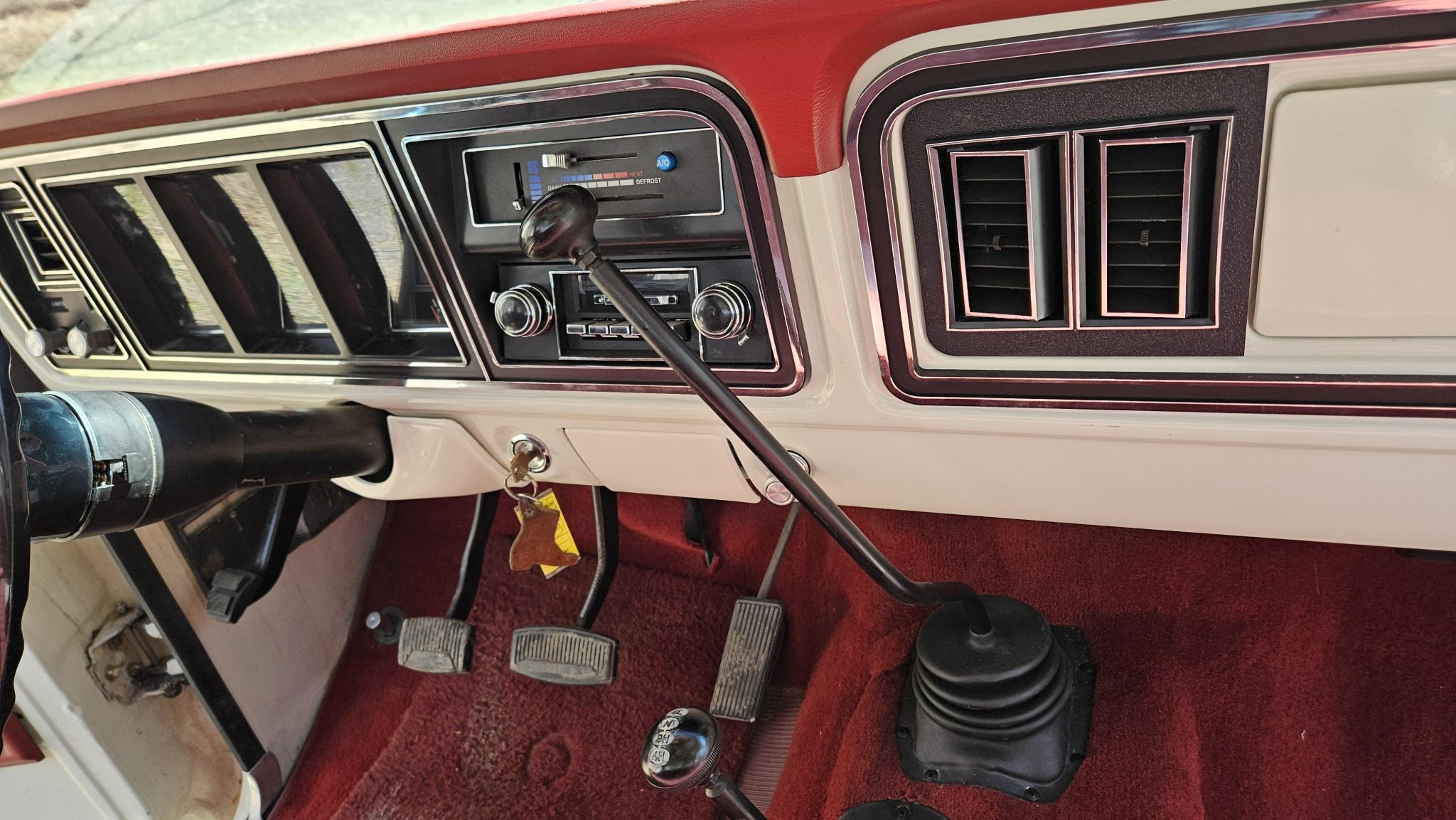 Powered by a 360ci V8 linked with a four-speed manual transmission and a dual-range transfer case, the truck wears a repaint in white and red over red cloth upholstery. Equipment includes 16″ steel wheels, manually locking front hubs, Rancho shocks, front disc brakes, power steering, and an Edelbrock carburetor along with air conditioning, a digital radio, two bench seats, and a hitch receiver.